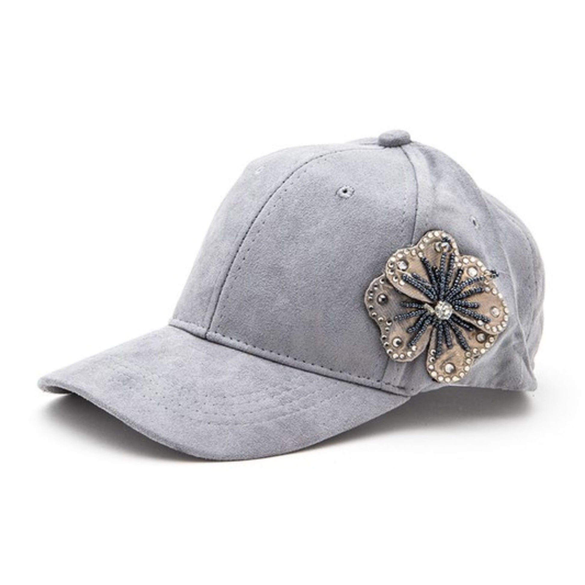 Made from high-quality polyester with a luxe suede-like finish, this stylish gray cap features an eye-catching beaded flower embellishment that adds the perfect touch of sparkle and personality.