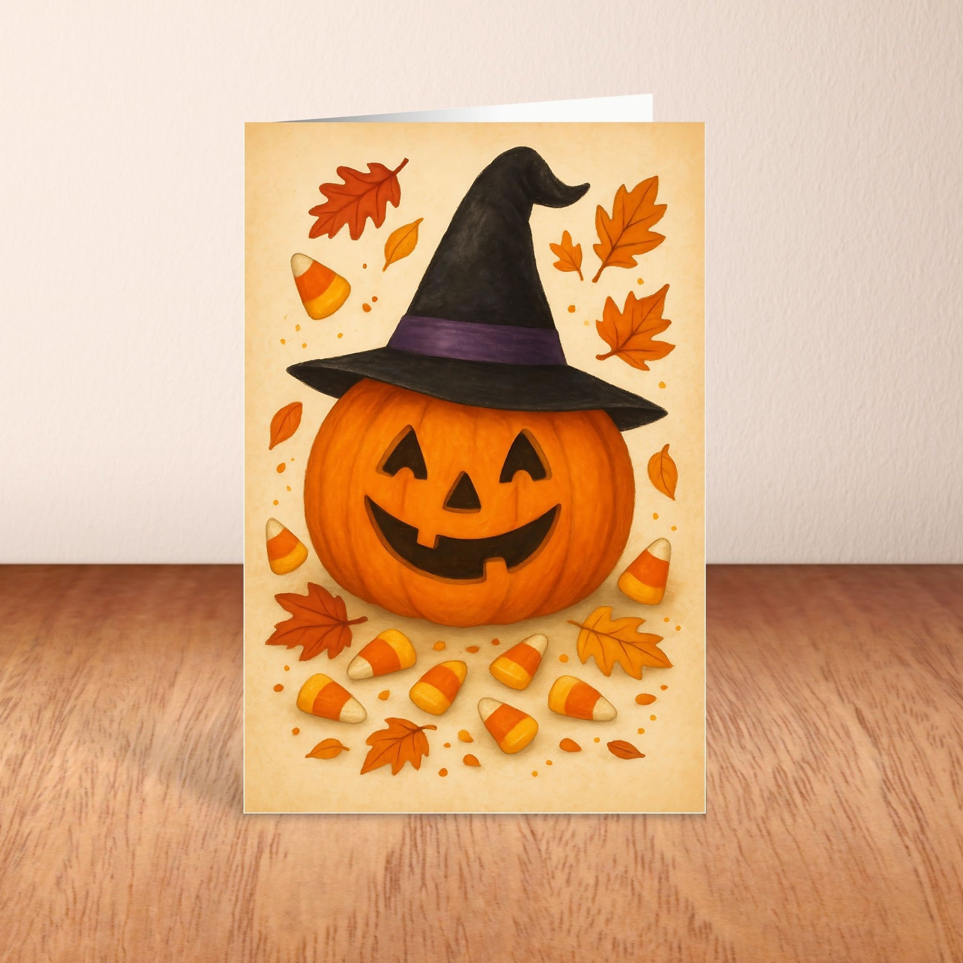 The design features a happy jack-o’-lantern wearing a witch hat, surrounded by candy corn and autumn leaves—perfect for party invites, seasonal notes, and trick-or-treat hellos.