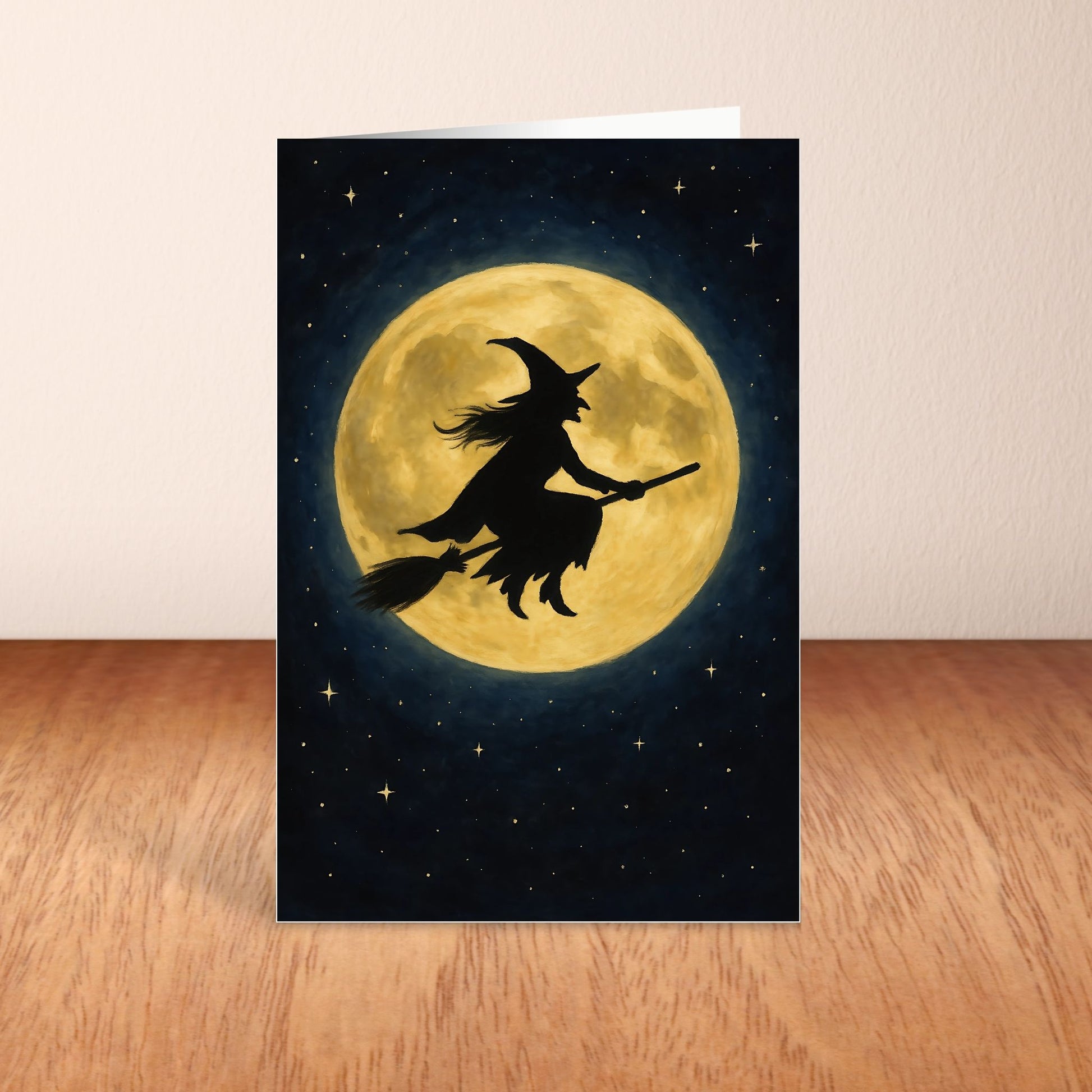 Blank Inside 5.5 x 8.5 Halloween Card – Witch Flying Across the Full Moon - Digital Download.