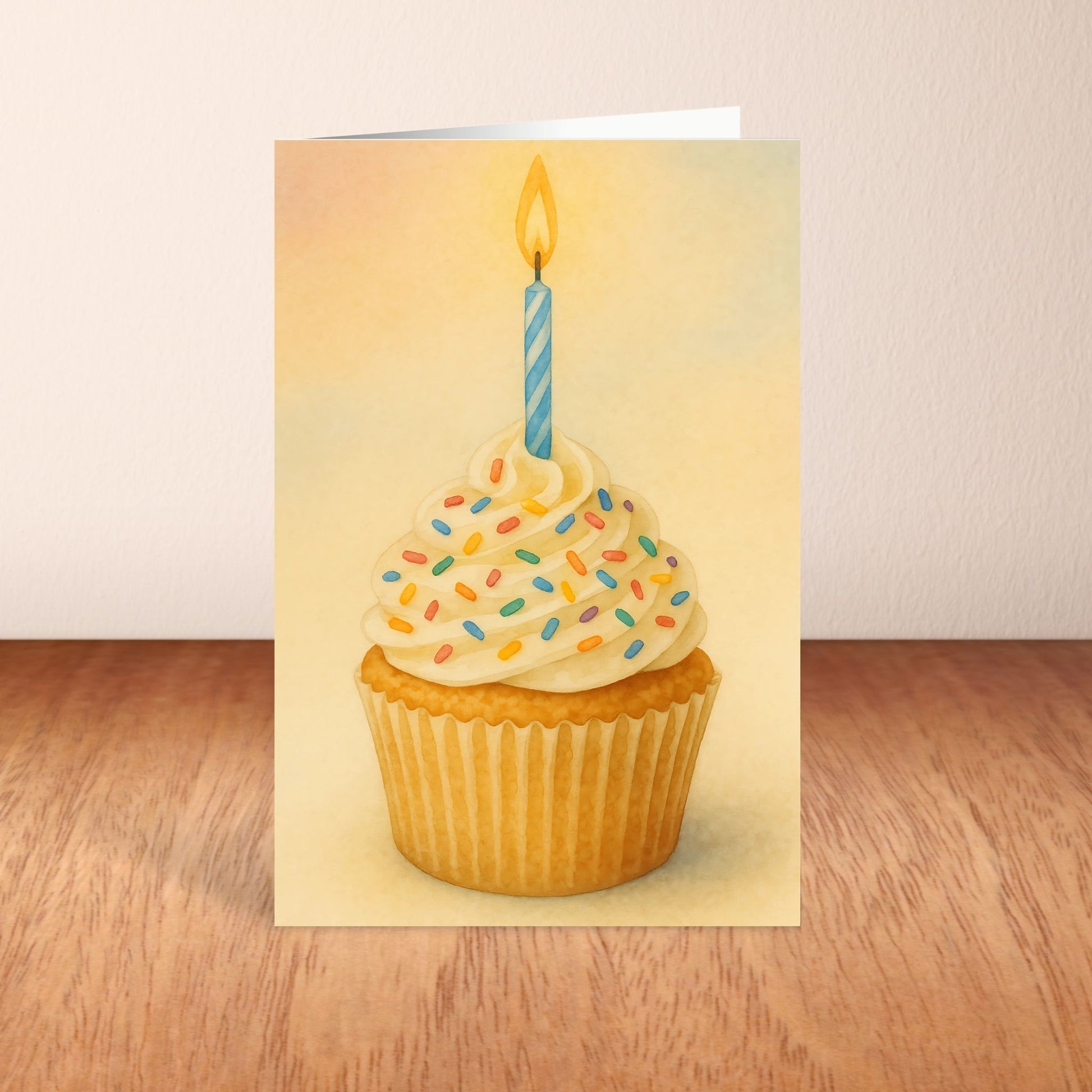 Celebrate birthdays with a touch of sweetness using this Printable Cupcake Celebration Birthday Greeting Card, featuring a beautifully illustrated golden cupcake topped with fluffy vanilla frosting, colorful rainbow sprinkles, and a single blue-striped candle glowing warmly.