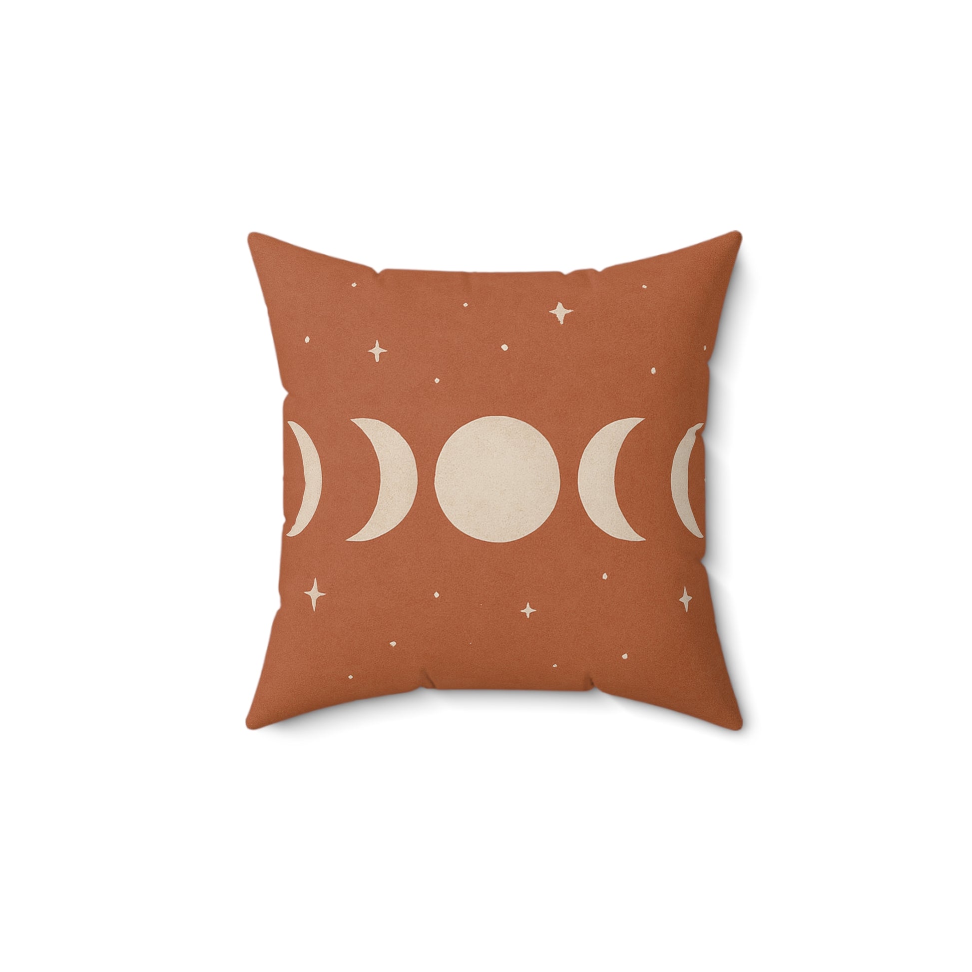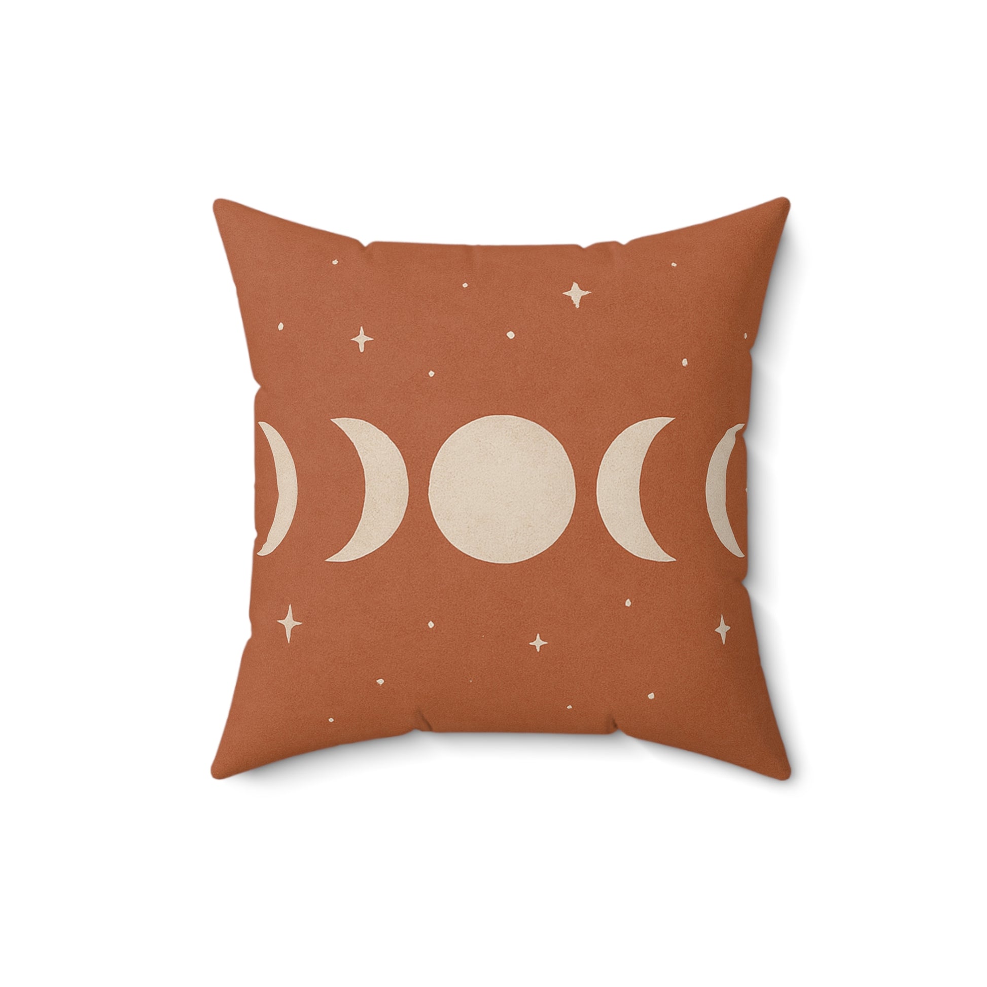 Elevate your space with this Boho Moon Phases Throw Pillow, featuring a minimalist lunar cycle design on a rich terracotta background.