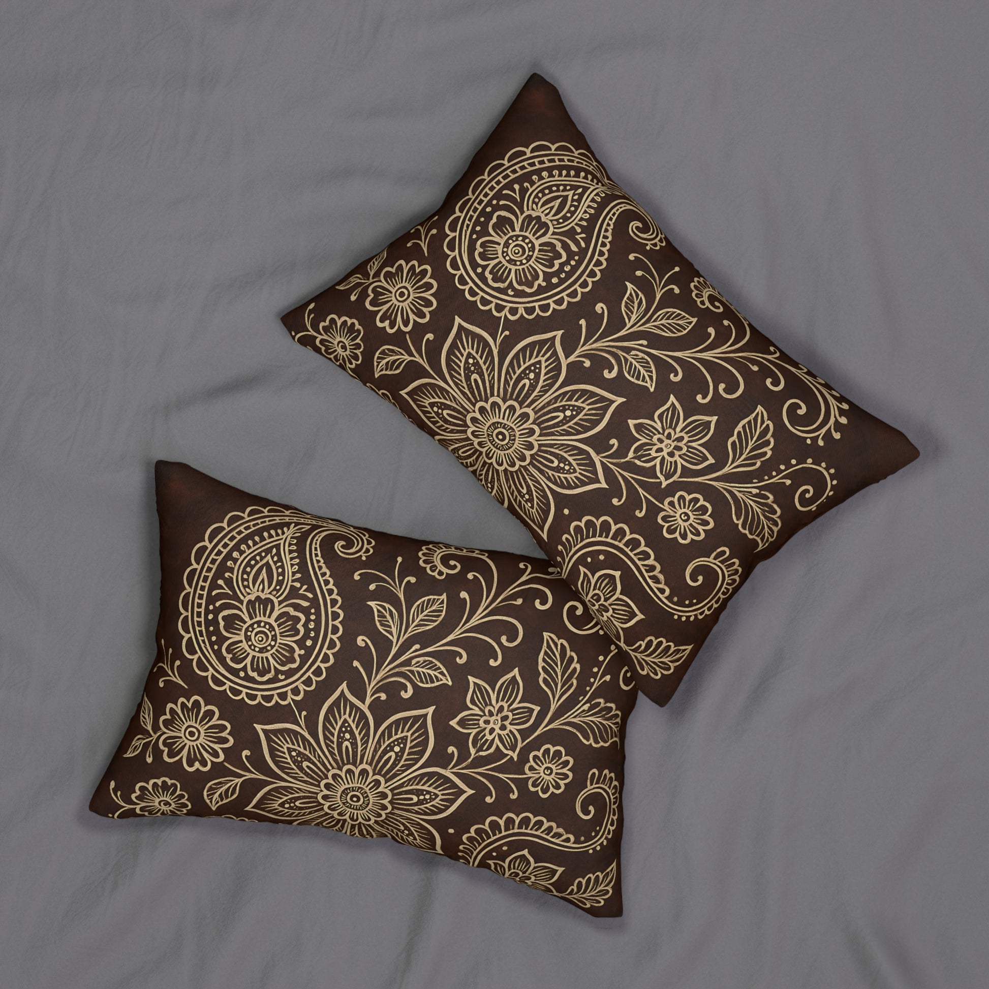 Boho Paisley Floral Lumbar Pillow – Brown & Beige Decorative Cushion.