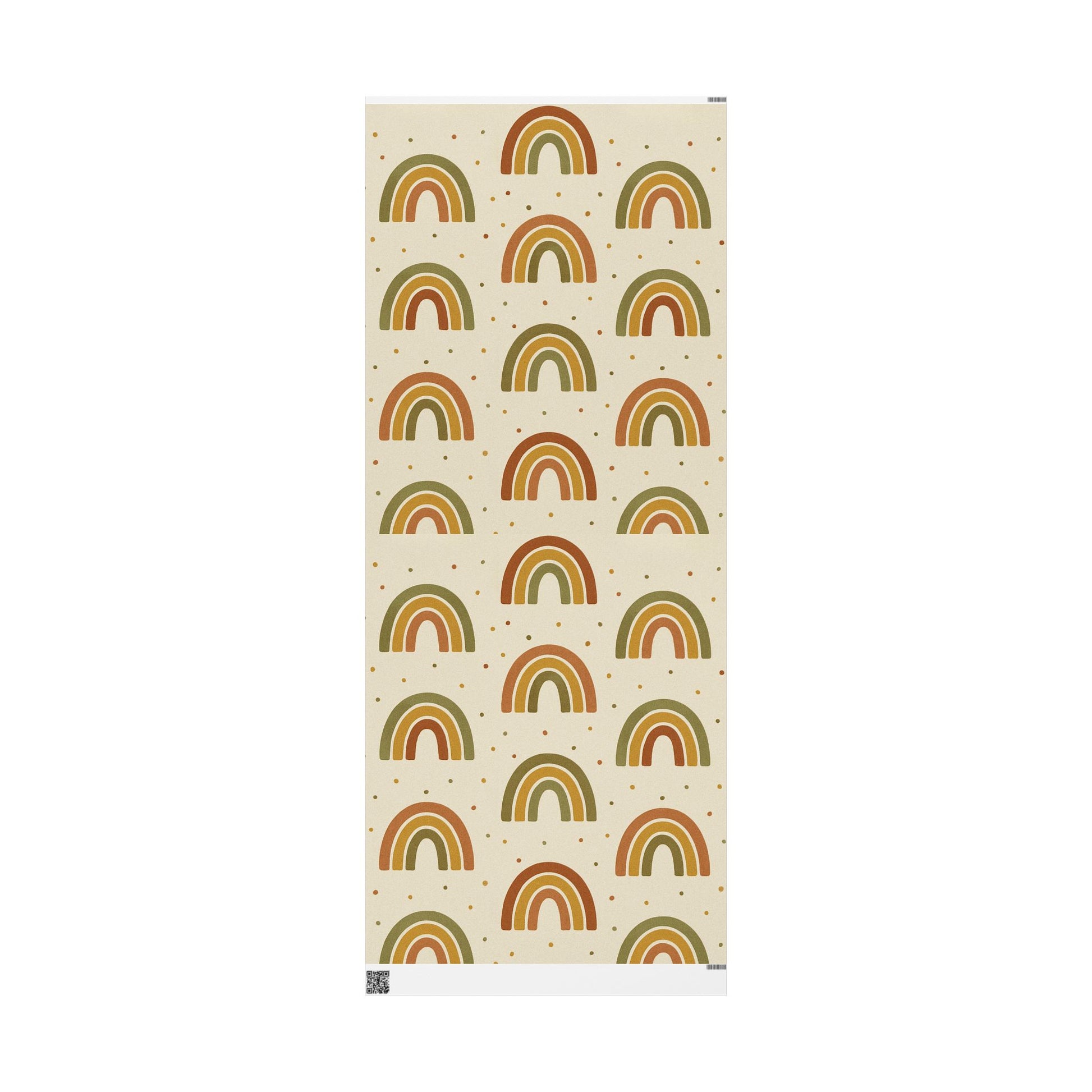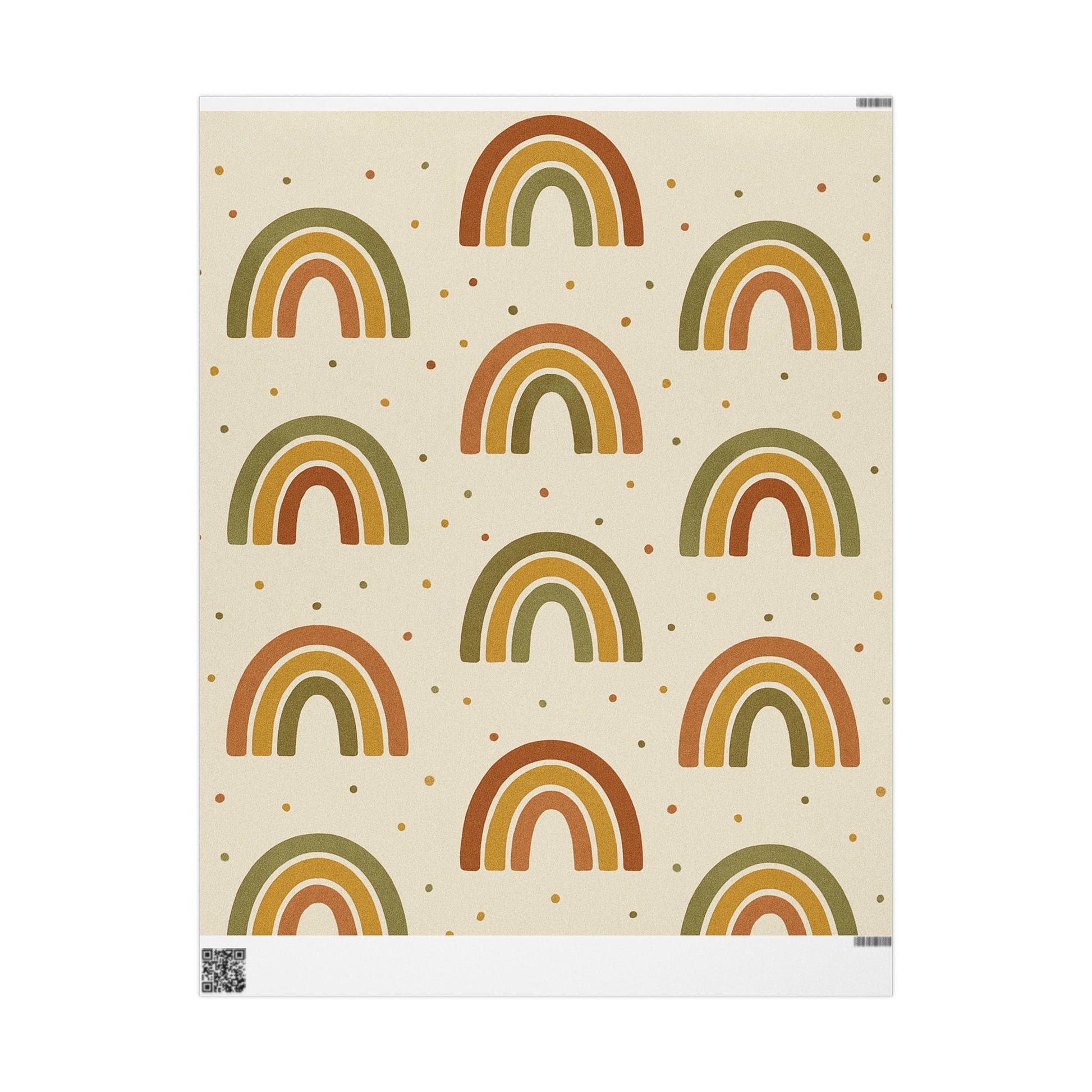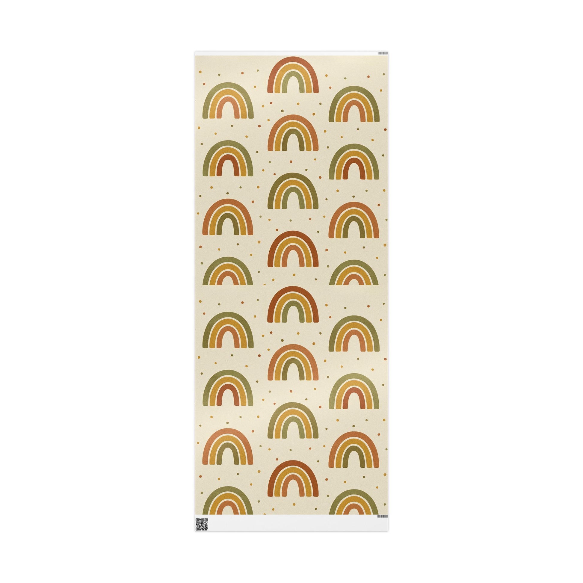 Featuring a repeating pattern of retro-style rainbows in warm earth tones—terracotta, mustard, and olive—sprinkled with playful polka dots across a soft beige background, this wrapping paper offers the perfect blend of simplicity and charm.