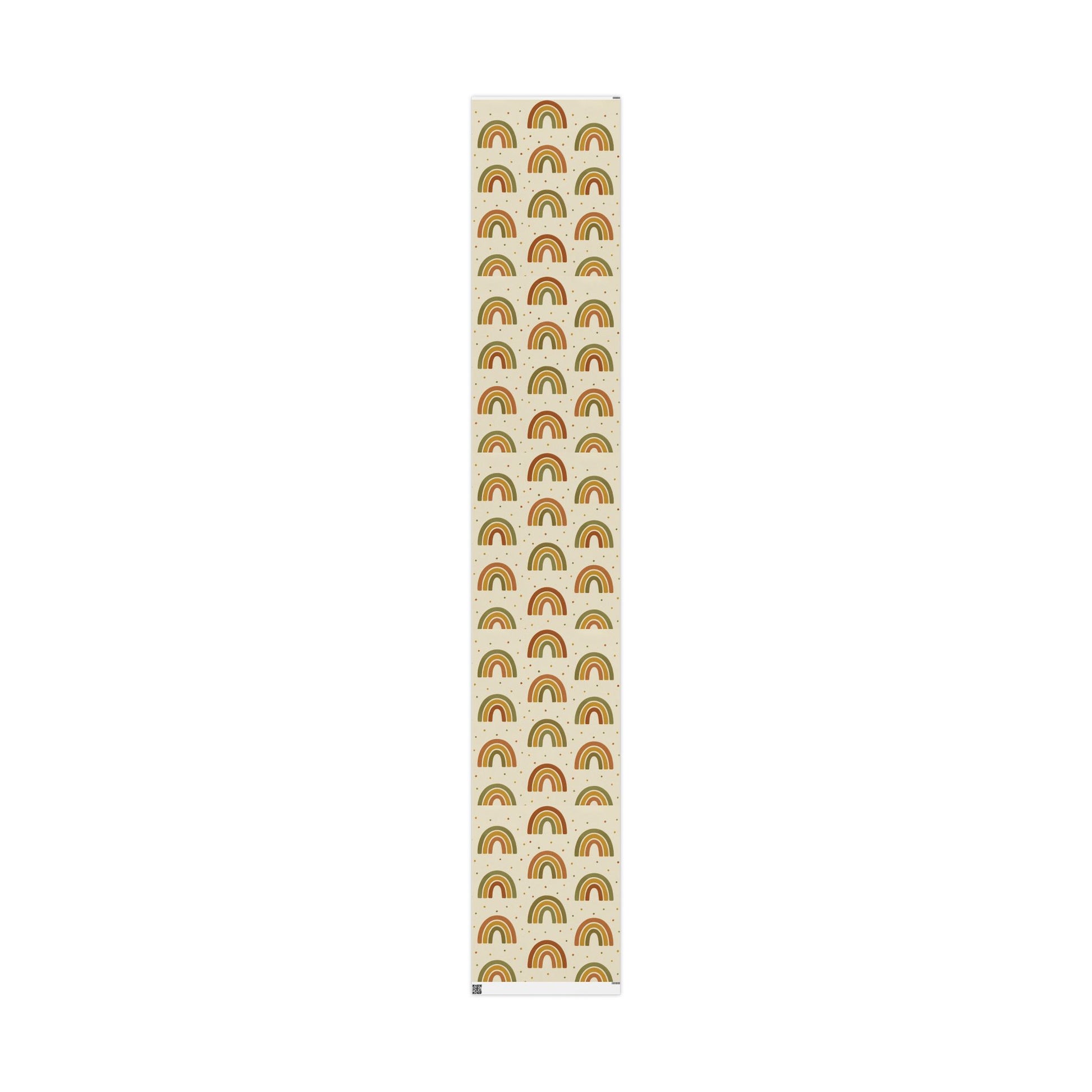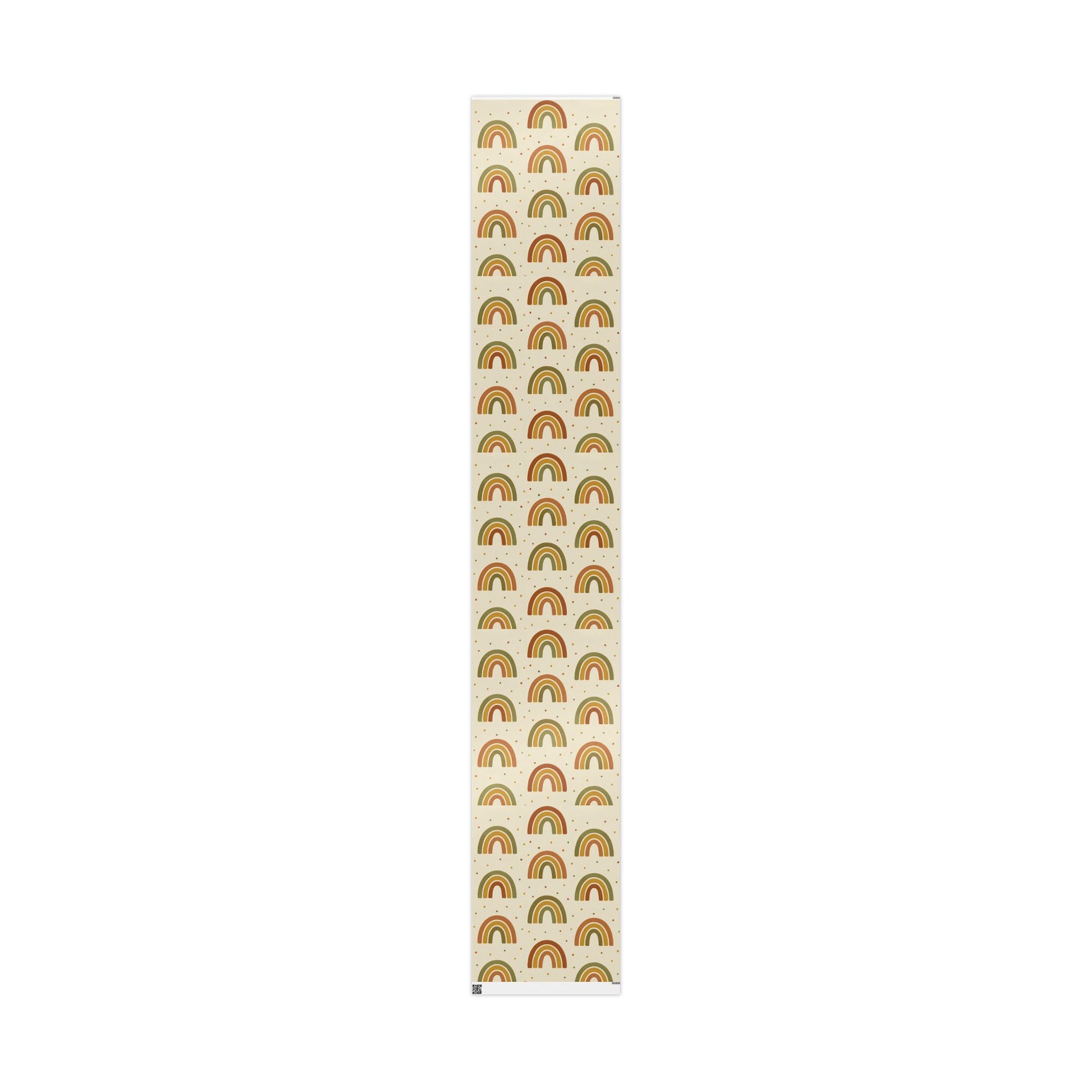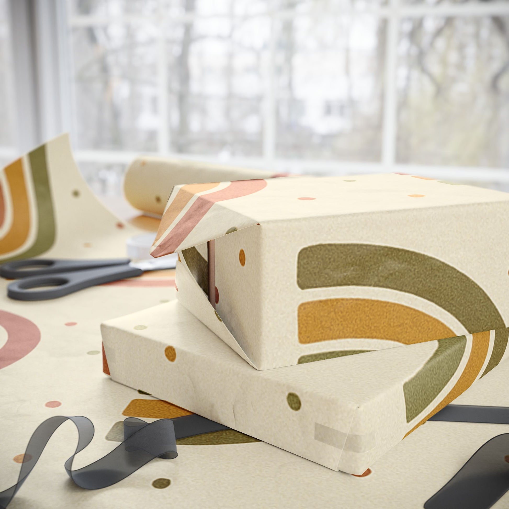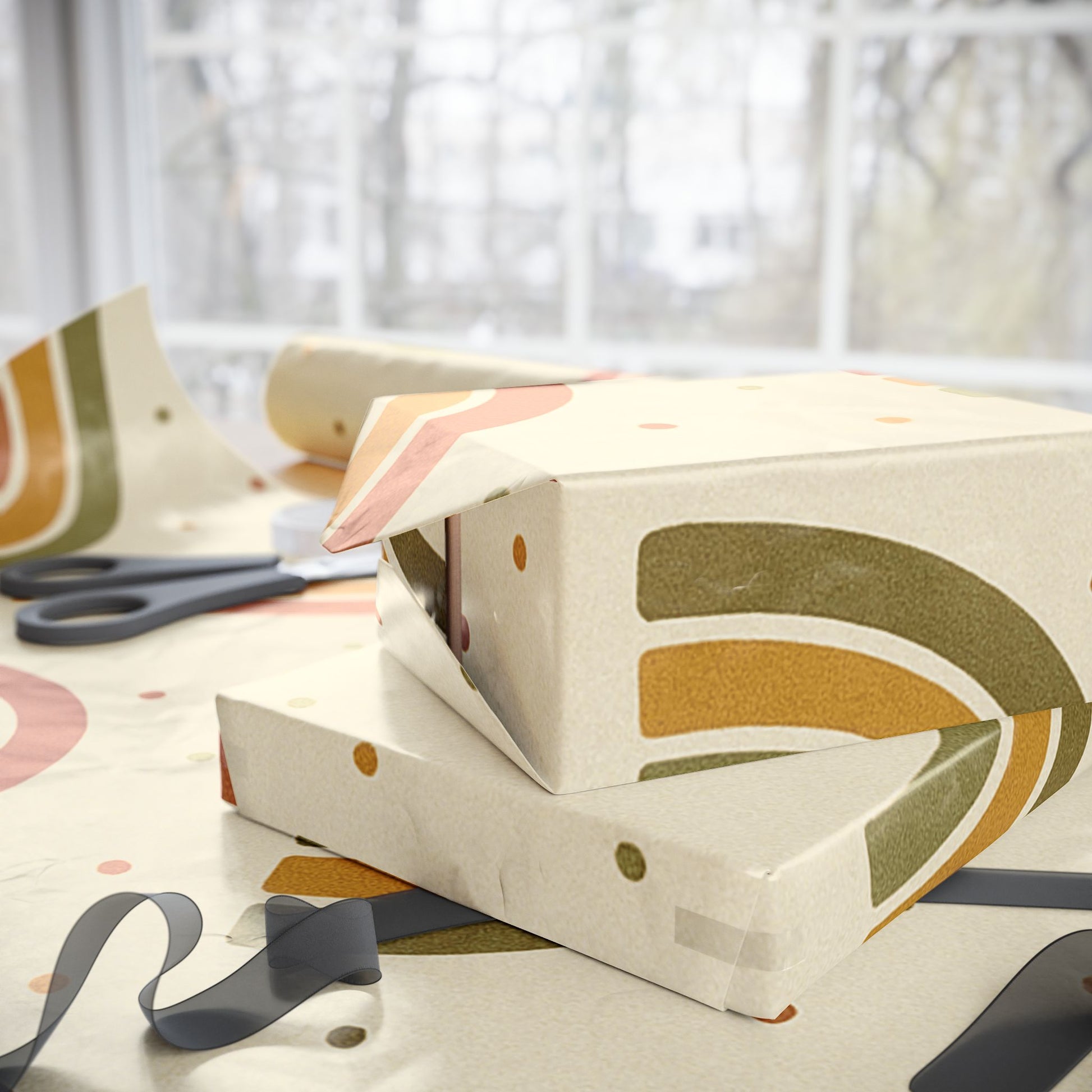 Featuring a repeating pattern of retro-style rainbows in warm earth tones—terracotta, mustard, and olive—sprinkled with playful polka dots across a soft beige background, this wrapping paper offers the perfect blend of simplicity and charm.