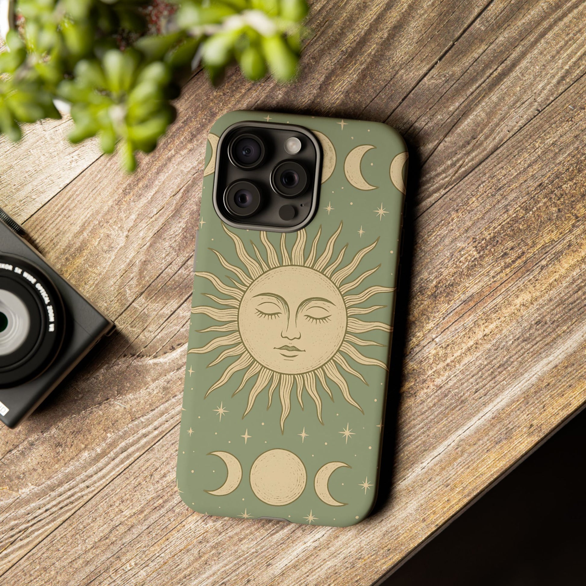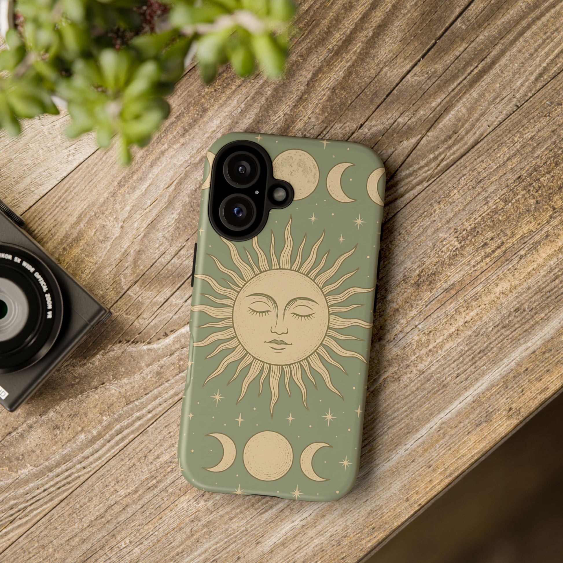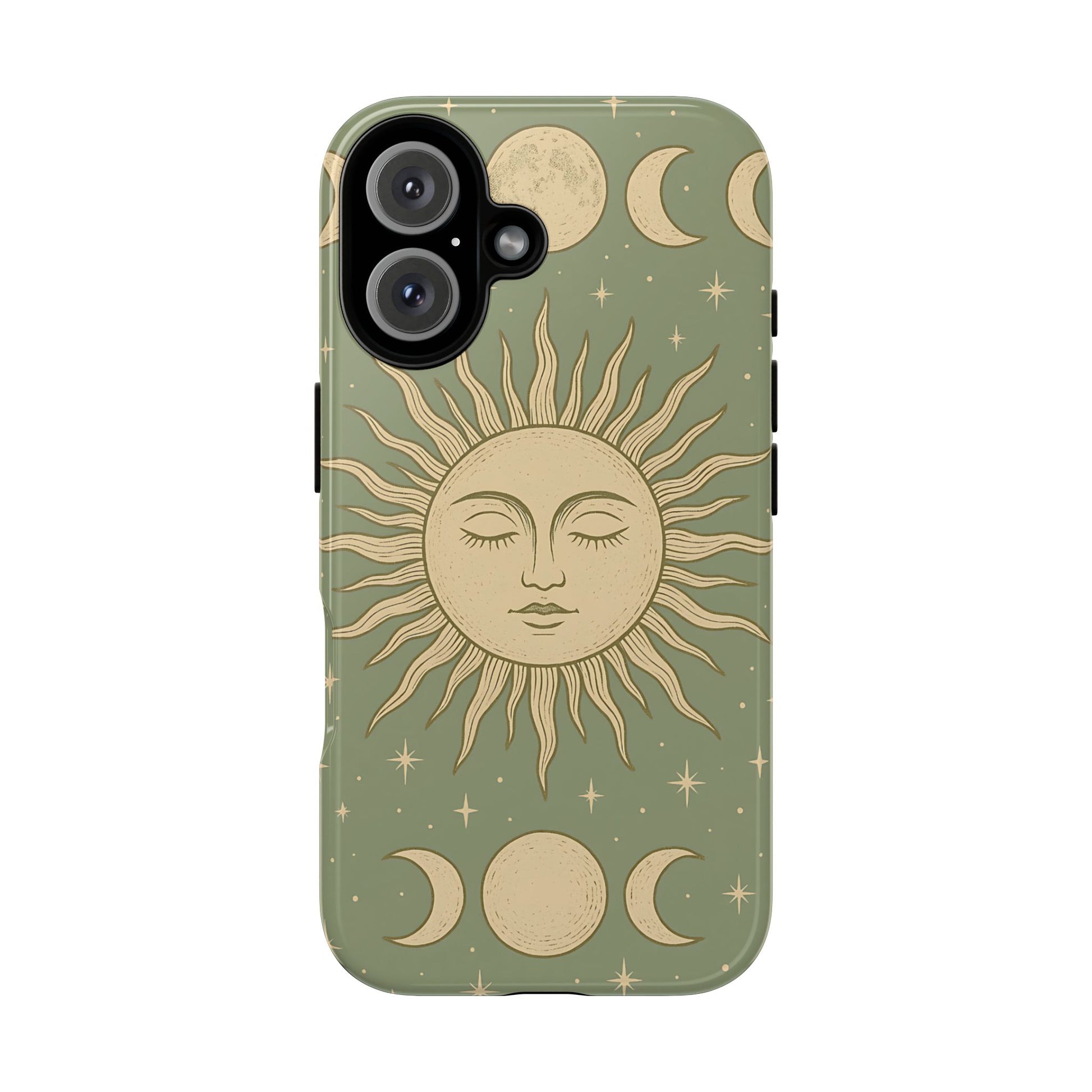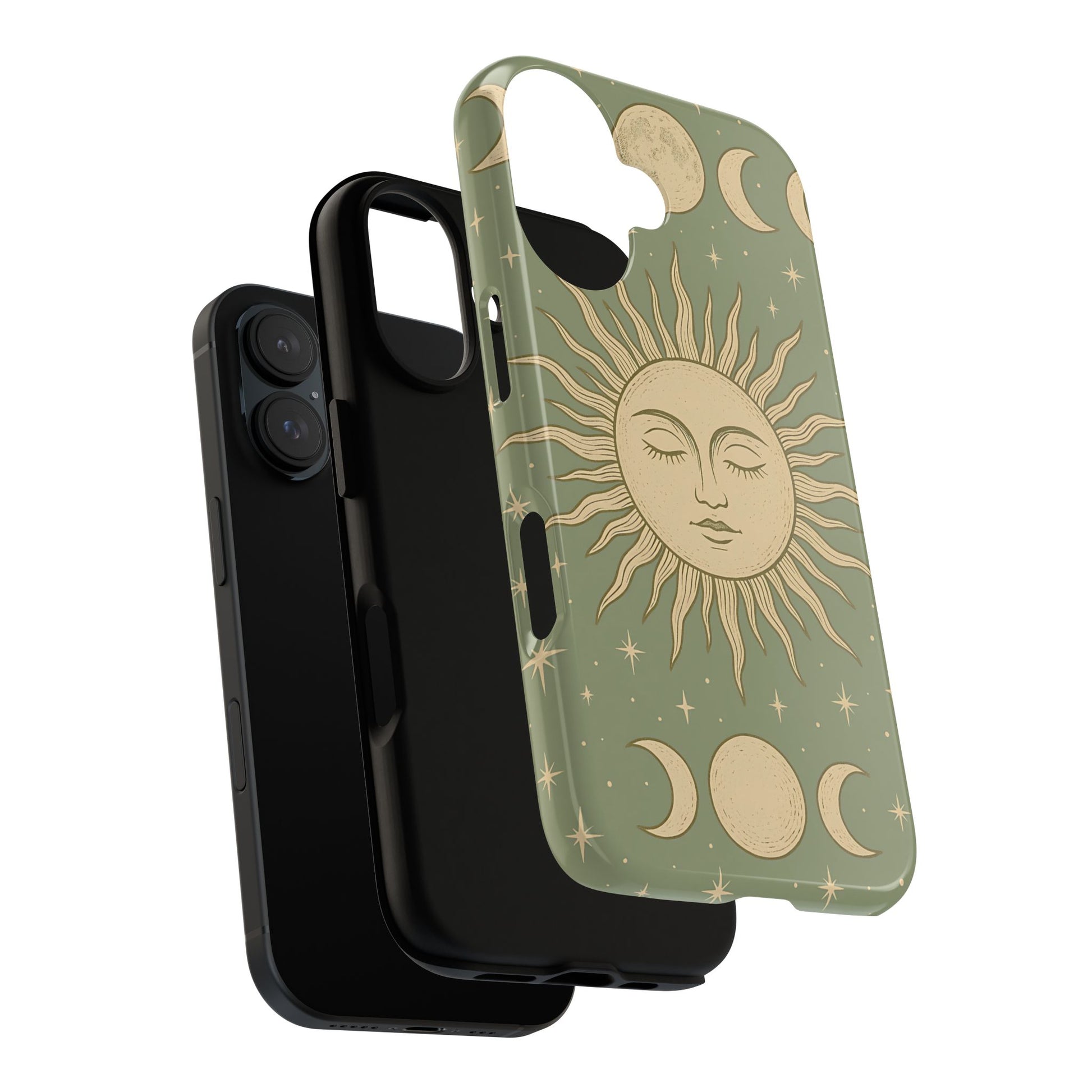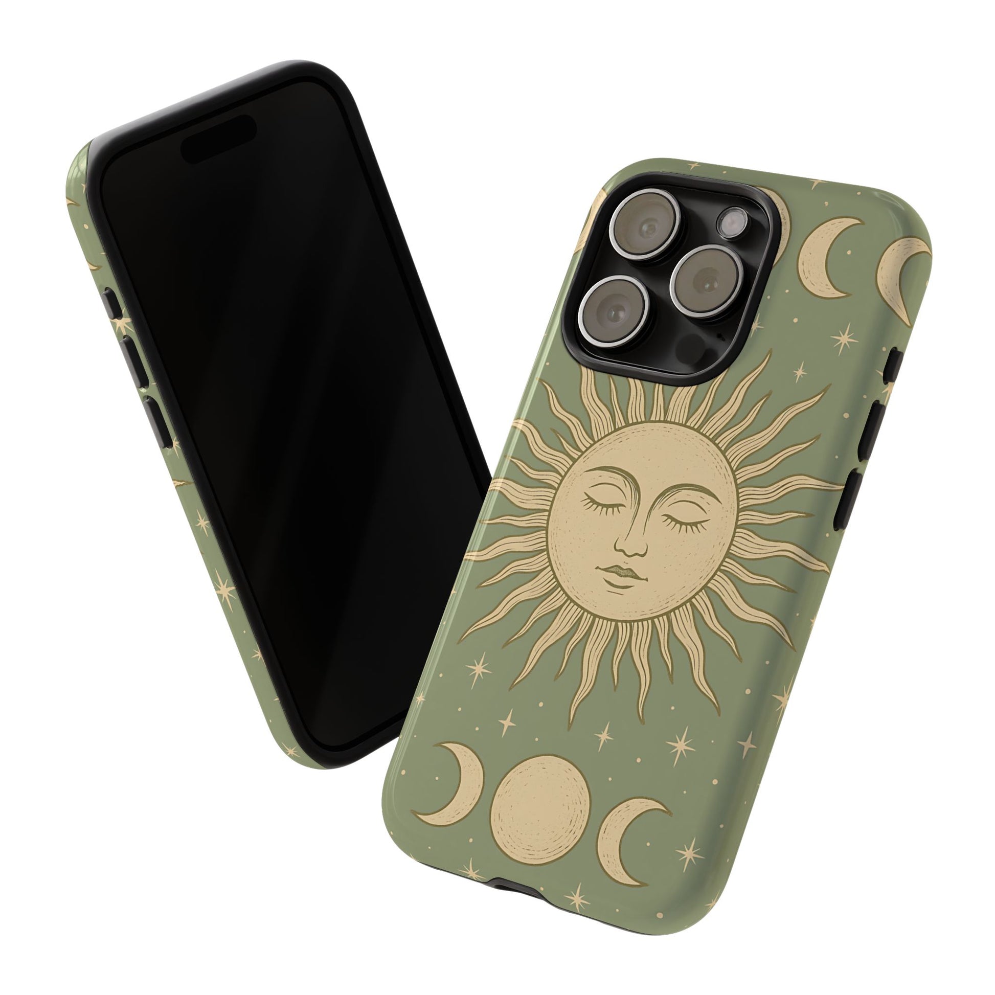 Protect your phone in style with our Boho Sun and Moon Phone Case, featuring a serene celestial design in warm, earthy tones on a muted sage background.