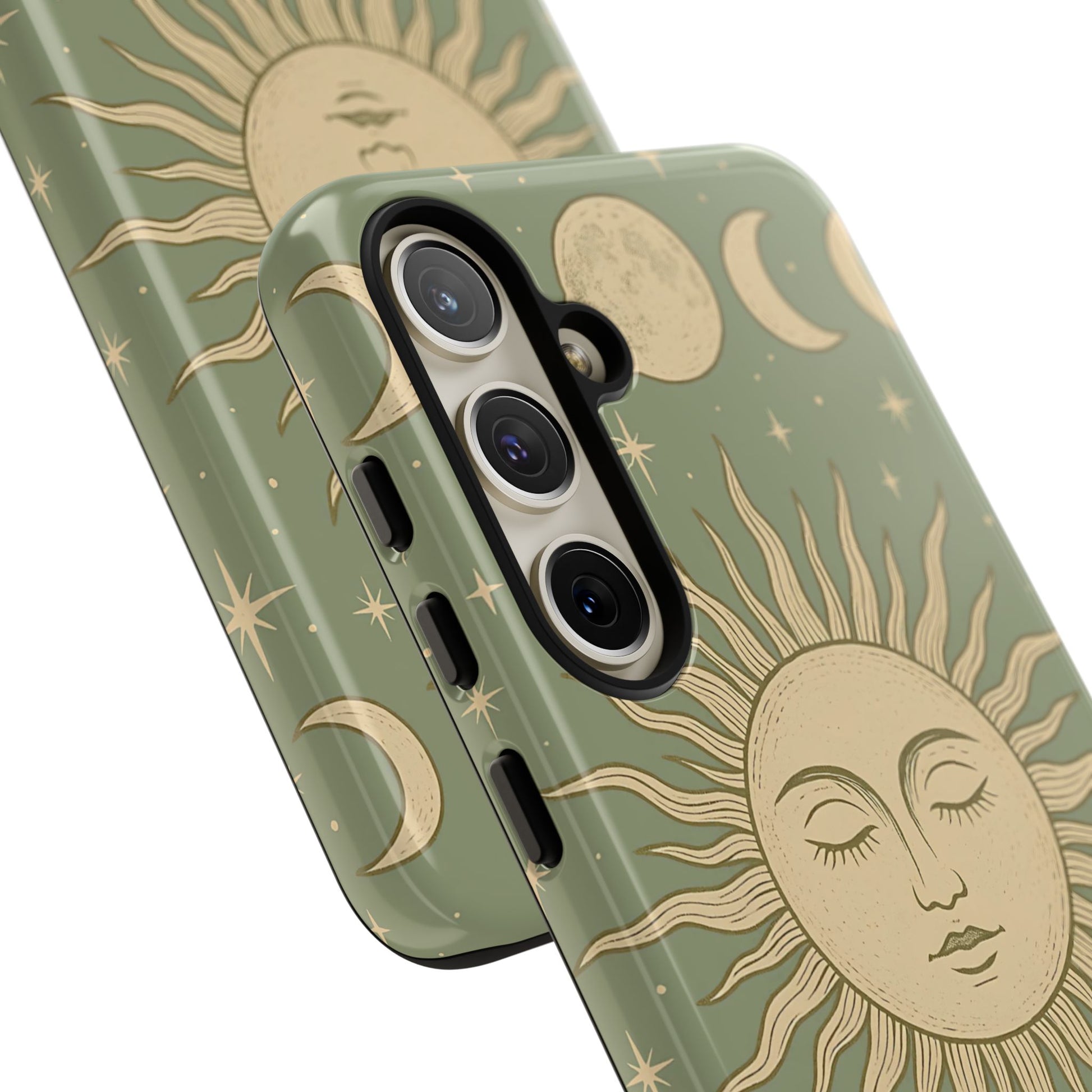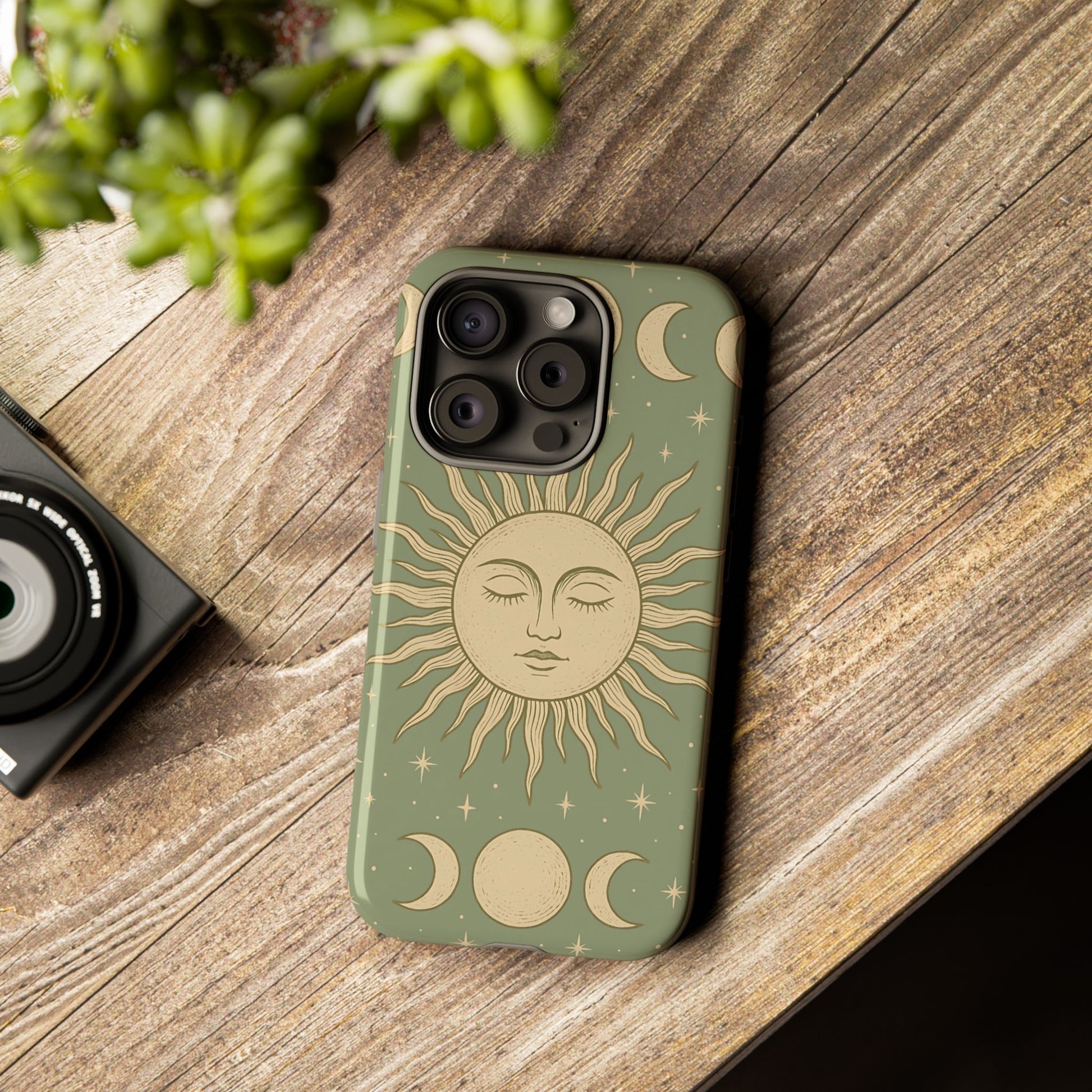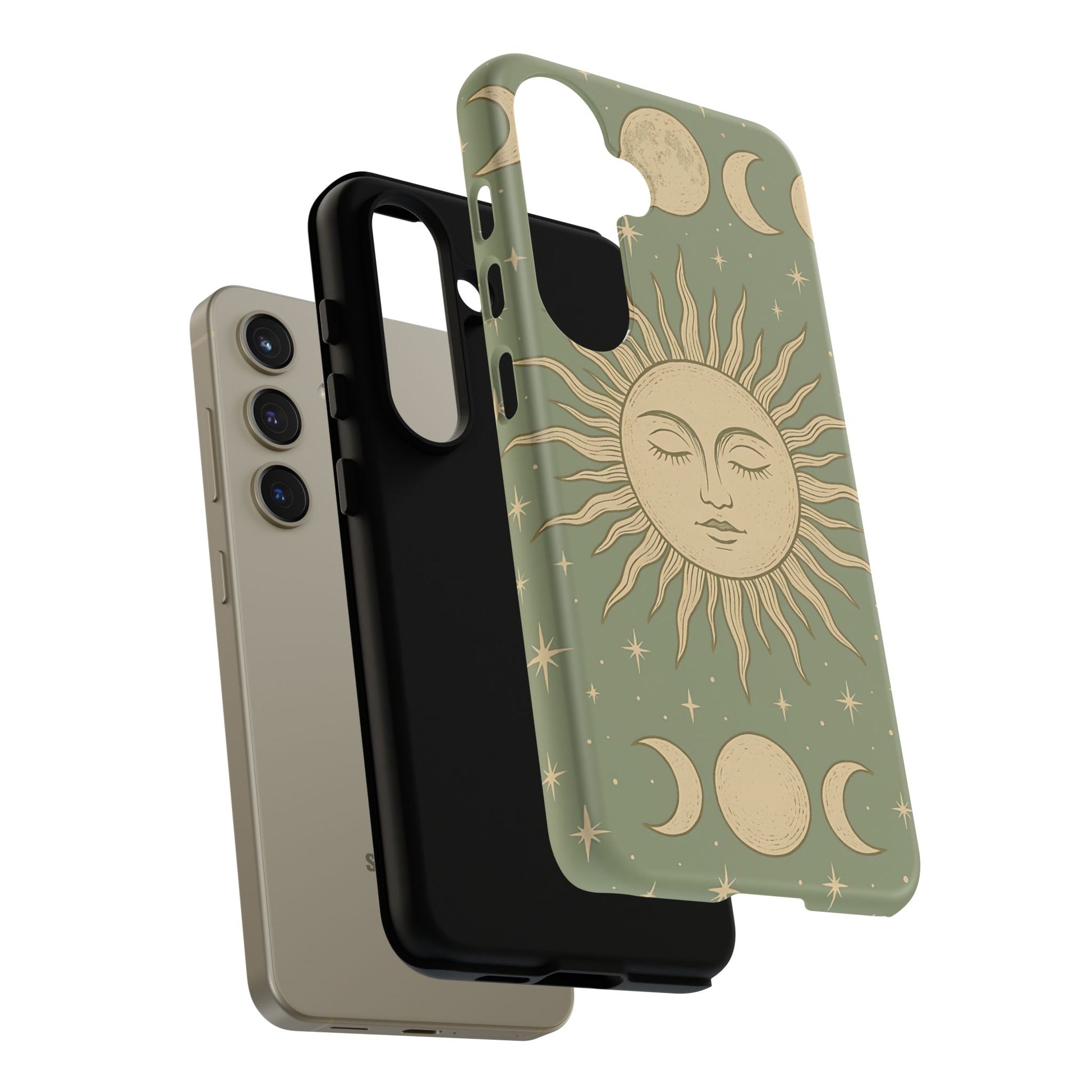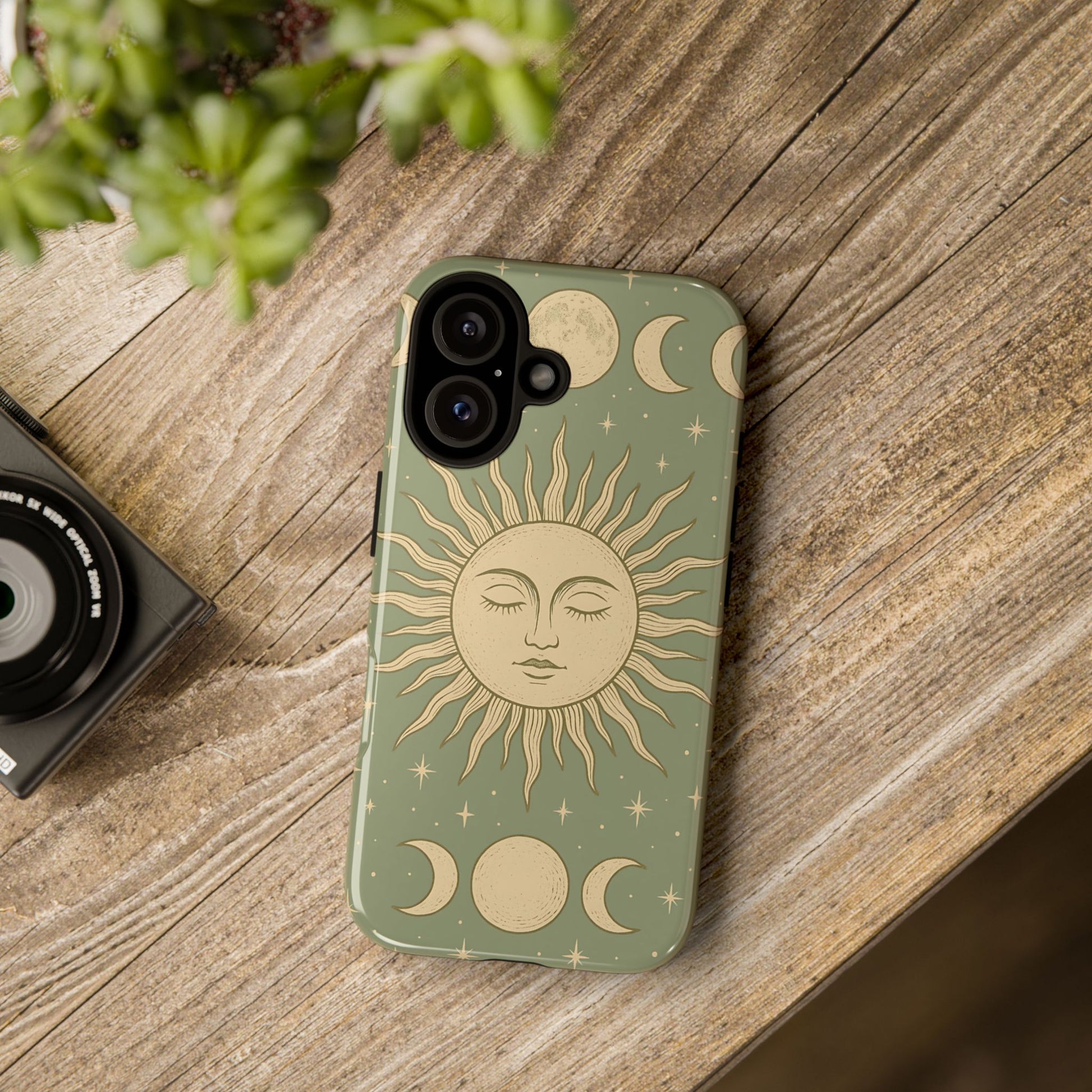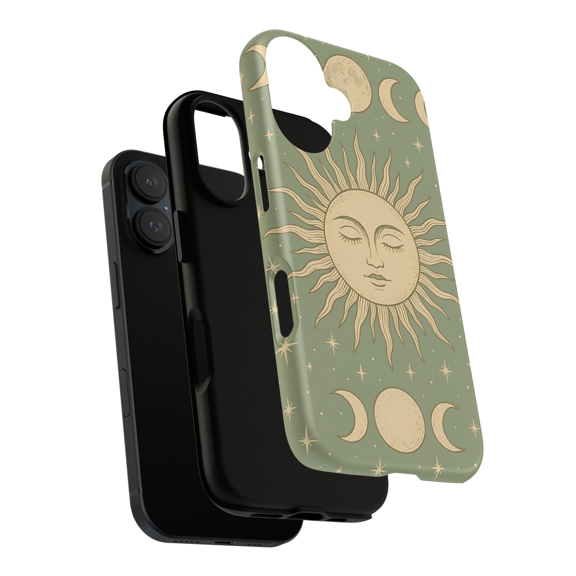 Protect your phone in style with our Boho Sun and Moon Phone Case, featuring a serene celestial design in warm, earthy tones on a muted sage background.