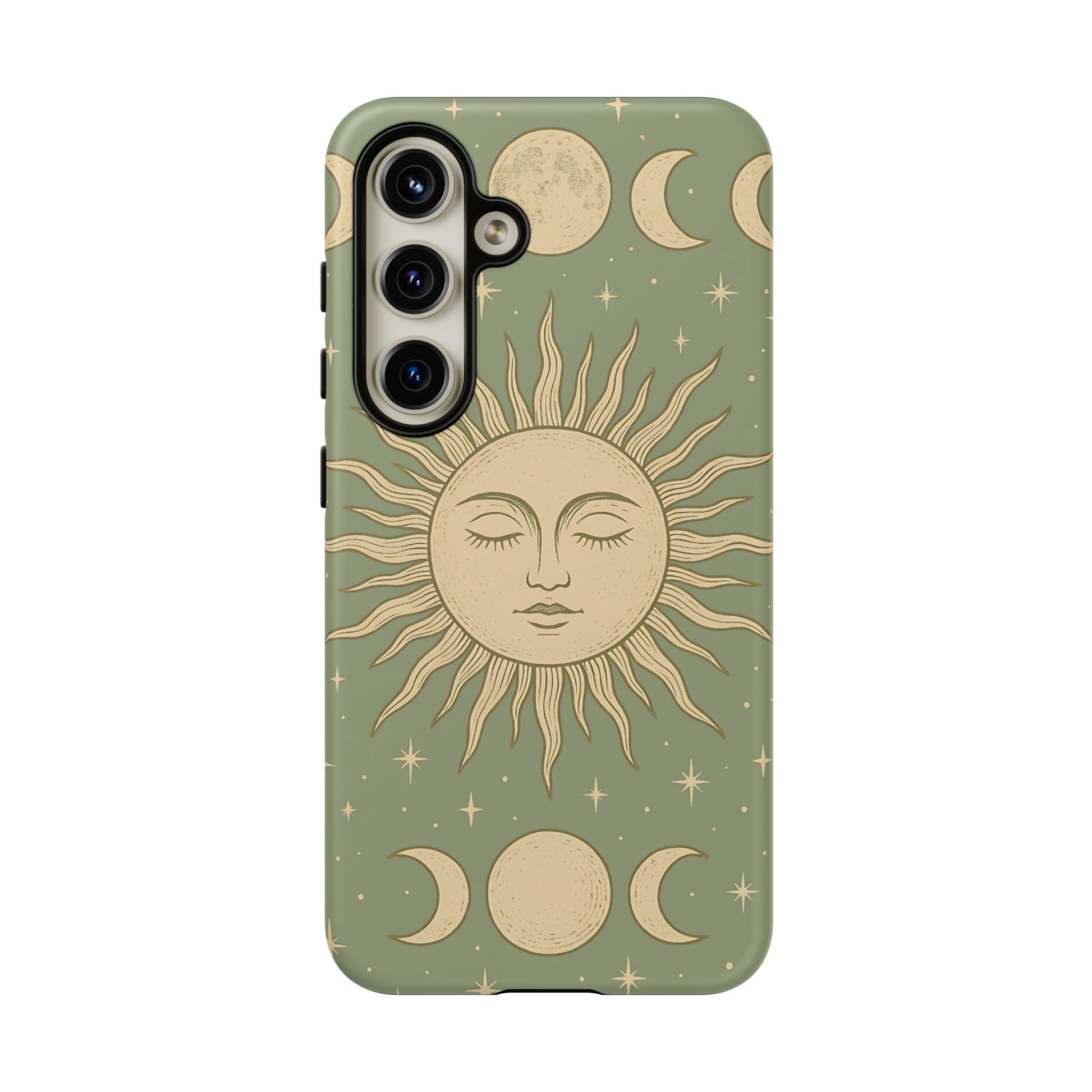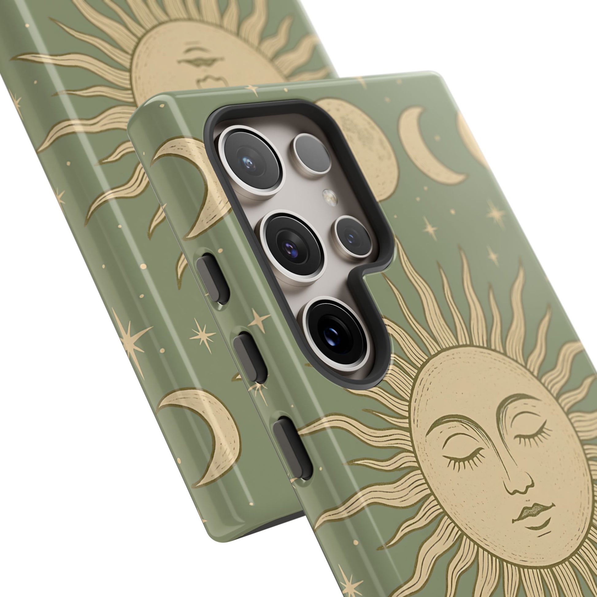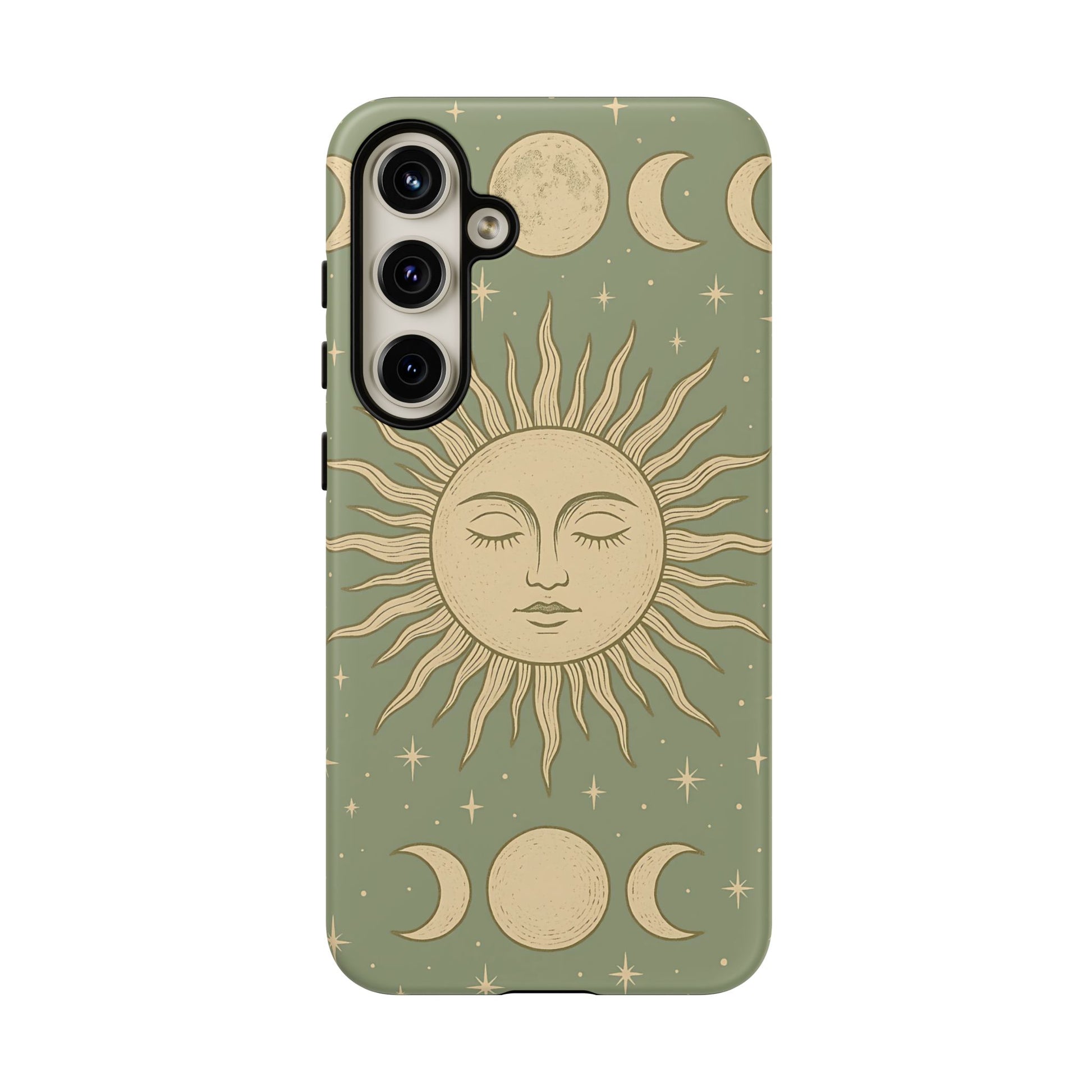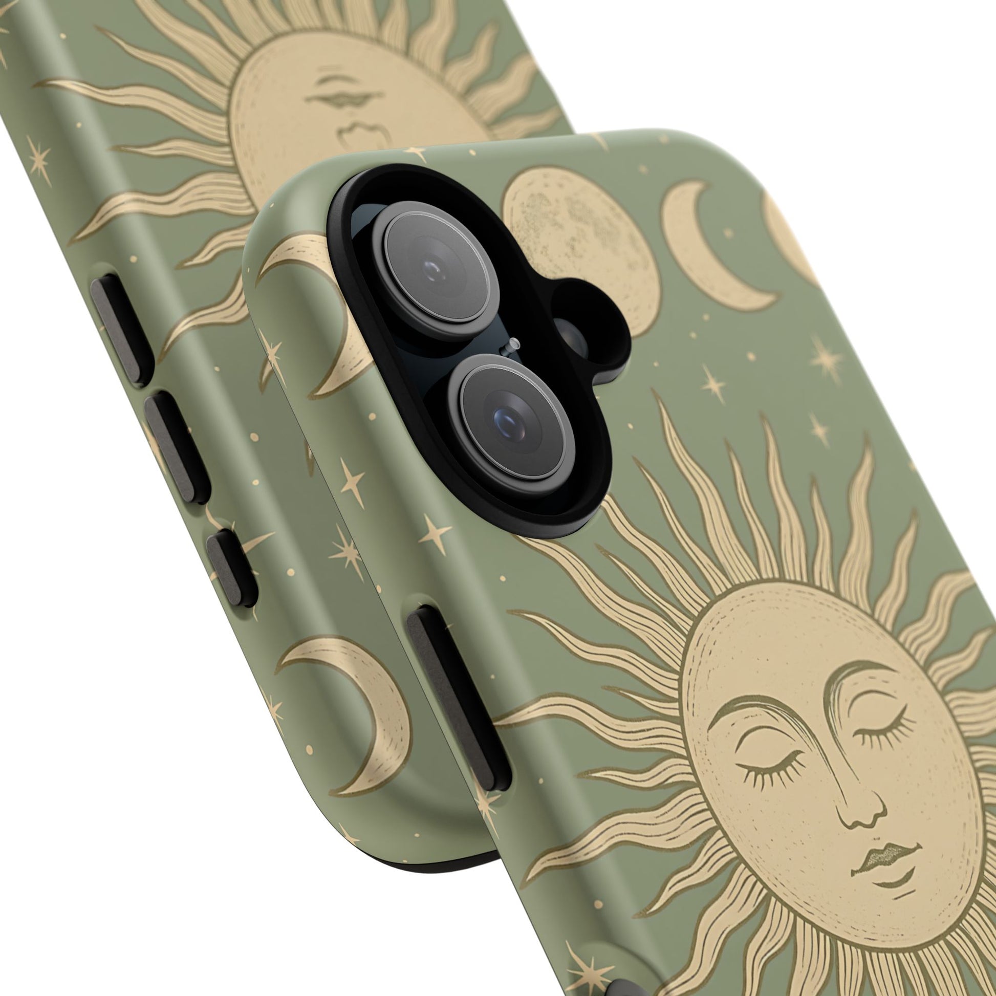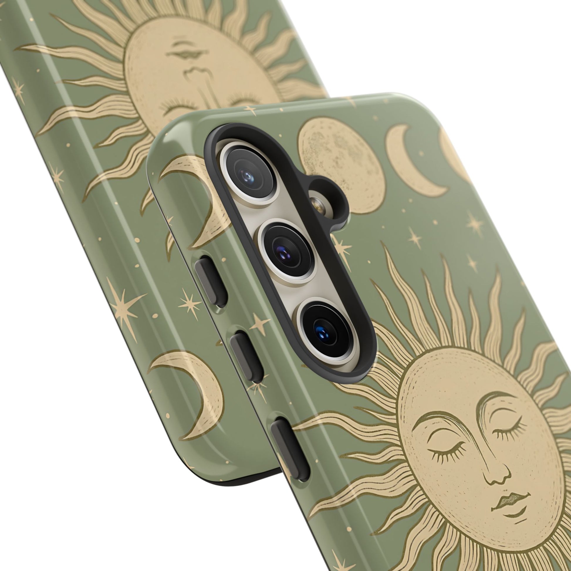 Protect your phone in style with our Boho Sun and Moon Phone Case, featuring a serene celestial design in warm, earthy tones on a muted sage background.