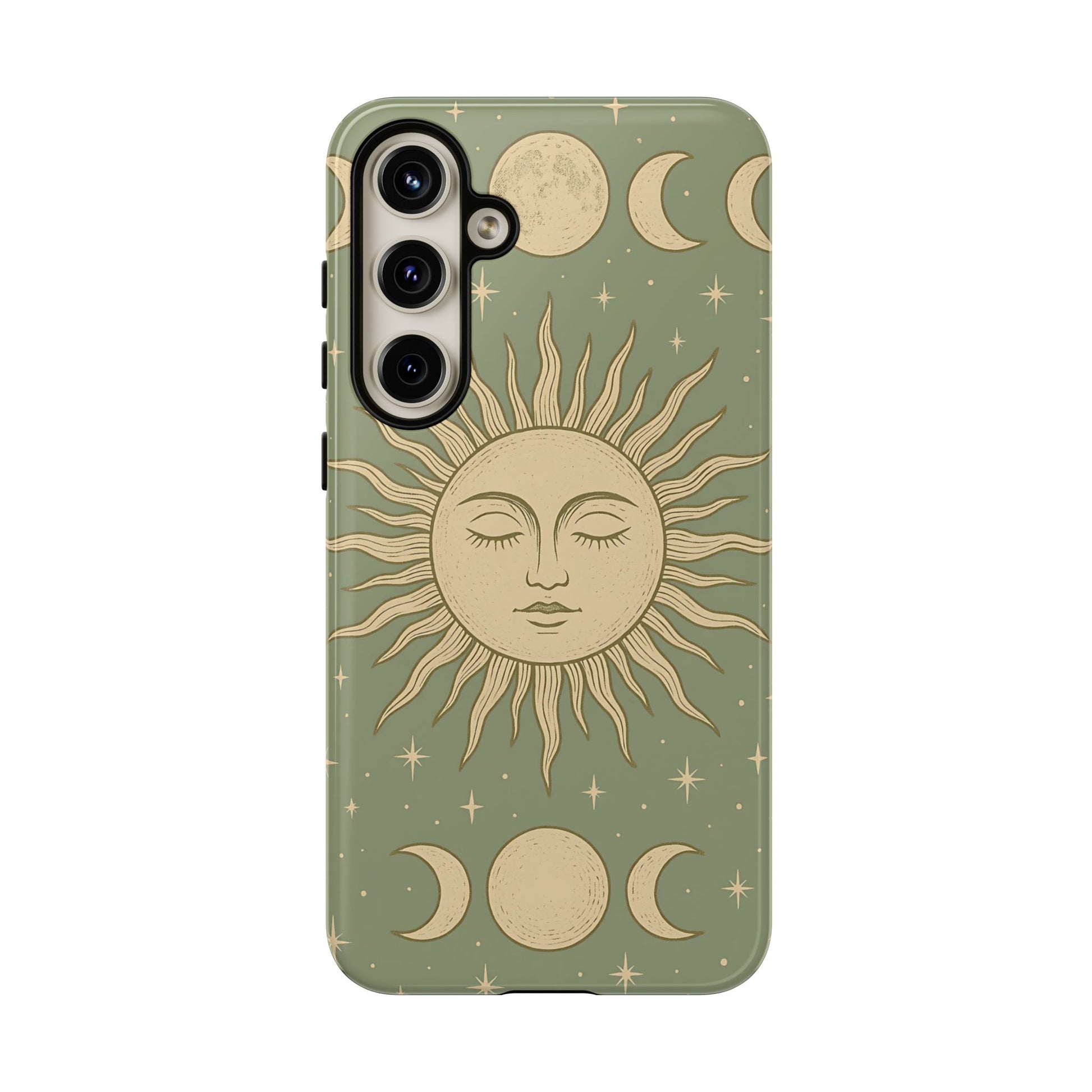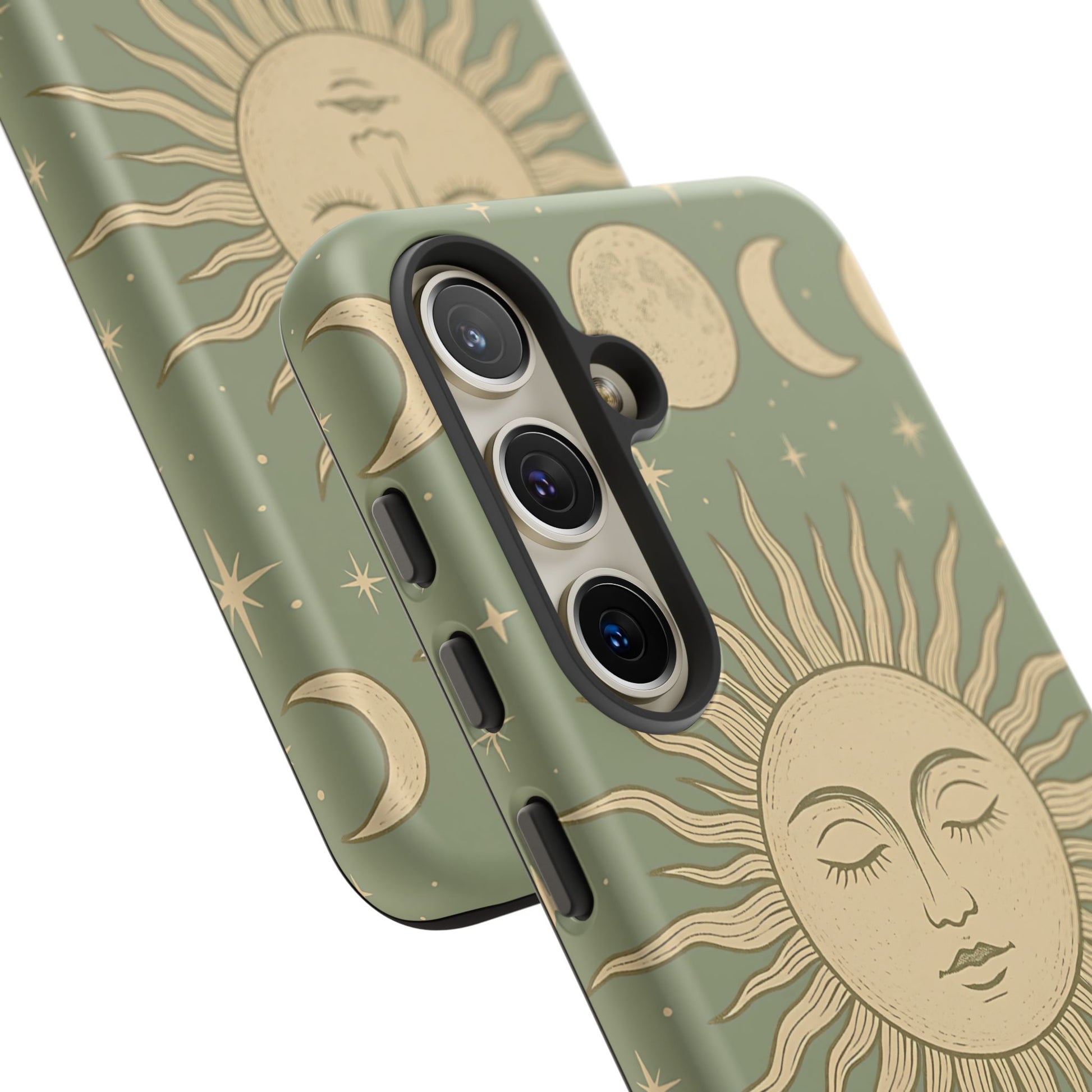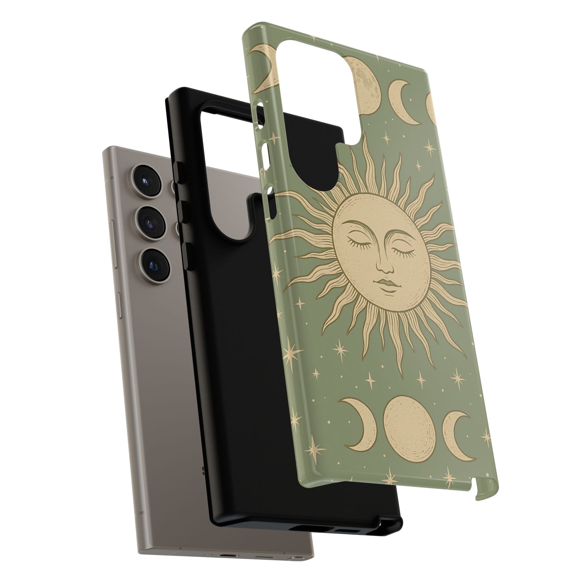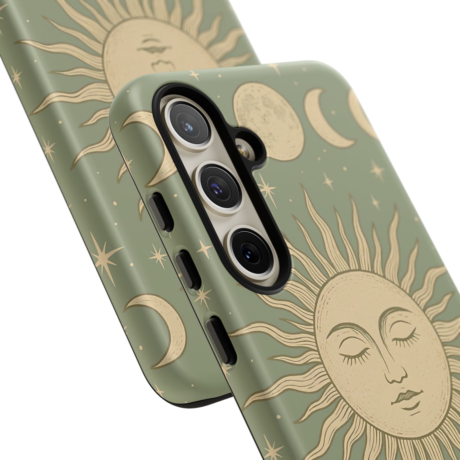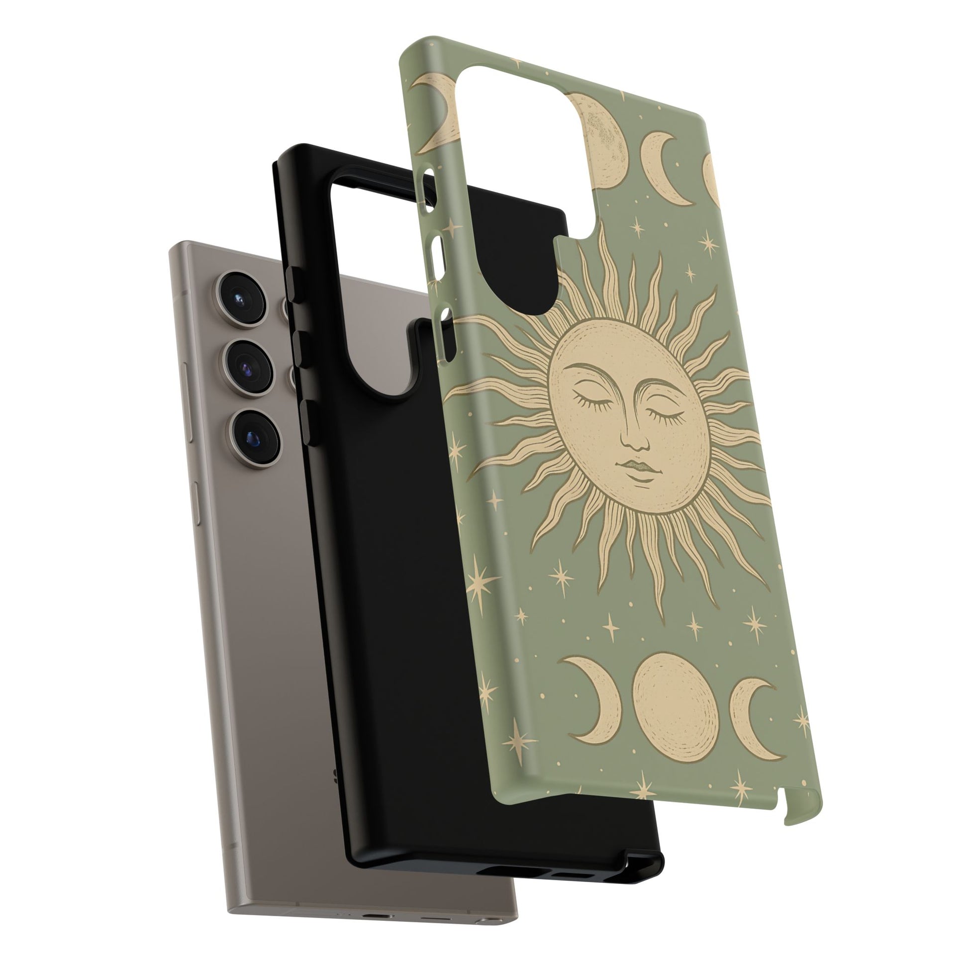 Protect your phone in style with our Boho Sun and Moon Phone Case, featuring a serene celestial design in warm, earthy tones on a muted sage background.