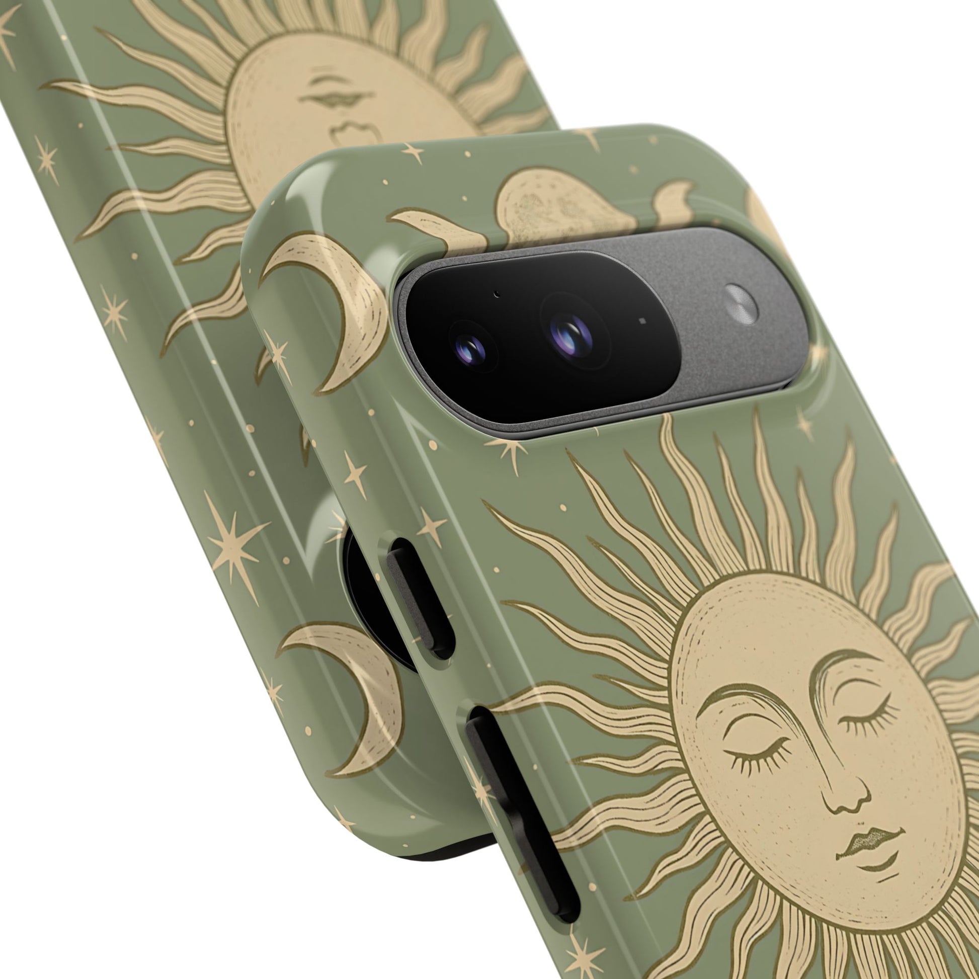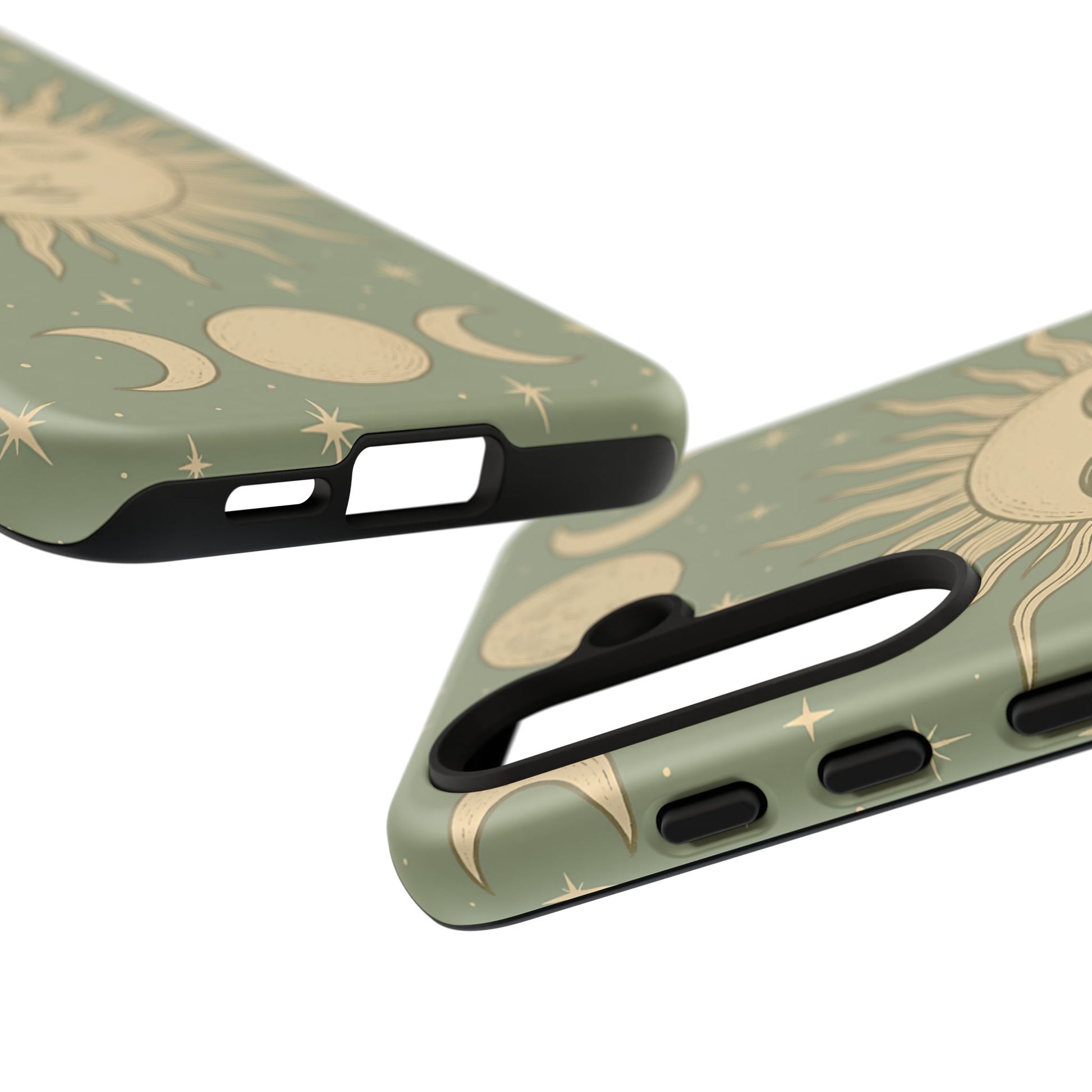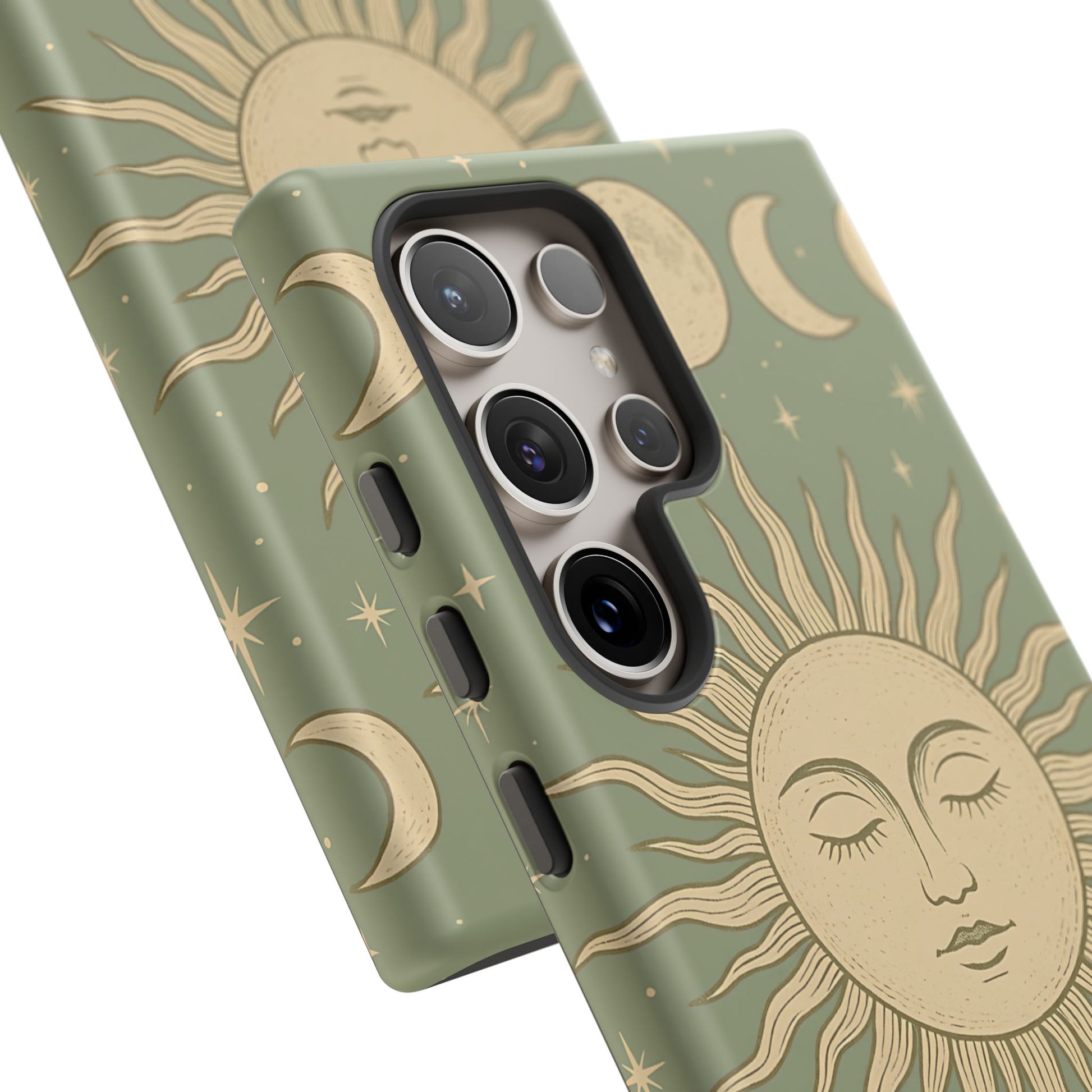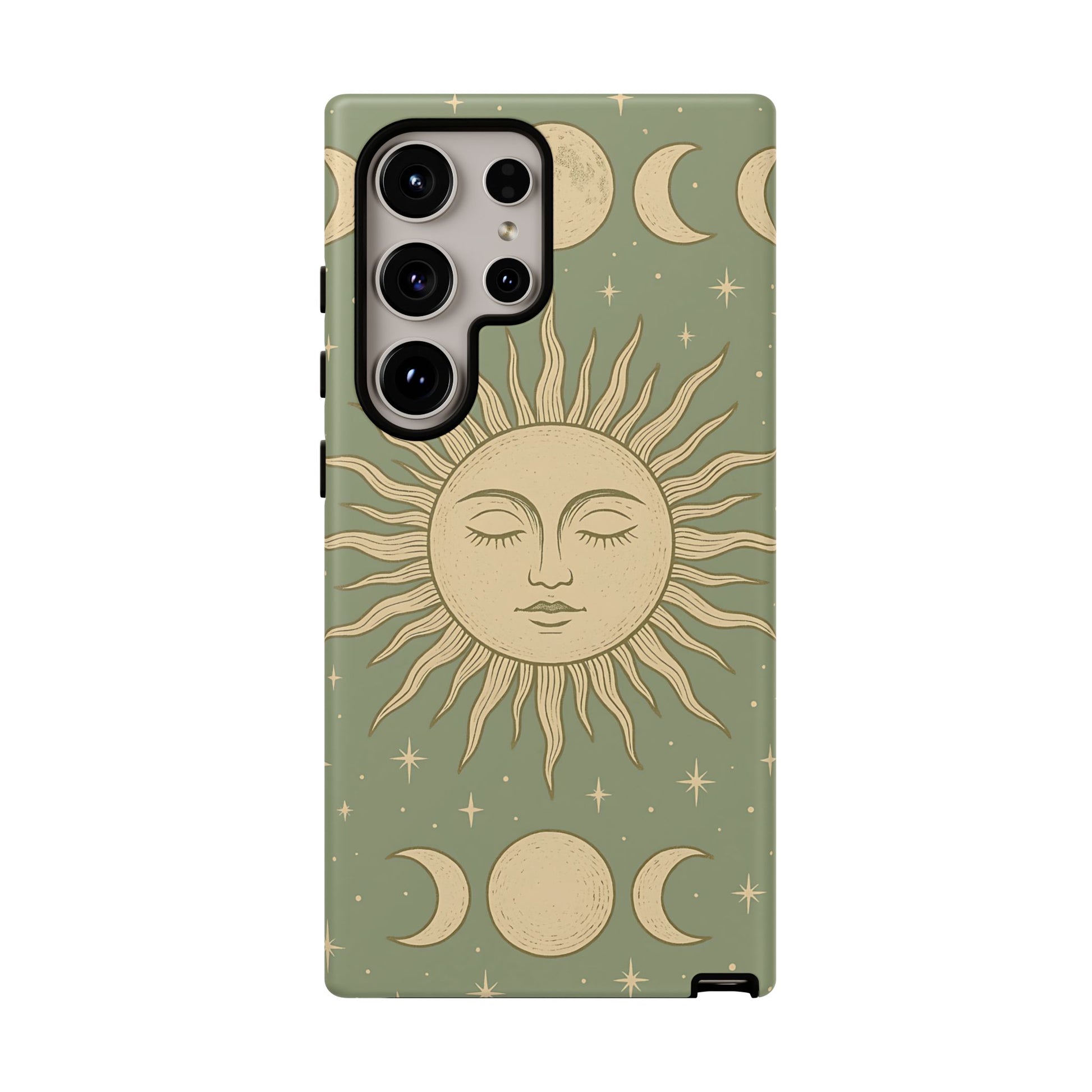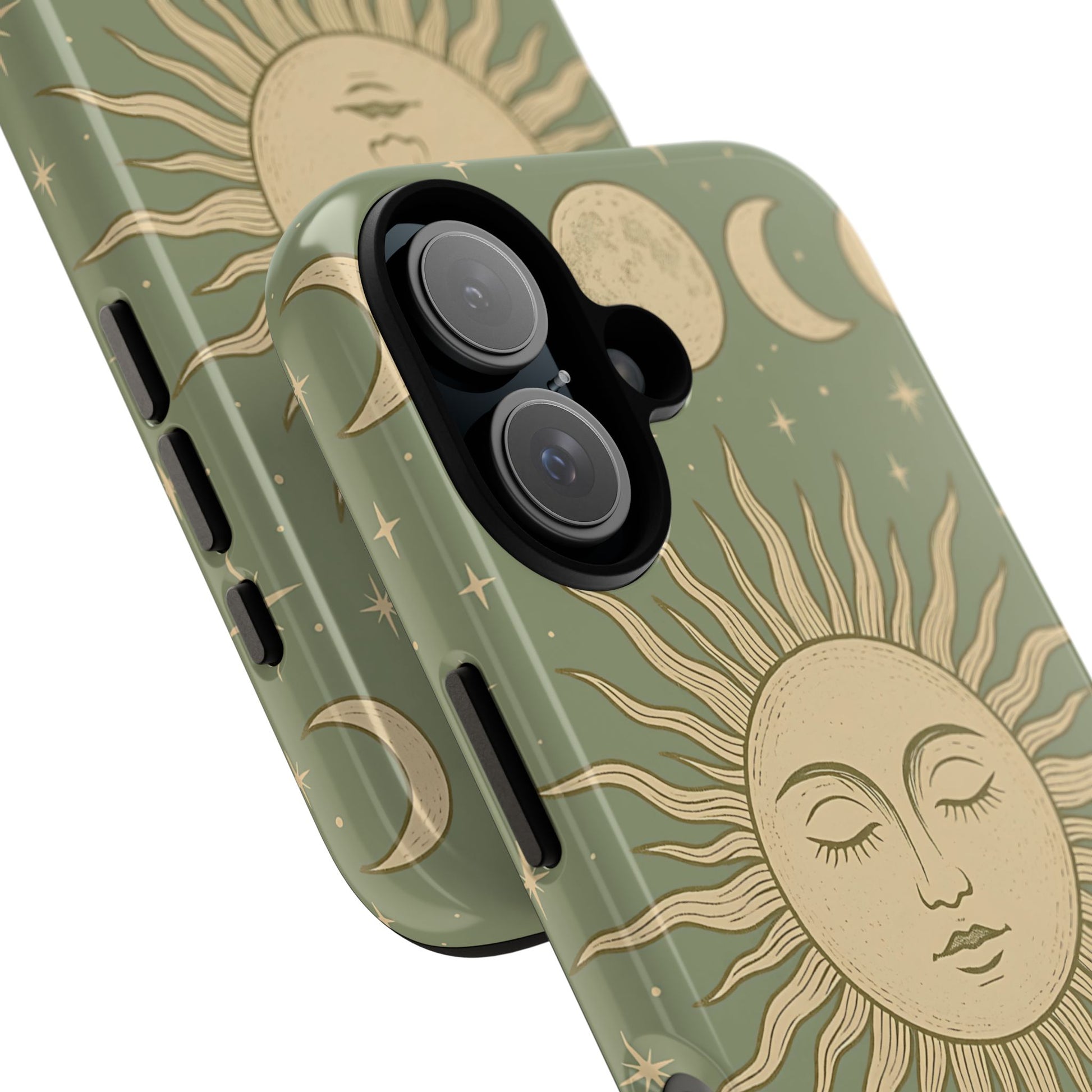 Protect your phone in style with our Boho Sun and Moon Phone Case, featuring a serene celestial design in warm, earthy tones on a muted sage background.