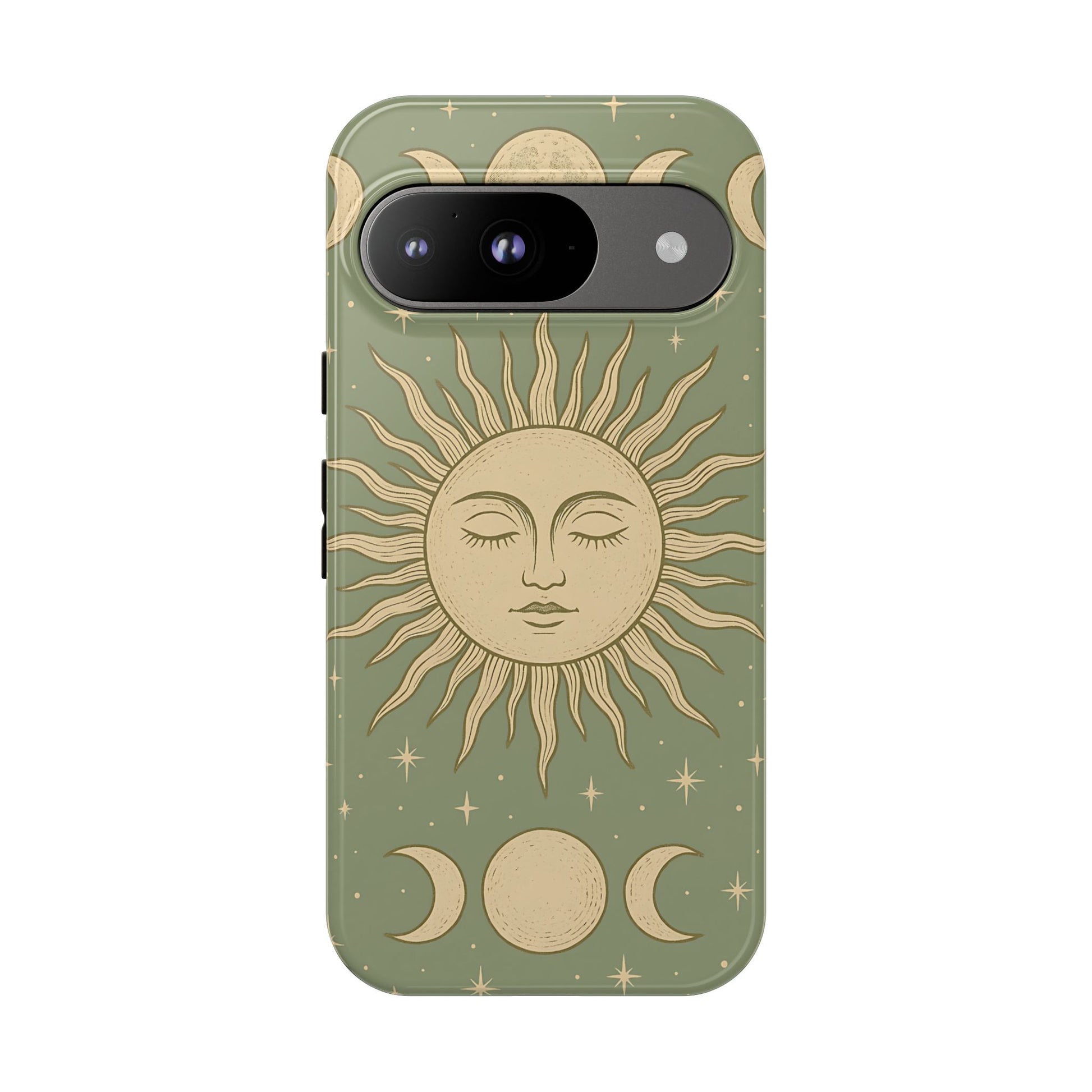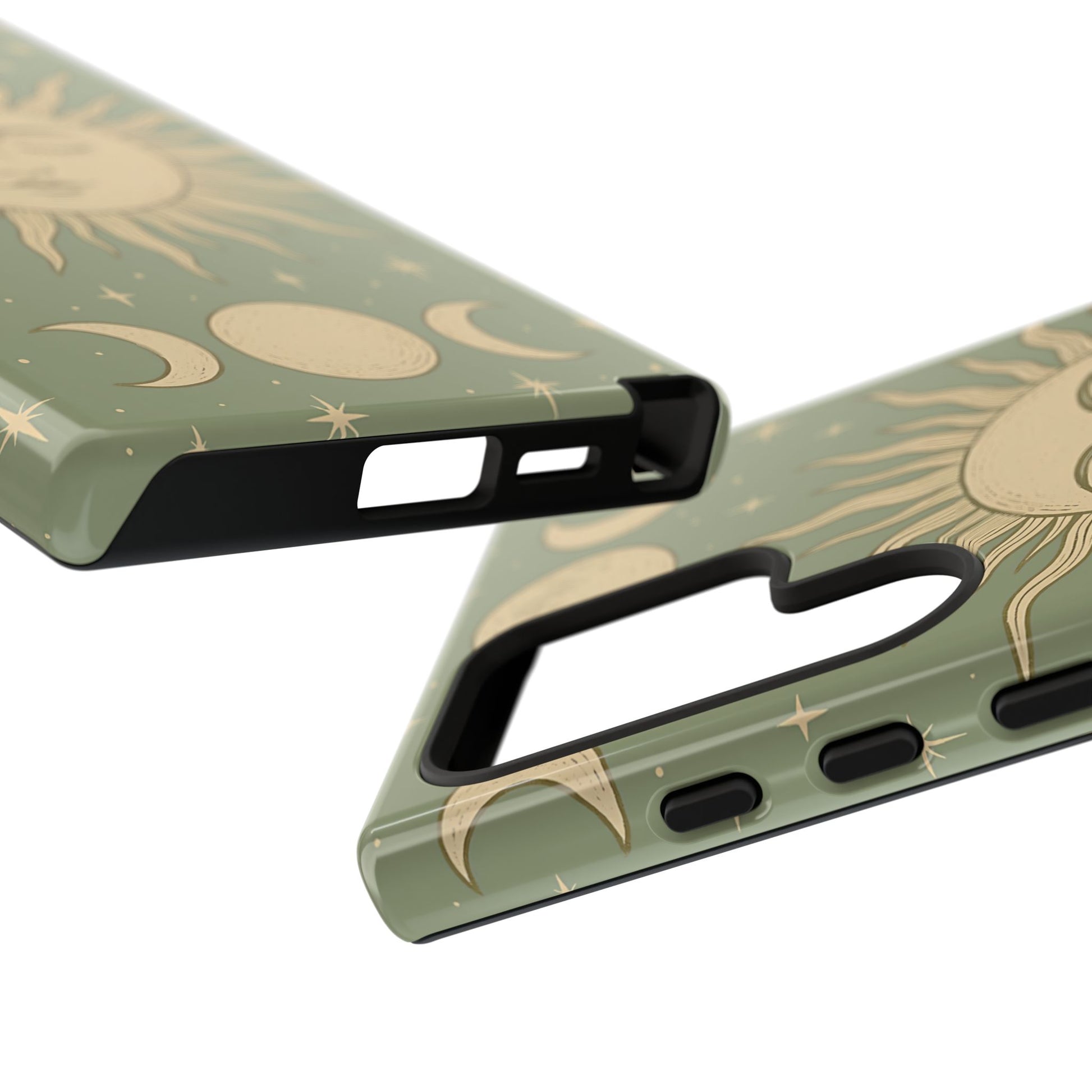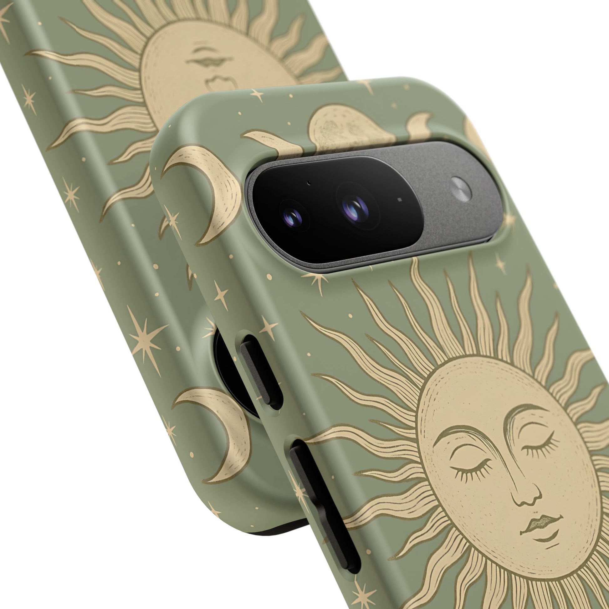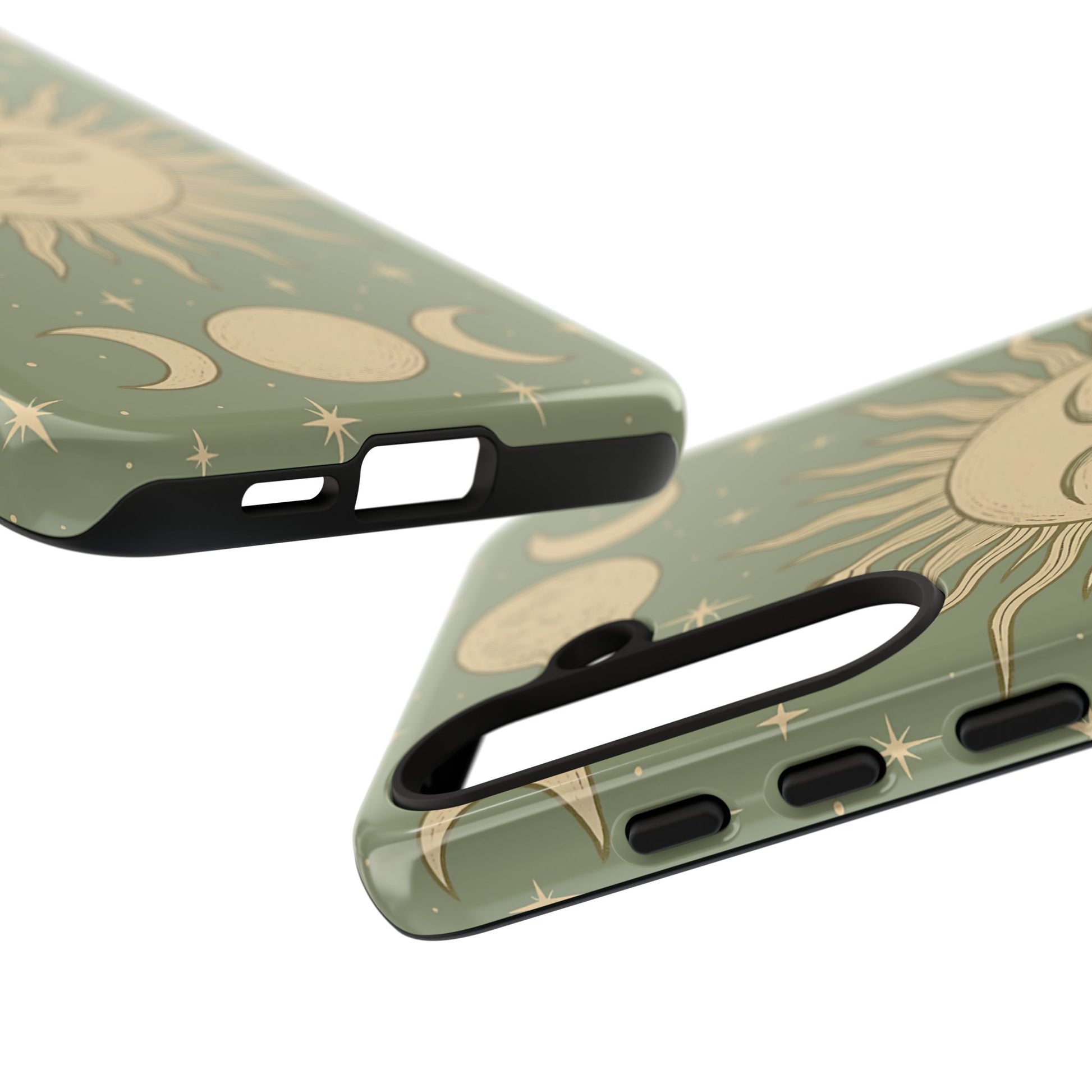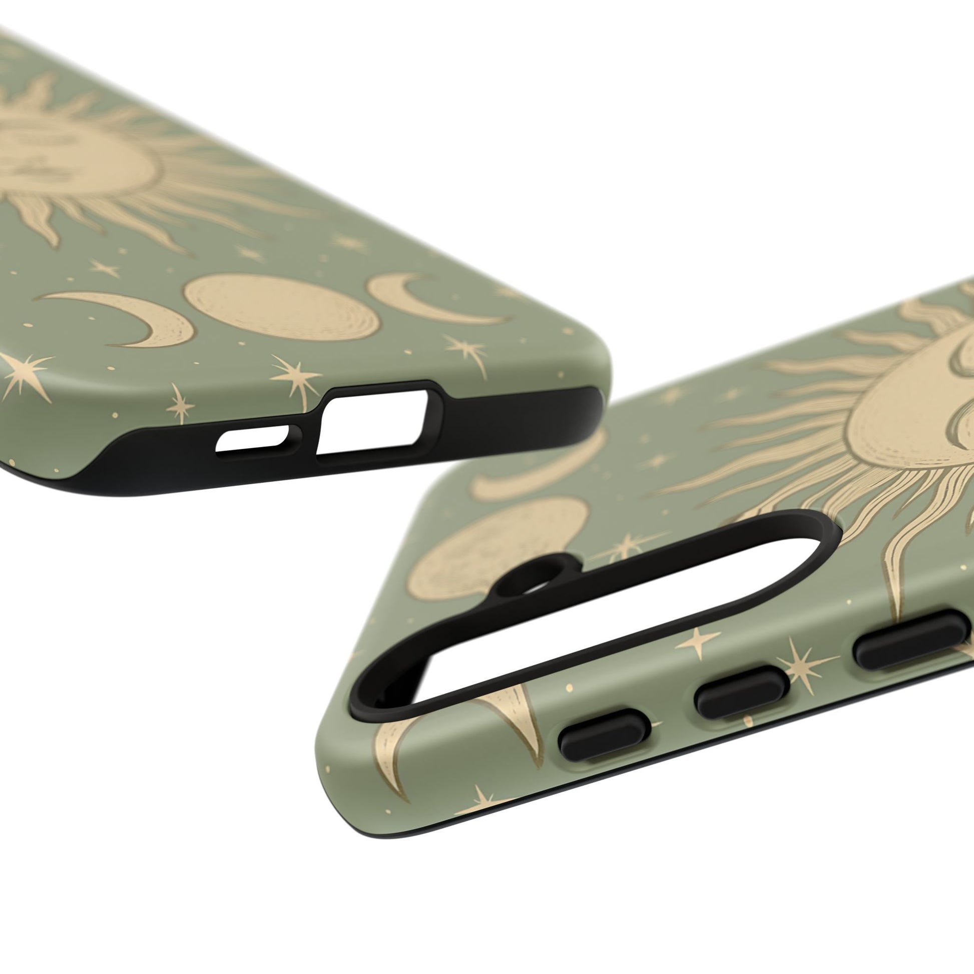 Protect your phone in style with our Boho Sun and Moon Phone Case, featuring a serene celestial design in warm, earthy tones on a muted sage background.