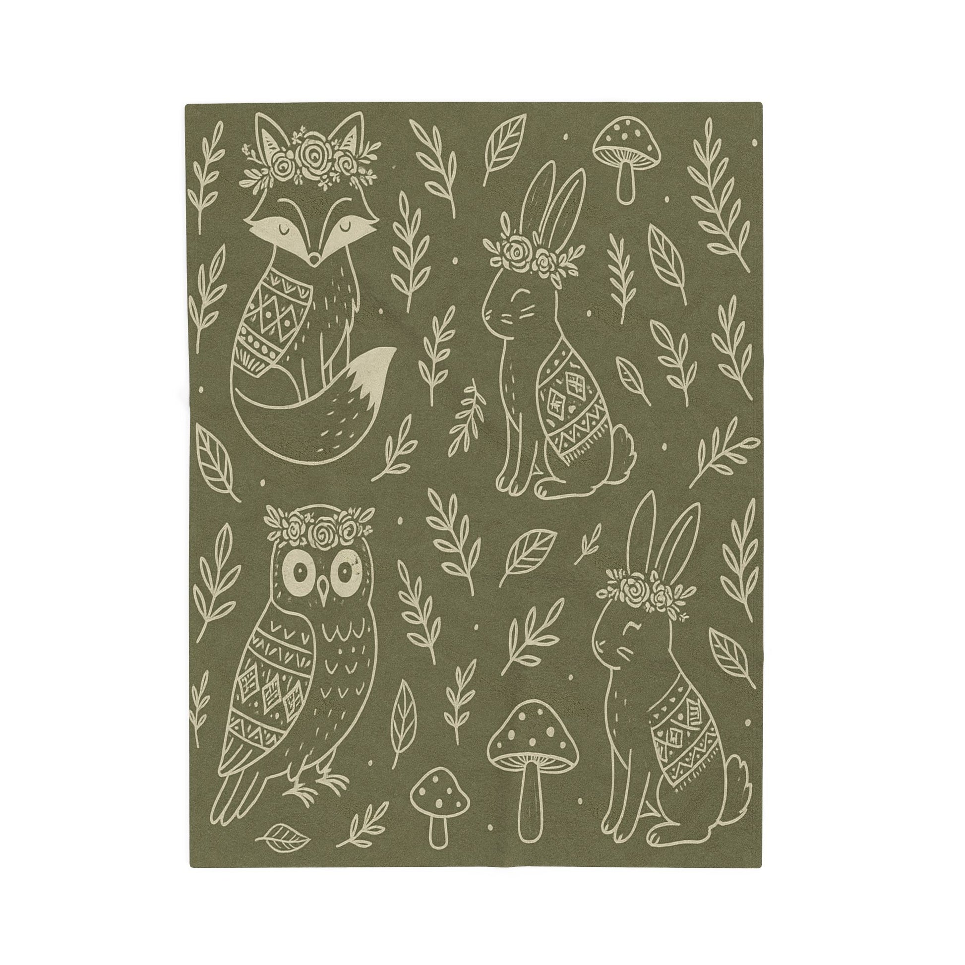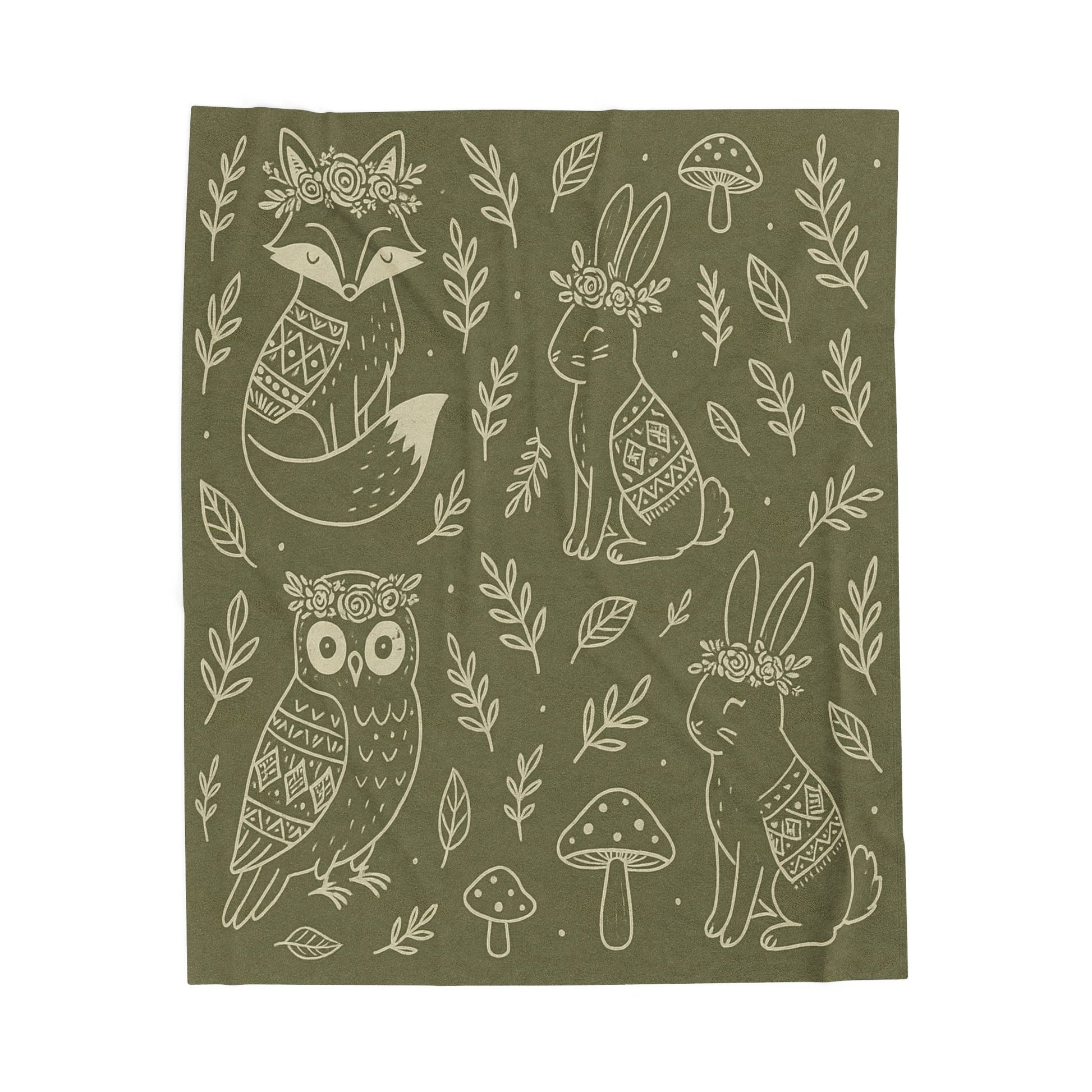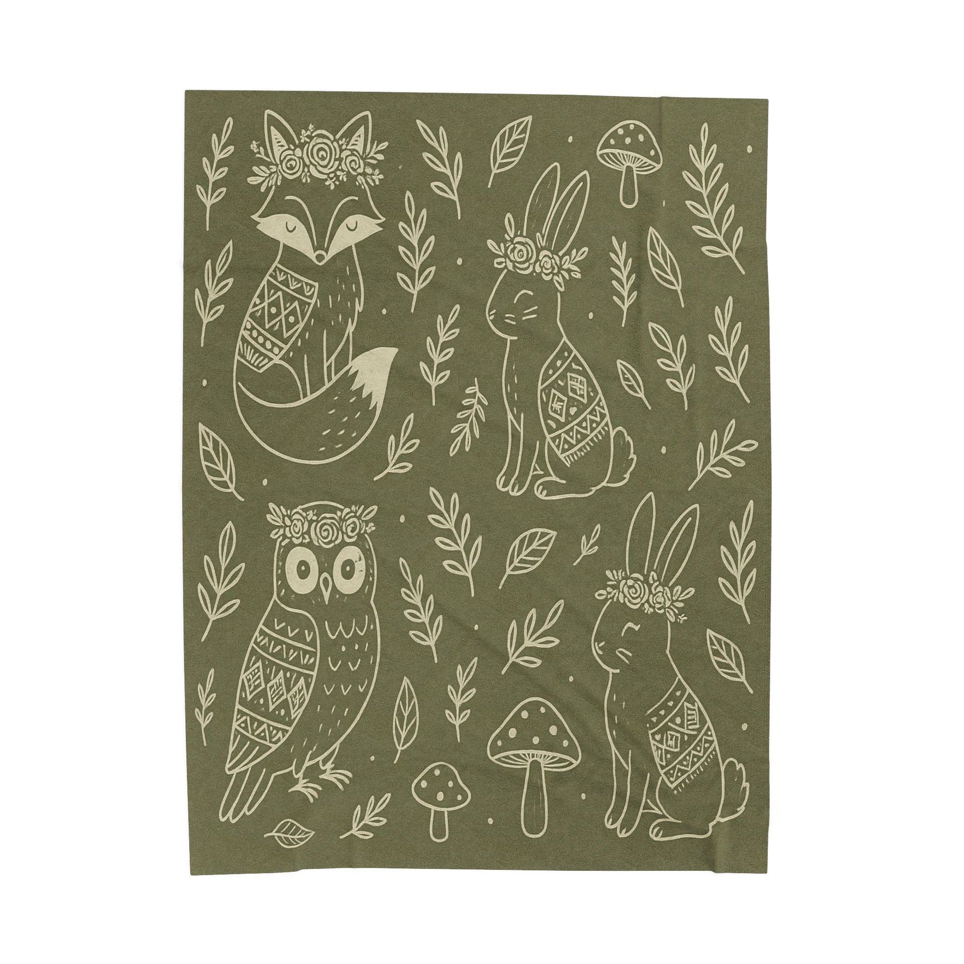 Boho Woodland Animal Velveteen Plush Blanket – Forest Green
