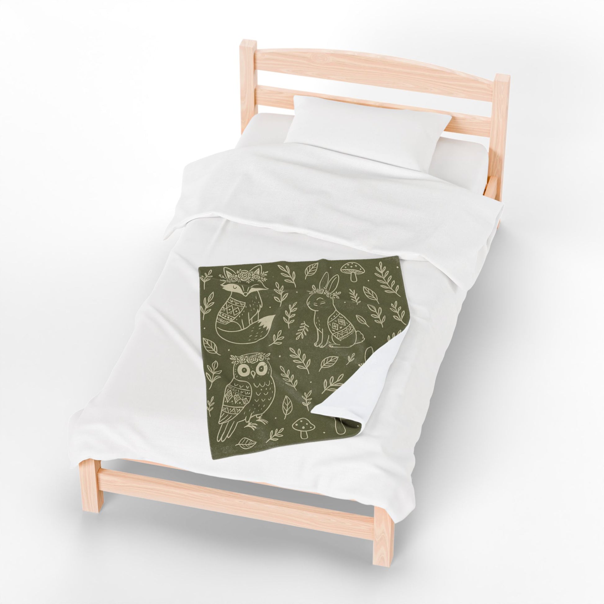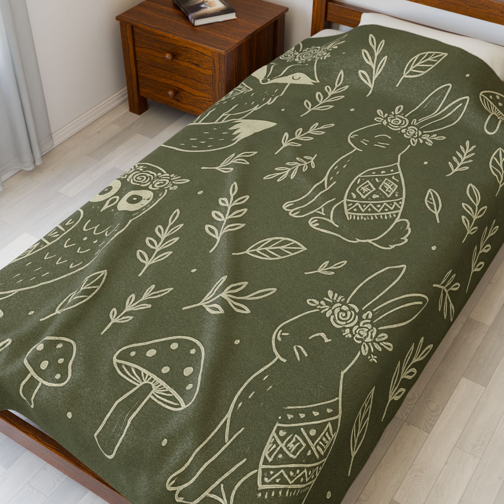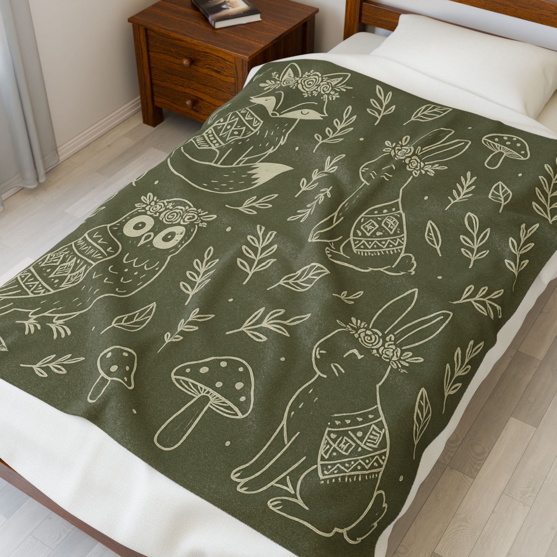 Boho Woodland Animal Velveteen Plush Blanket – Forest Green