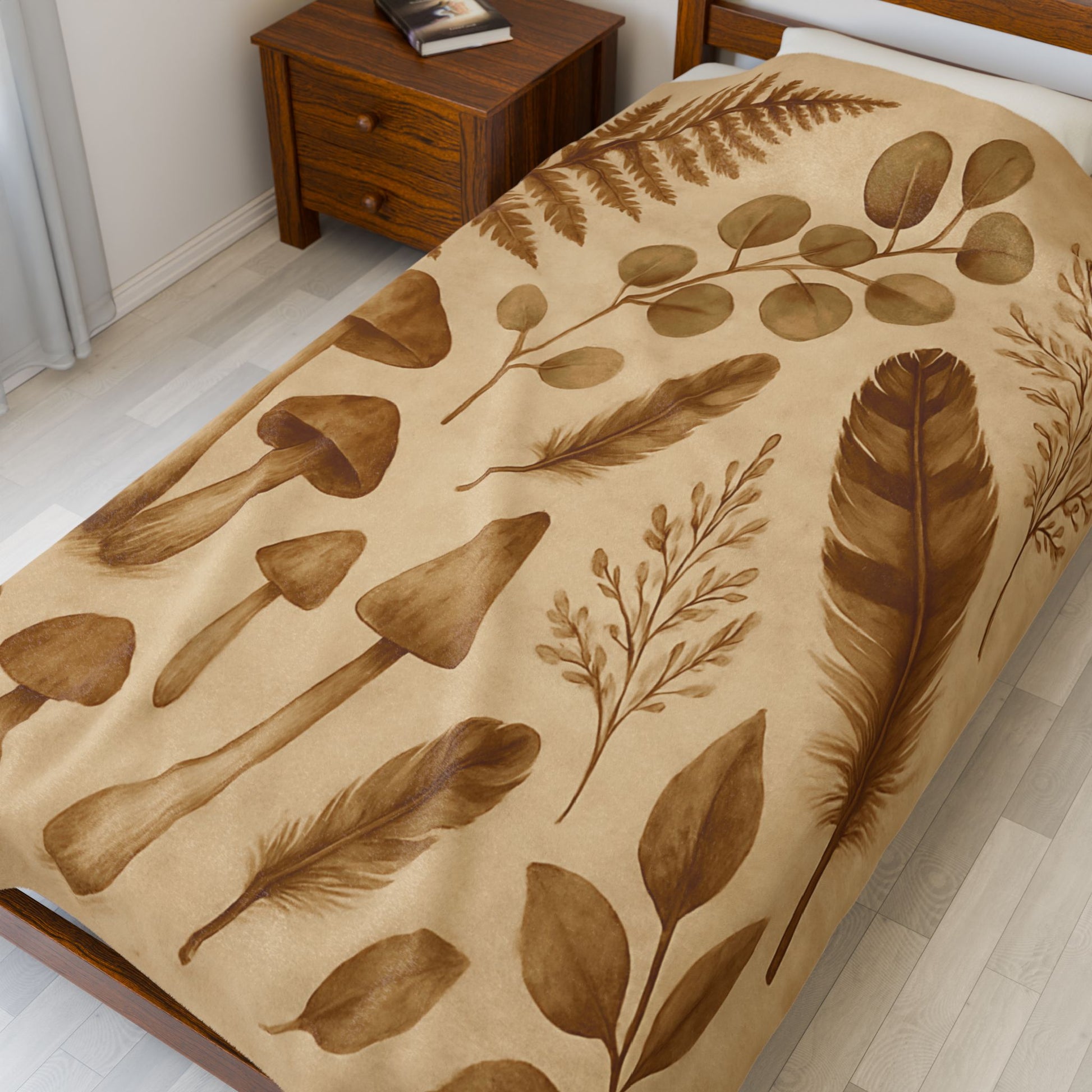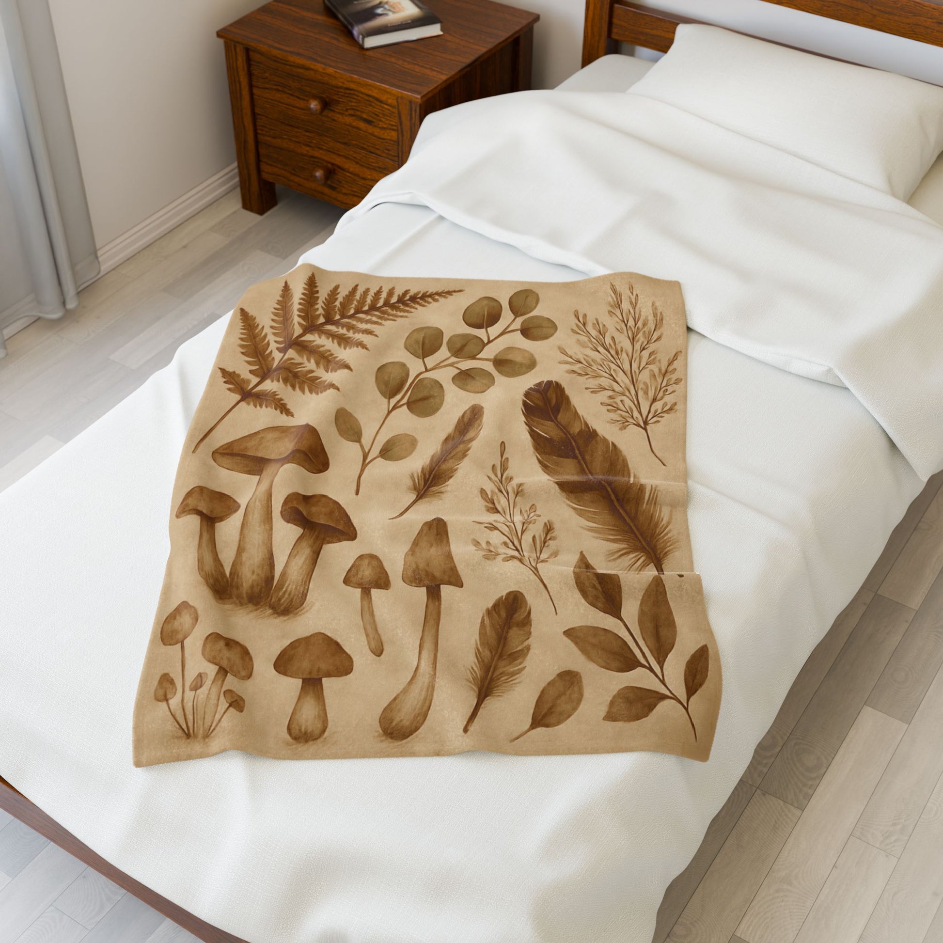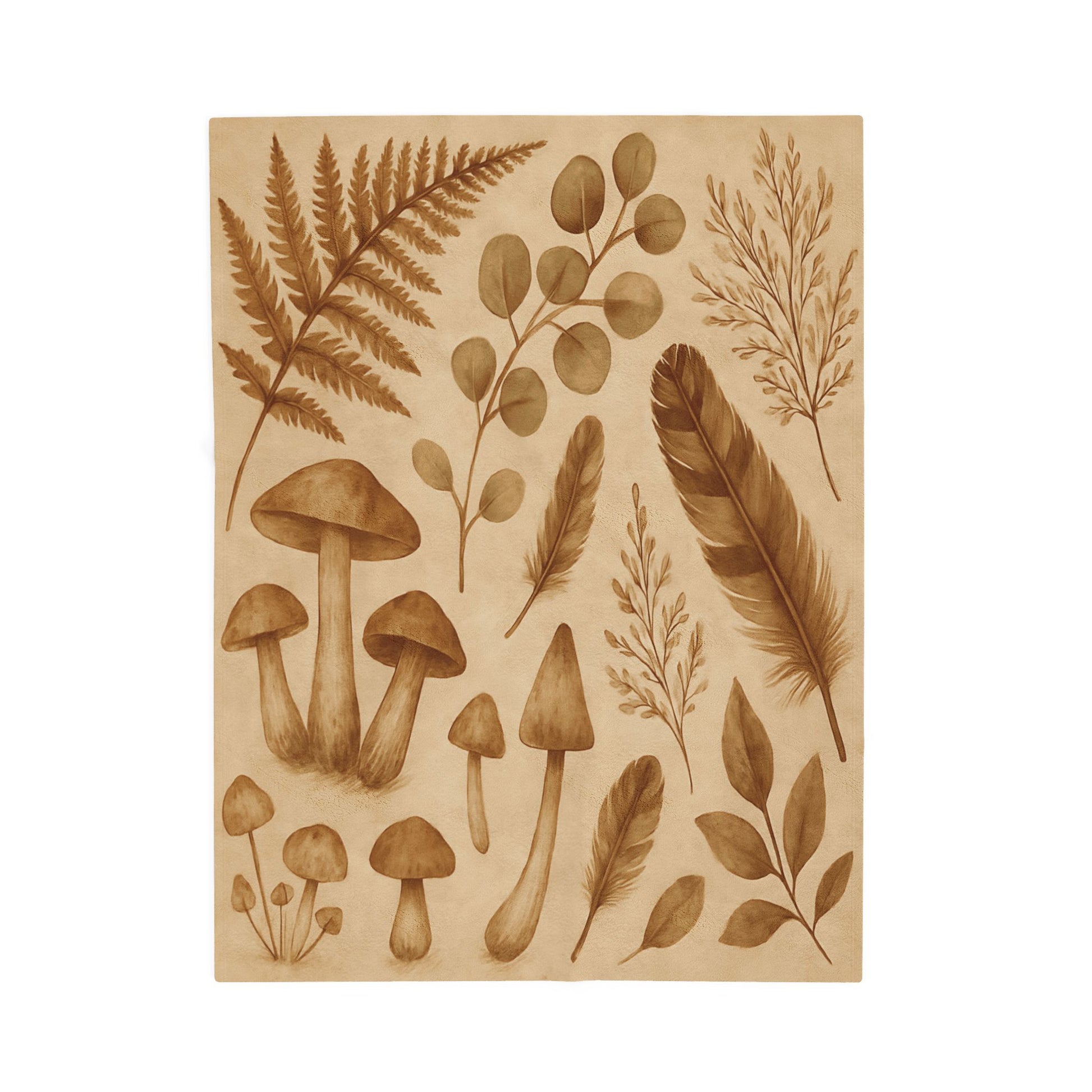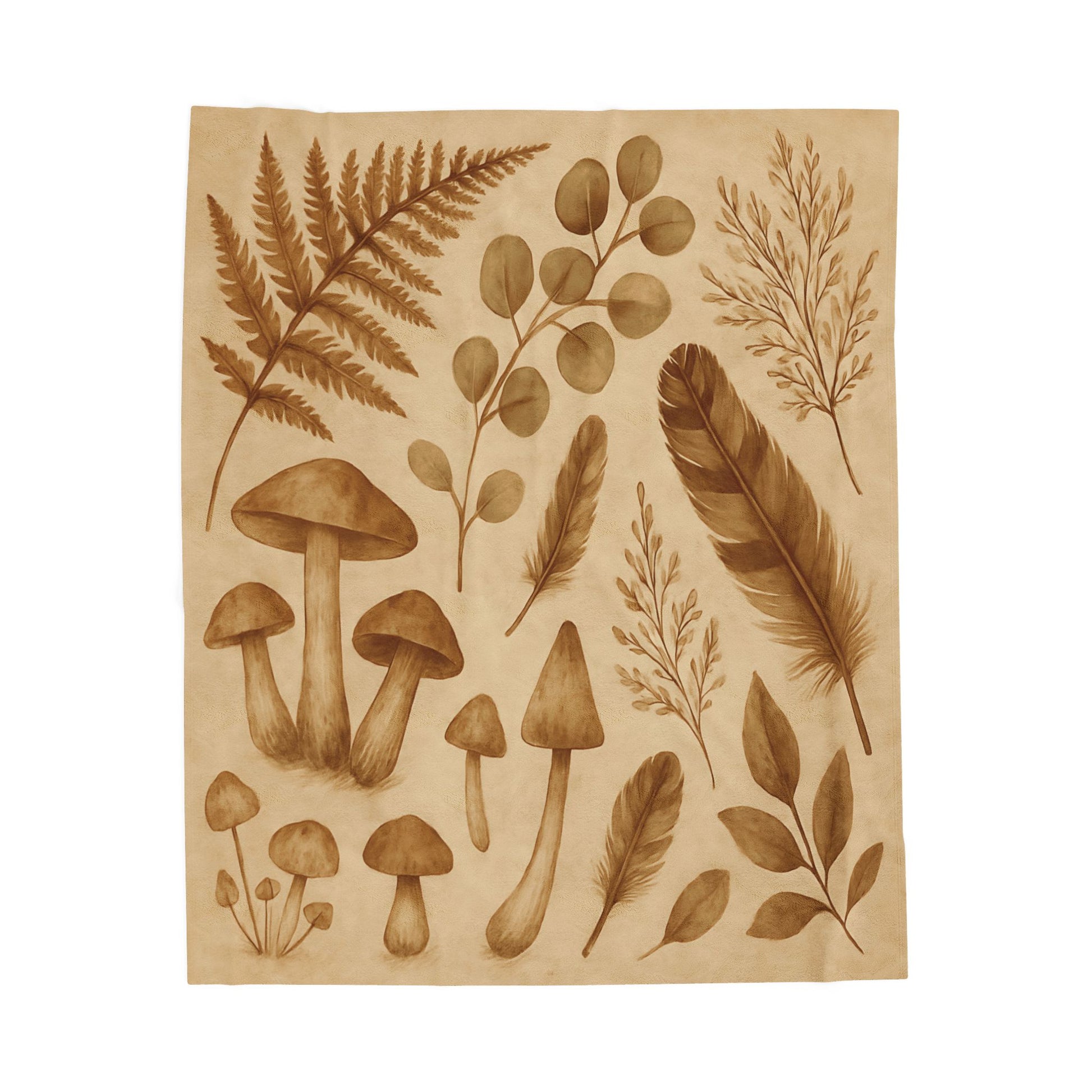 Featuring a soft, sepia-toned design of mushrooms, feathers, ferns, and delicate foliage, this nature-inspired throw brings an earthy, forestcore vibe to any space.