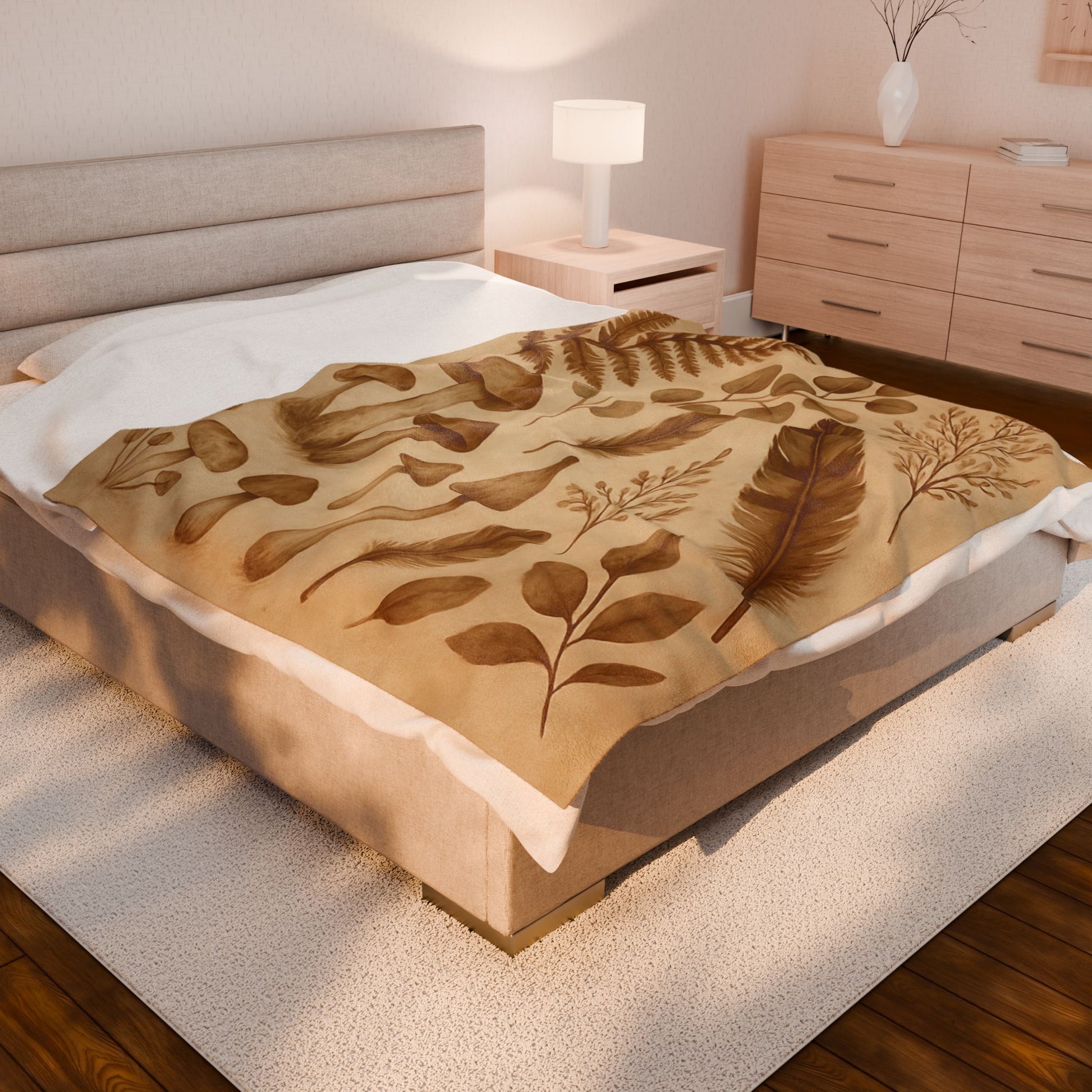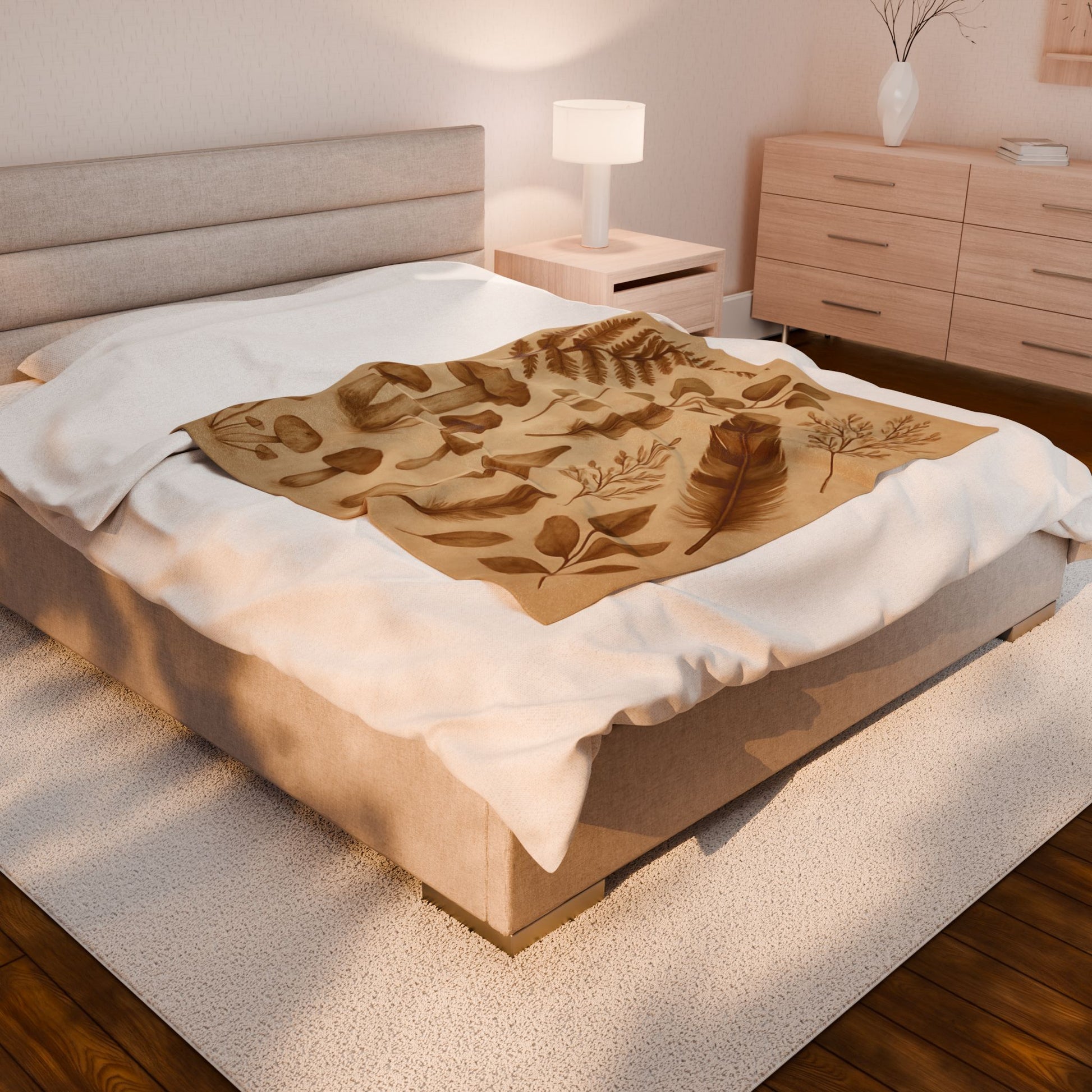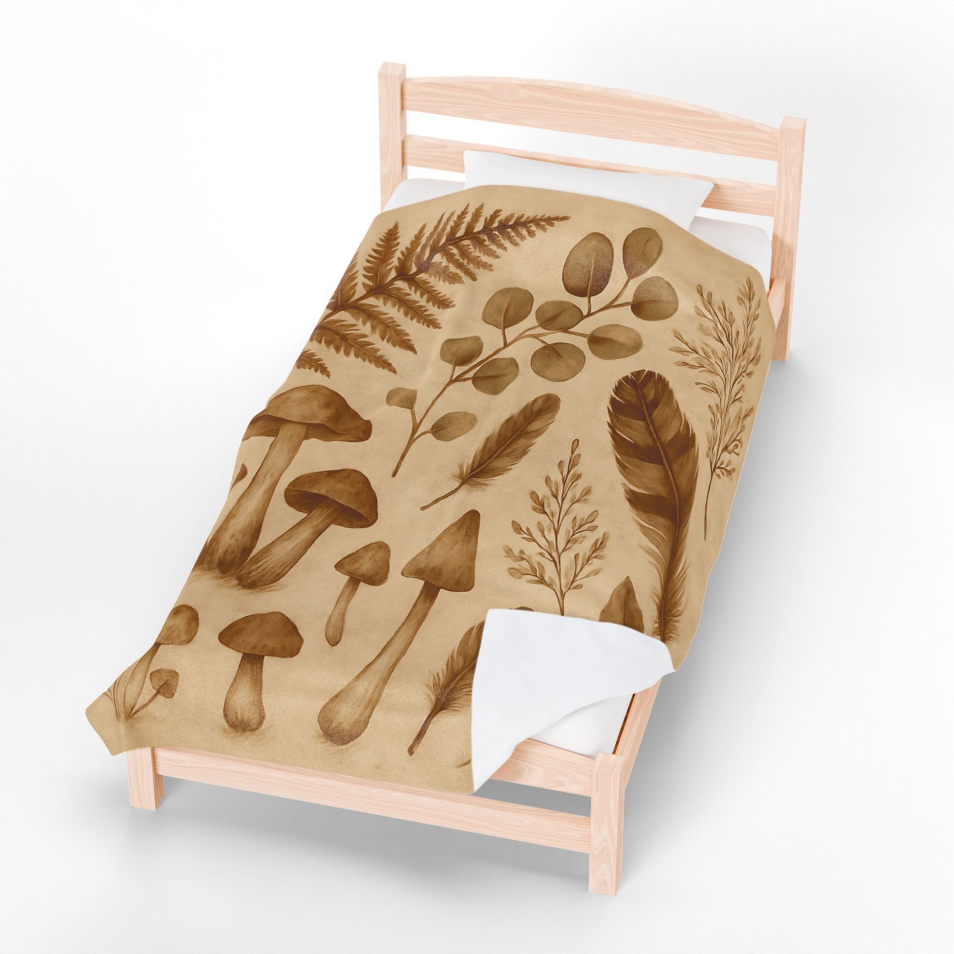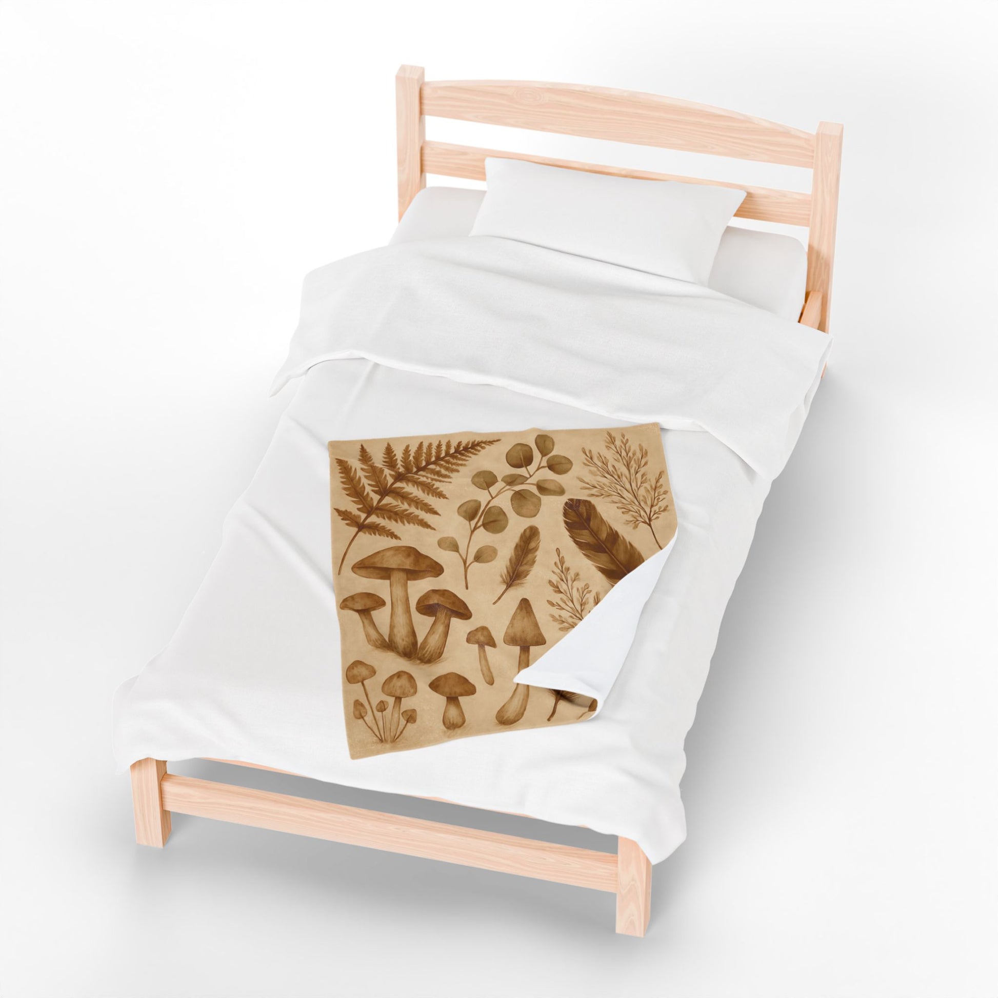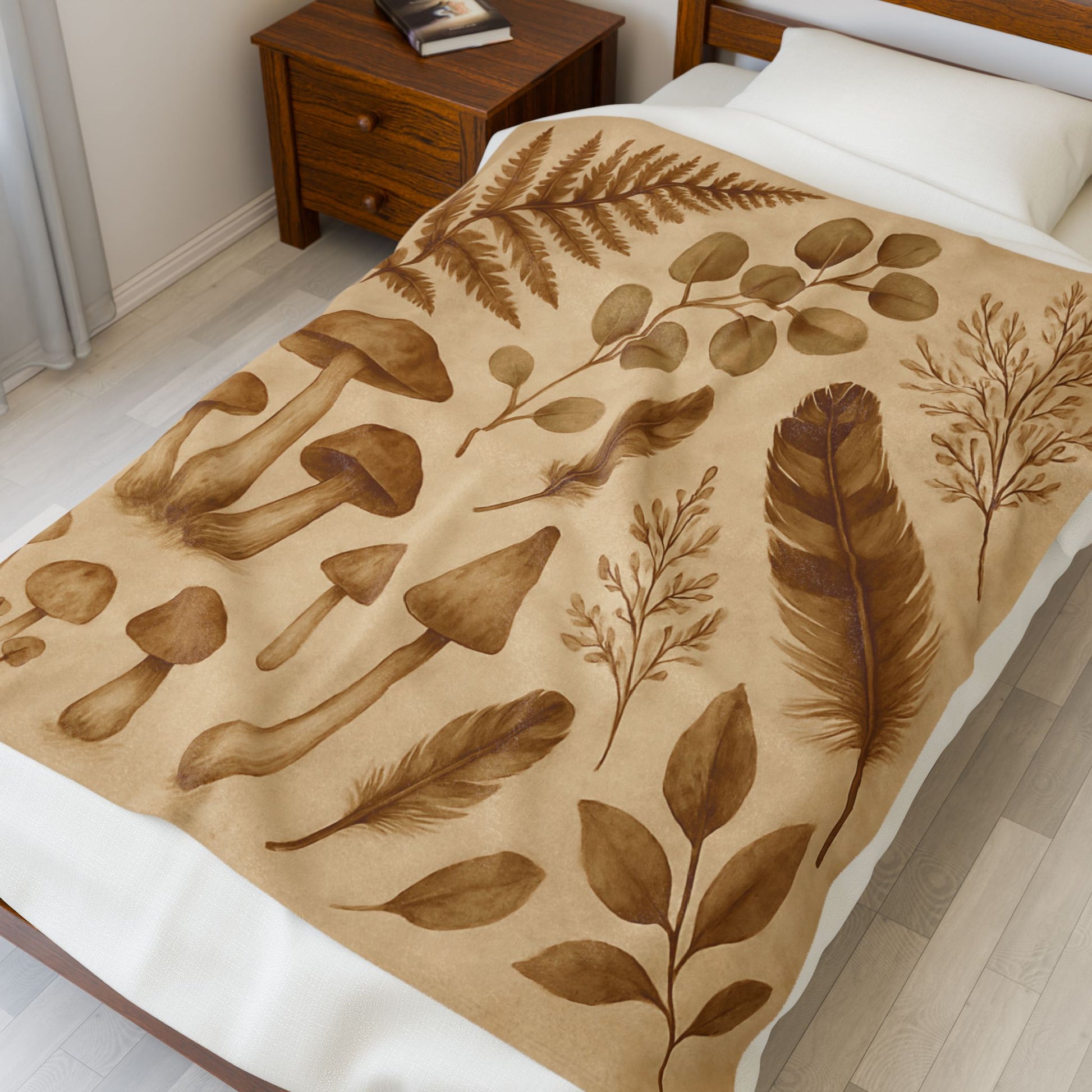 Featuring a soft, sepia-toned design of mushrooms, feathers, ferns, and delicate foliage, this nature-inspired throw brings an earthy, forestcore vibe to any space.