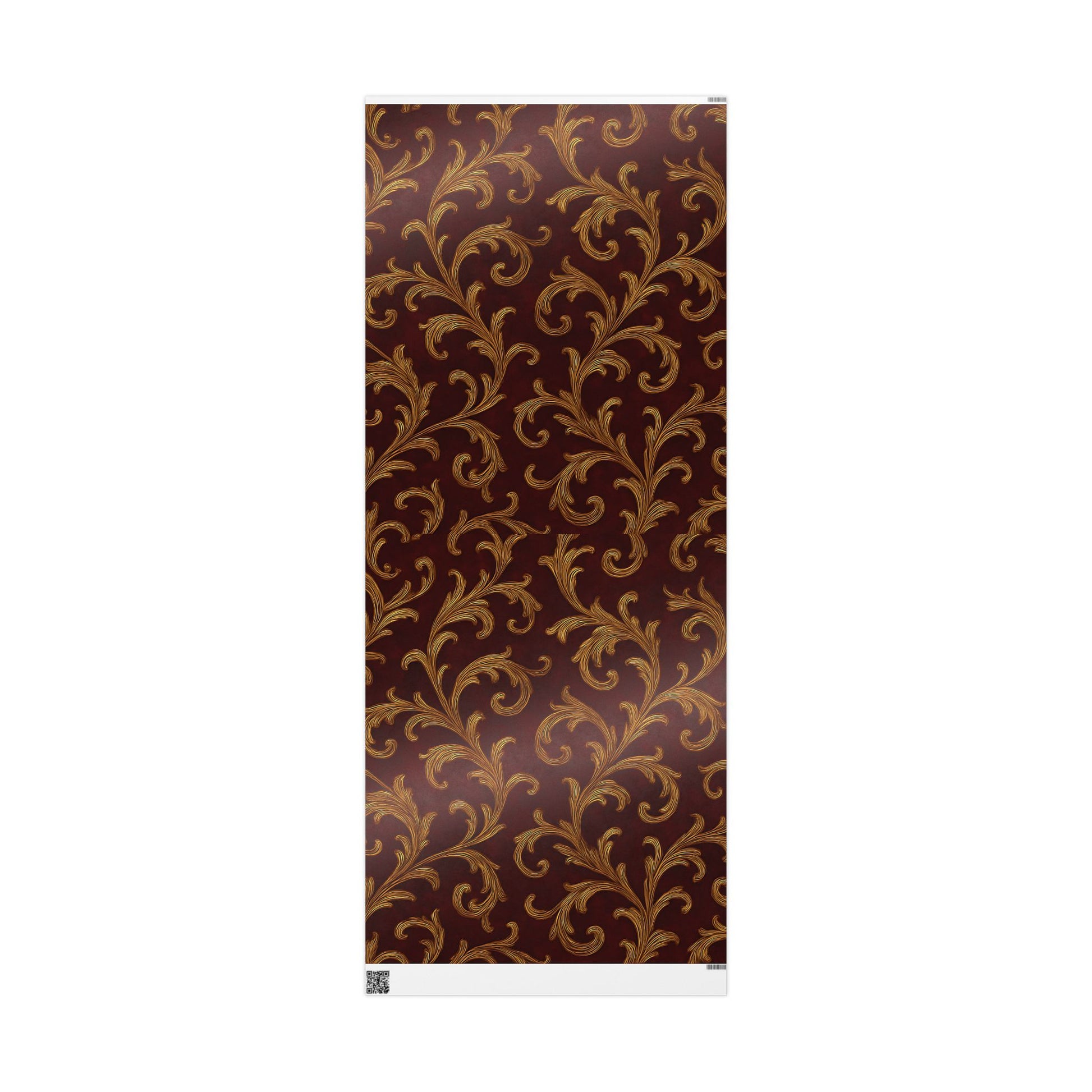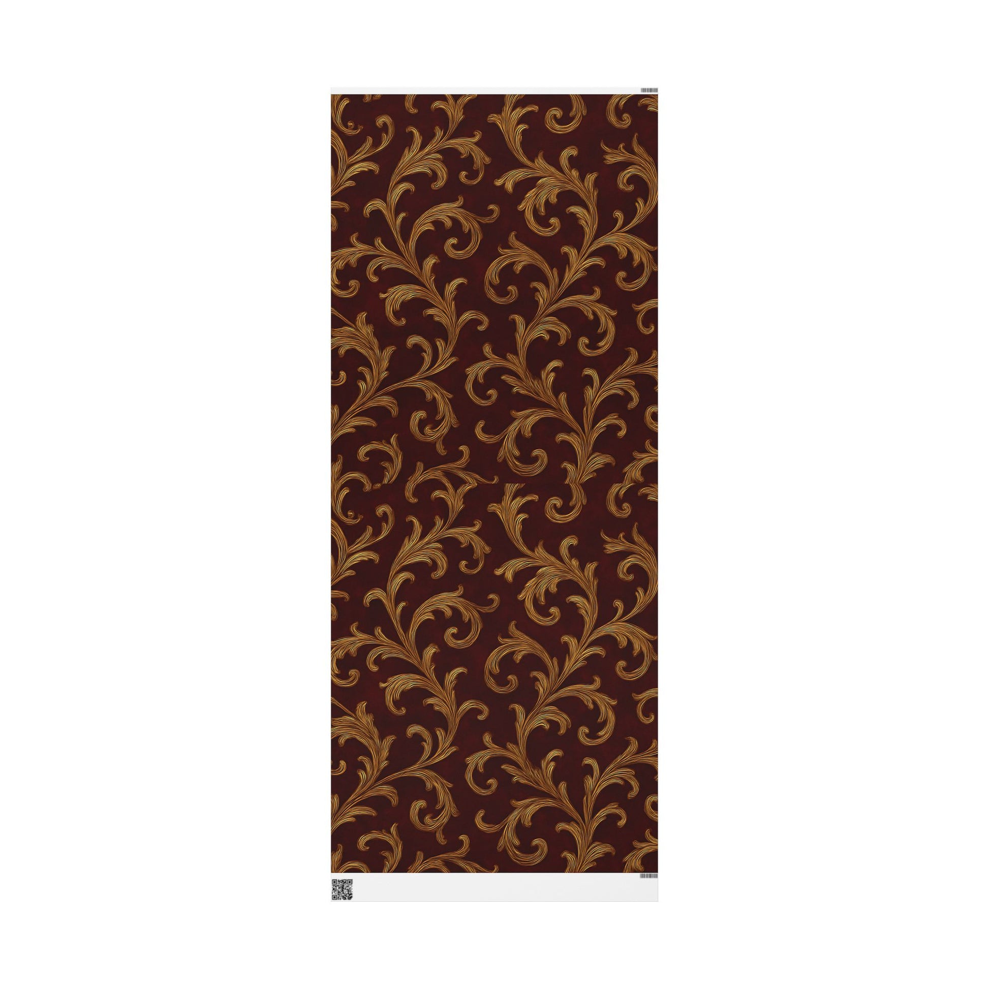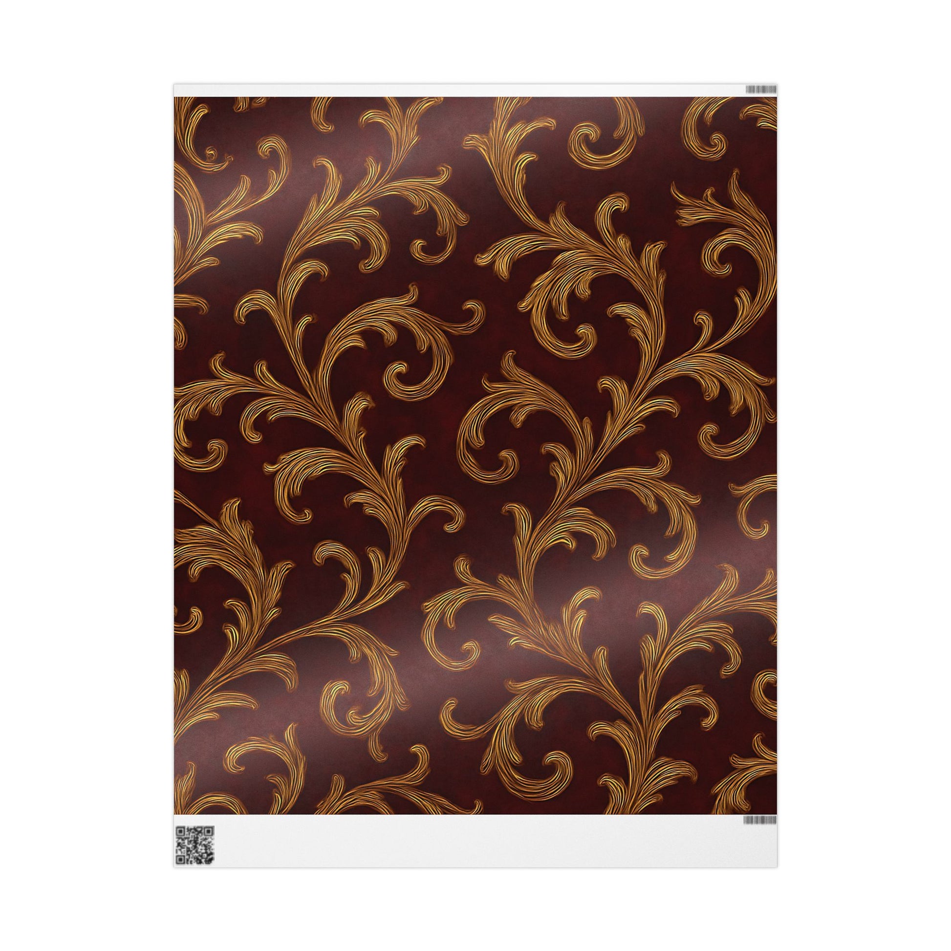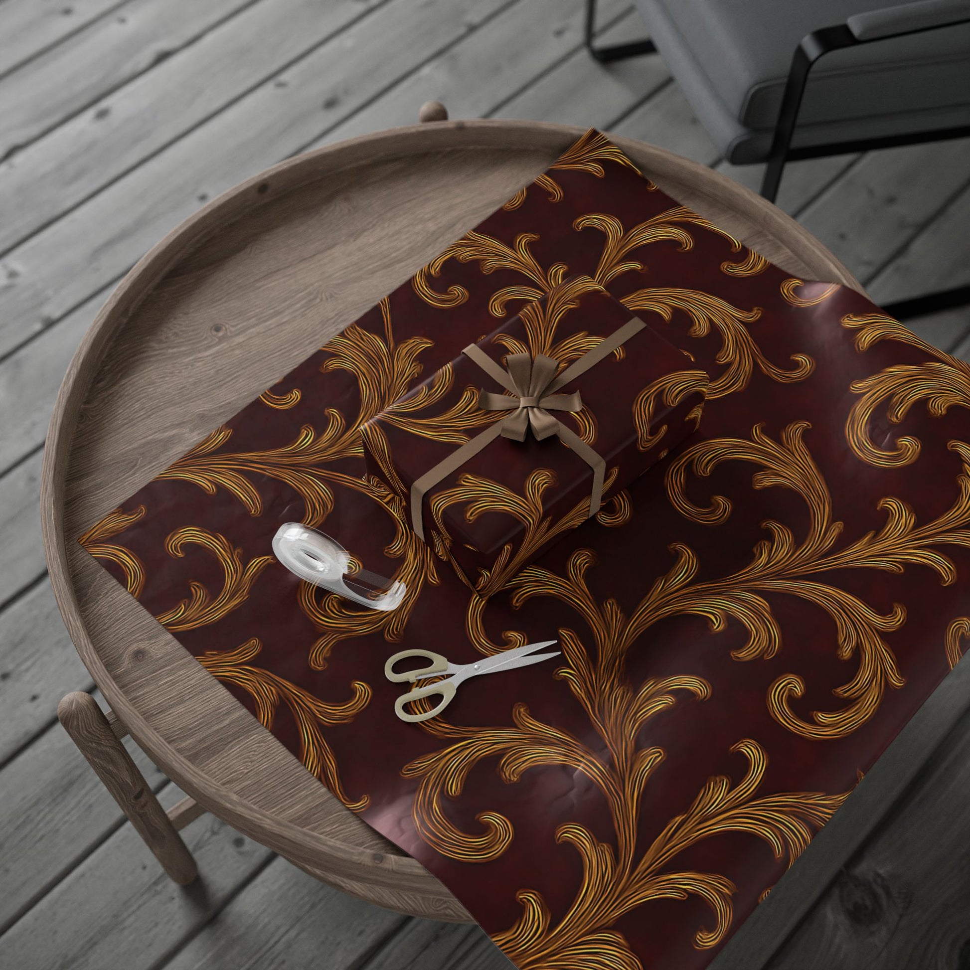 Burgundy & Gold Baroque Scroll Wrapping Paper – Luxurious Gift Wrap in Glossy or Matte Finish.