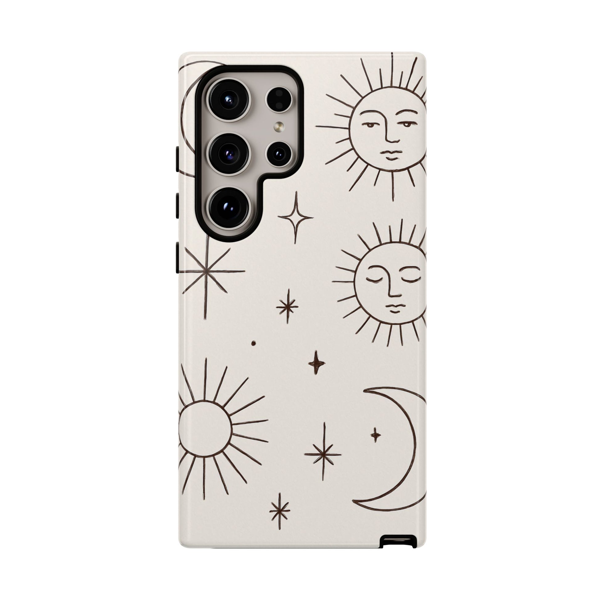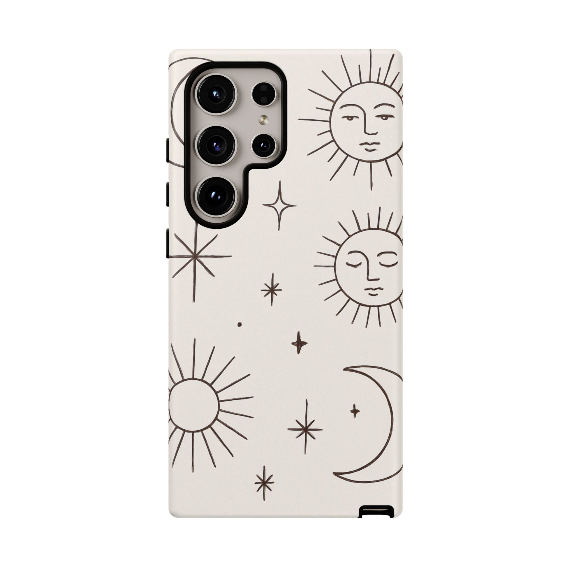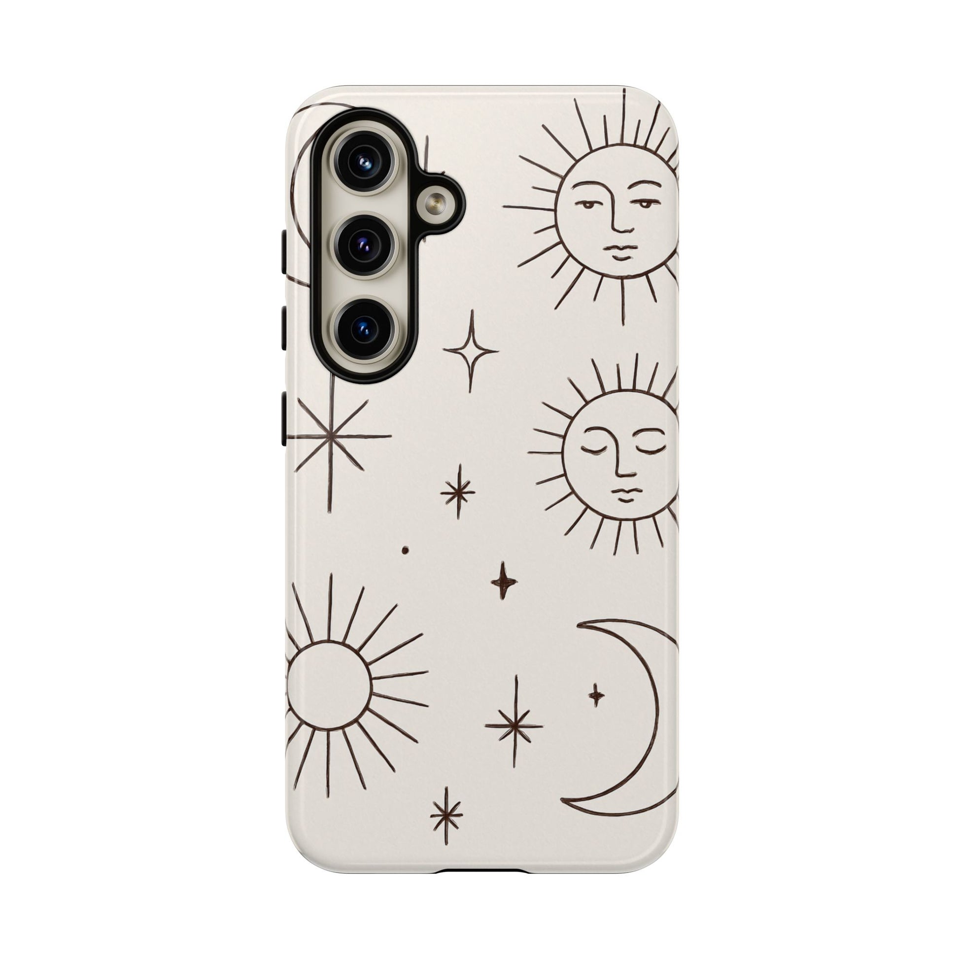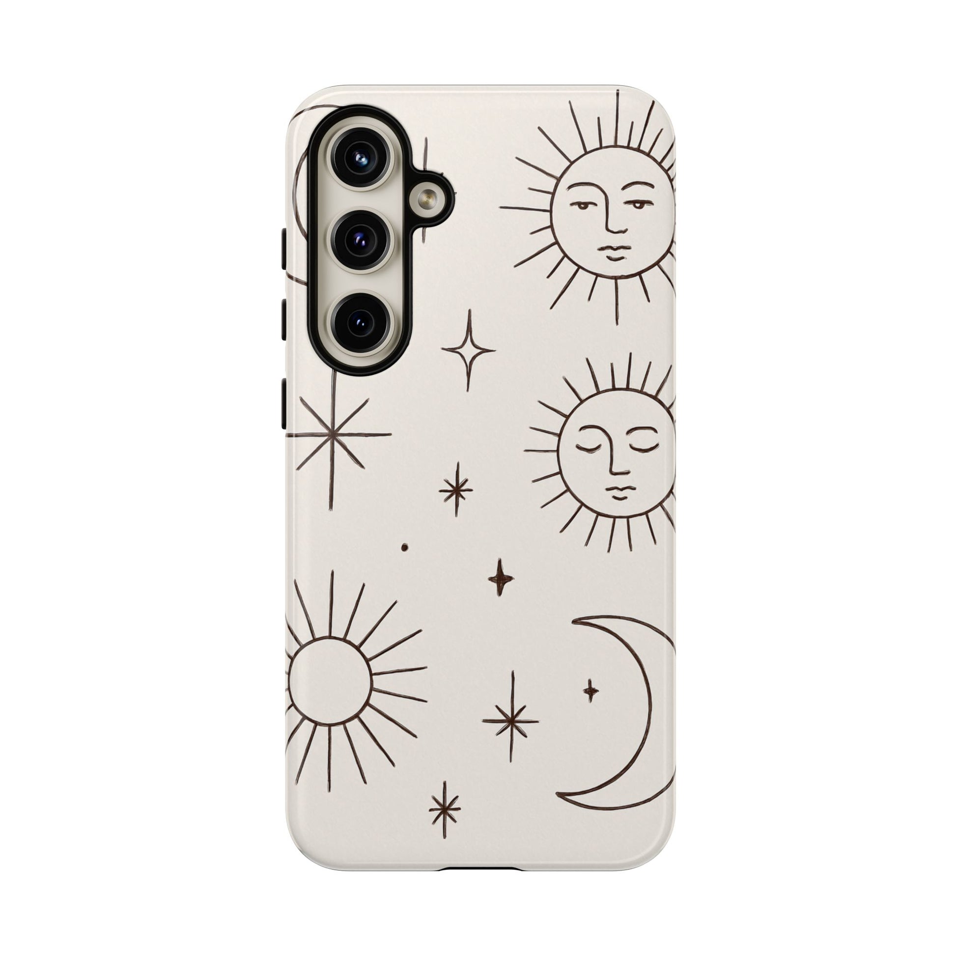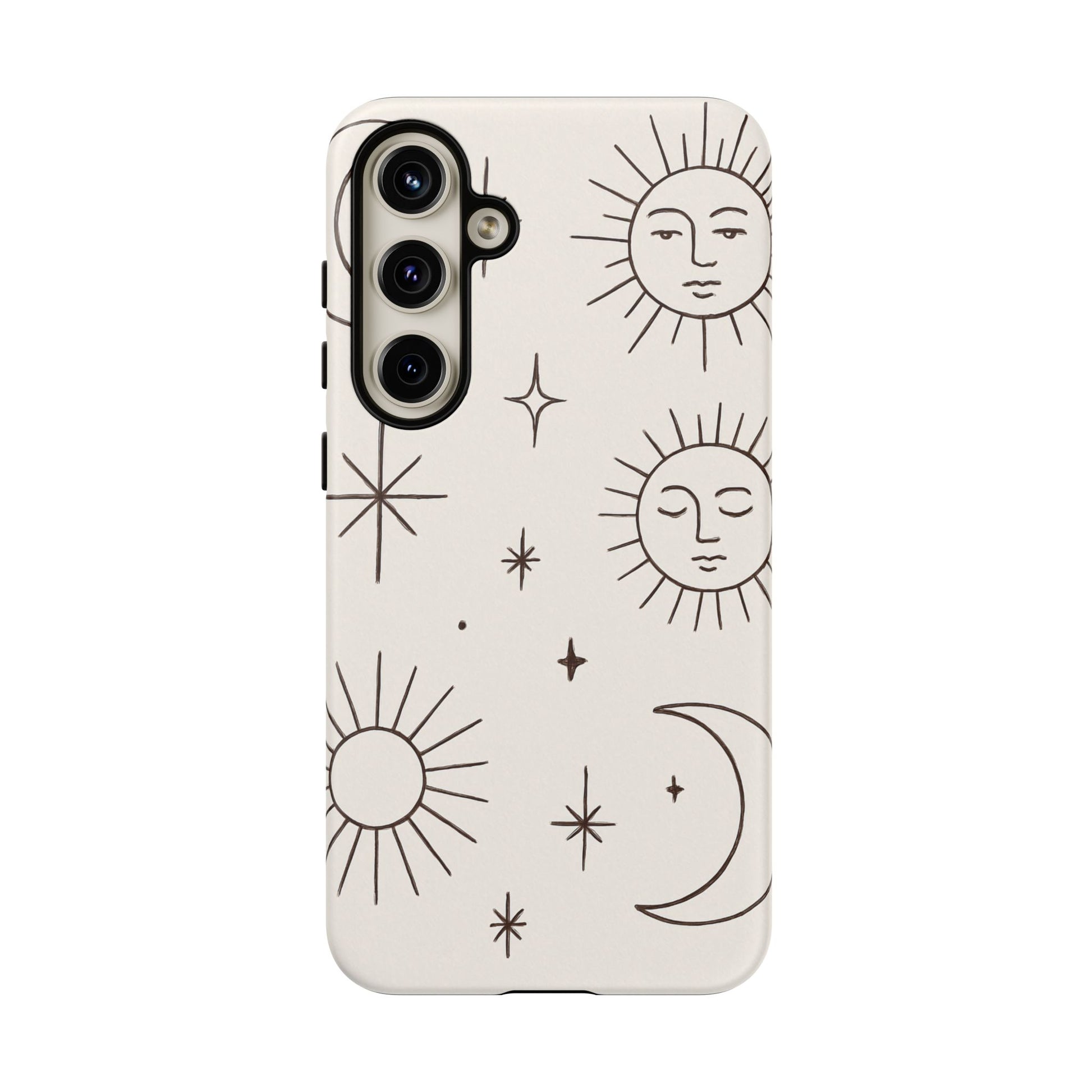 Featuring minimalist line drawings of suns, moons, and stars on a clean cream background, this mystical design blends boho chic and spiritual symbolism in a simple, elegant style.