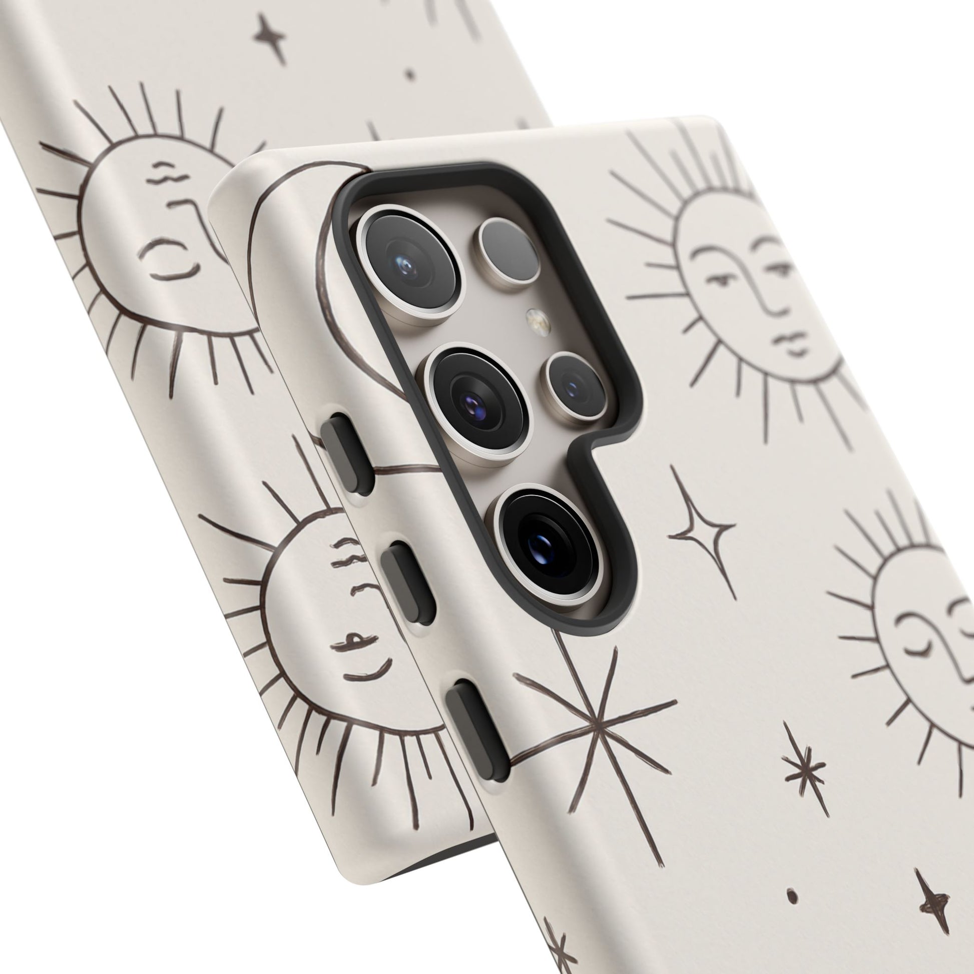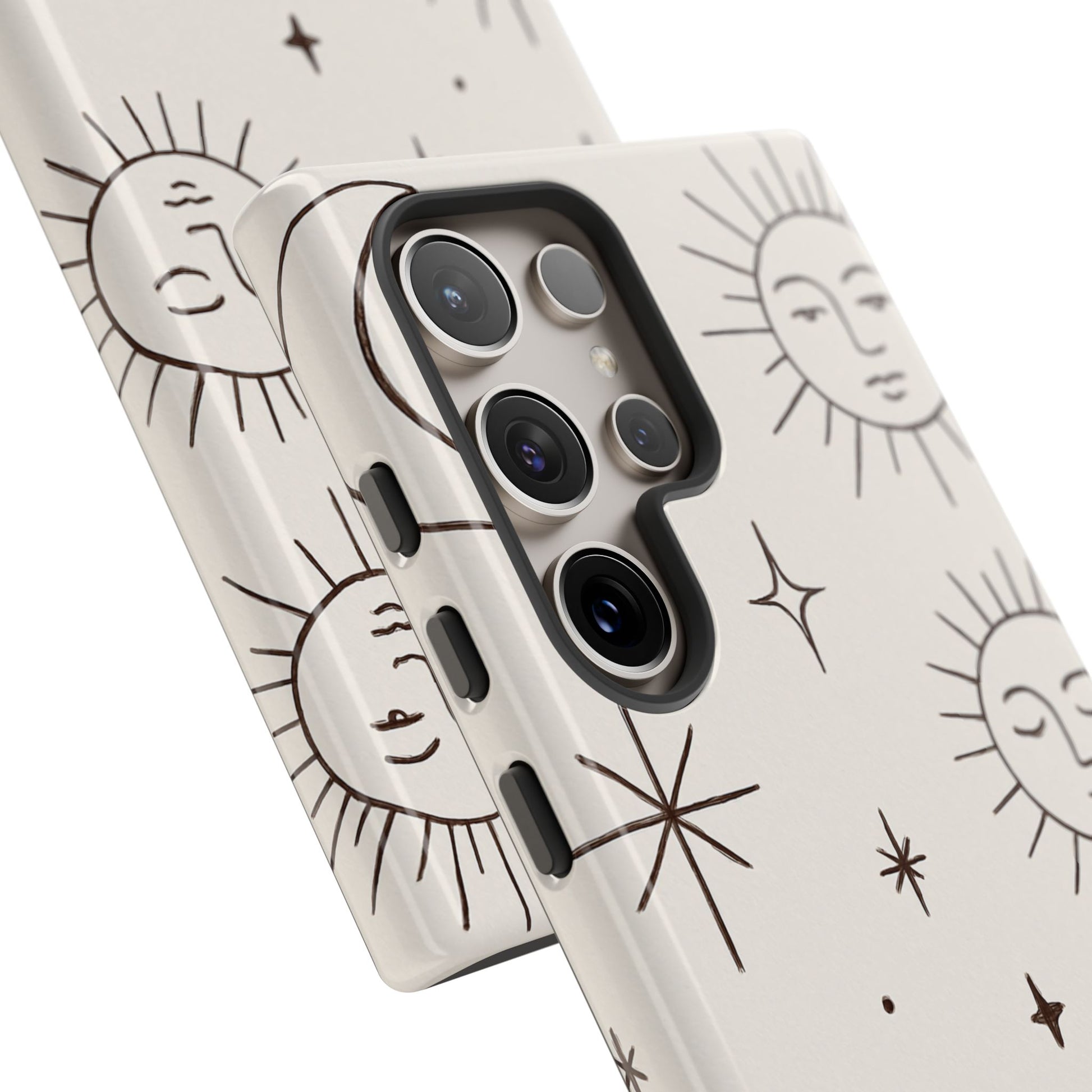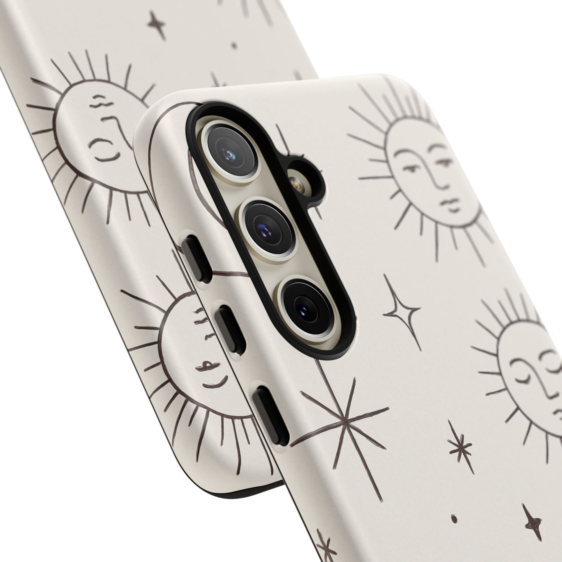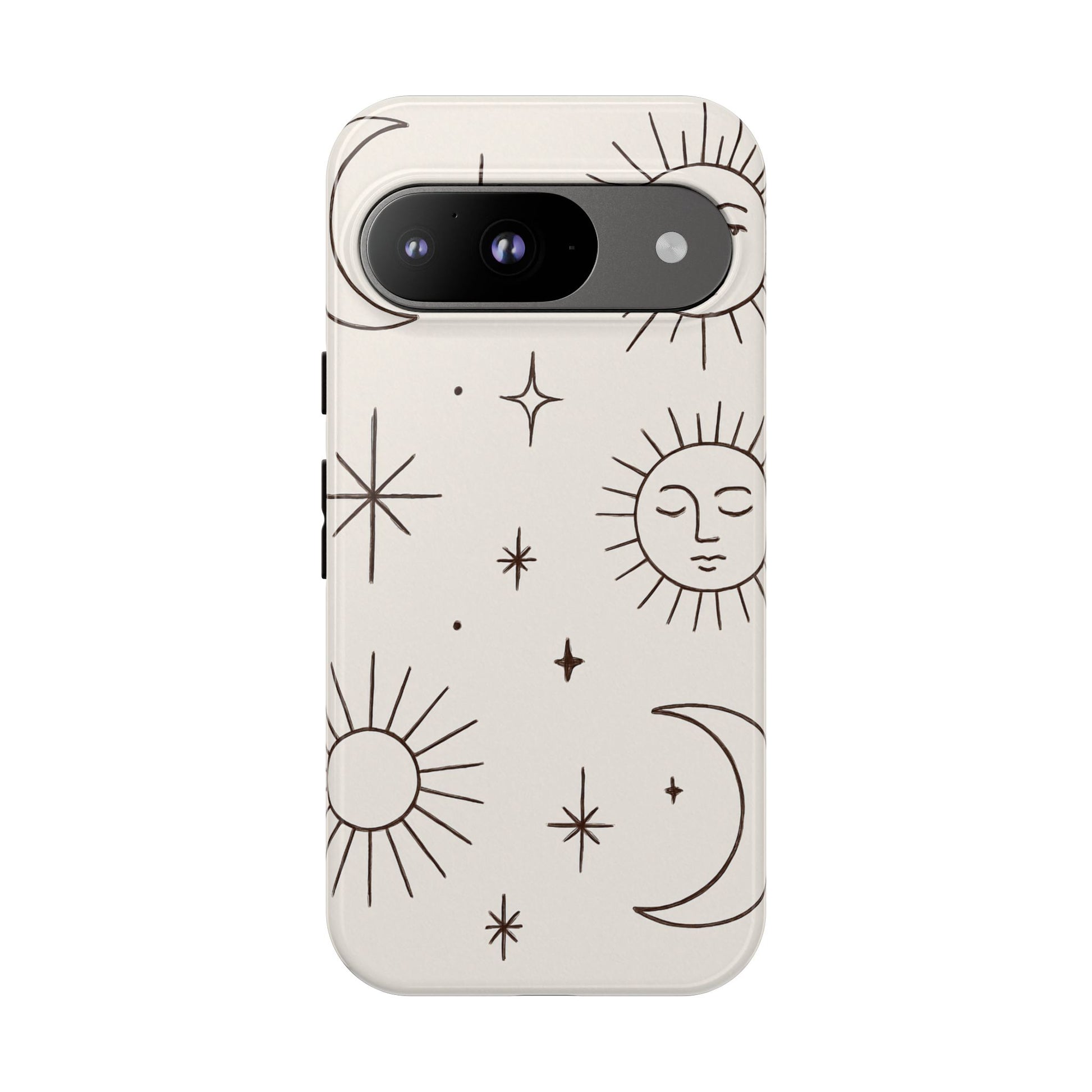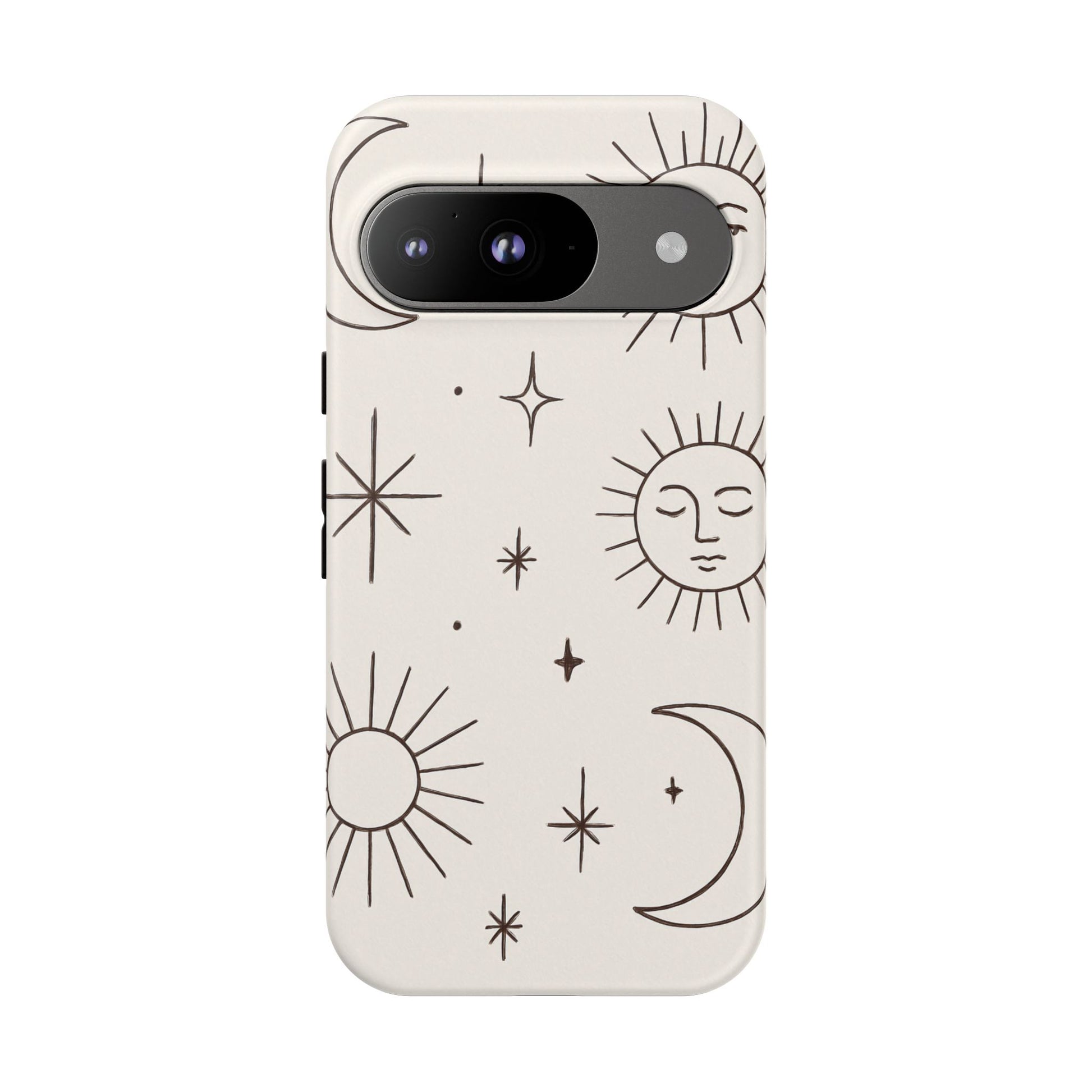 Featuring minimalist line drawings of suns, moons, and stars on a clean cream background, this mystical design blends boho chic and spiritual symbolism in a simple, elegant style.