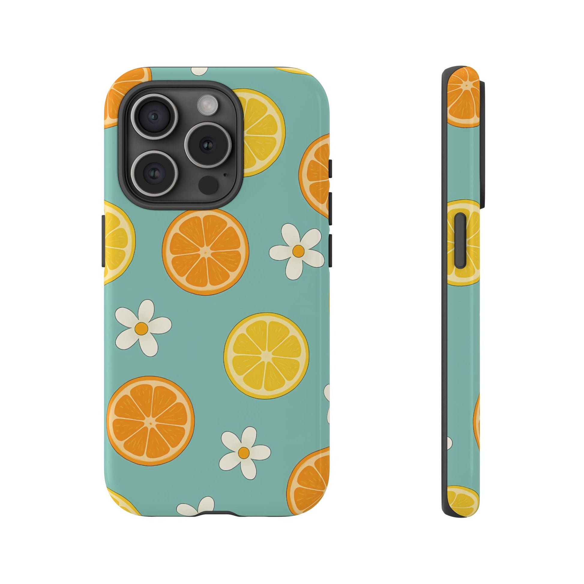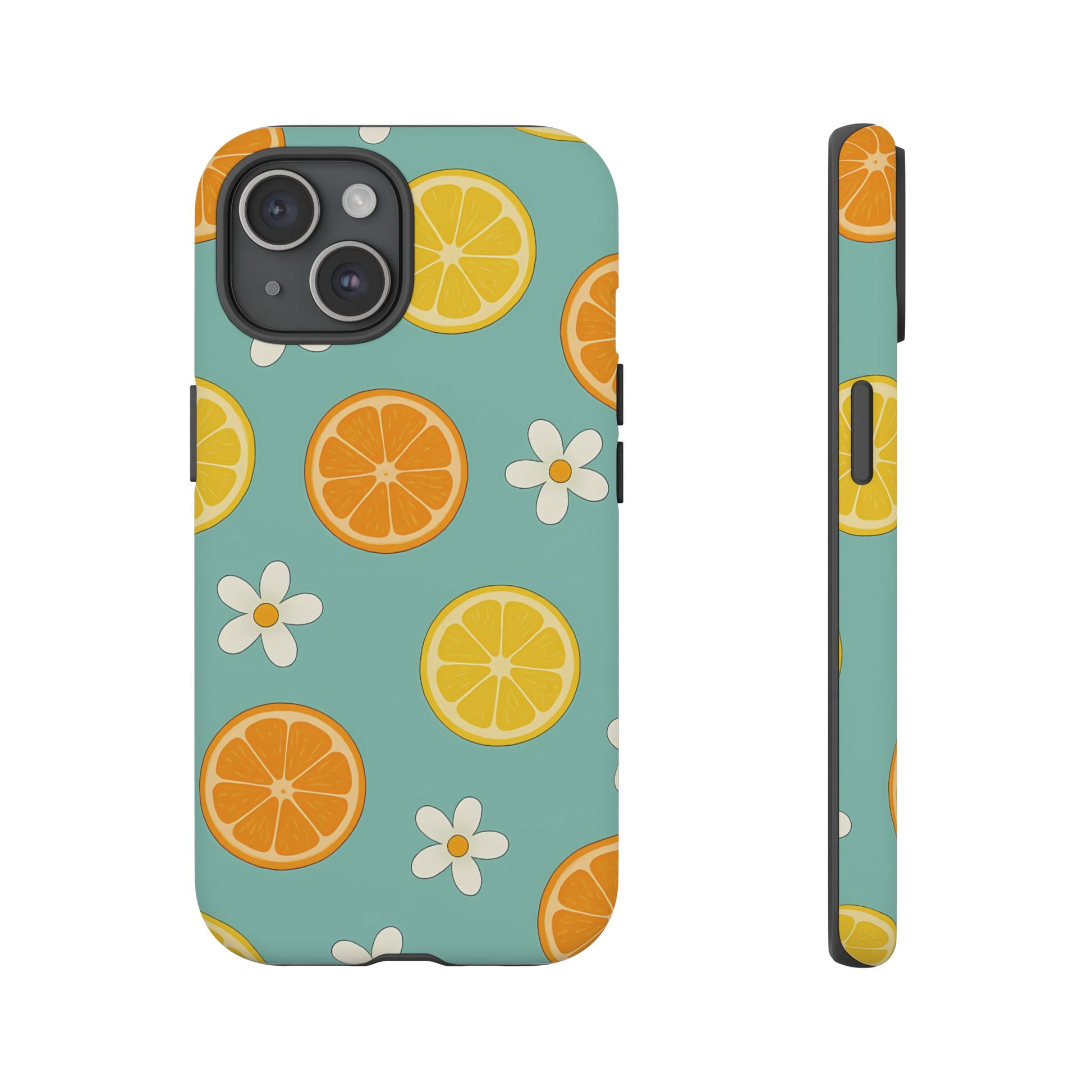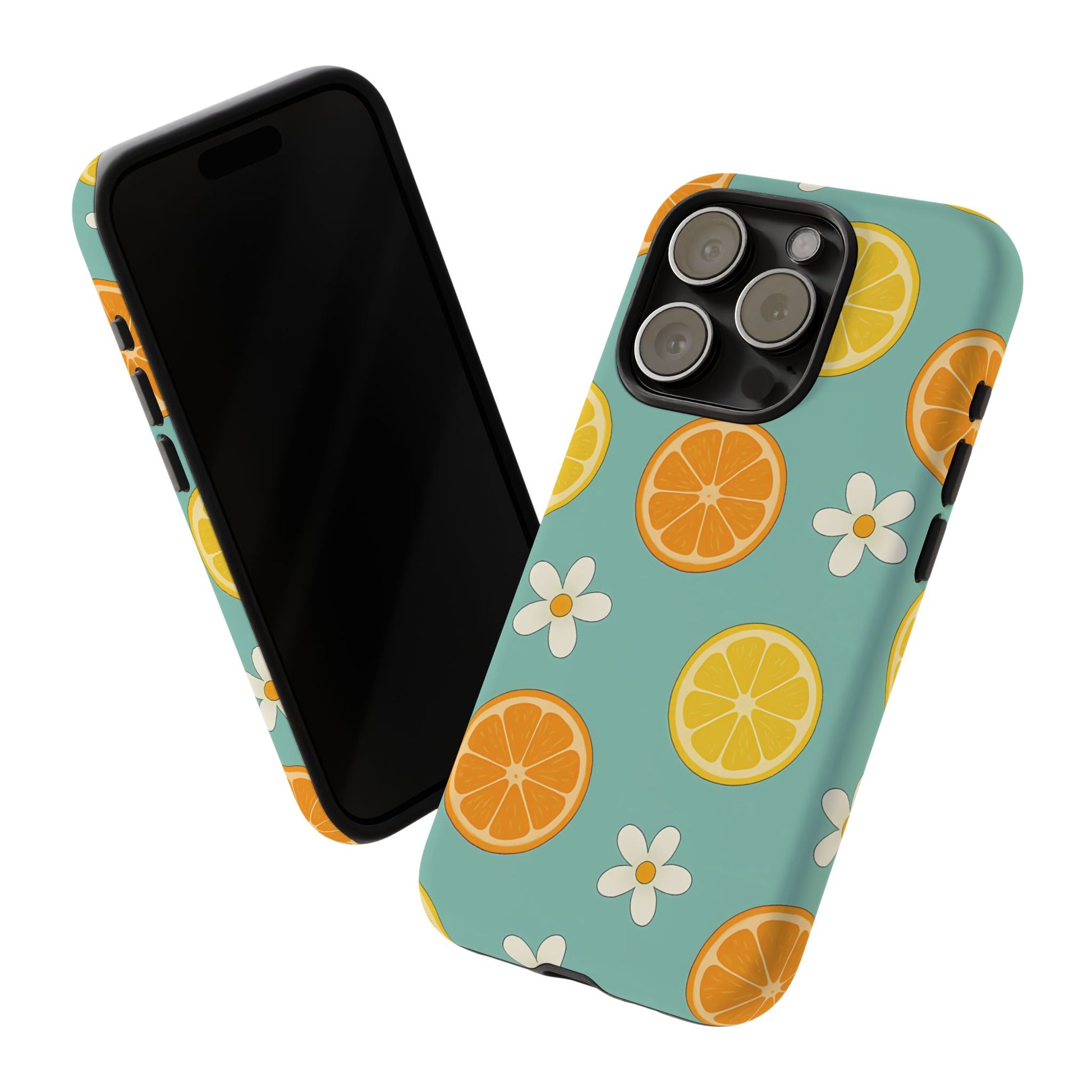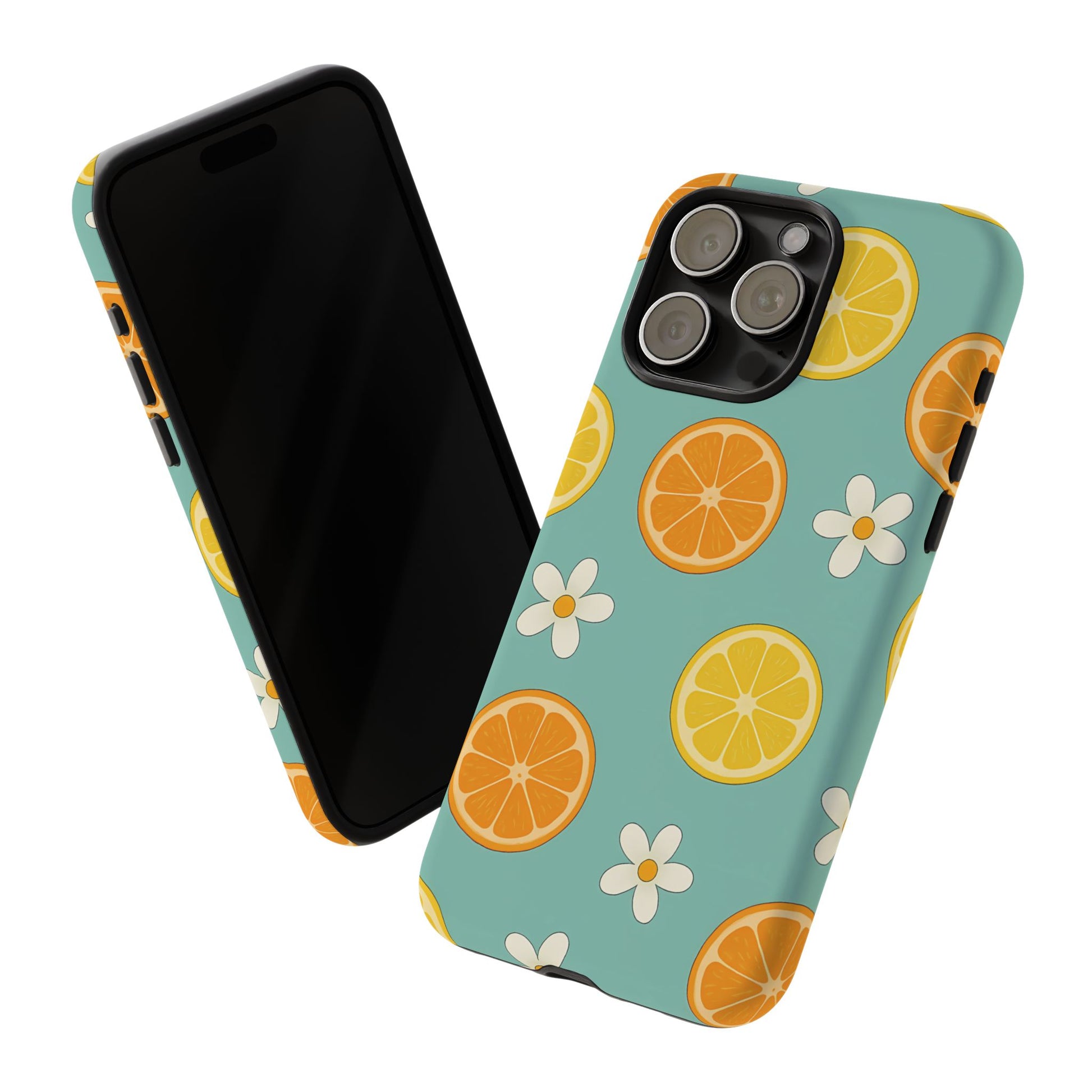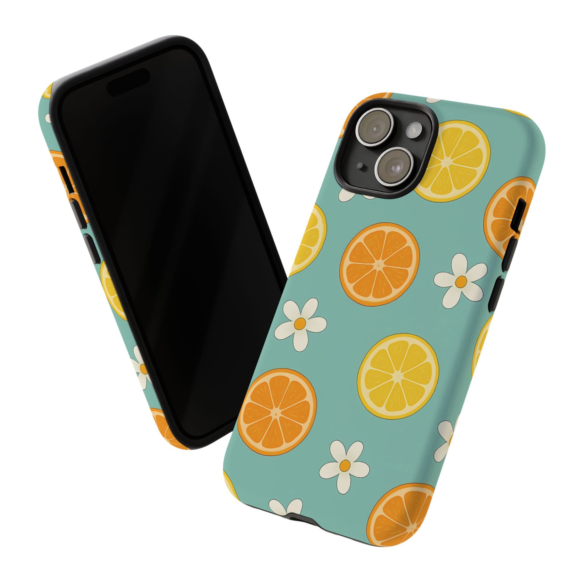 Brighten up your phone with this cheerful Citrus Bloom Phone Case, featuring a vibrant all-over print of juicy orange and lemon slices paired with playful white daisies on a refreshing teal background.