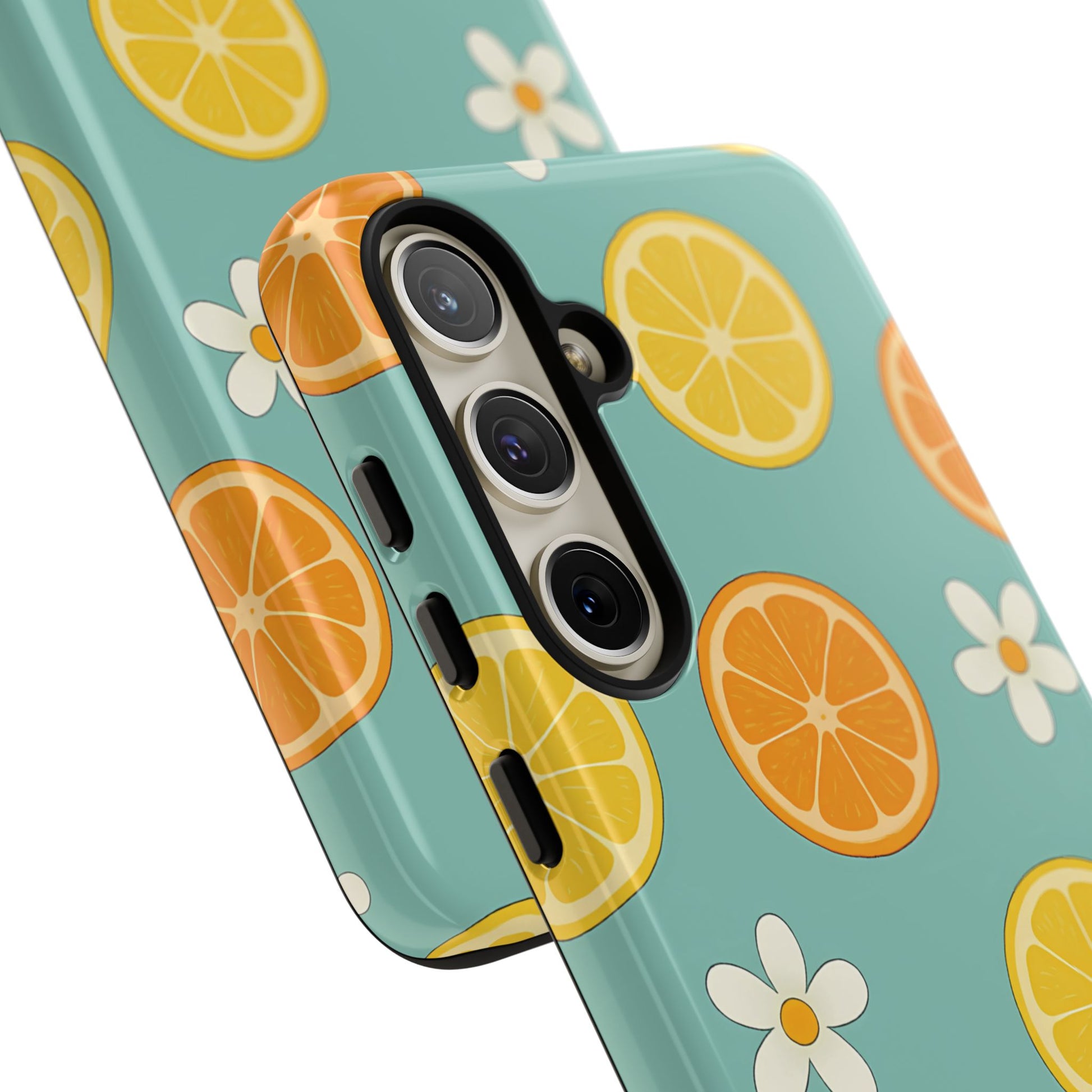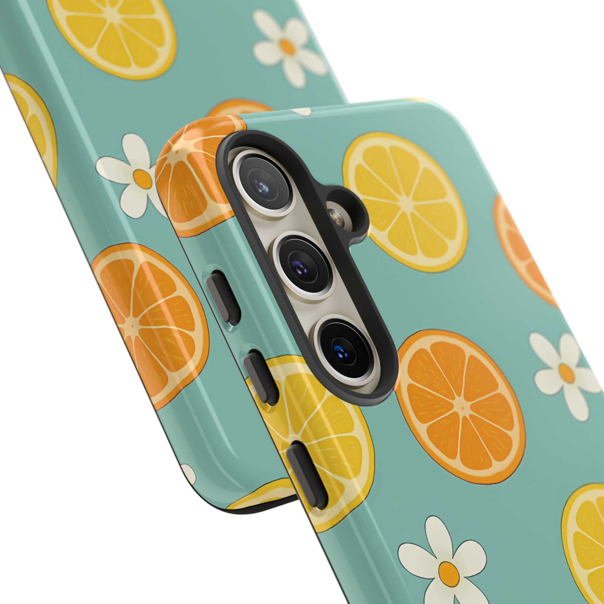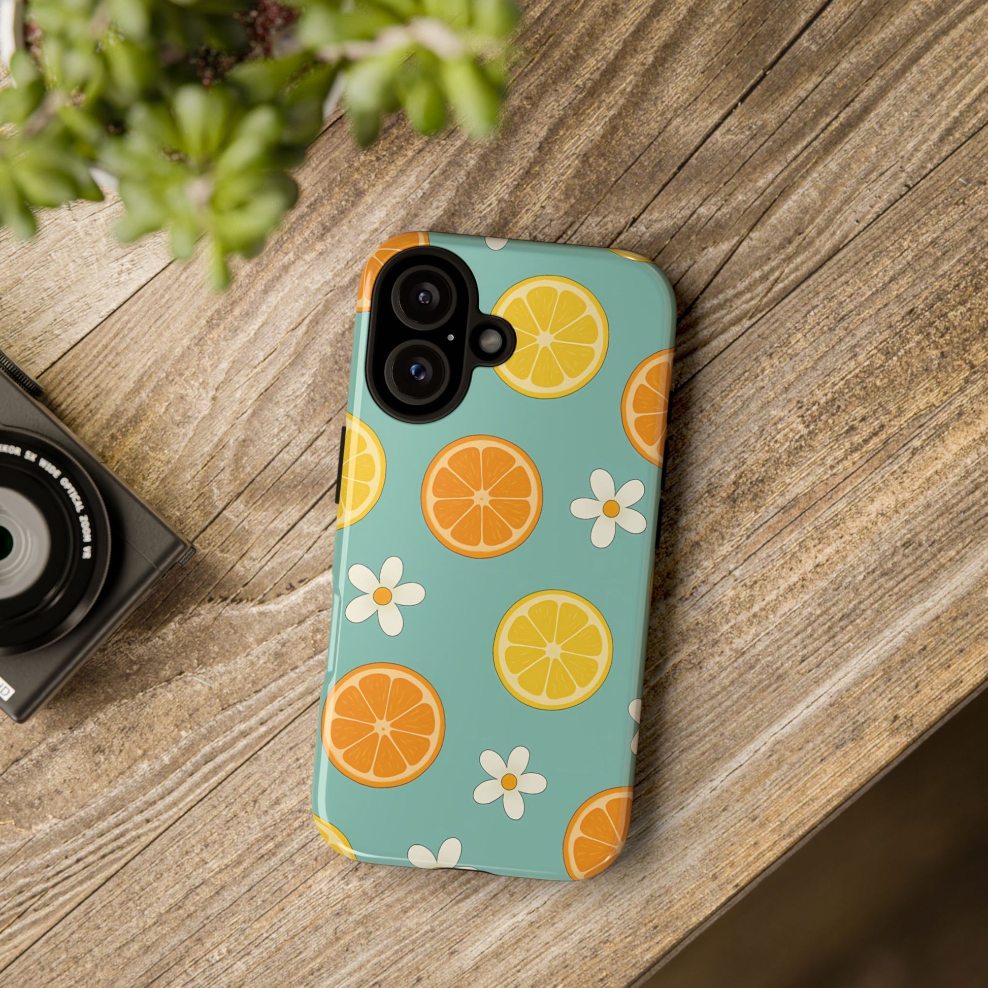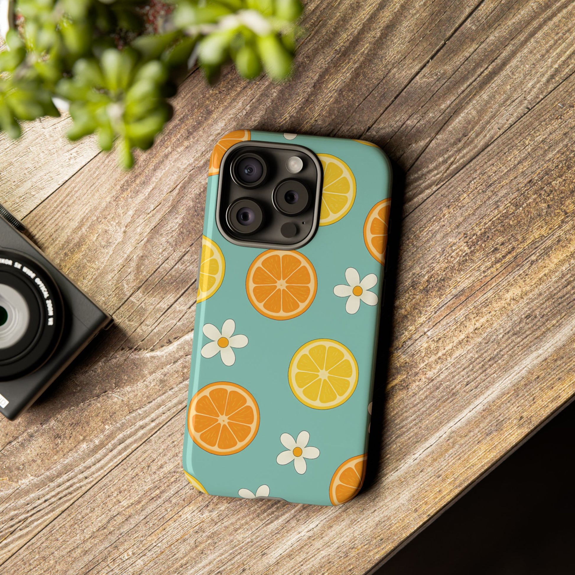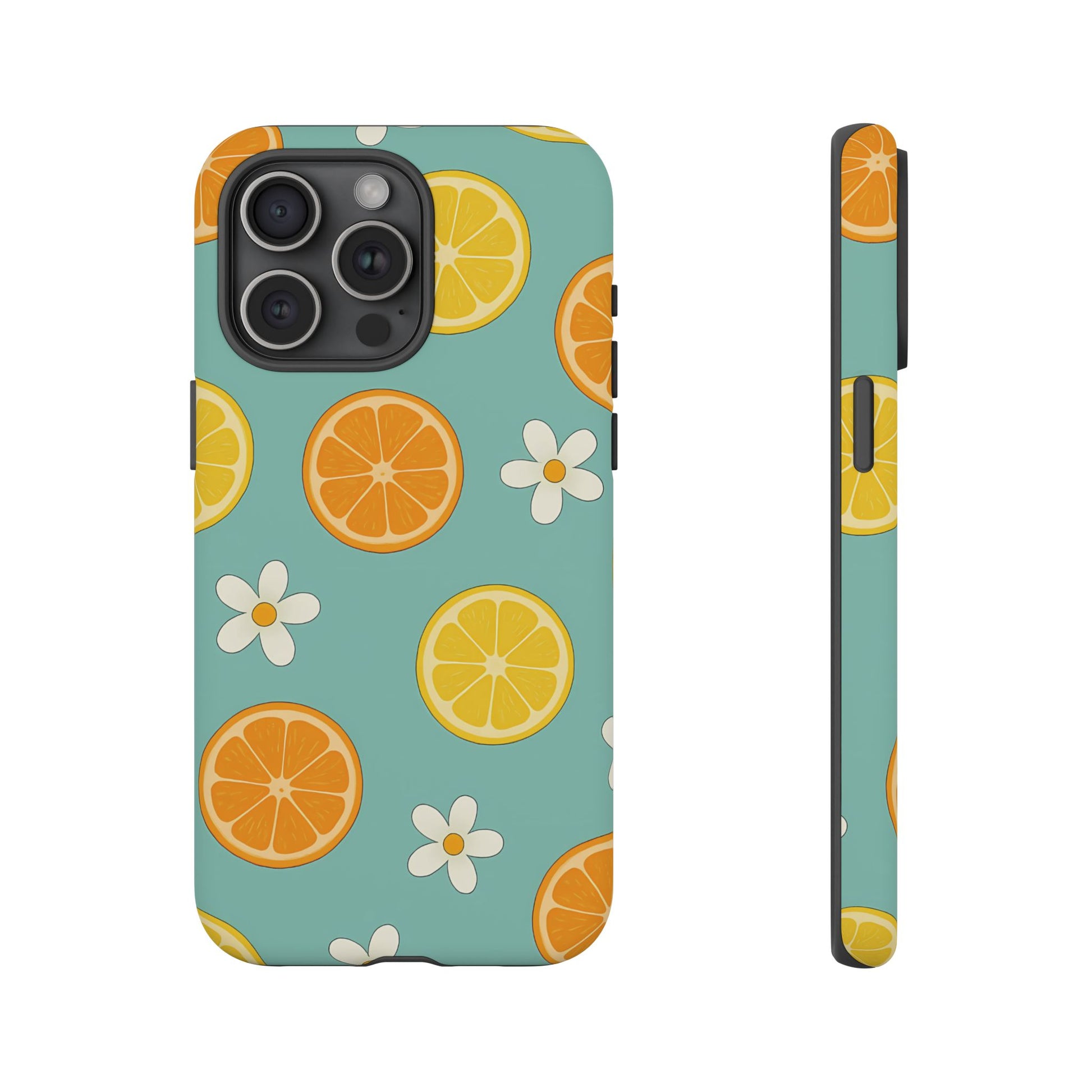 Brighten up your phone with this cheerful Citrus Bloom Phone Case, featuring a vibrant all-over print of juicy orange and lemon slices paired with playful white daisies on a refreshing teal background.