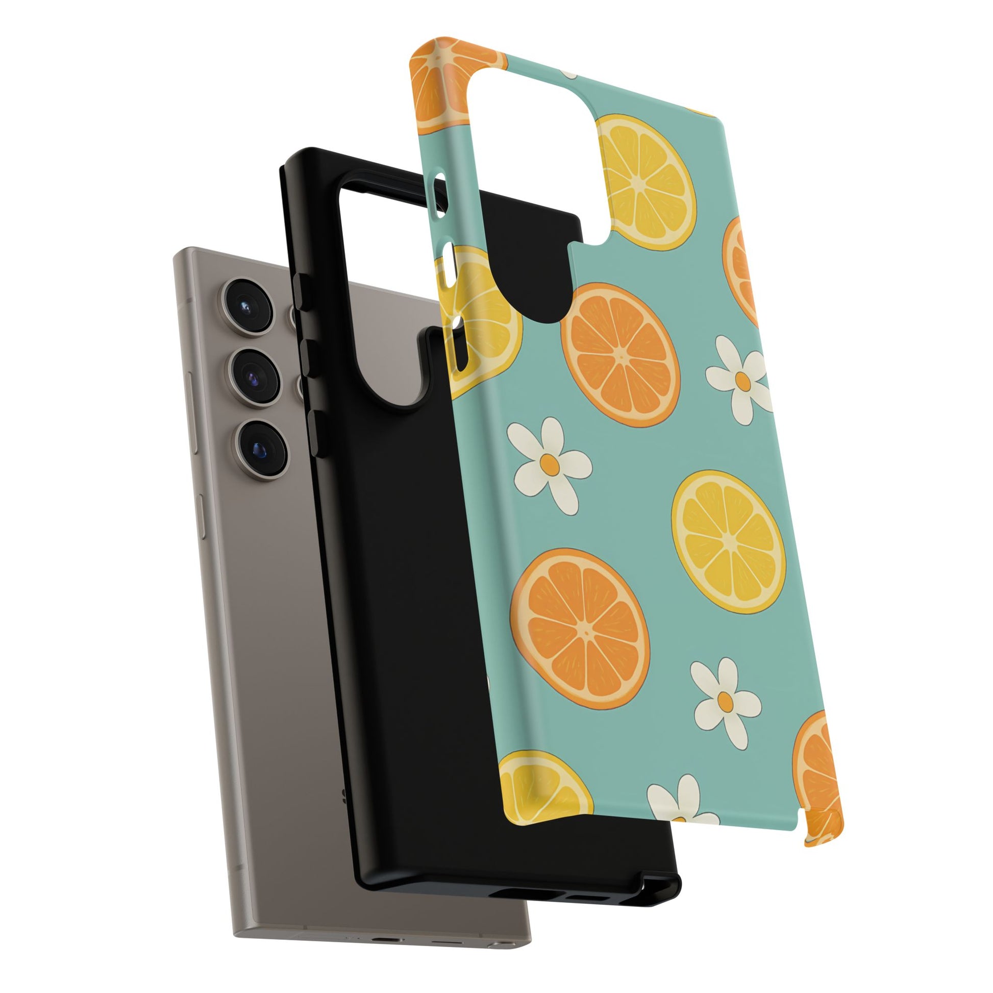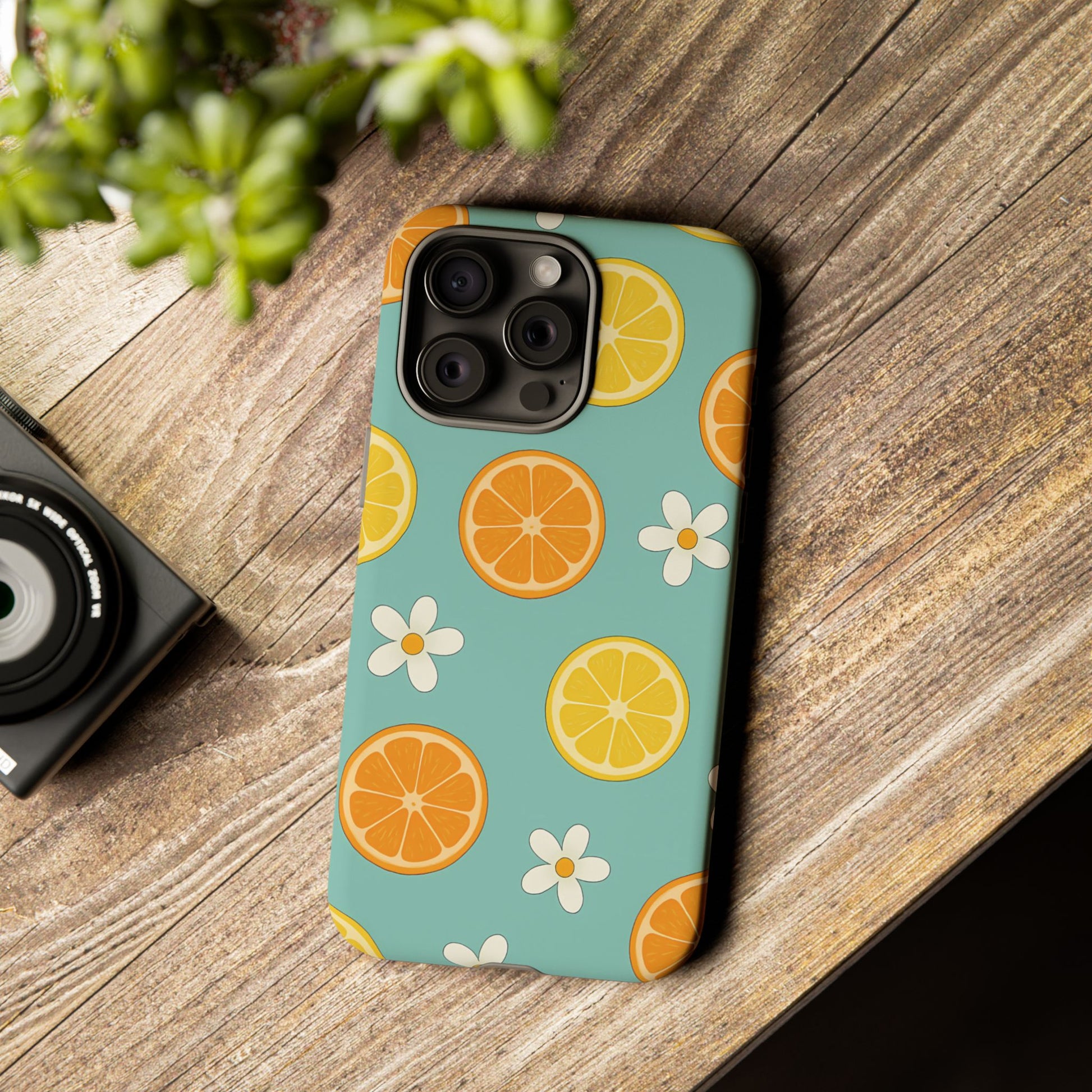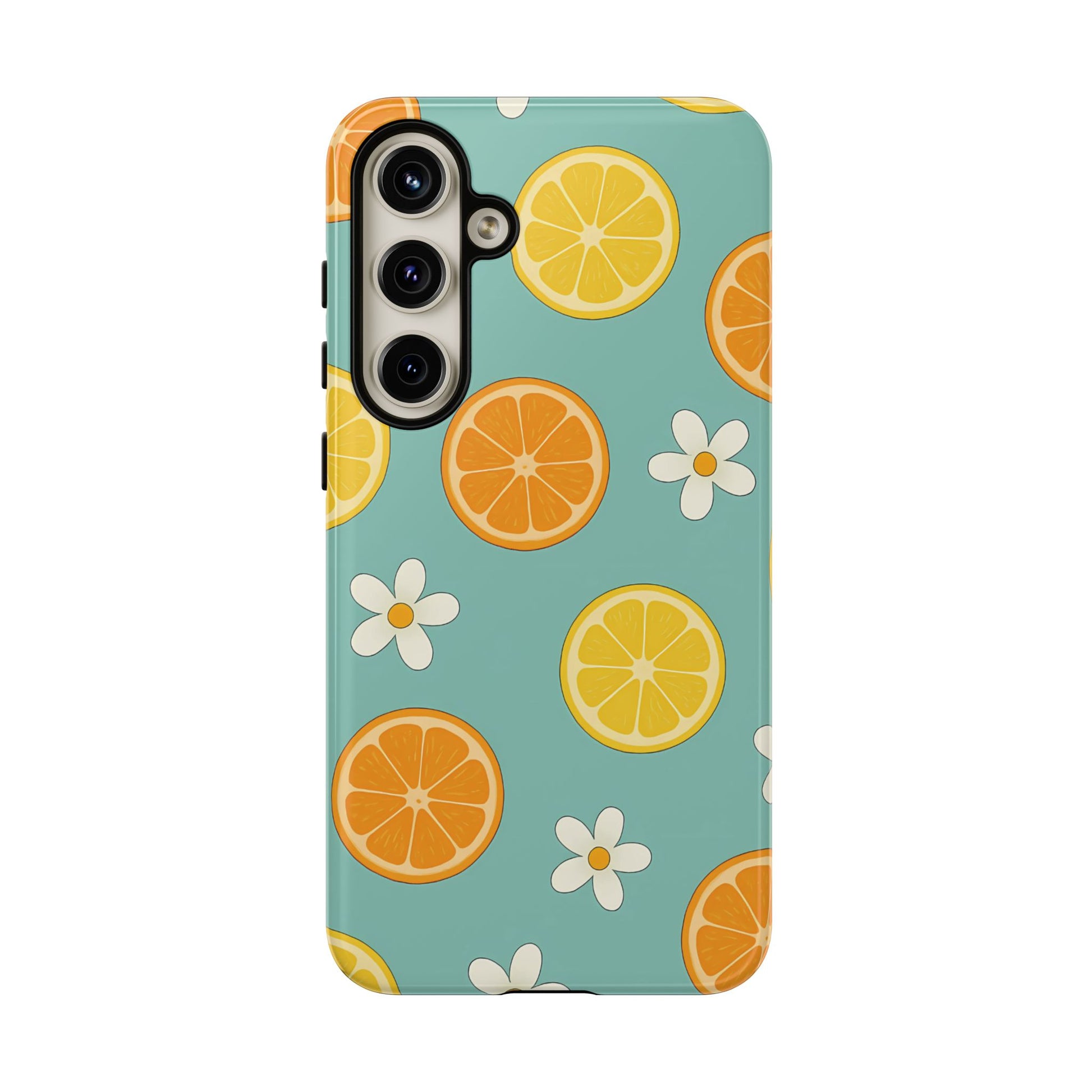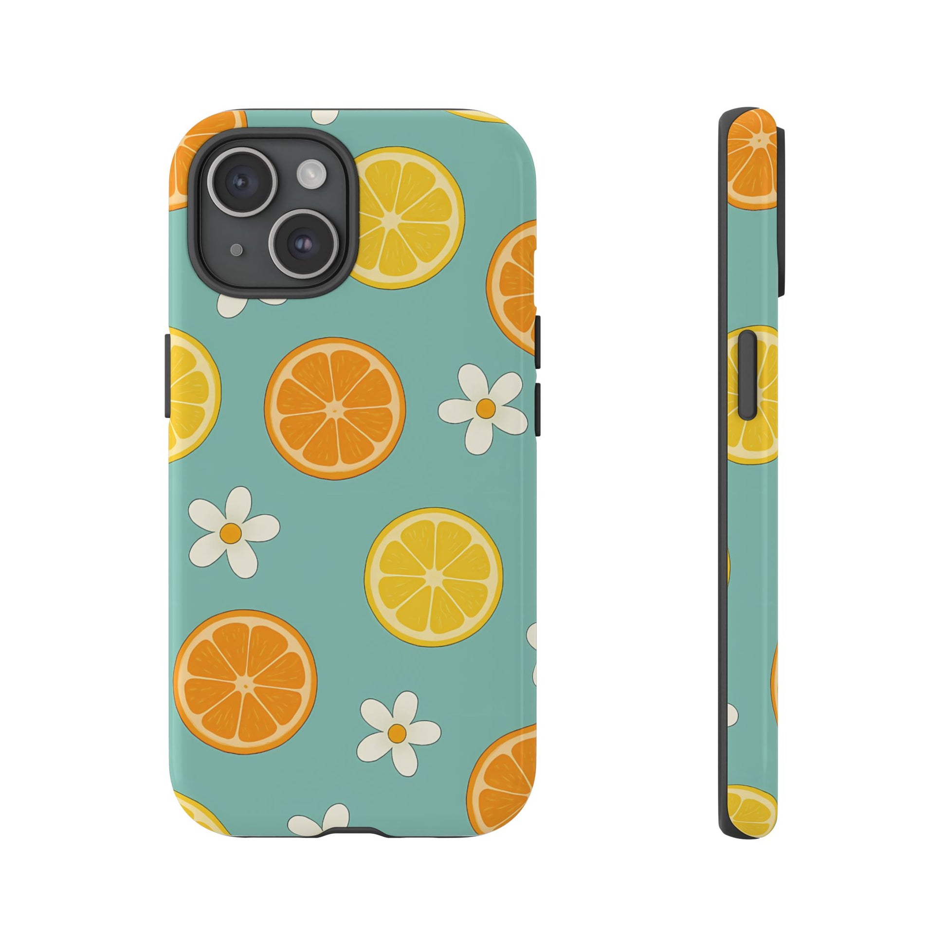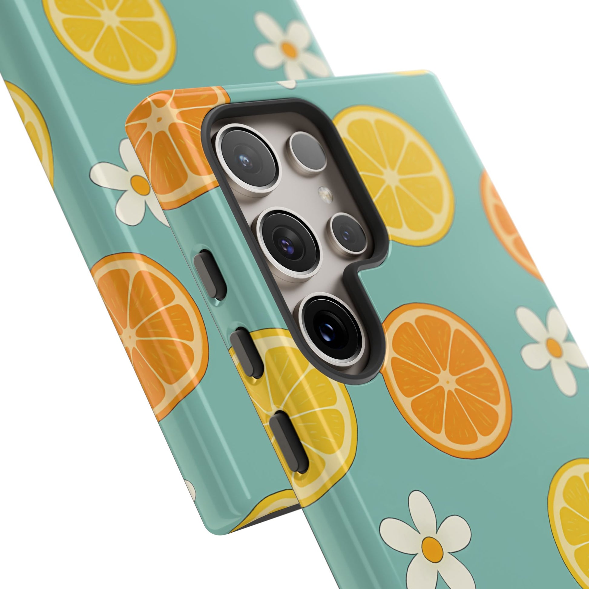 Brighten up your phone with this cheerful Citrus Bloom Phone Case, featuring a vibrant all-over print of juicy orange and lemon slices paired with playful white daisies on a refreshing teal background.