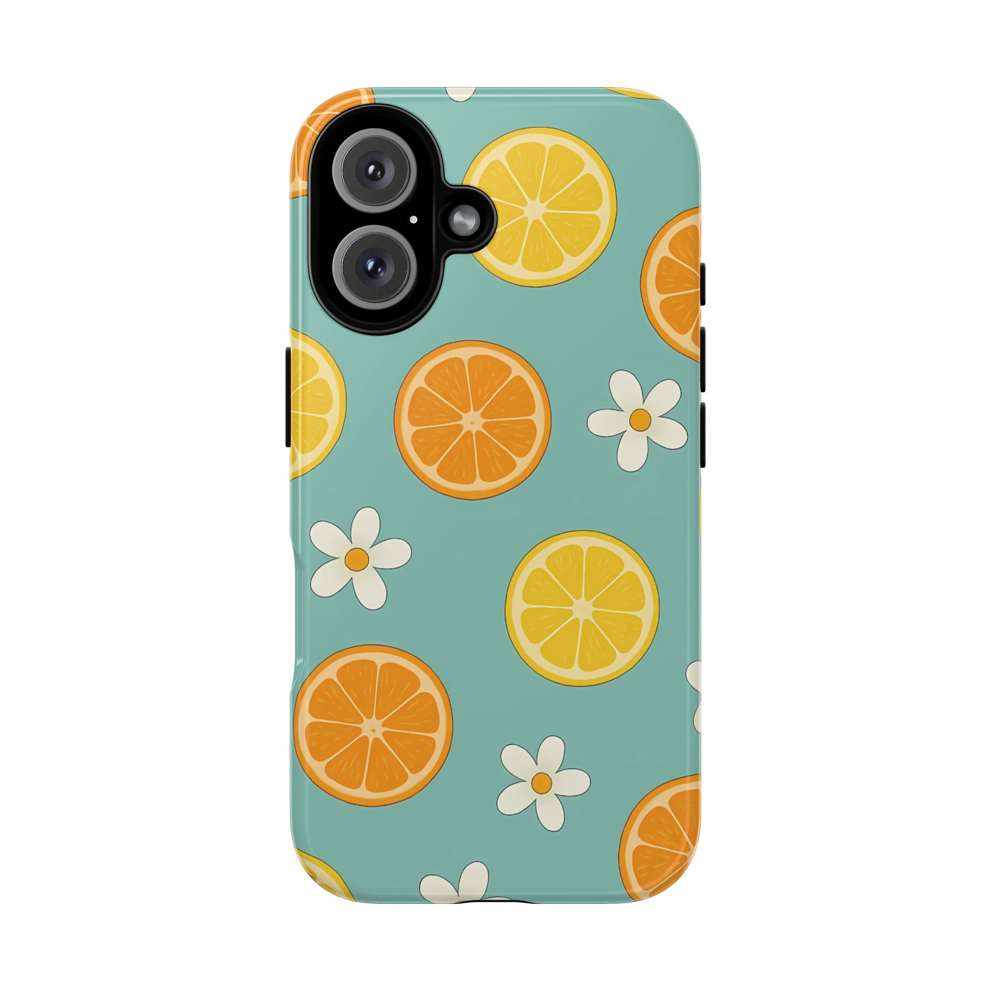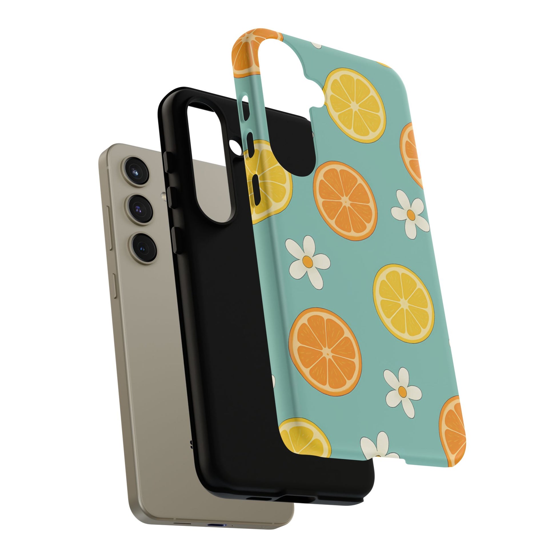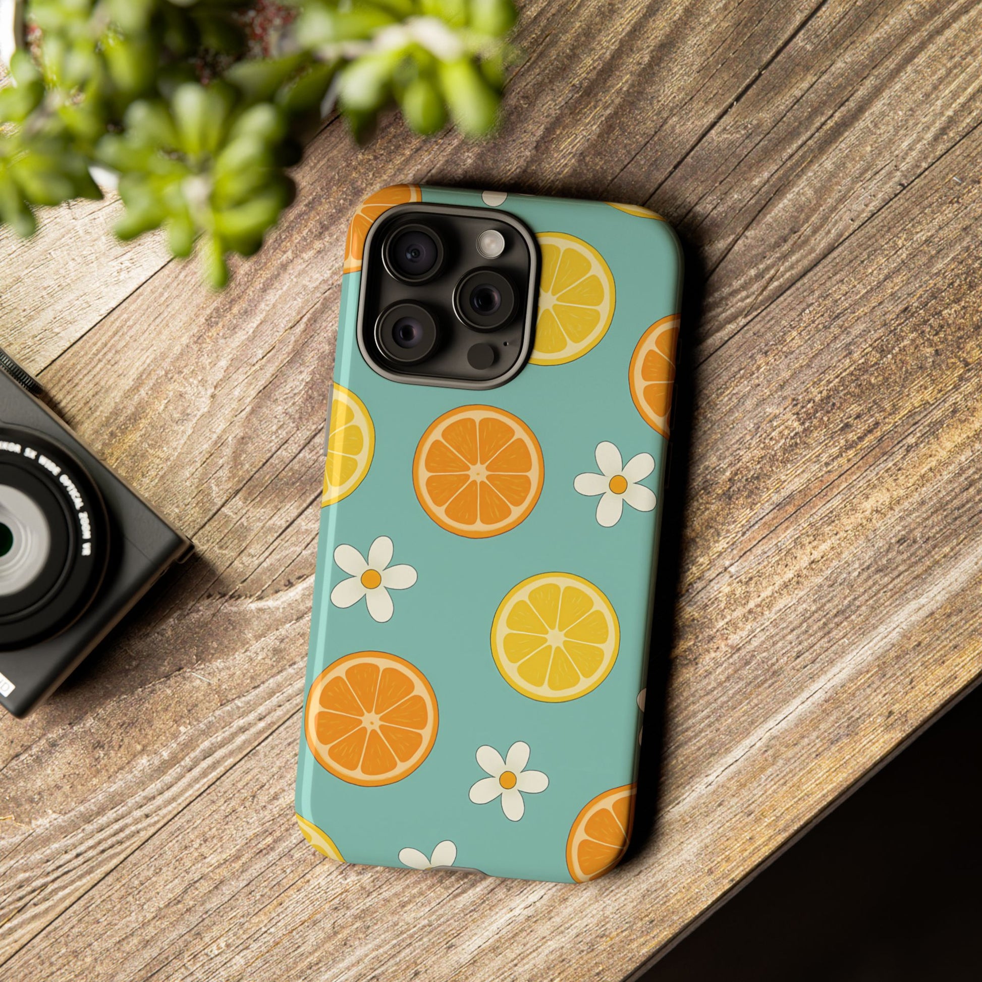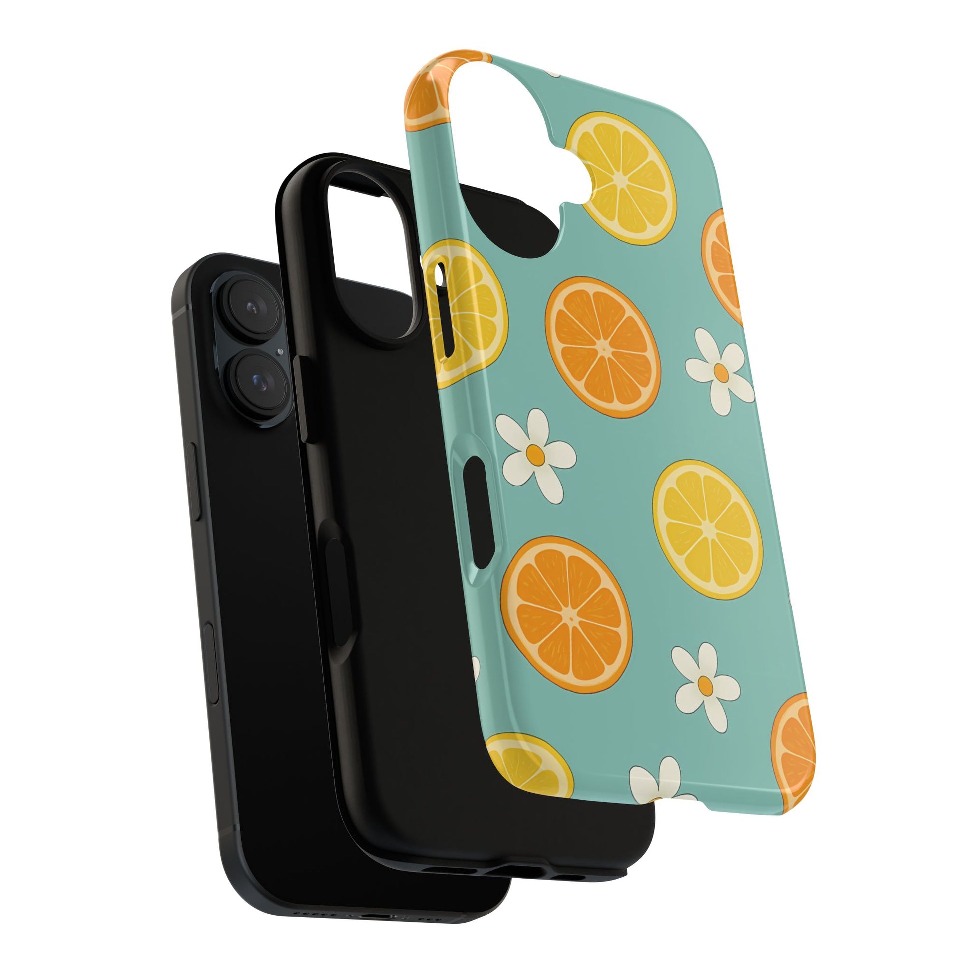 Brighten up your phone with this cheerful Citrus Bloom Phone Case, featuring a vibrant all-over print of juicy orange and lemon slices paired with playful white daisies on a refreshing teal background.