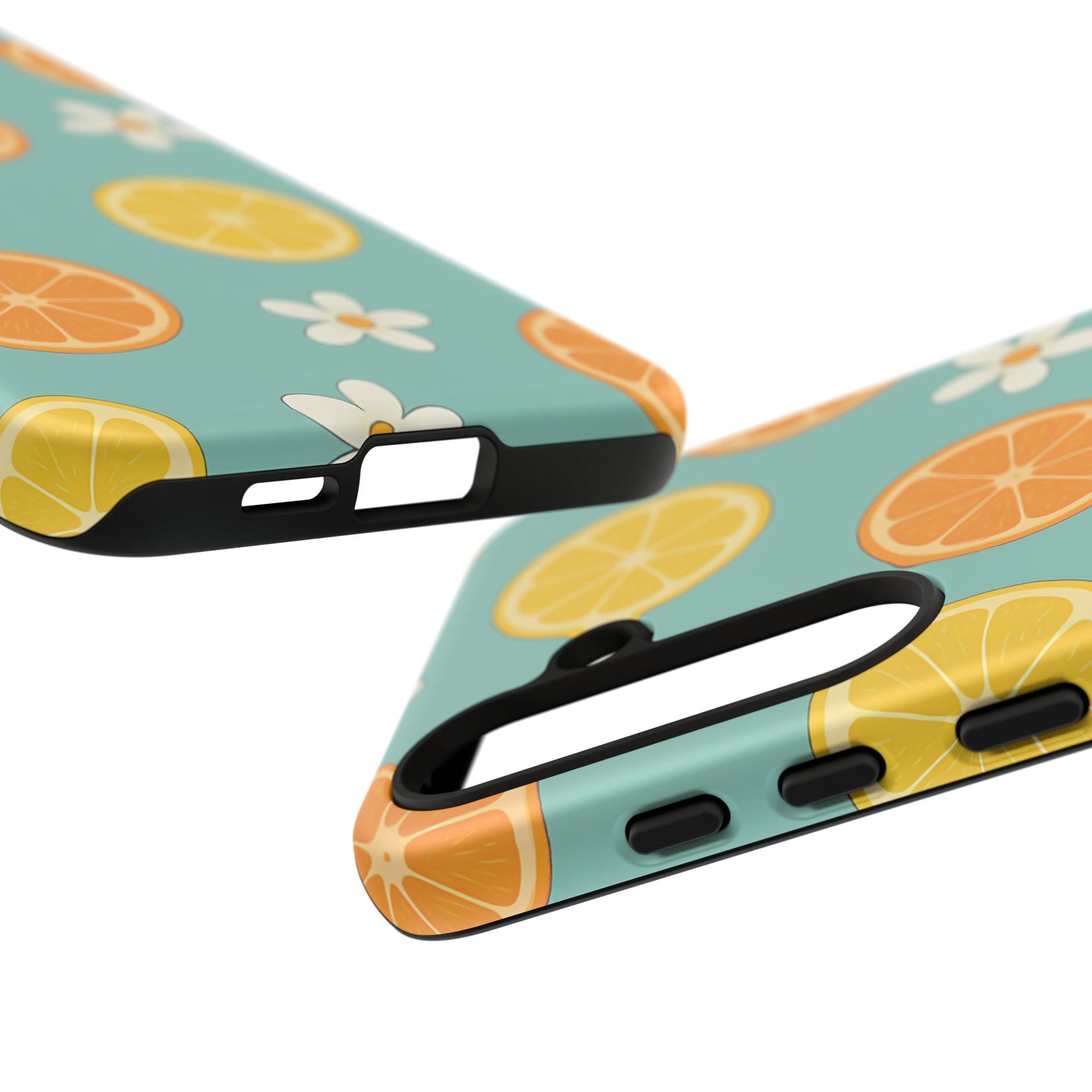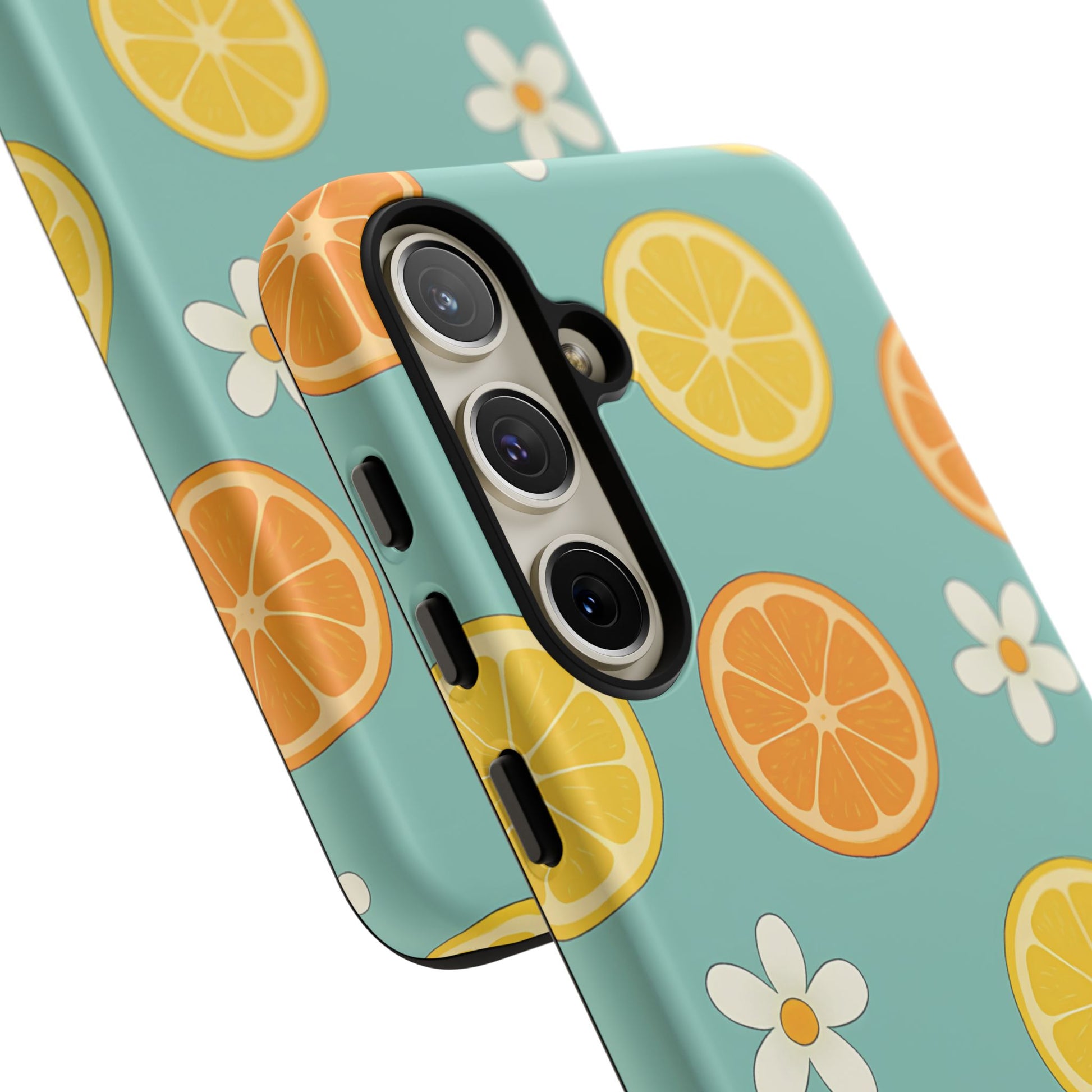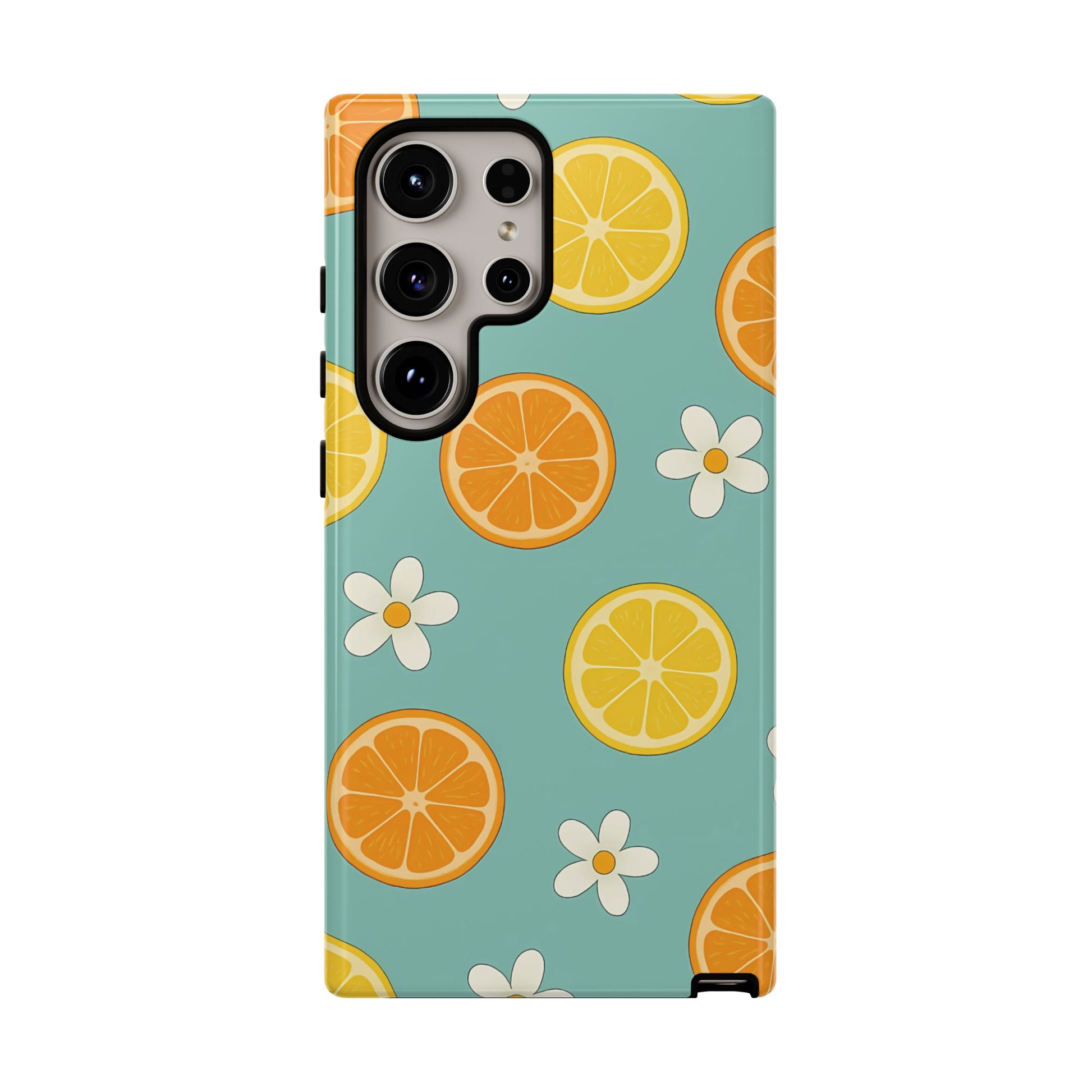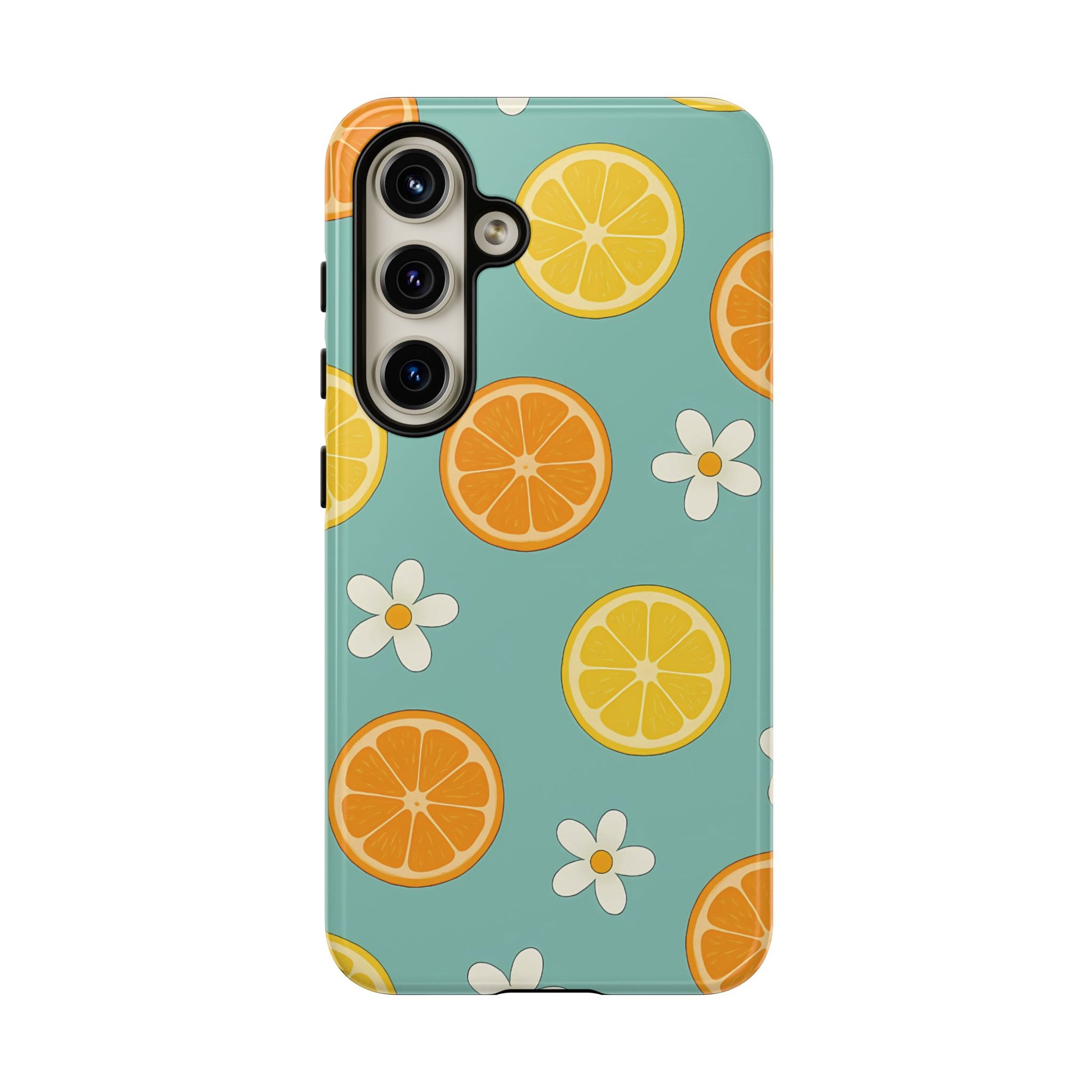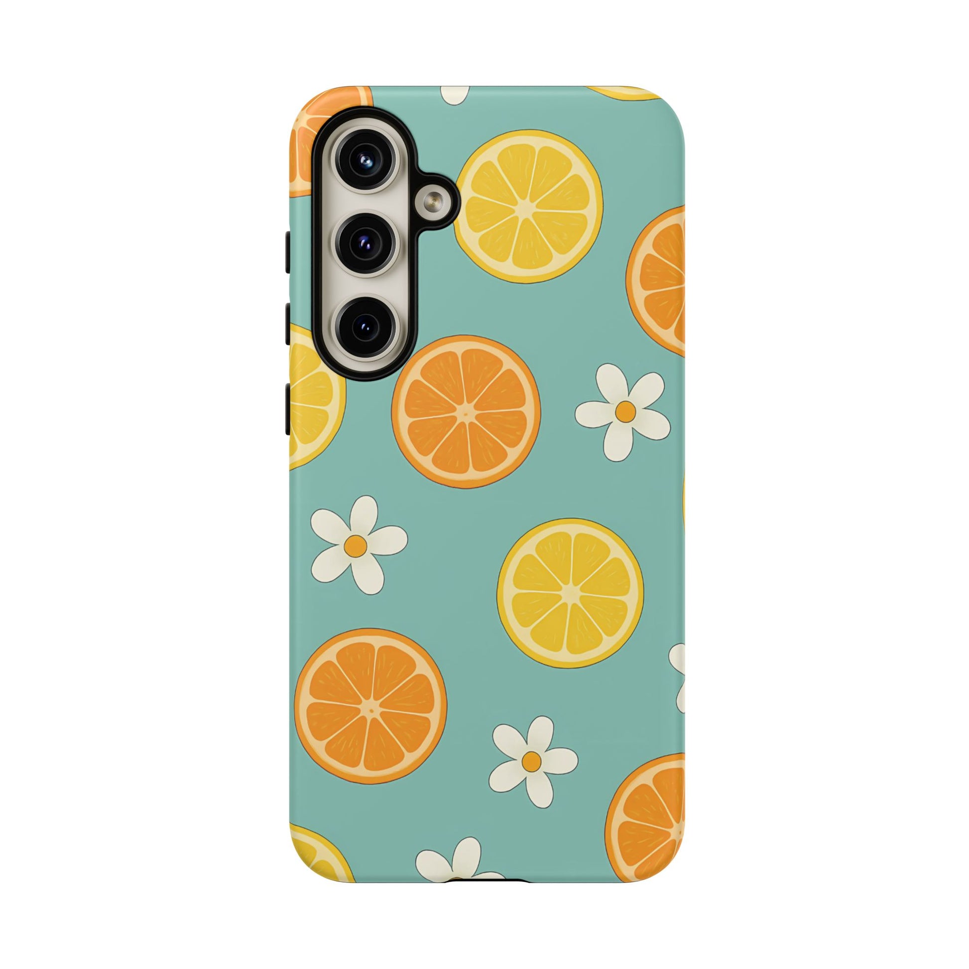 Brighten up your phone with this cheerful Citrus Bloom Phone Case, featuring a vibrant all-over print of juicy orange and lemon slices paired with playful white daisies on a refreshing teal background.