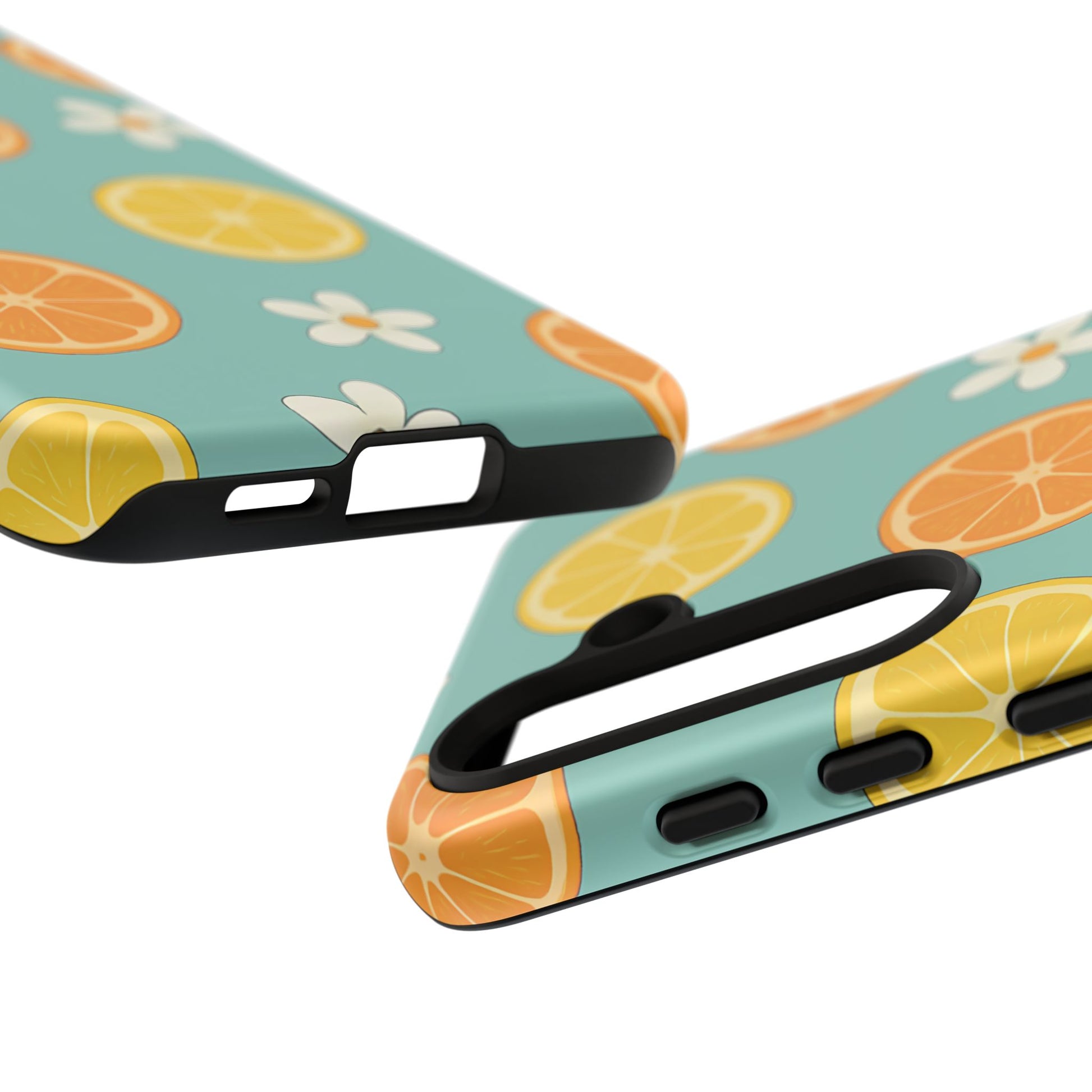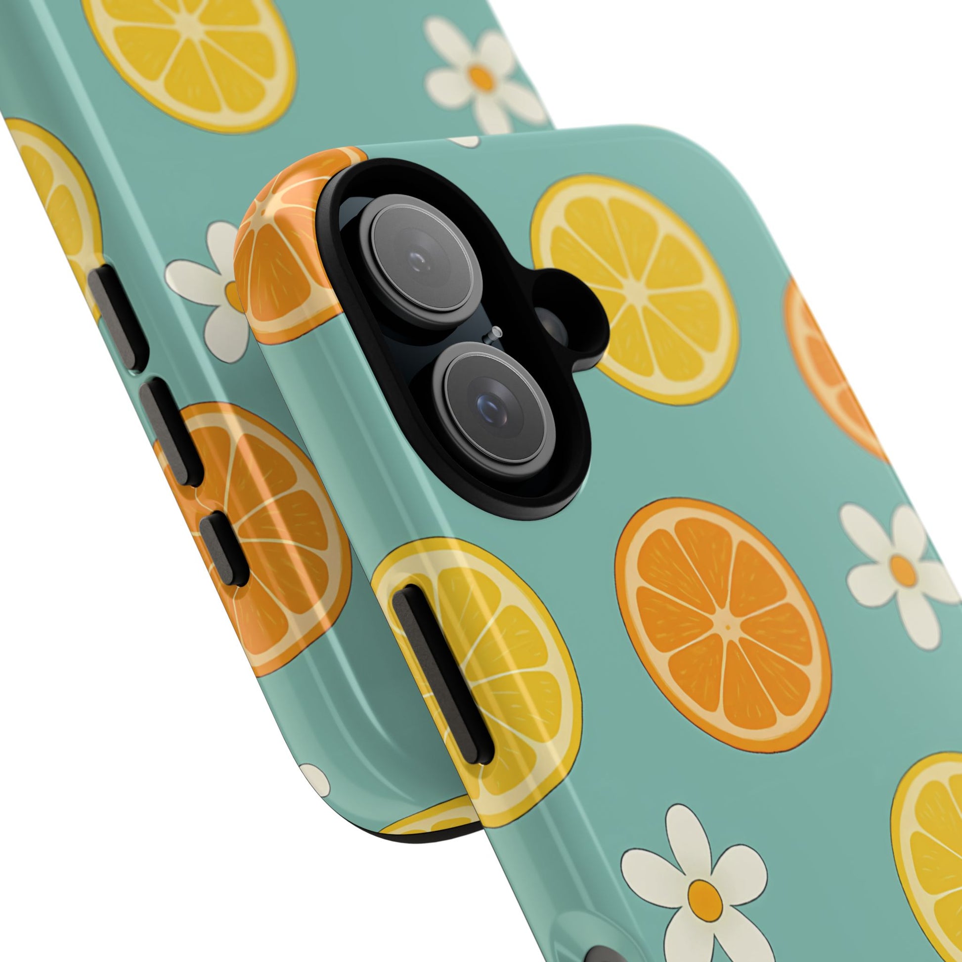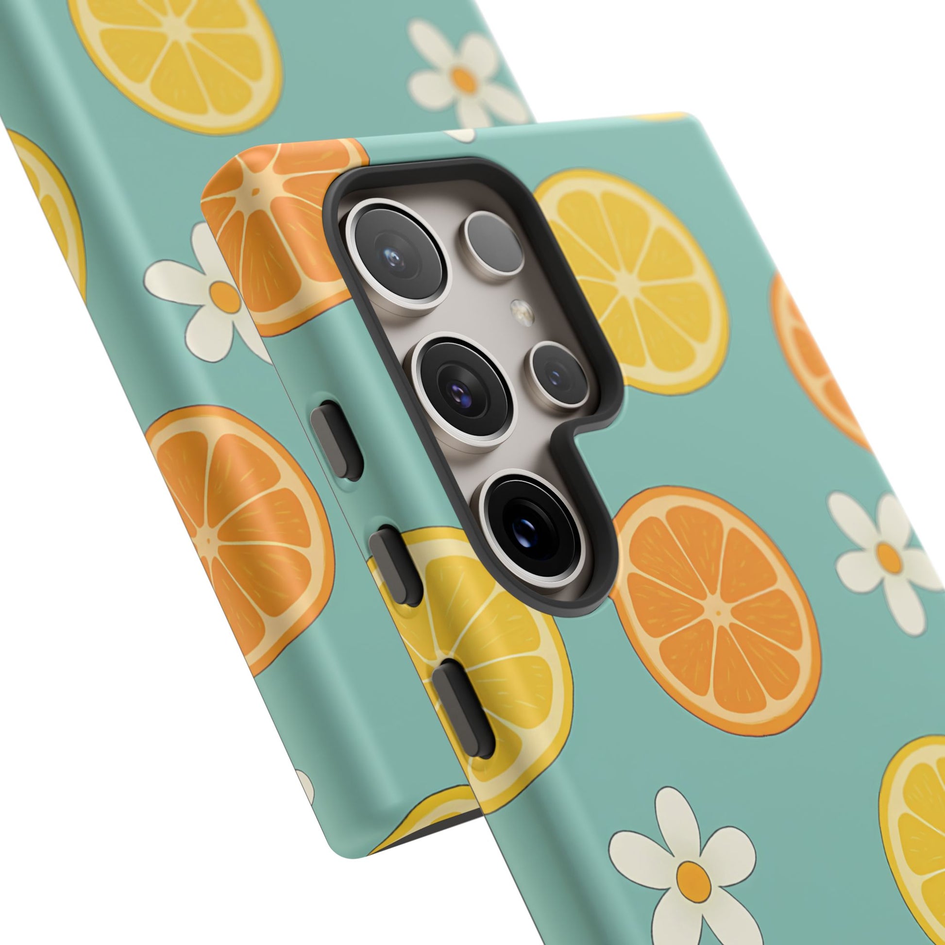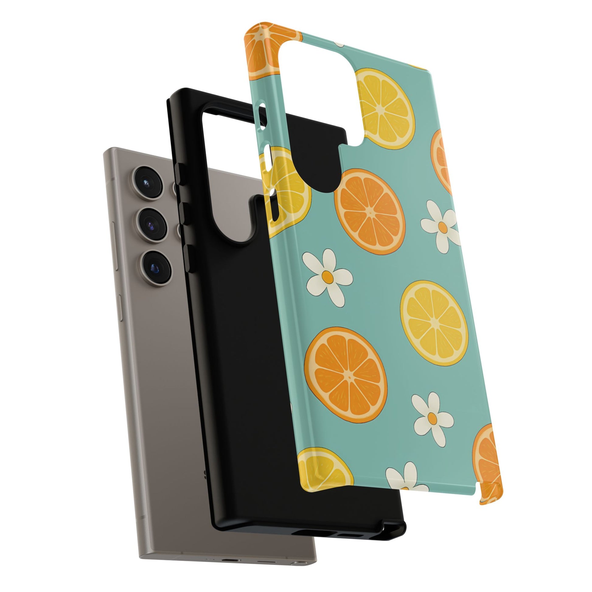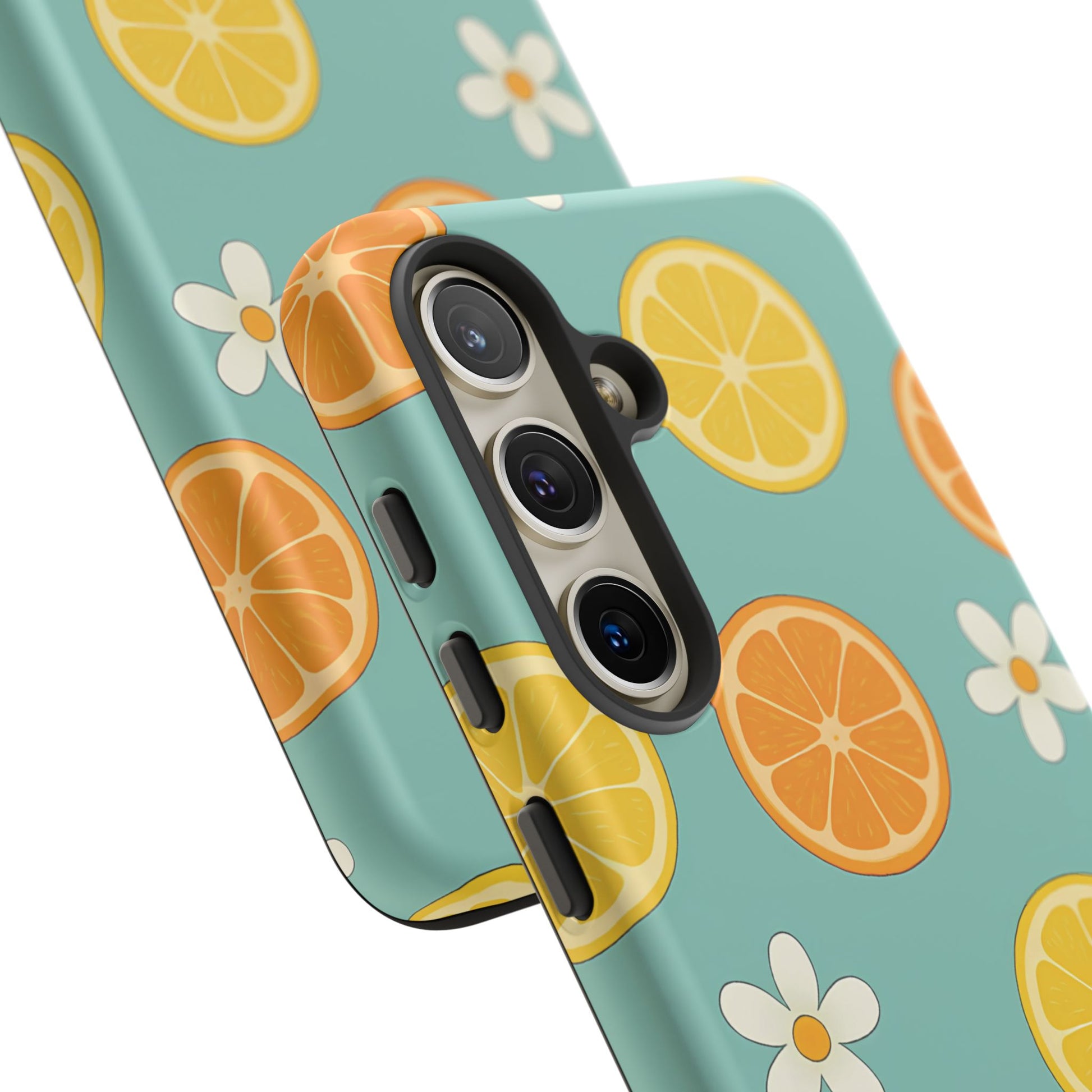 Brighten up your phone with this cheerful Citrus Bloom Phone Case, featuring a vibrant all-over print of juicy orange and lemon slices paired with playful white daisies on a refreshing teal background.