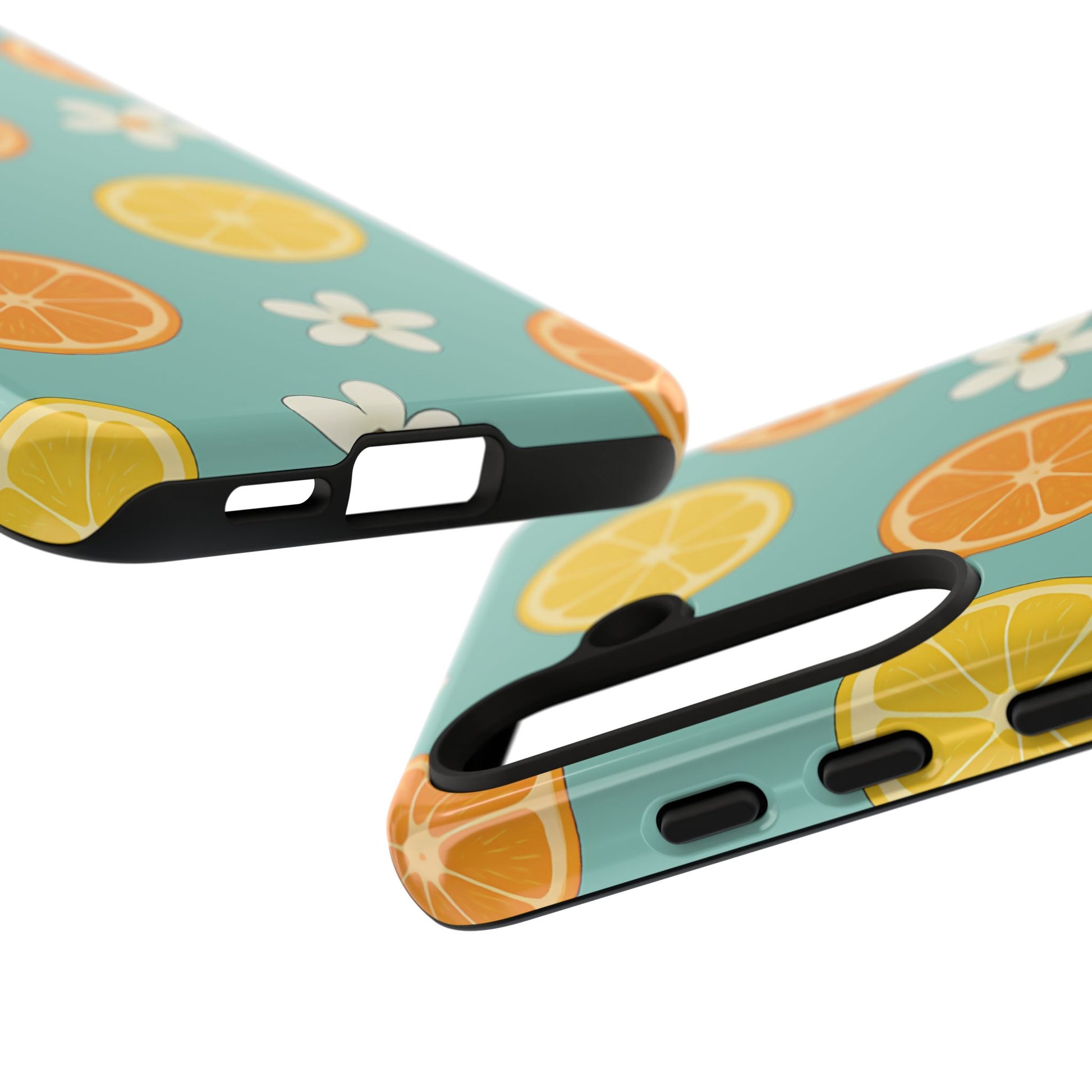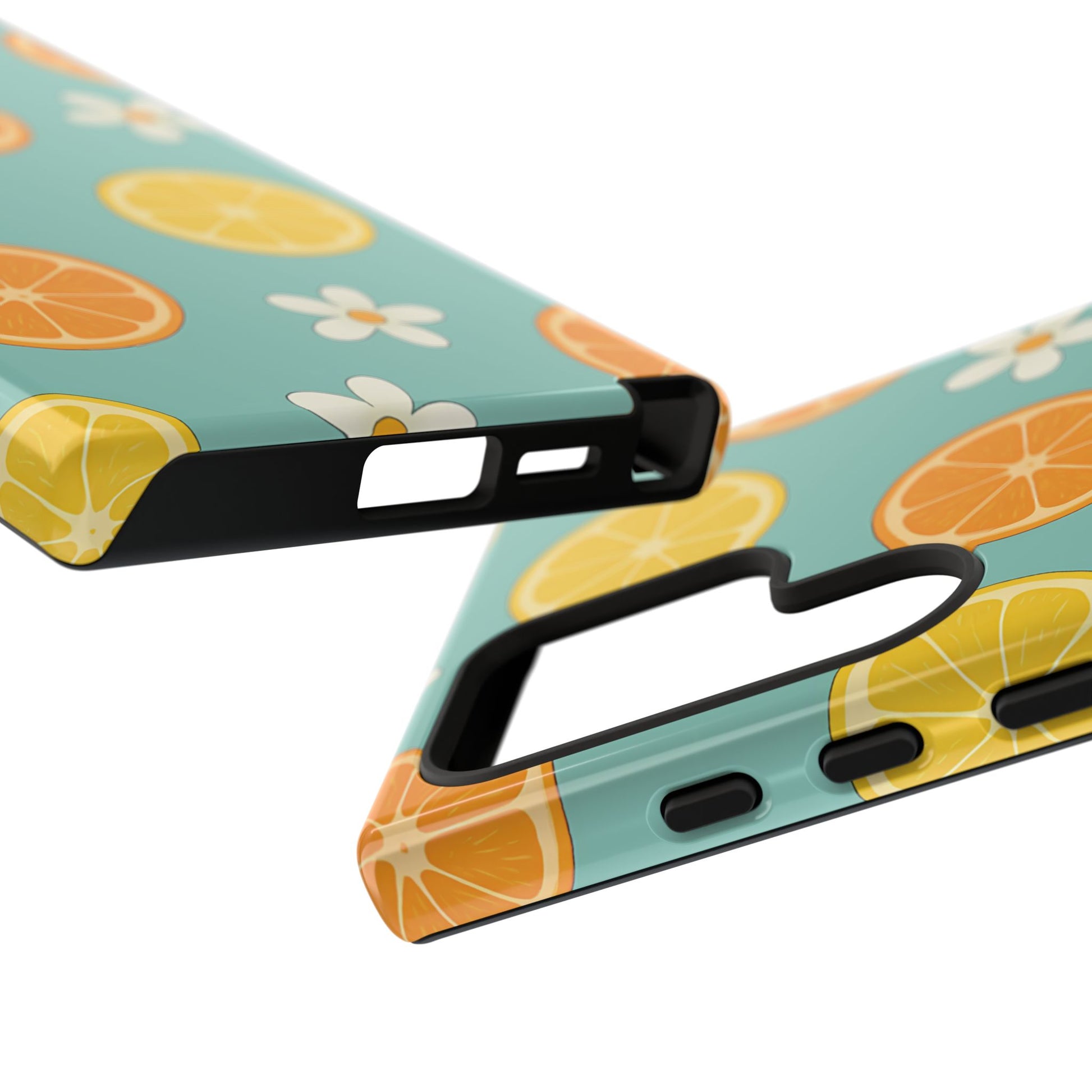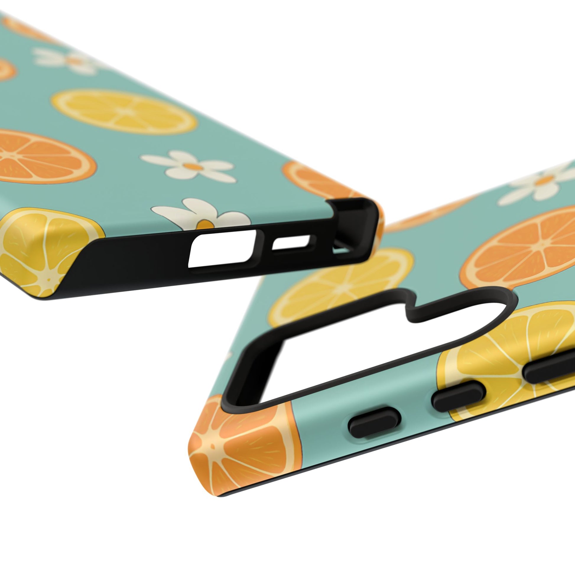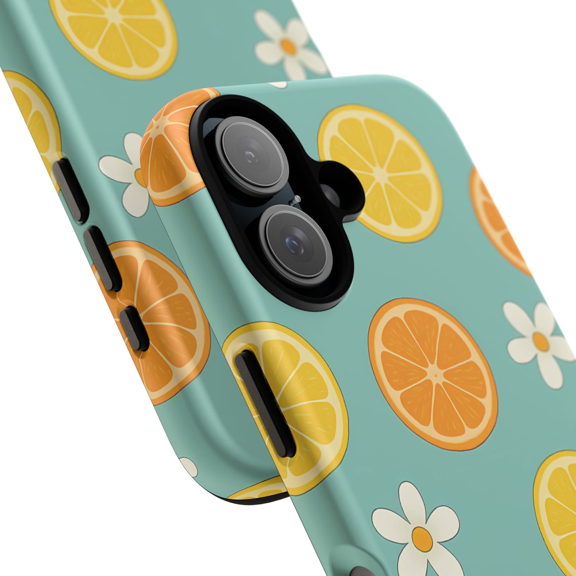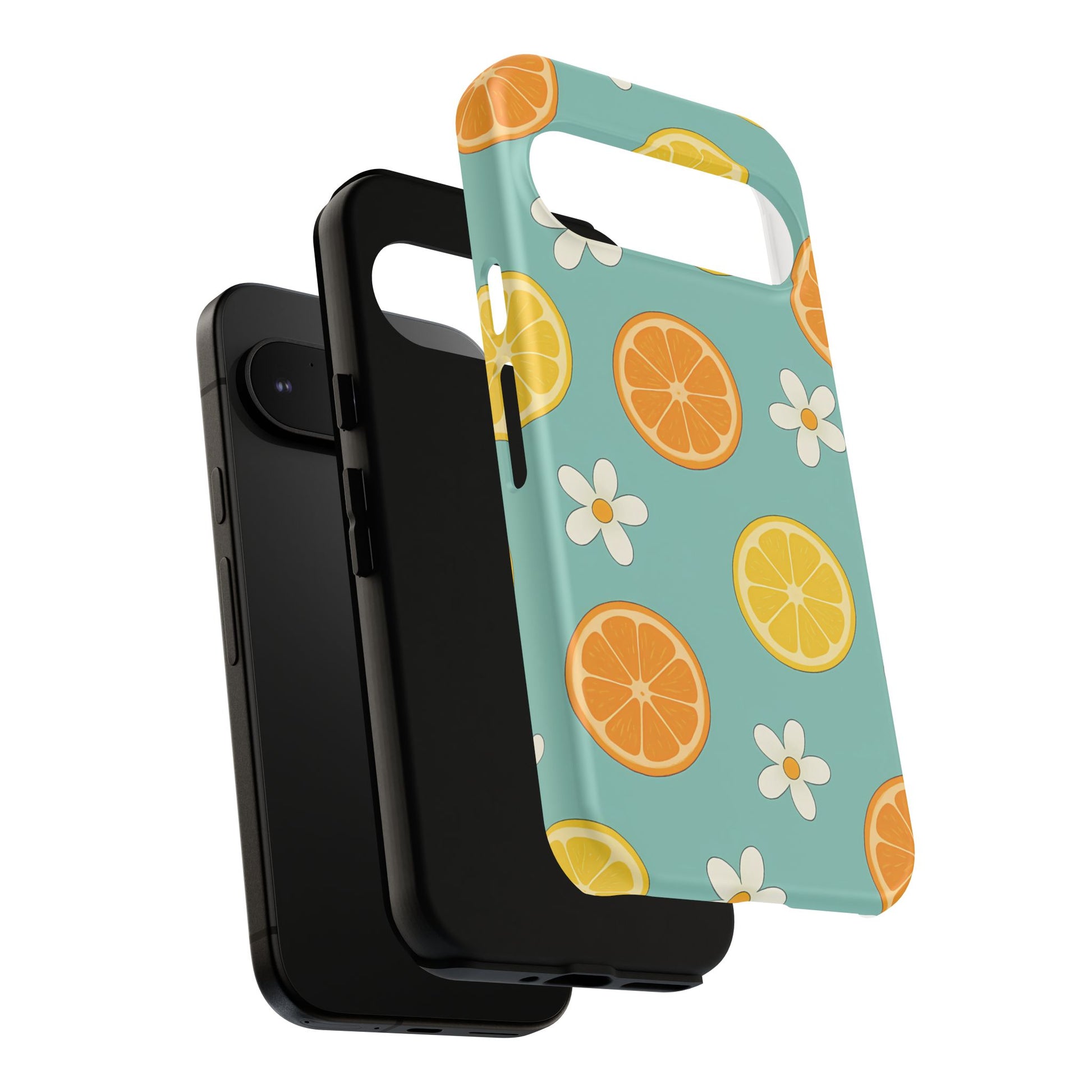 Brighten up your phone with this cheerful Citrus Bloom Phone Case, featuring a vibrant all-over print of juicy orange and lemon slices paired with playful white daisies on a refreshing teal background.