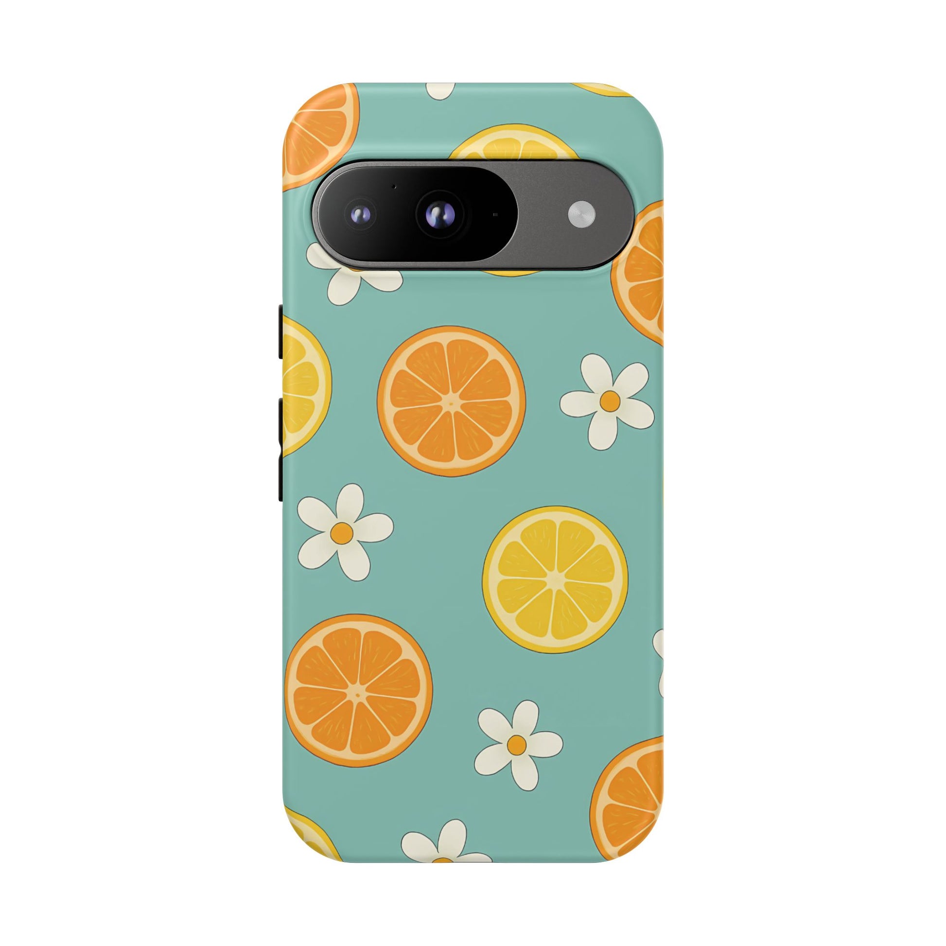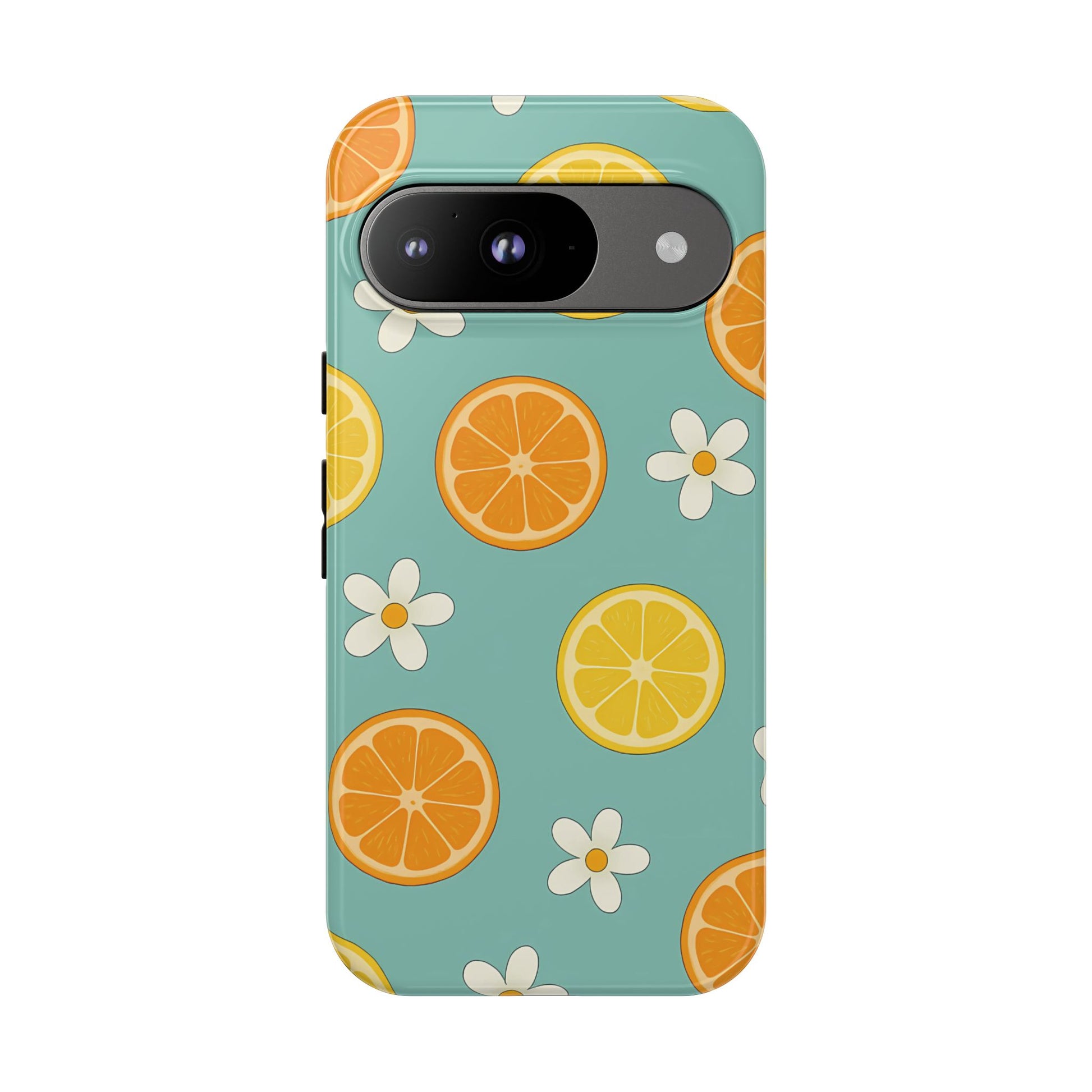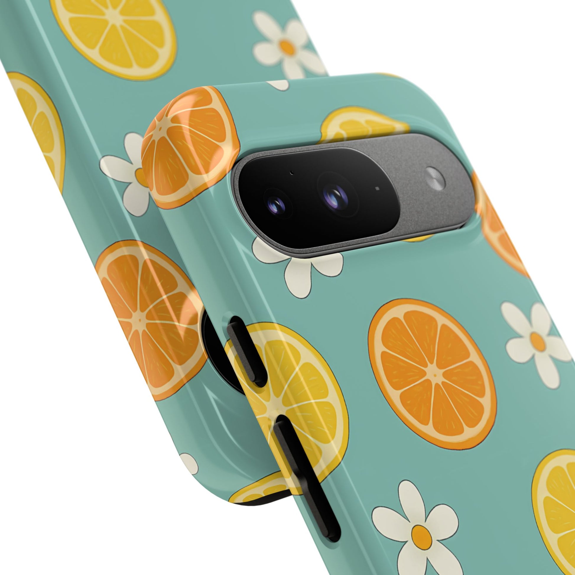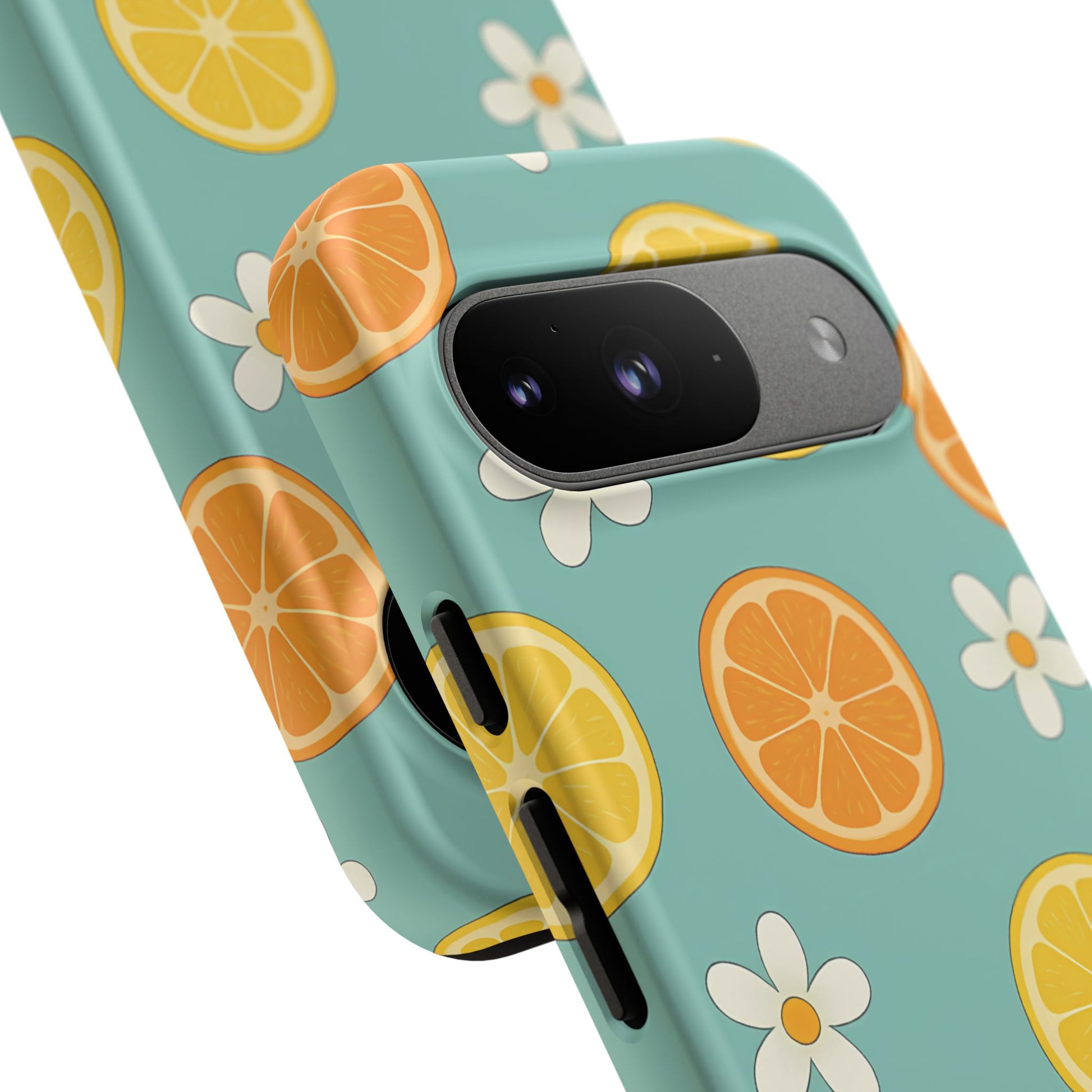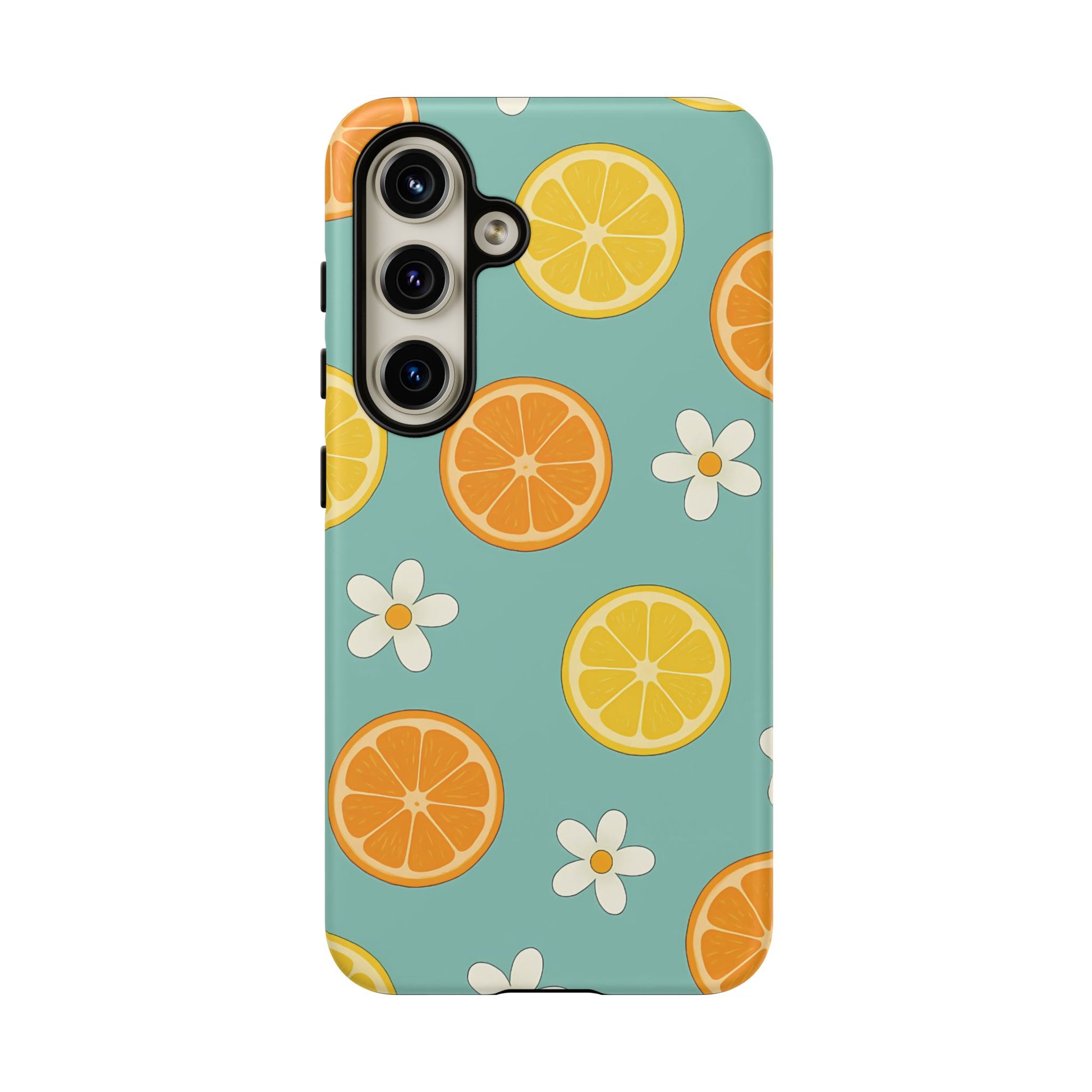 Citrus Bloom Phone Case – Orange, Lemon & Daisy Pattern on Teal