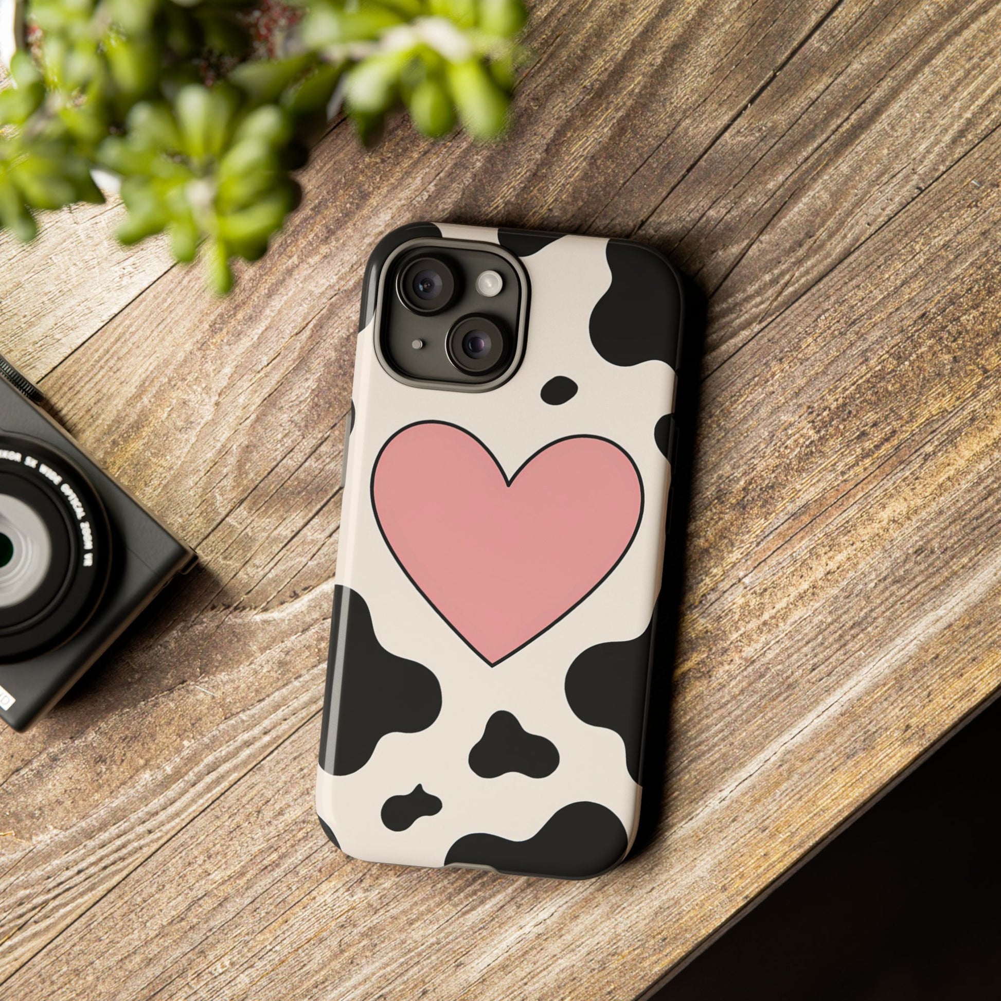 Make a bold and playful statement with this Cow Print Phone Case featuring a sweet pink heart at its center.