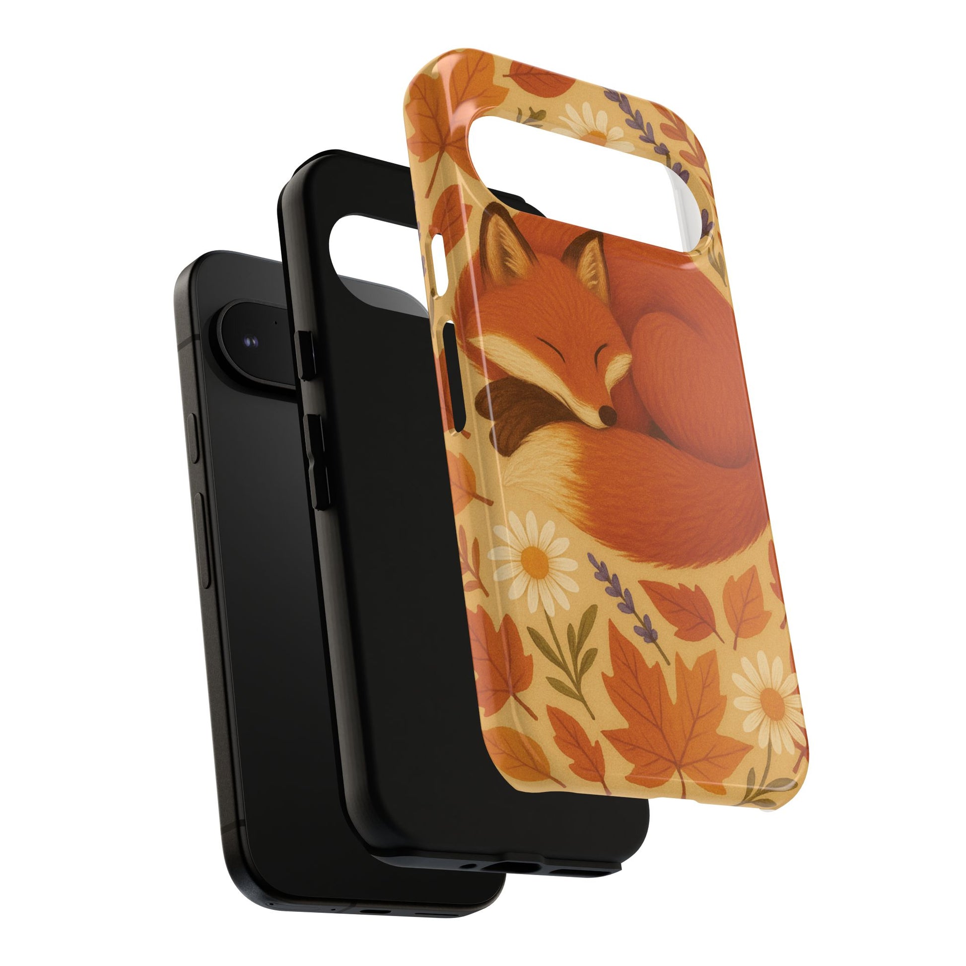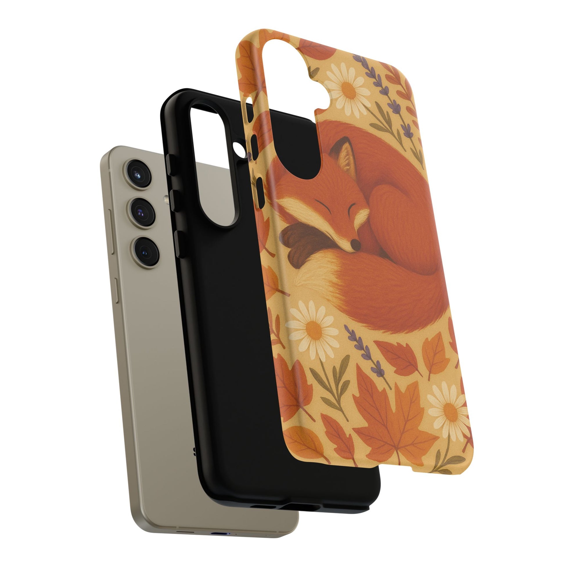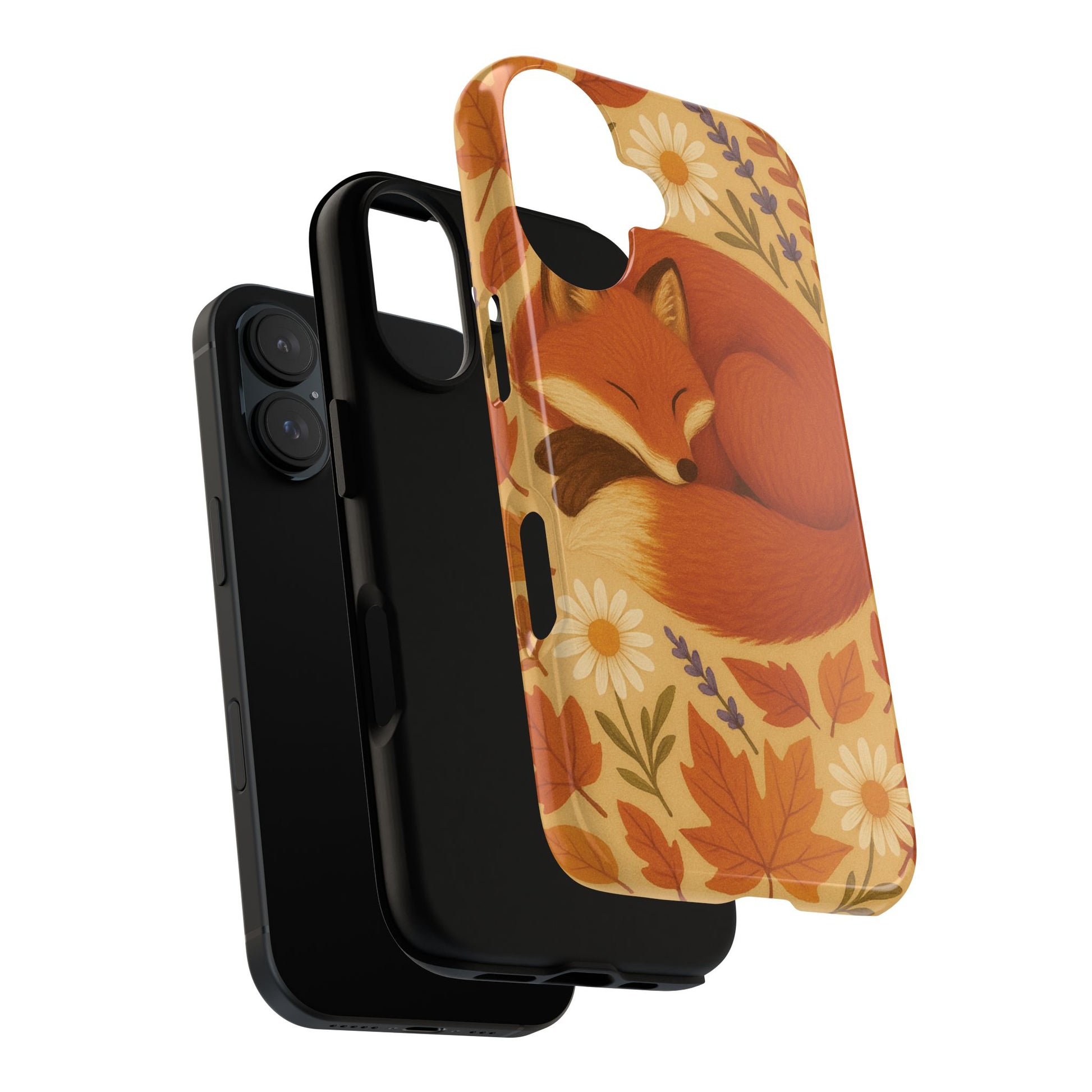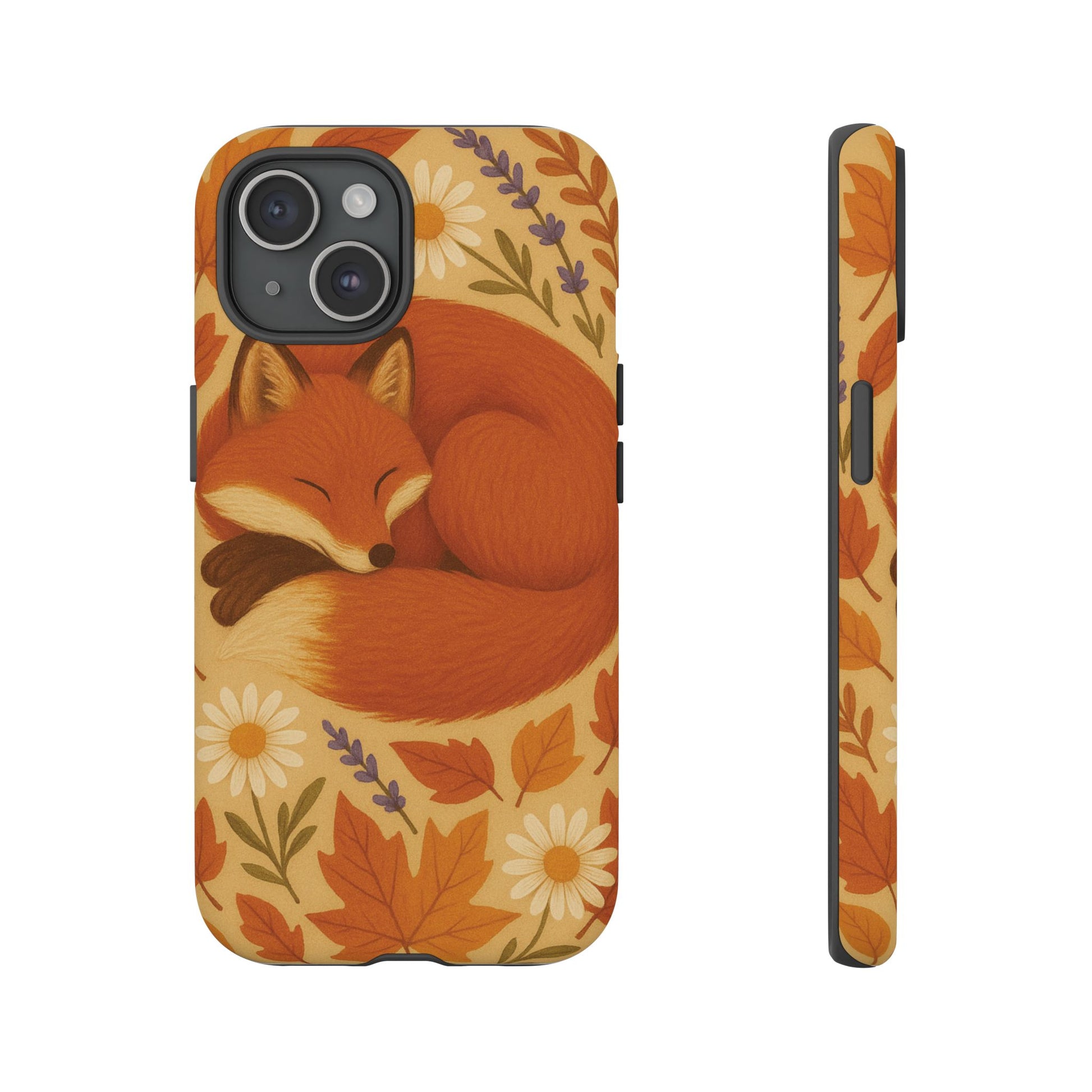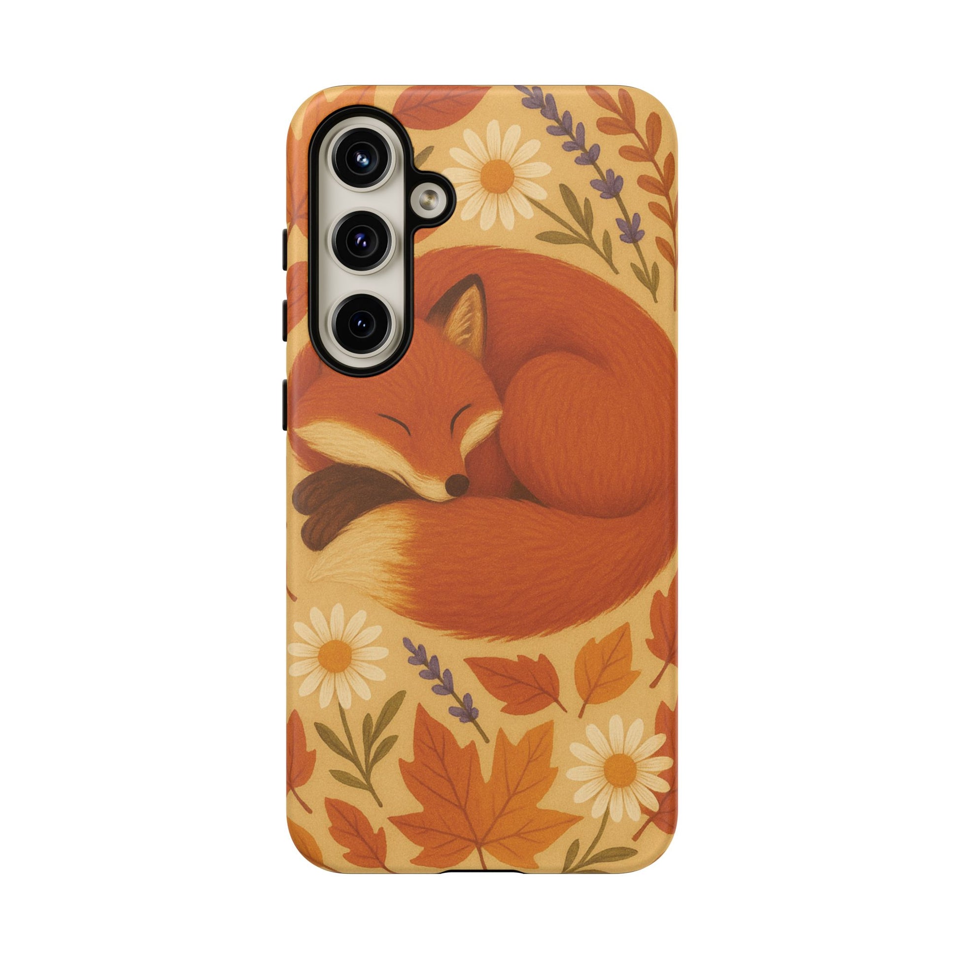 This durable phone case is adorned with a charming design featuring a serene fox nestled among fall leaves and daisies, inviting a warm and cozy vibe. It’s ideal for those who value both aesthetics and functionality in their accessories.