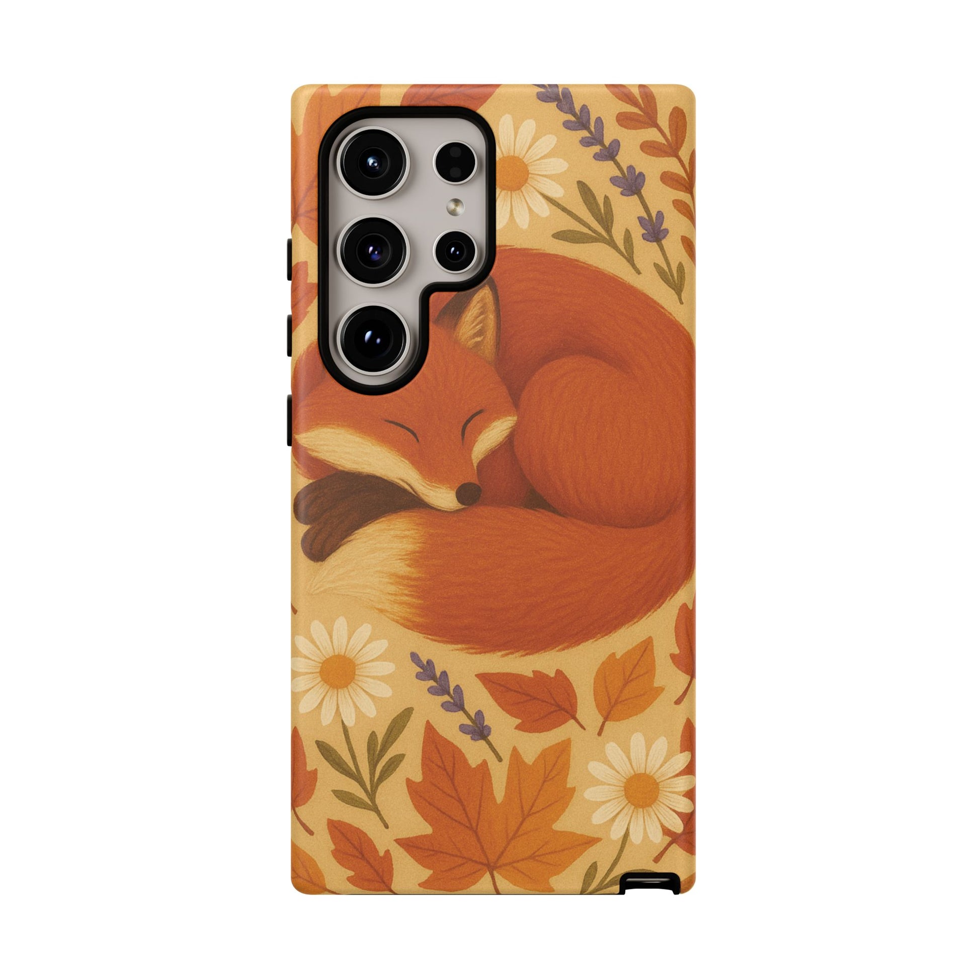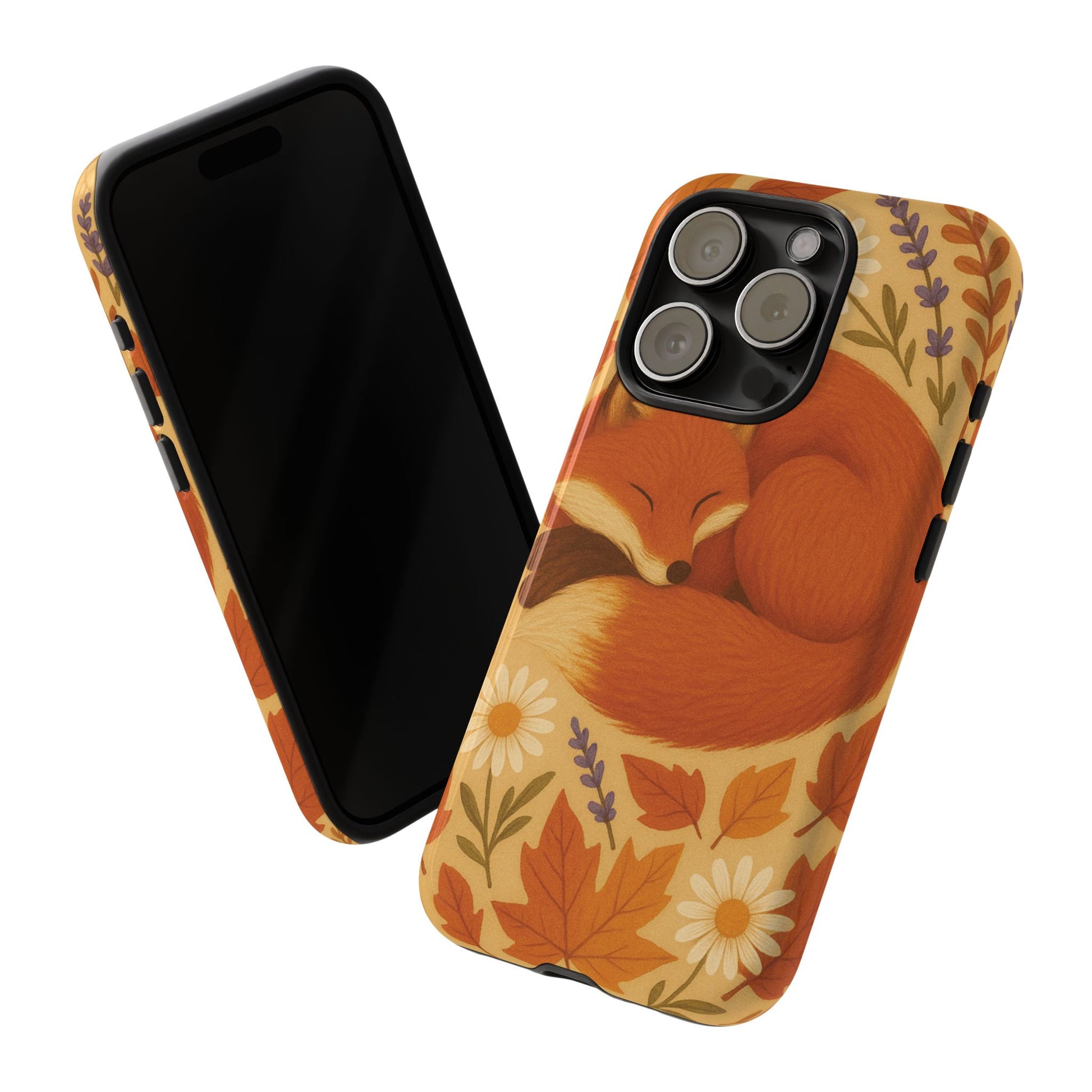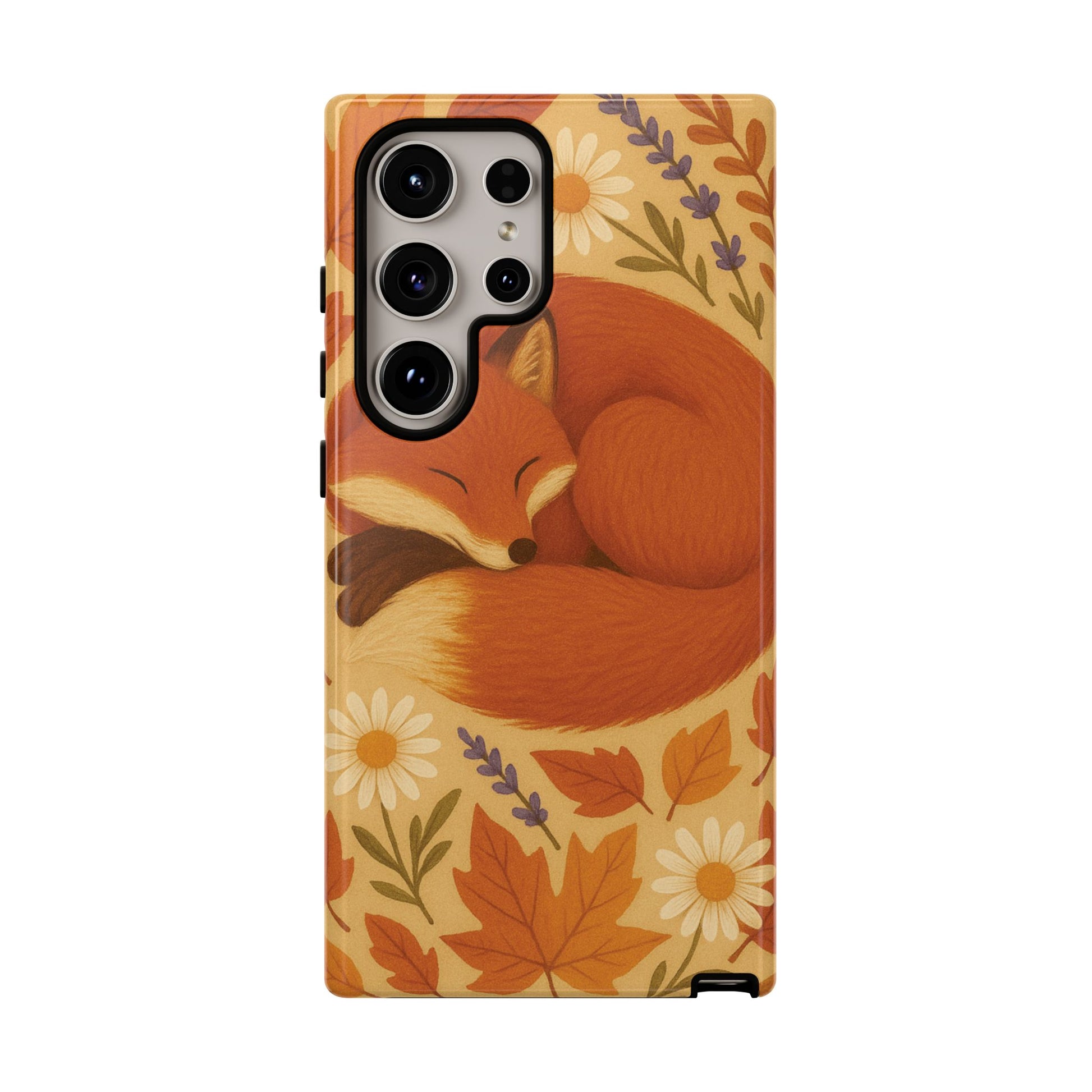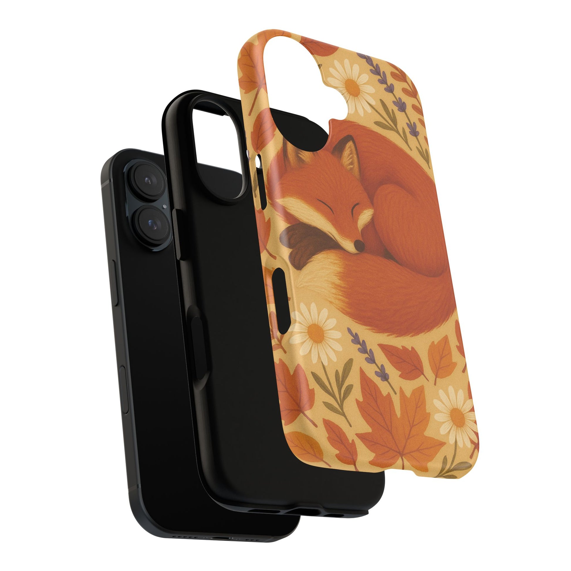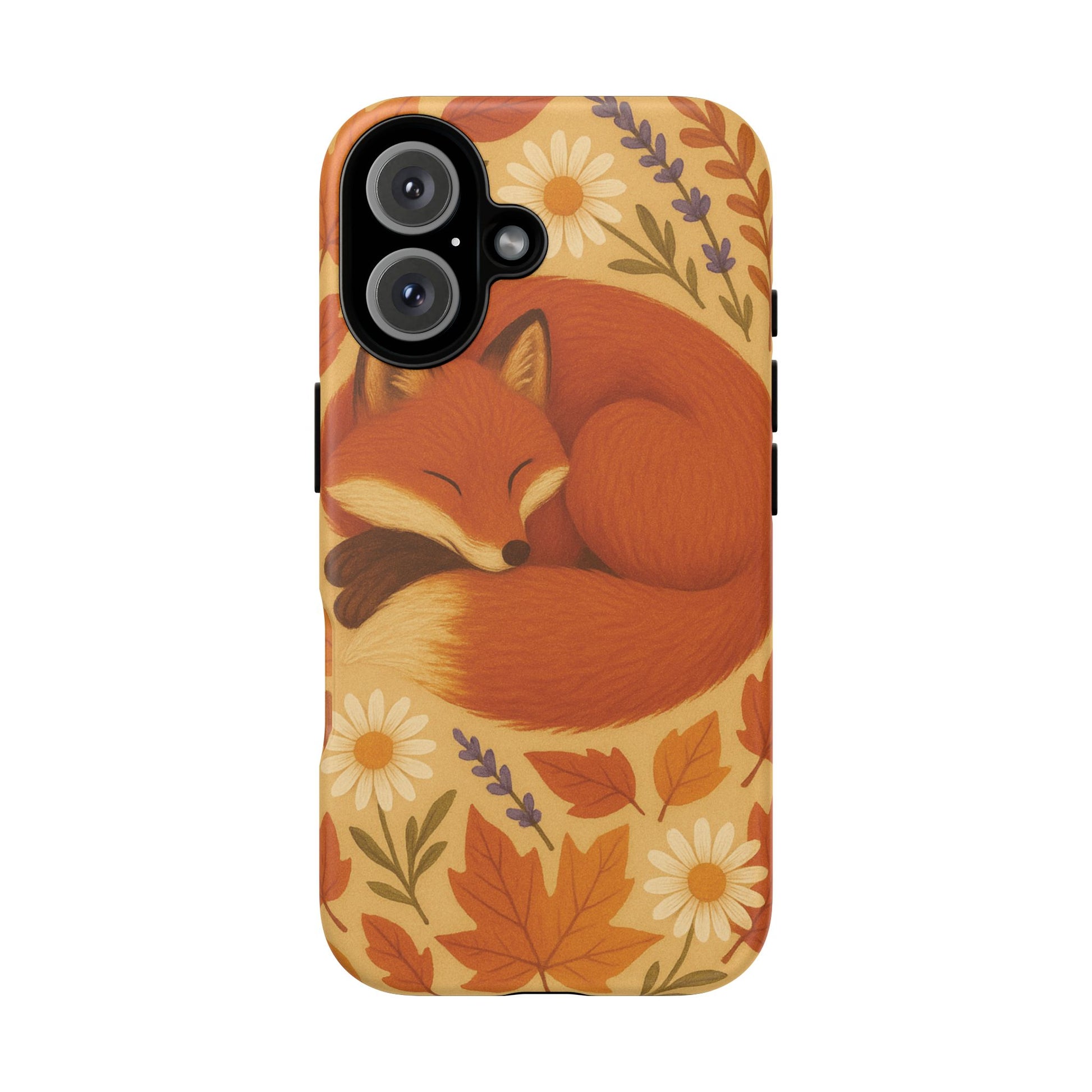 This durable phone case is adorned with a charming design featuring a serene fox nestled among fall leaves and daisies, inviting a warm and cozy vibe. It’s ideal for those who value both aesthetics and functionality in their accessories.