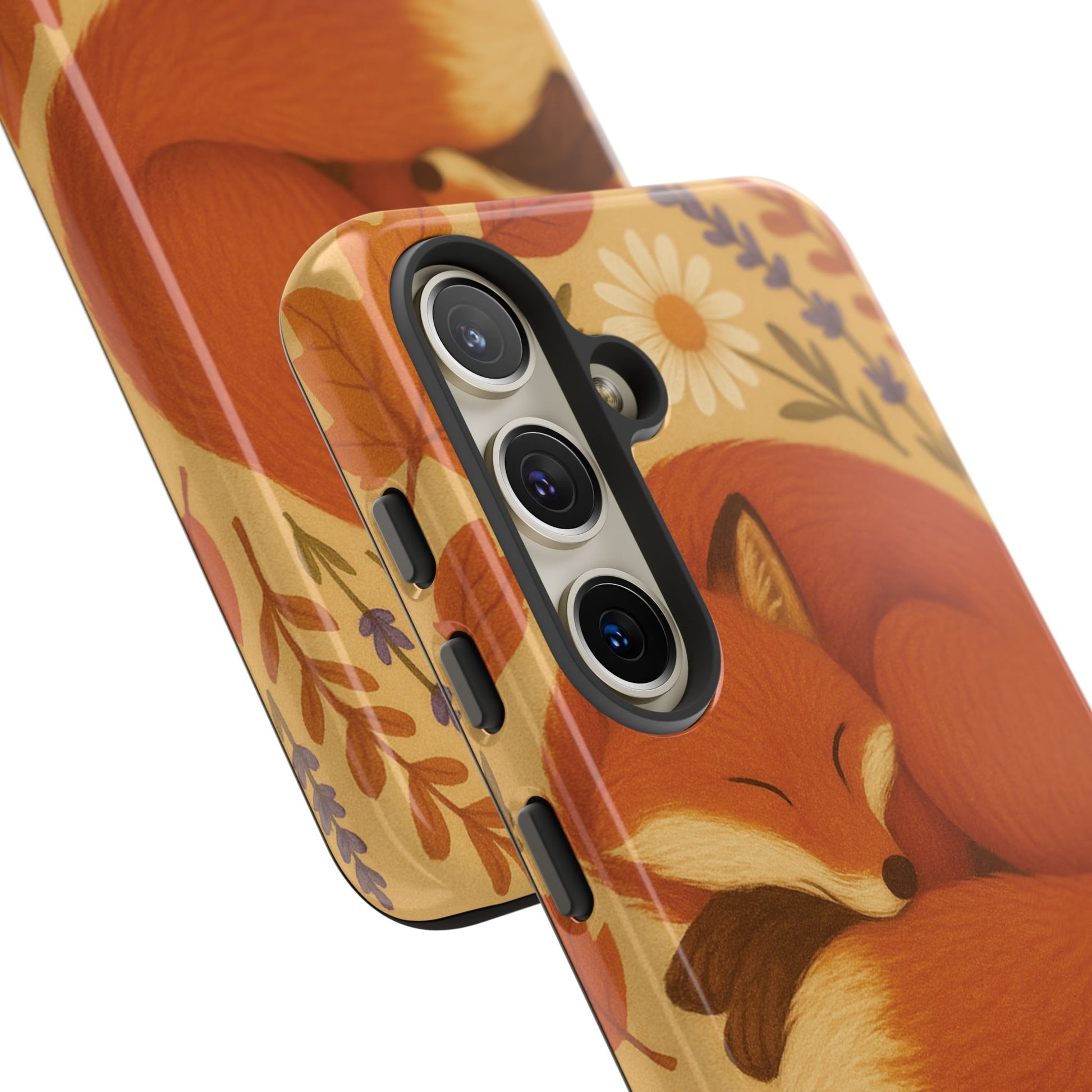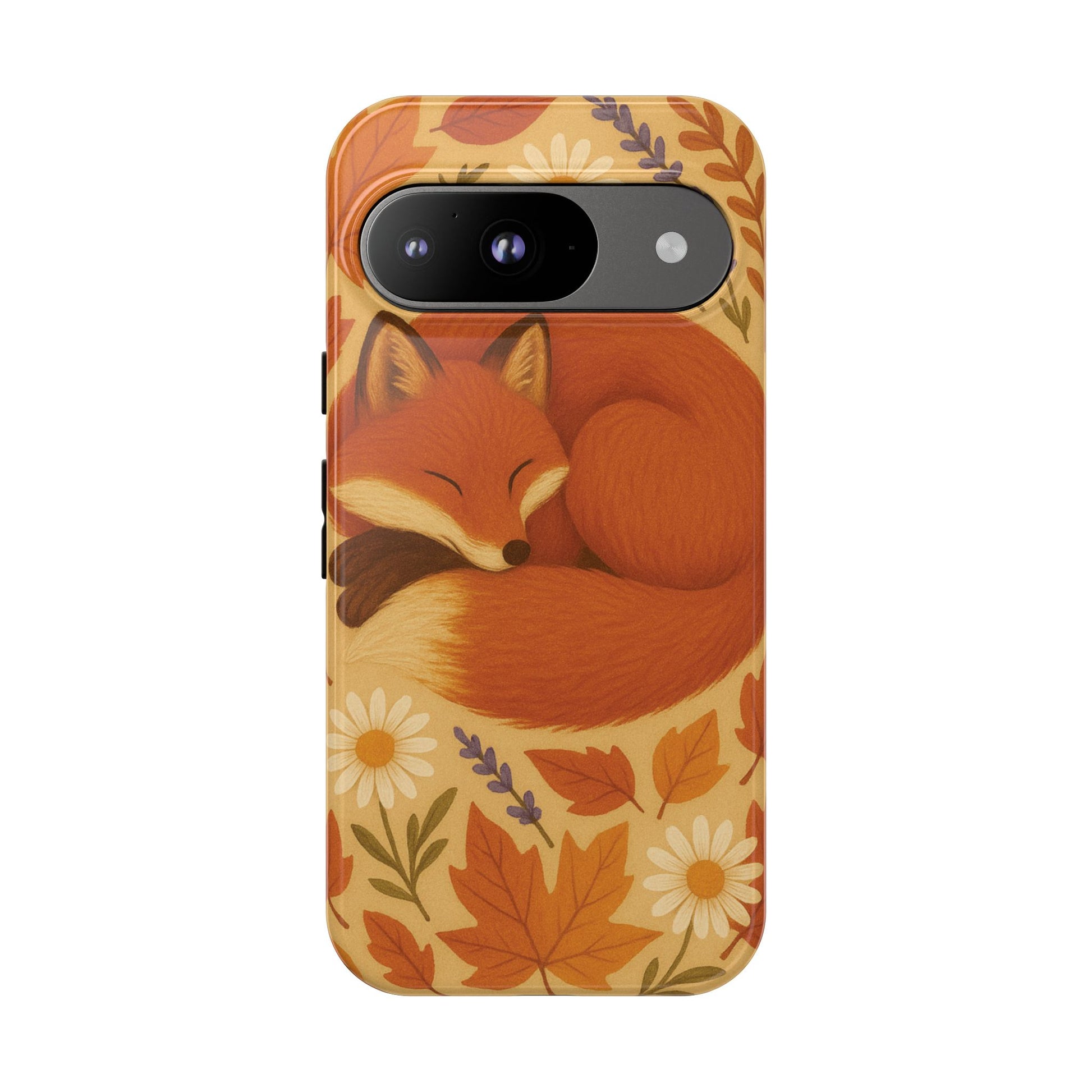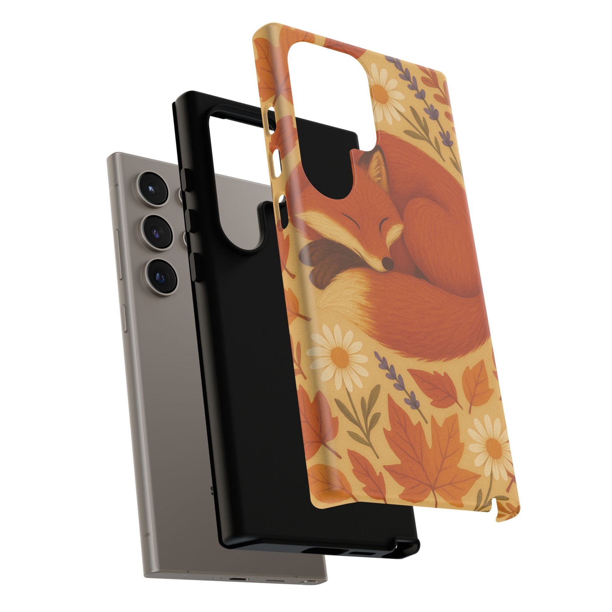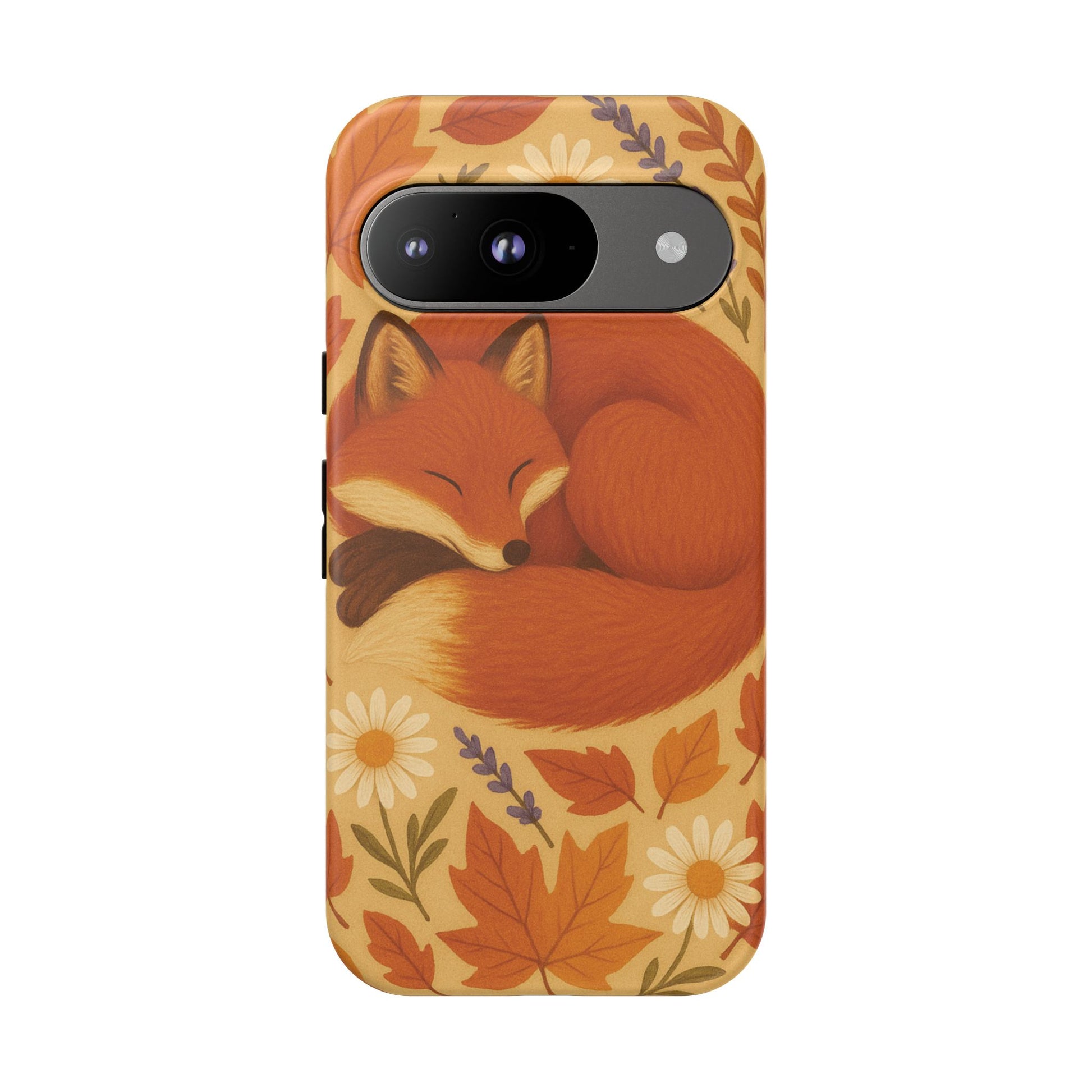 This durable phone case is adorned with a charming design featuring a serene fox nestled among fall leaves and daisies, inviting a warm and cozy vibe. It’s ideal for those who value both aesthetics and functionality in their accessories.