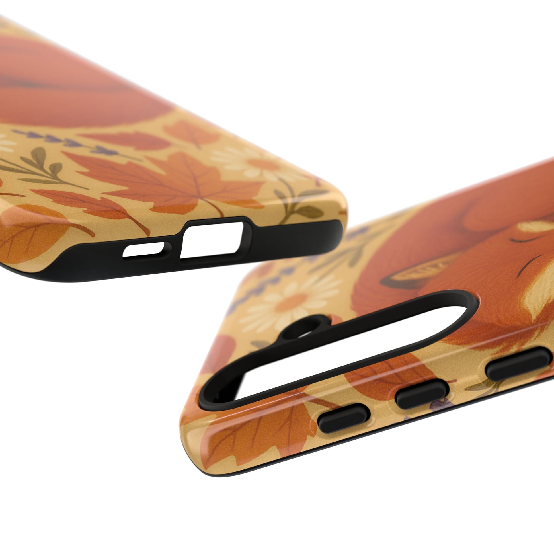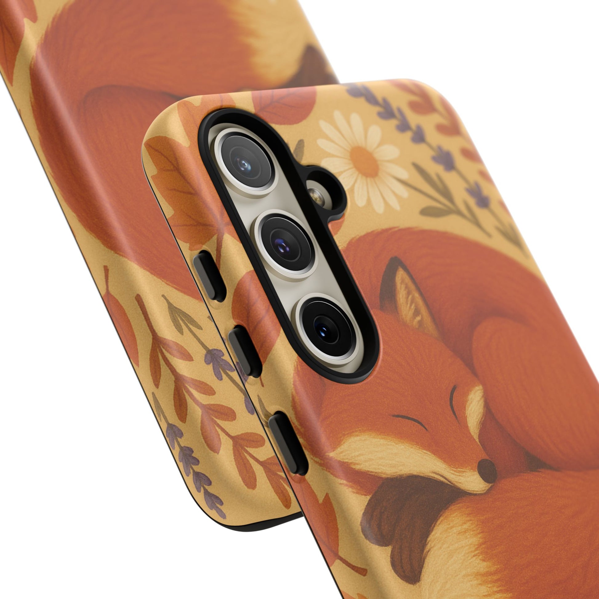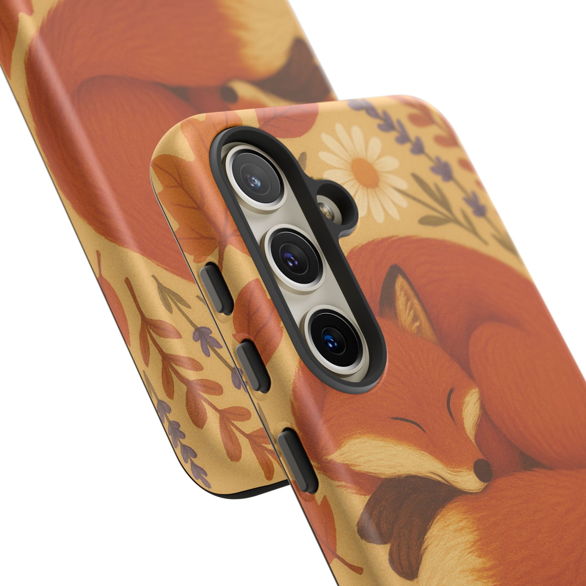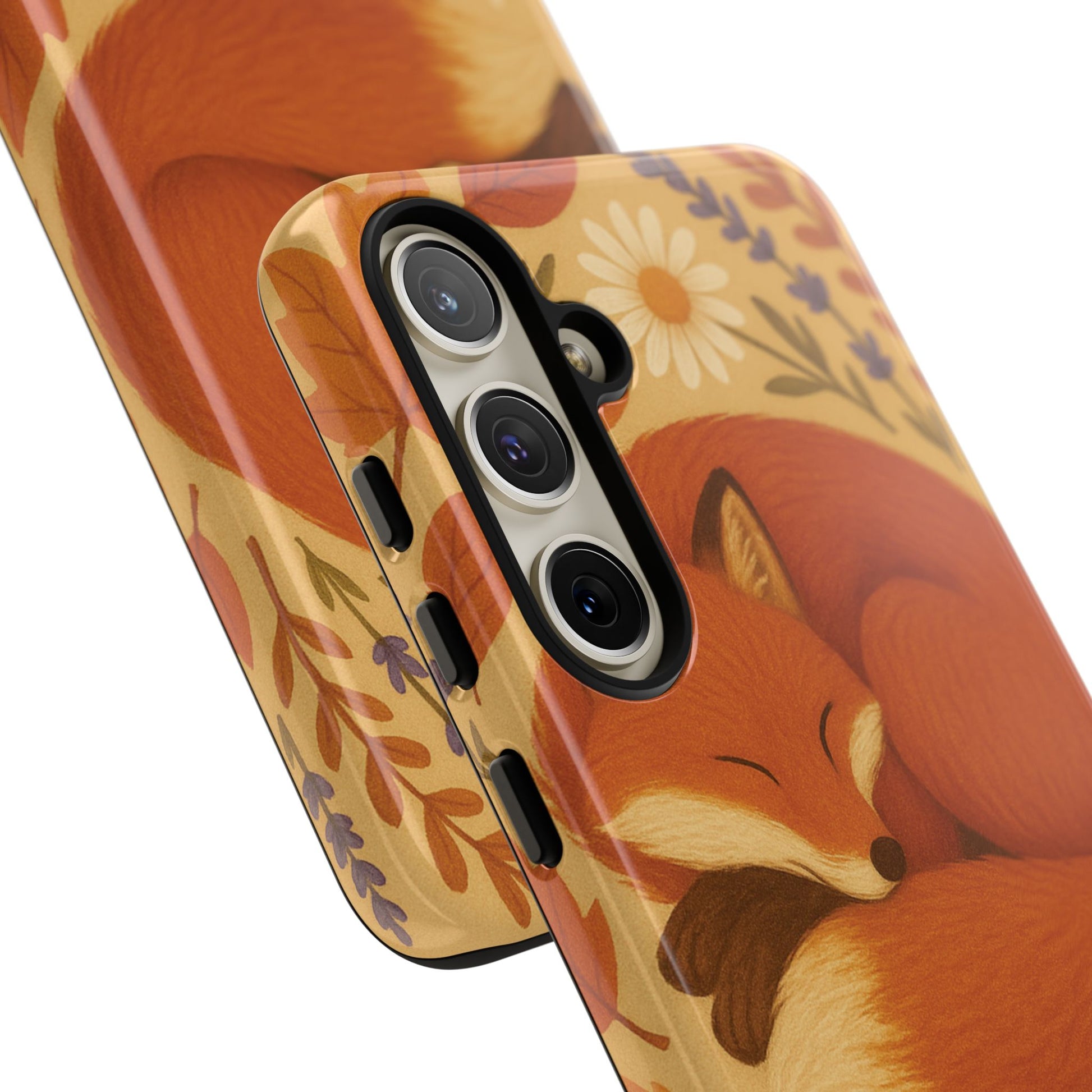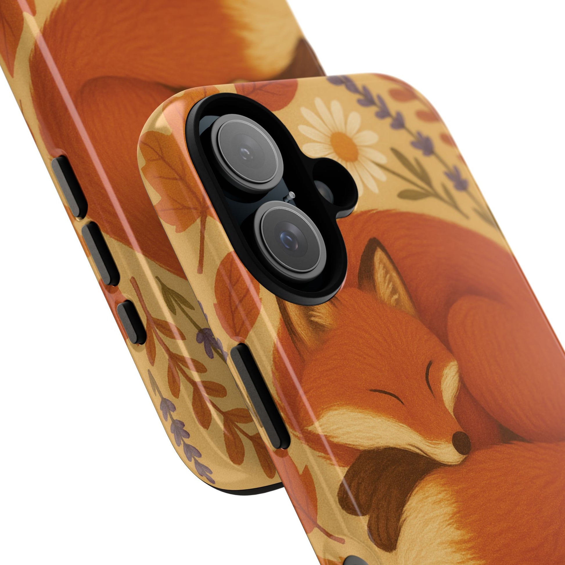 This durable phone case is adorned with a charming design featuring a serene fox nestled among fall leaves and daisies, inviting a warm and cozy vibe. It’s ideal for those who value both aesthetics and functionality in their accessories.
