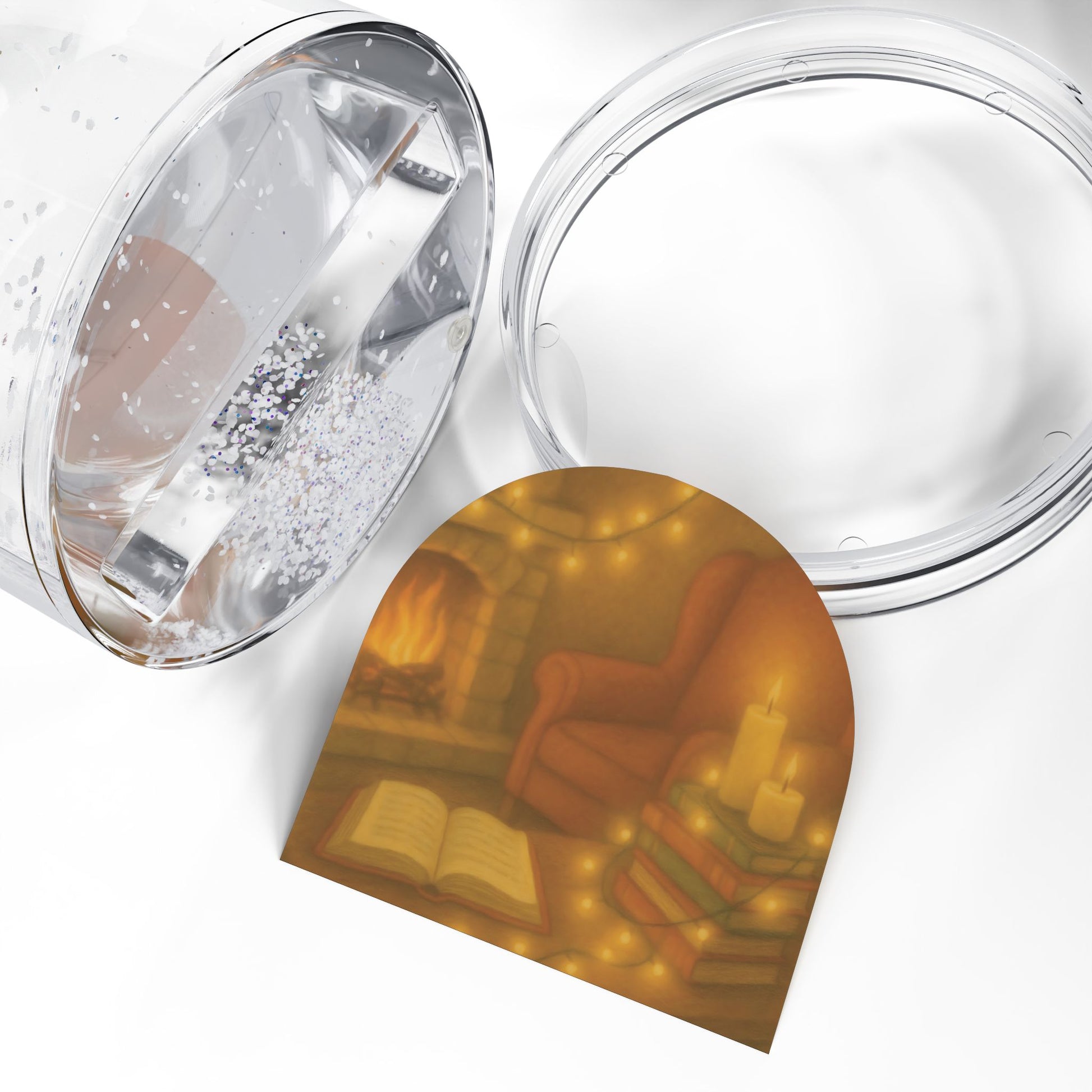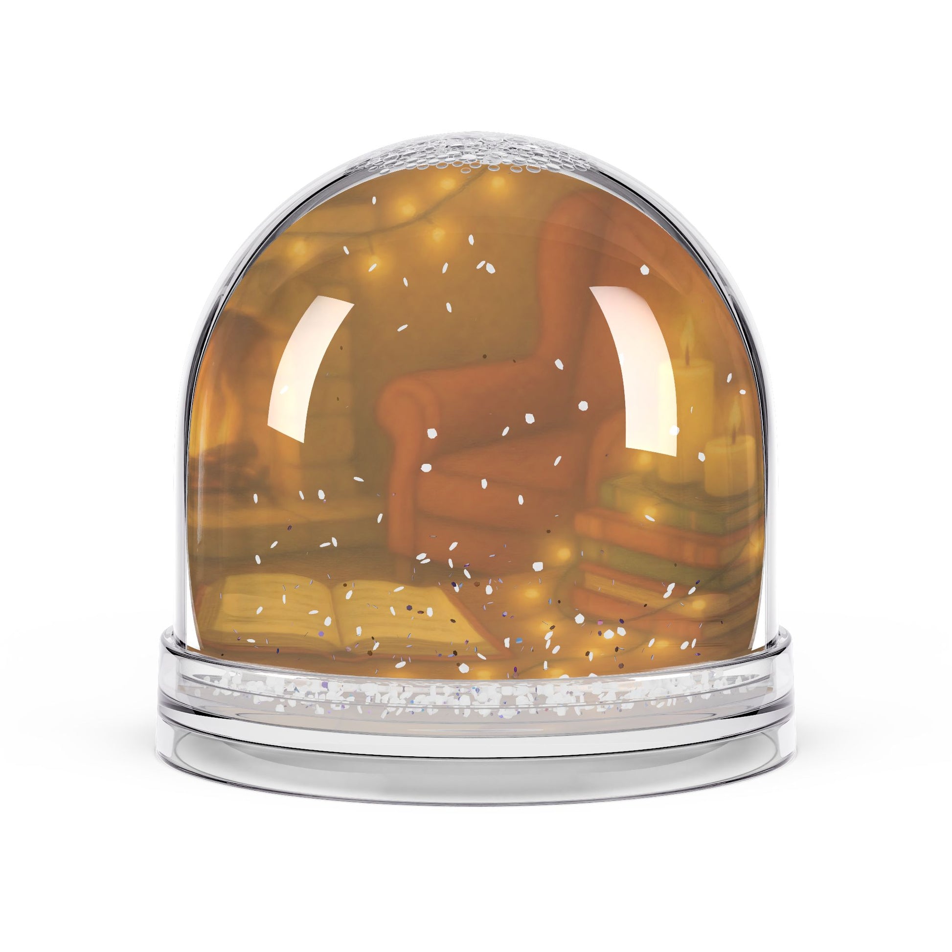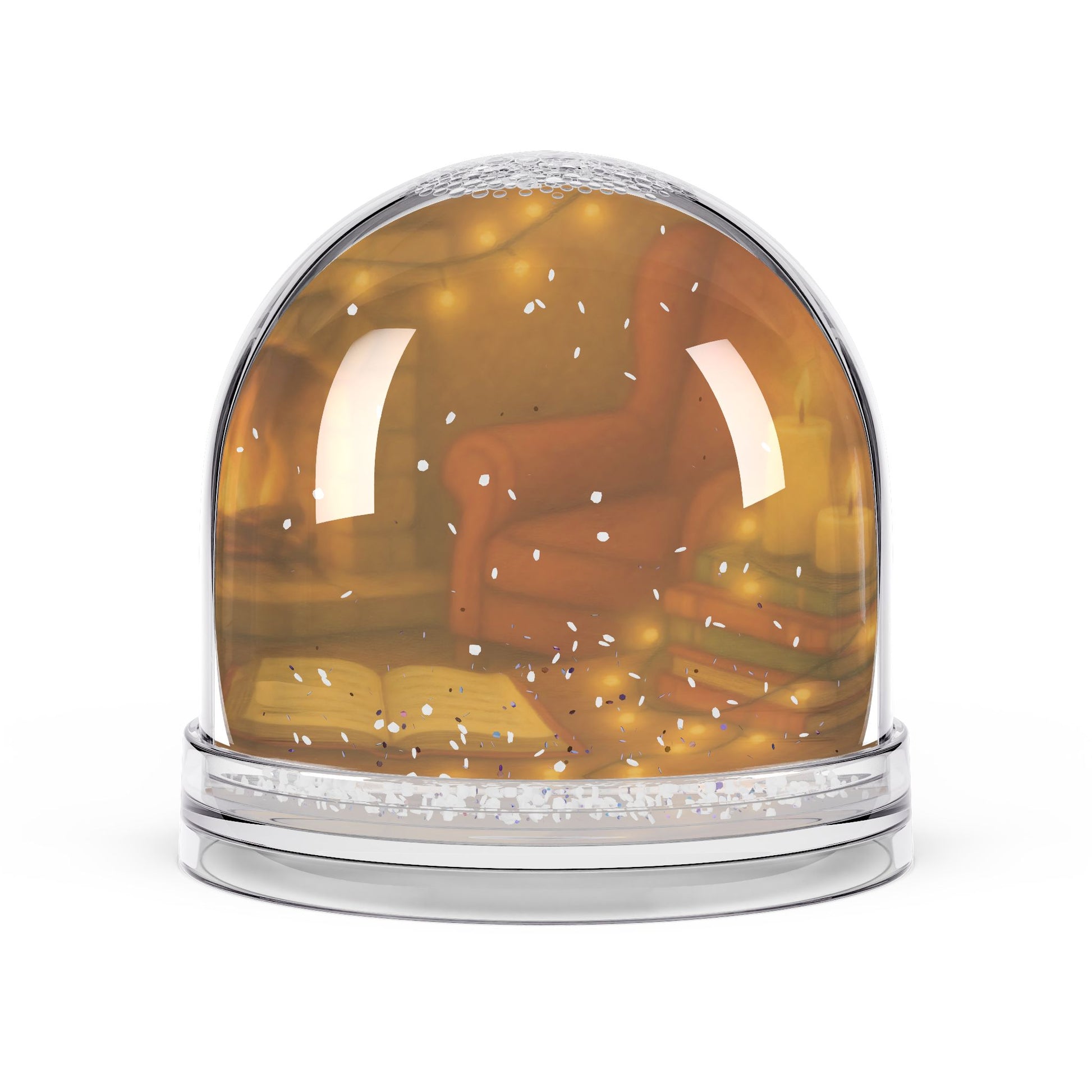 Featuring a glowing holiday scene with a plush armchair, stacks of books, twinkling string lights, and an inviting open book, this snow globe captures the peaceful essence of a quiet winter night indoors.