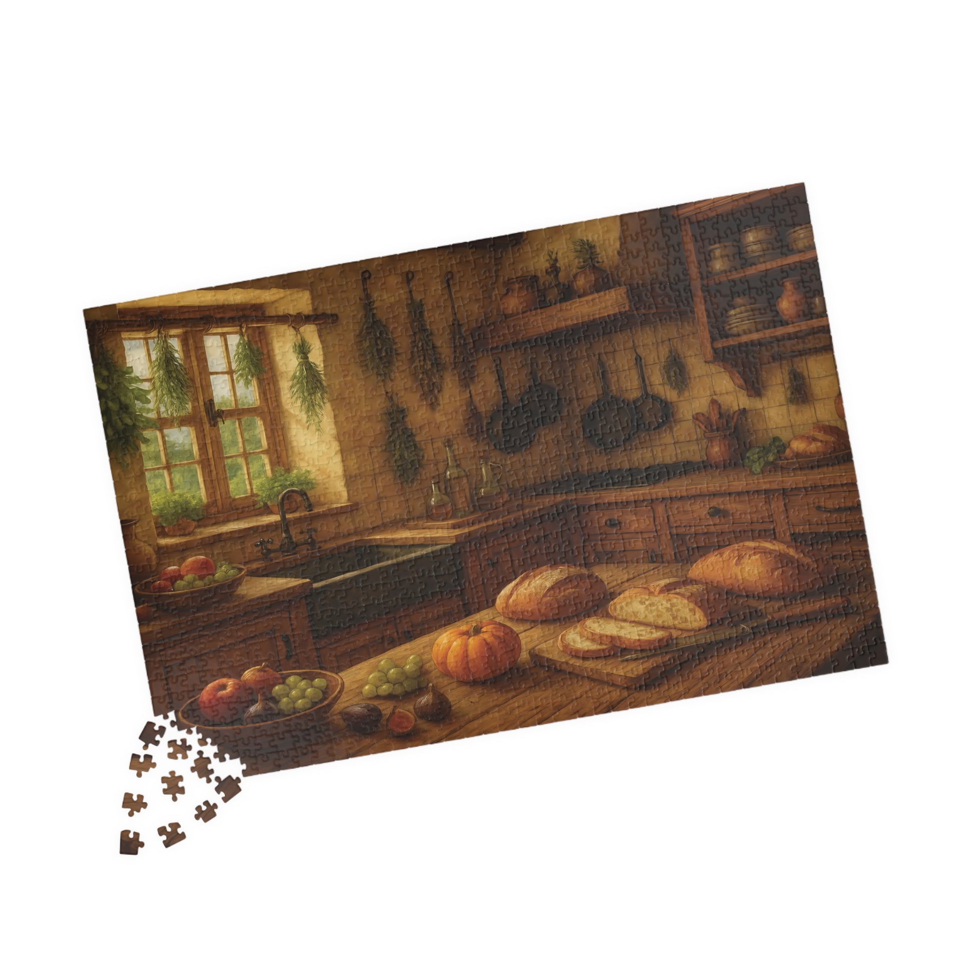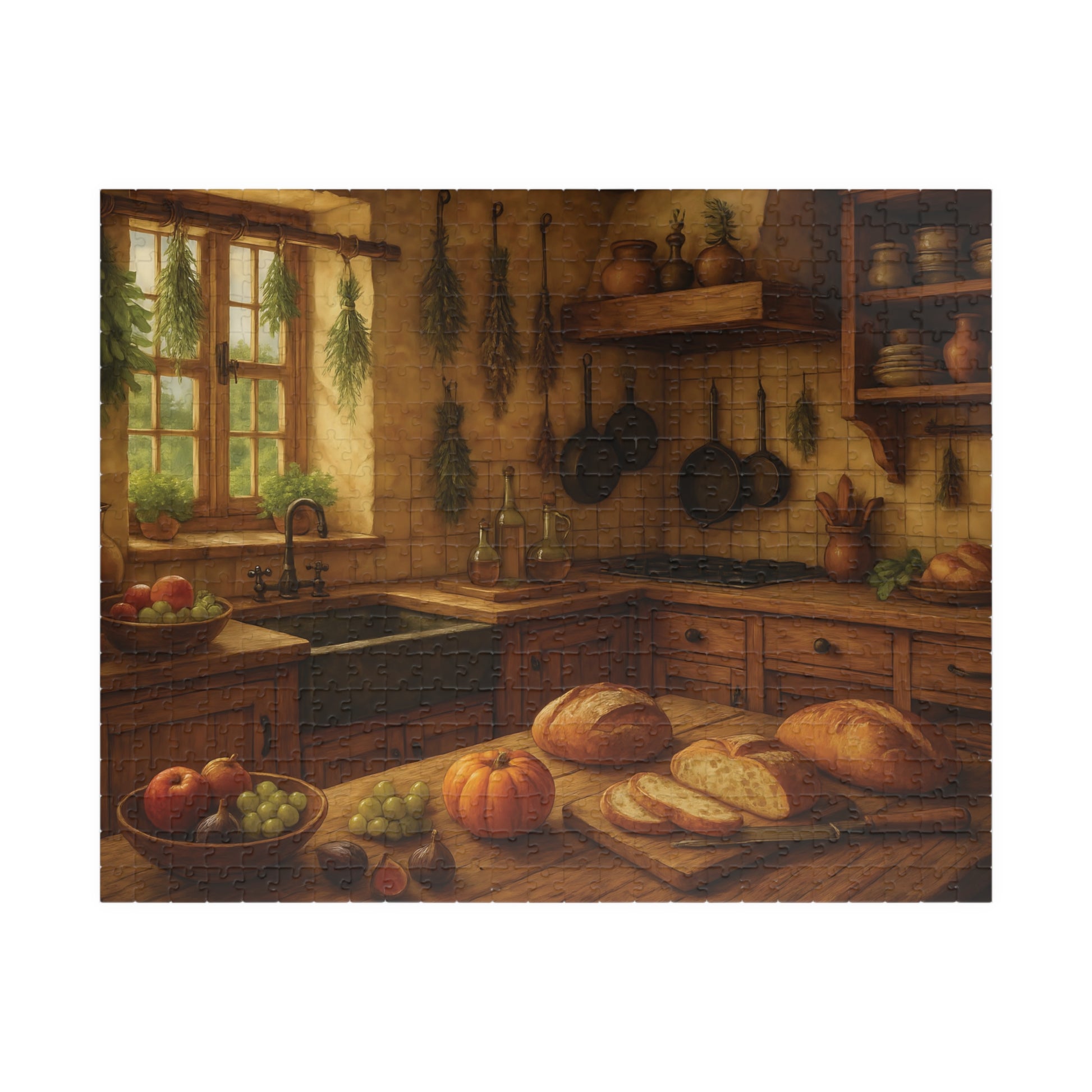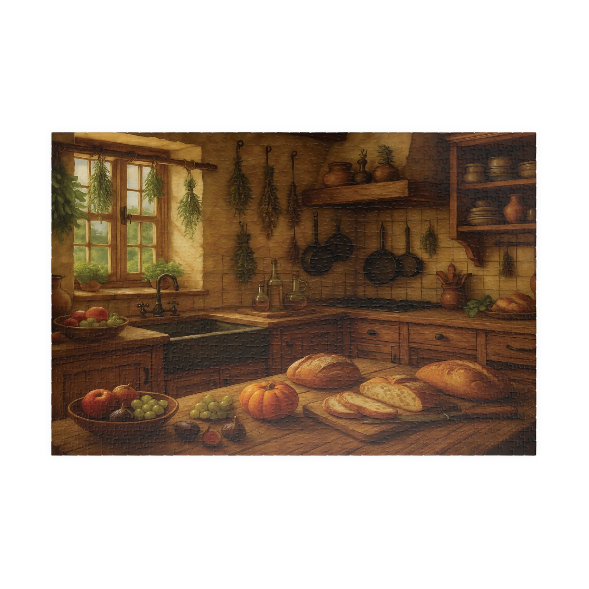 Featuring a beautifully detailed autumn harvest scene with fresh bread, pumpkins, fruits, and herbs drying by the window, this puzzle captures the charm and comfort of farmhouse living.