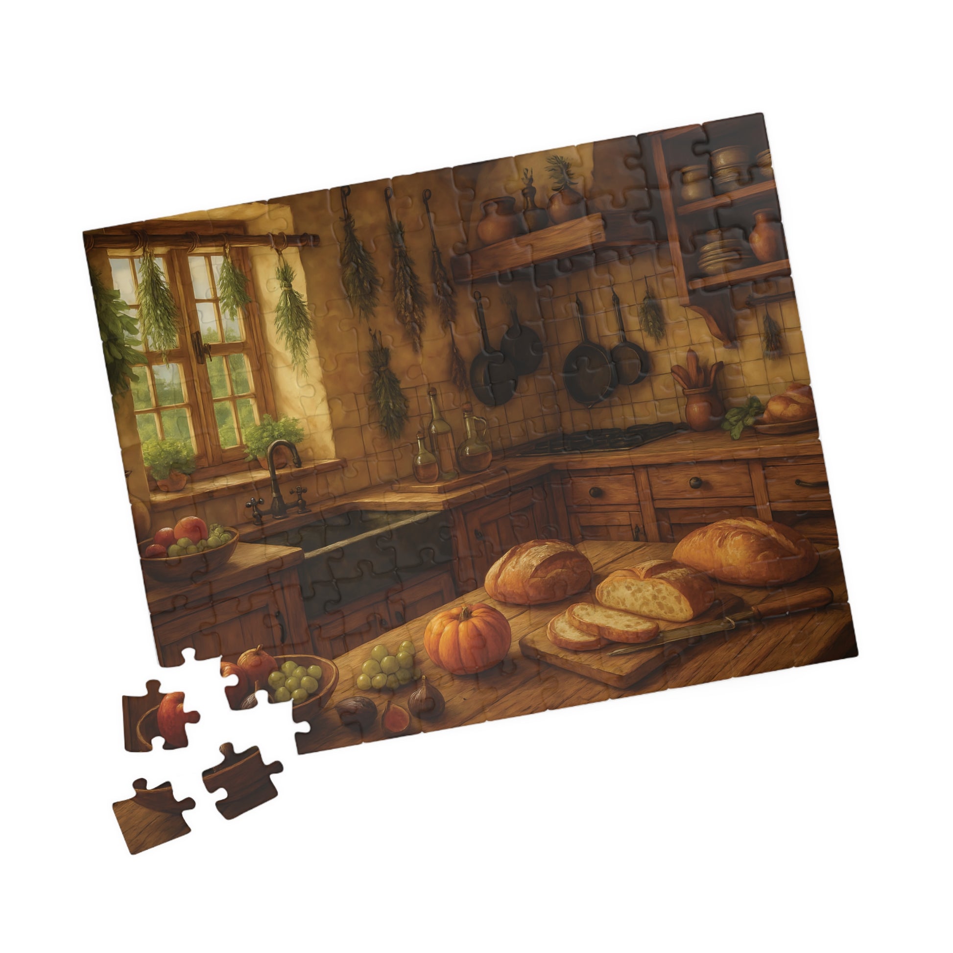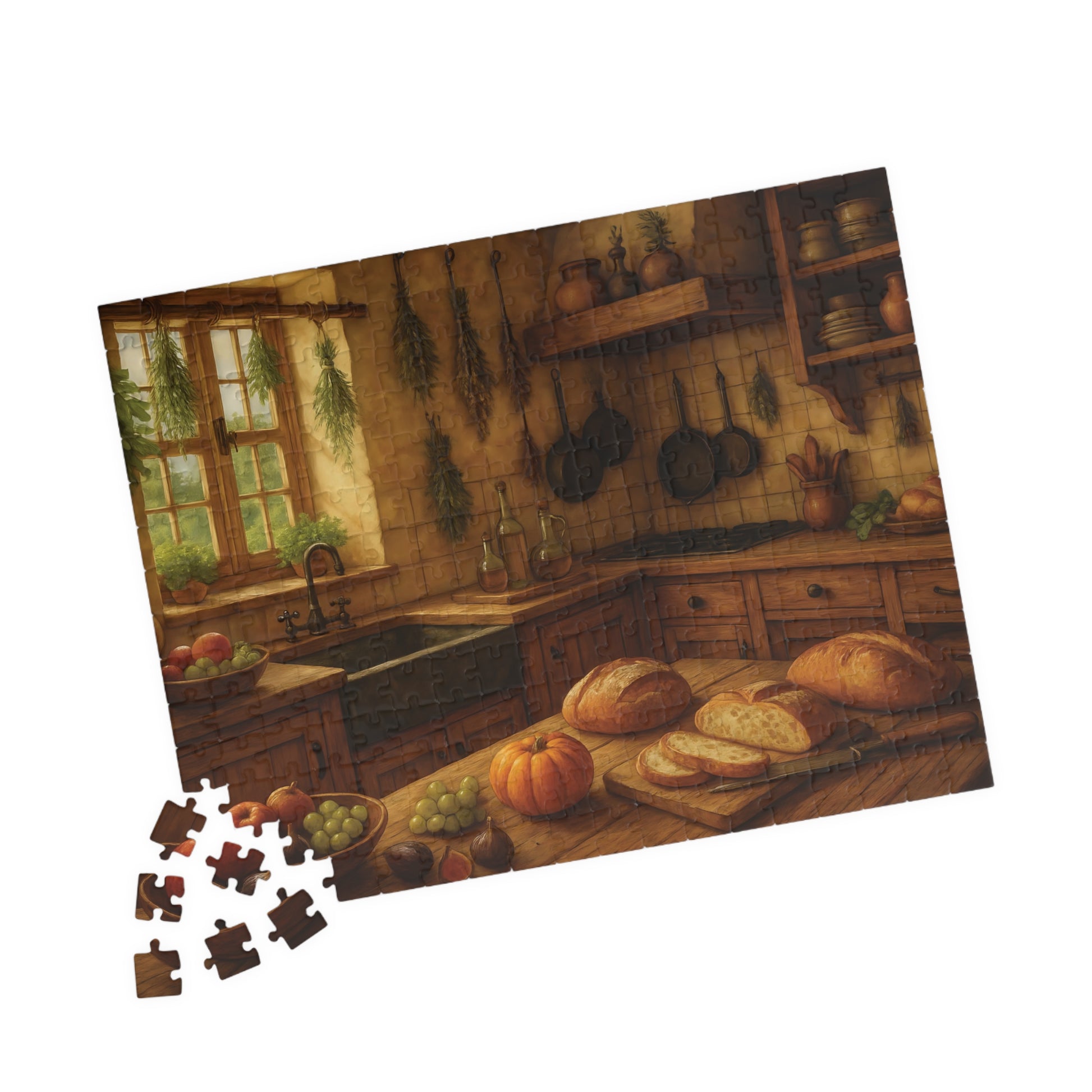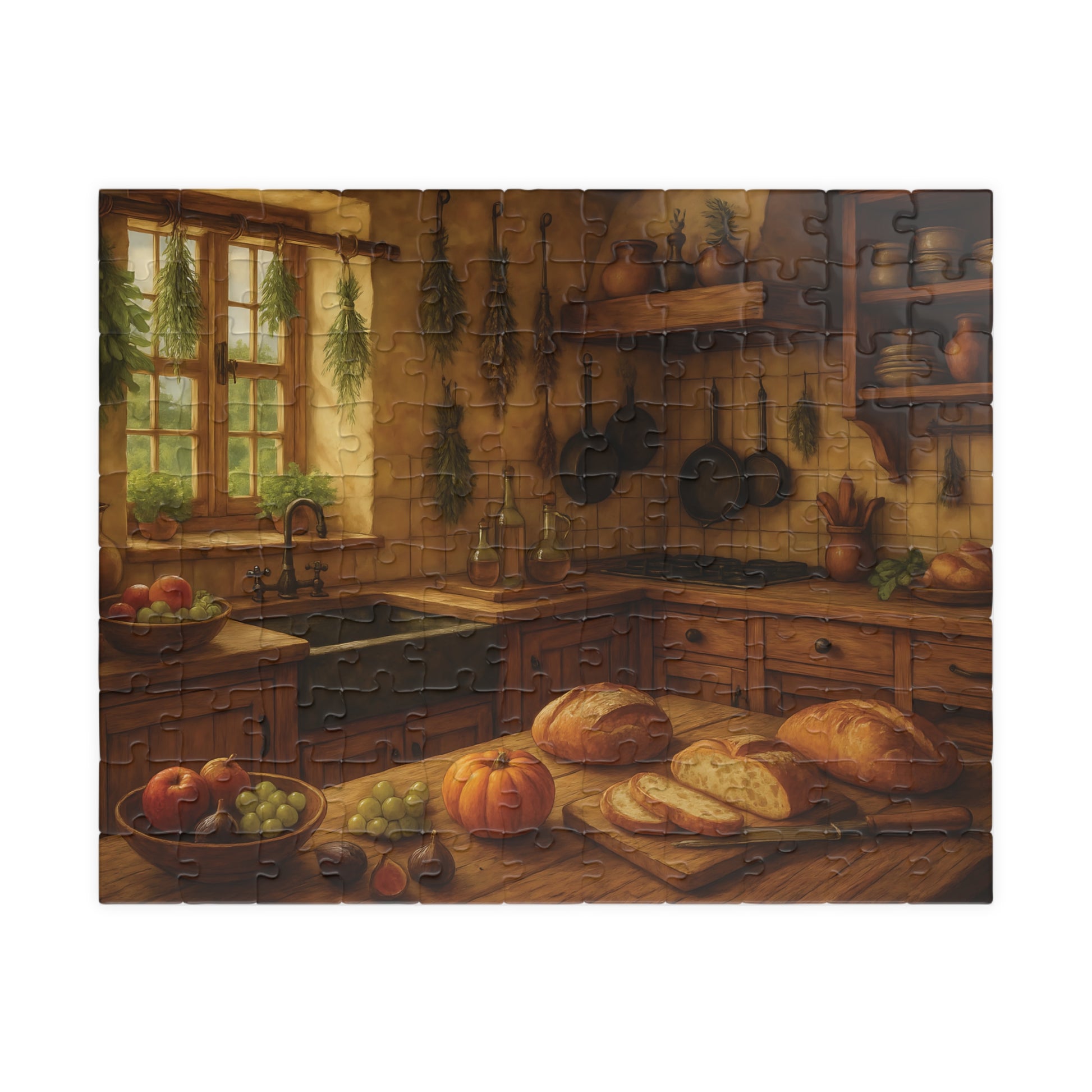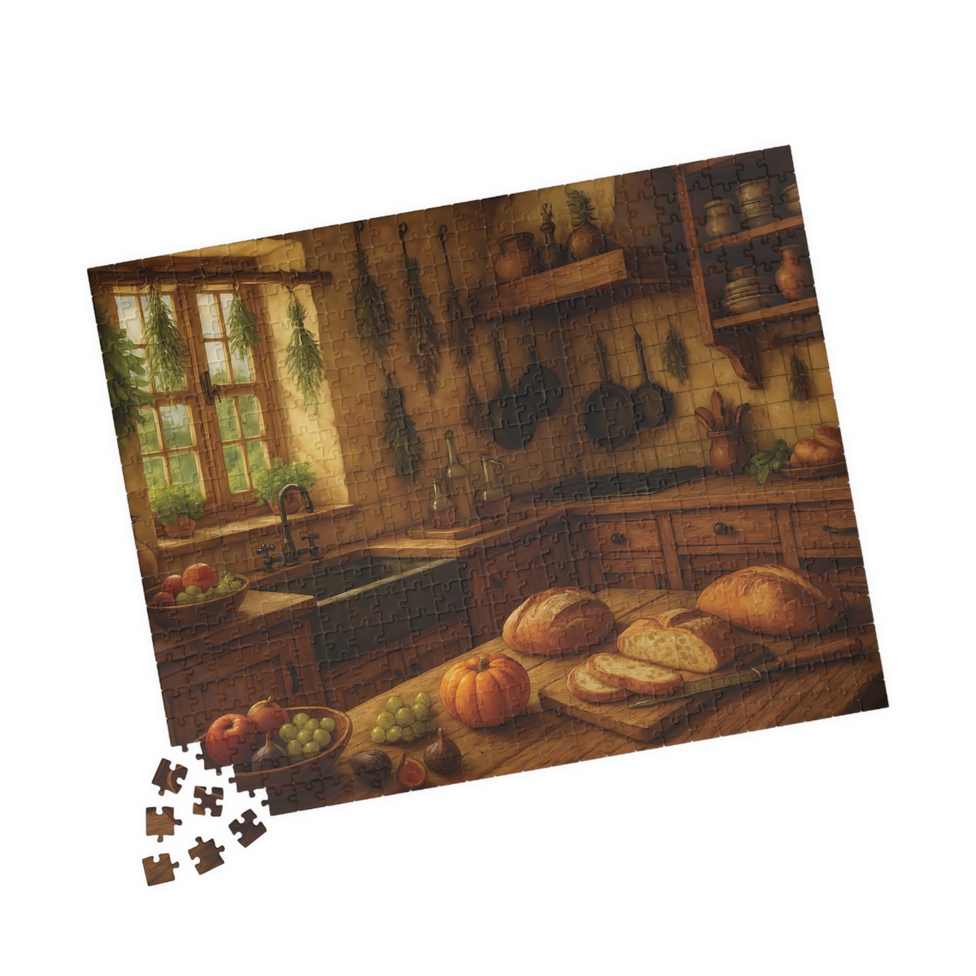 Featuring a beautifully detailed autumn harvest scene with fresh bread, pumpkins, fruits, and herbs drying by the window, this puzzle captures the charm and comfort of farmhouse living.