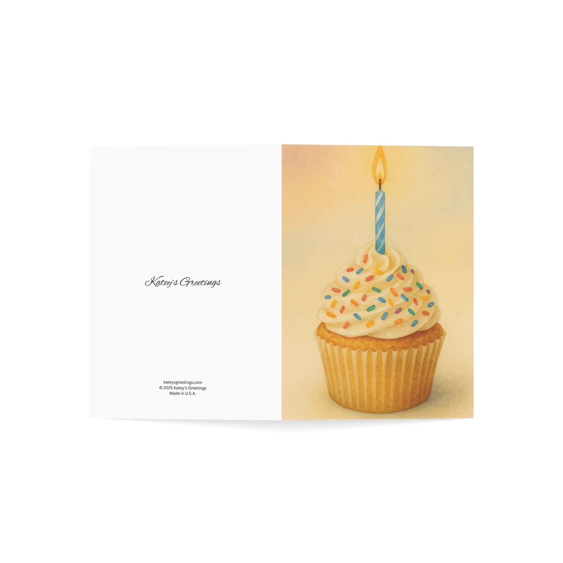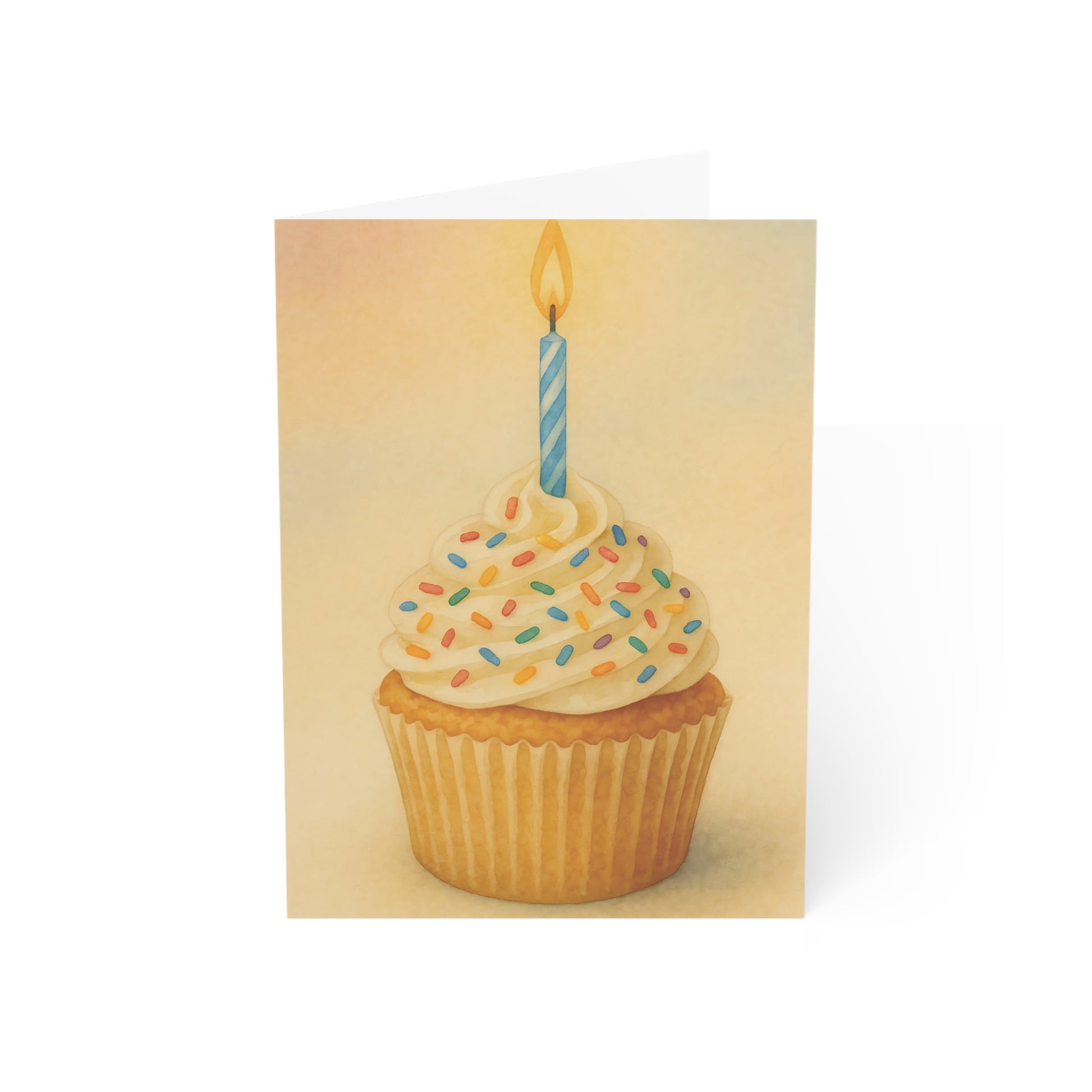 Sweeten their special day with this Cupcake Celebration Birthday Greeting Card, featuring a charming illustration of a golden cupcake topped with creamy frosting, colorful sprinkles, and a single lit candle.