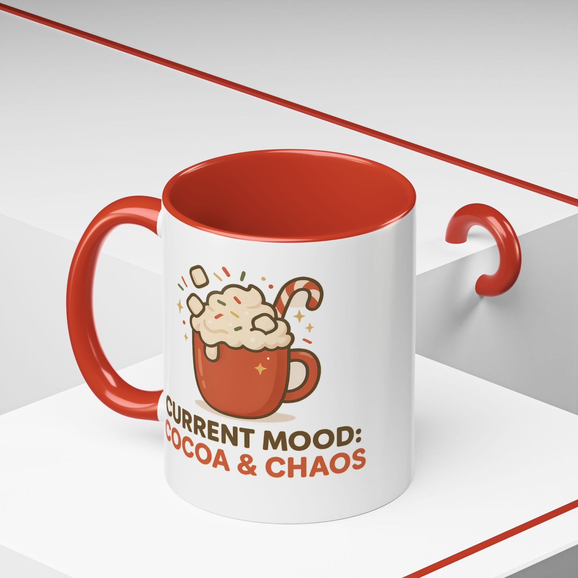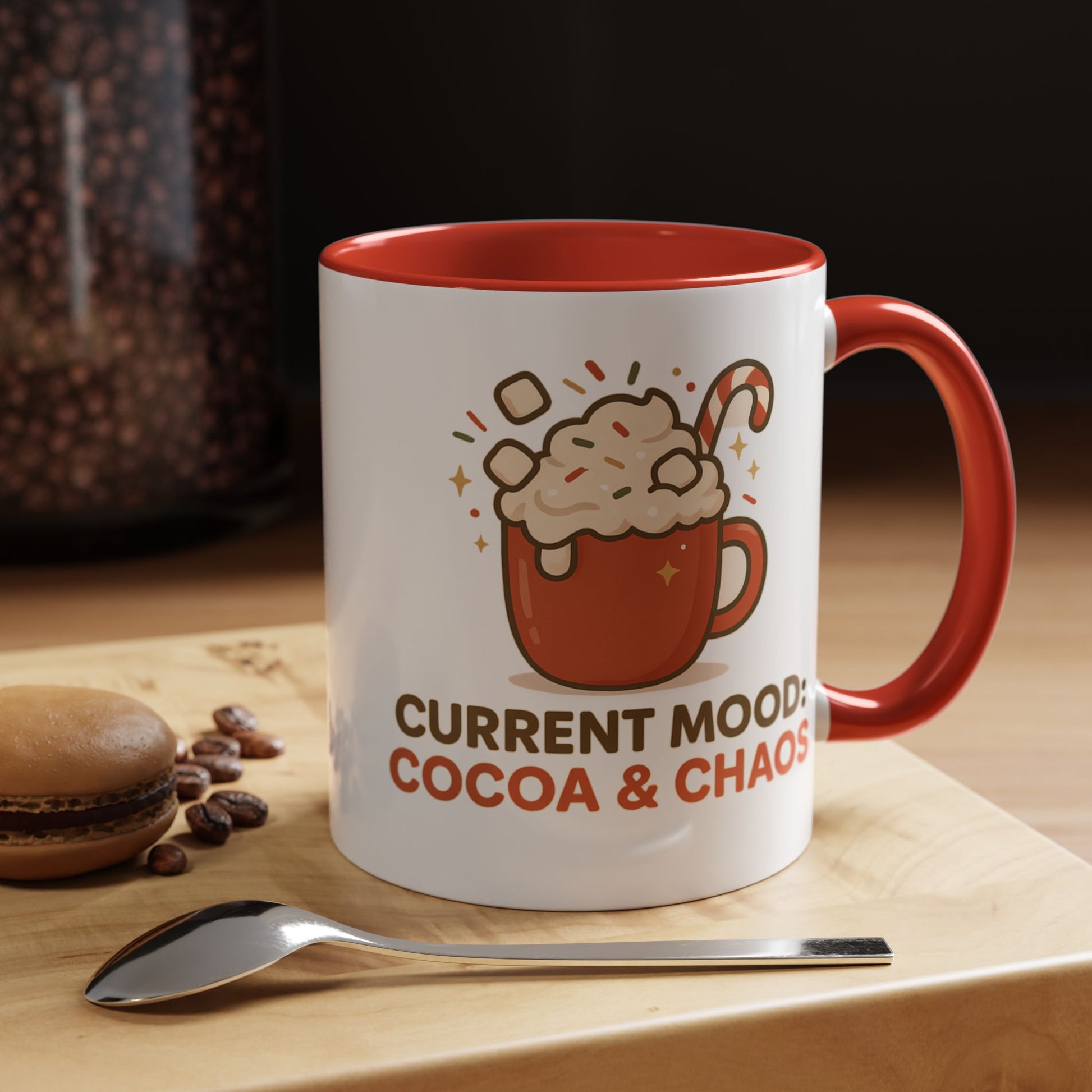 Bring a burst of holiday cheer (and a dash of chaos) to your mornings with this “Current Mood: Cocoa & Chaos” mug!