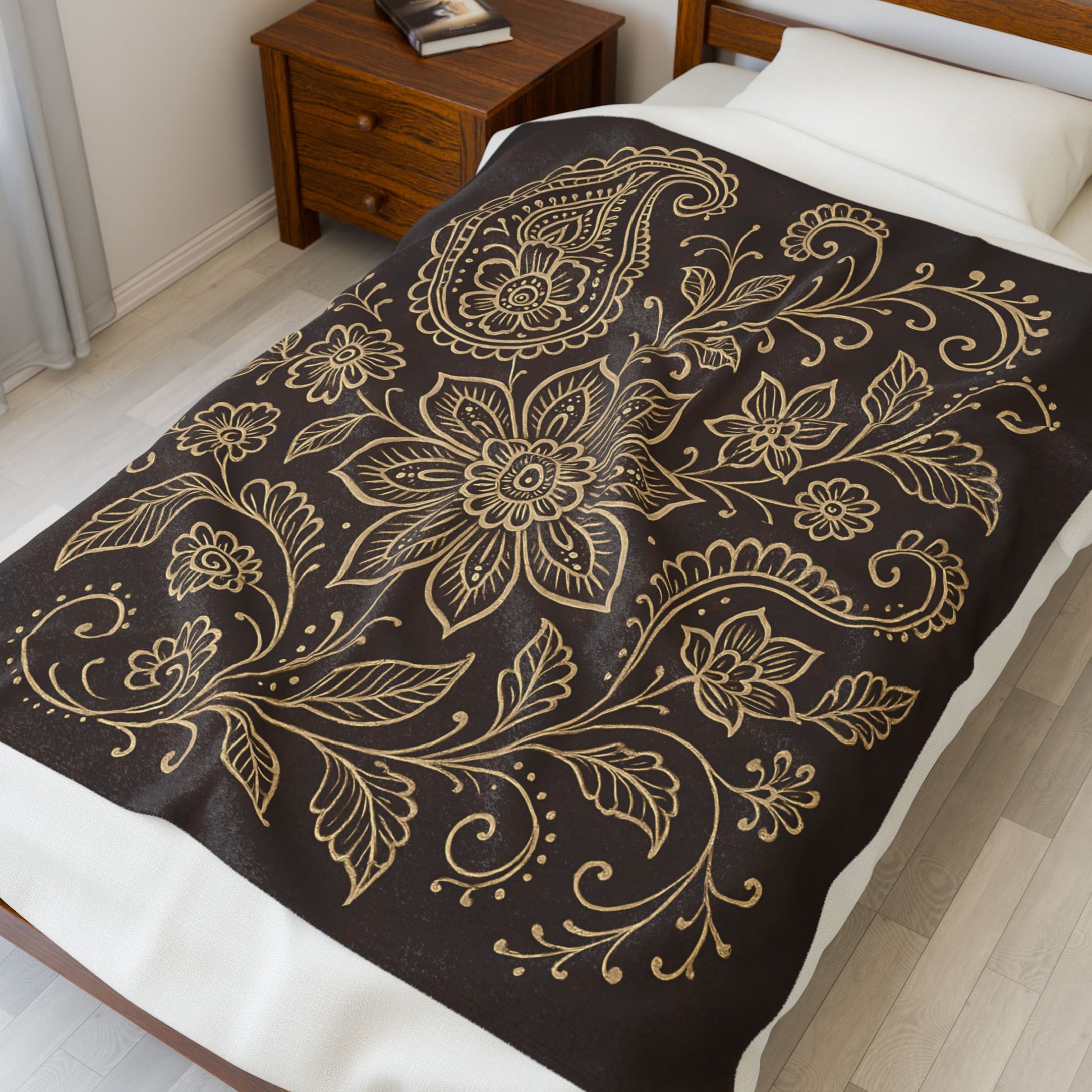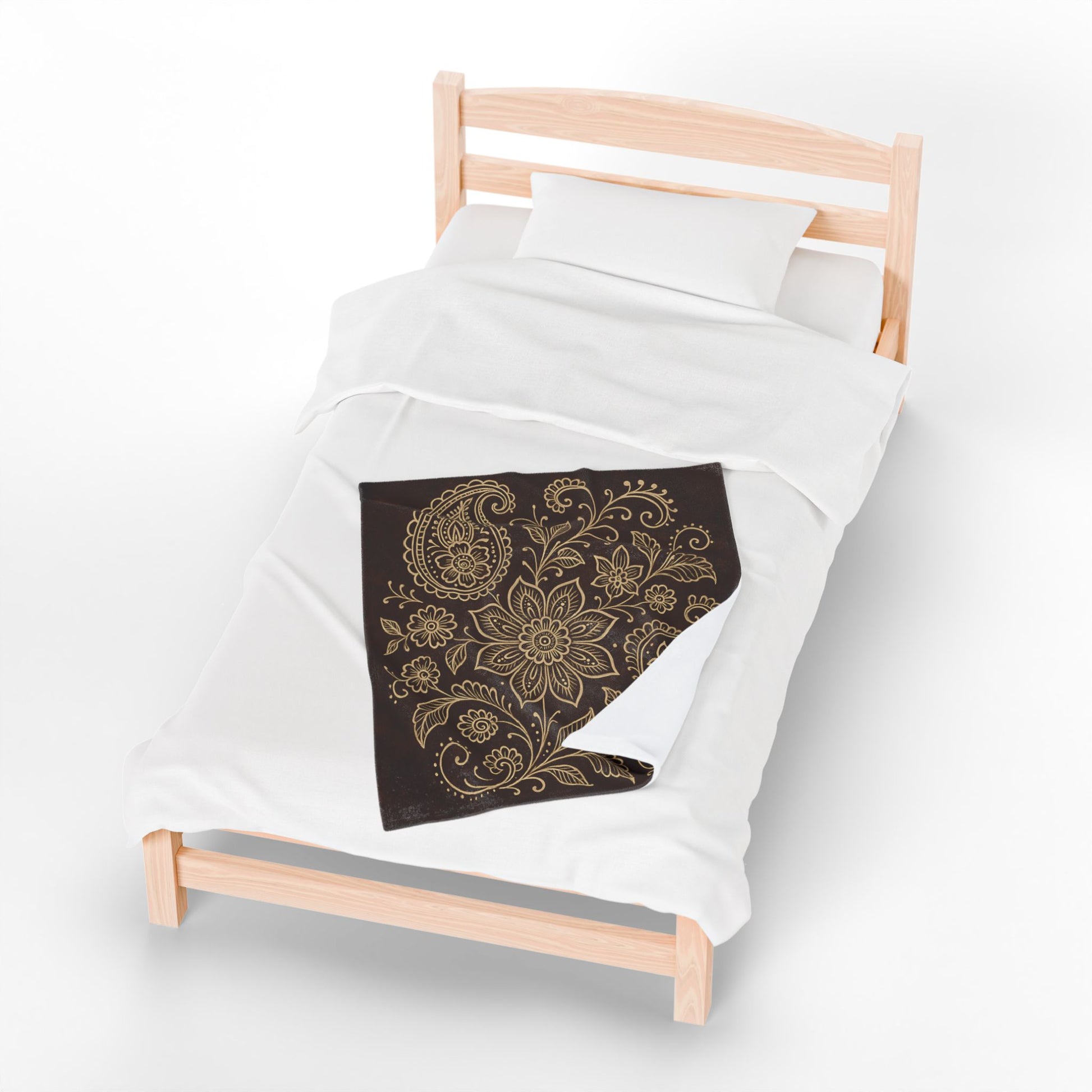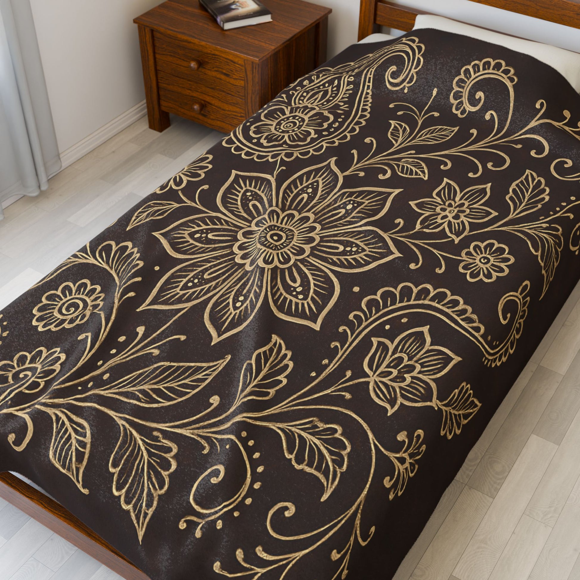 Elegant Boho Floral Paisley Velveteen Plush Blanket – Dark Brown & Cream.