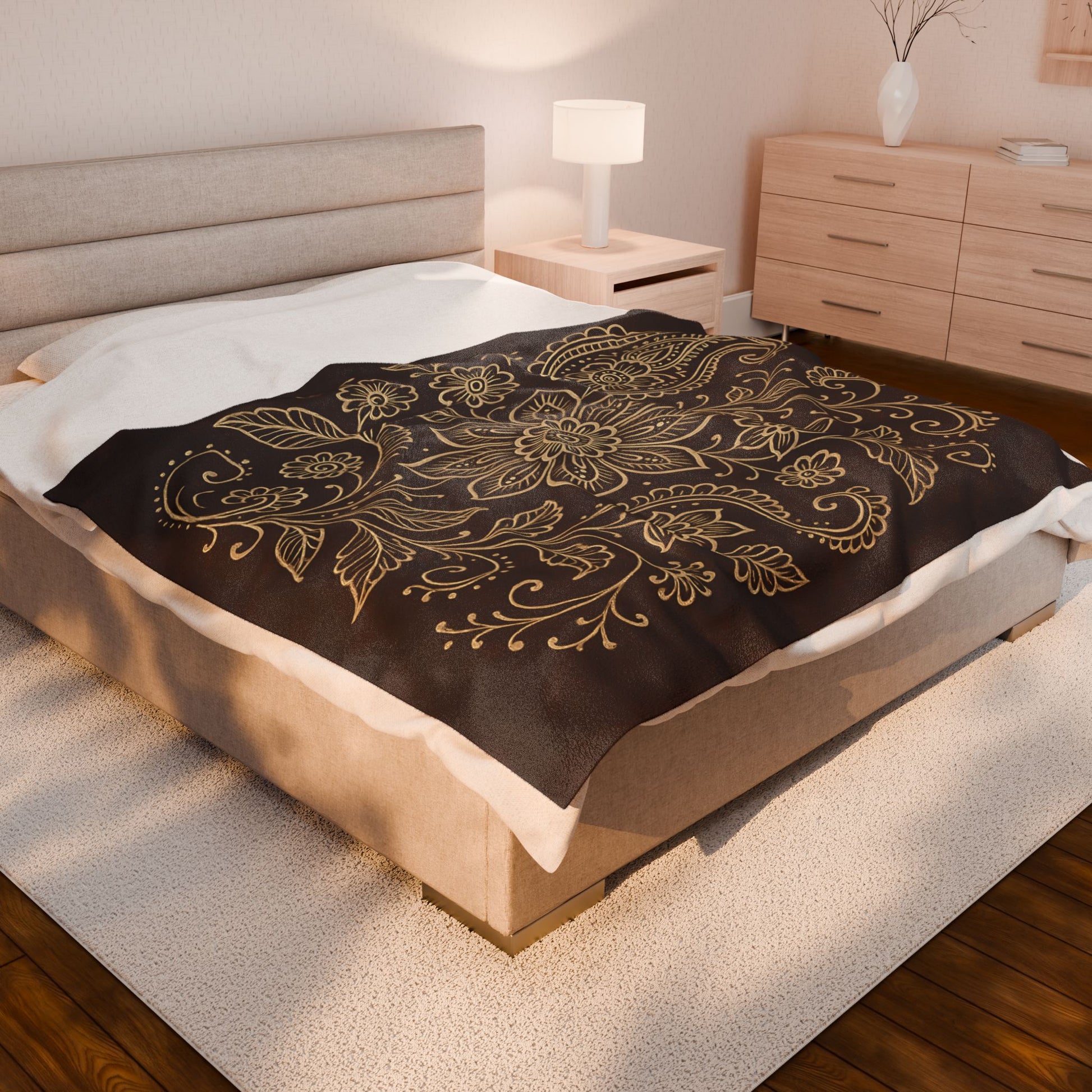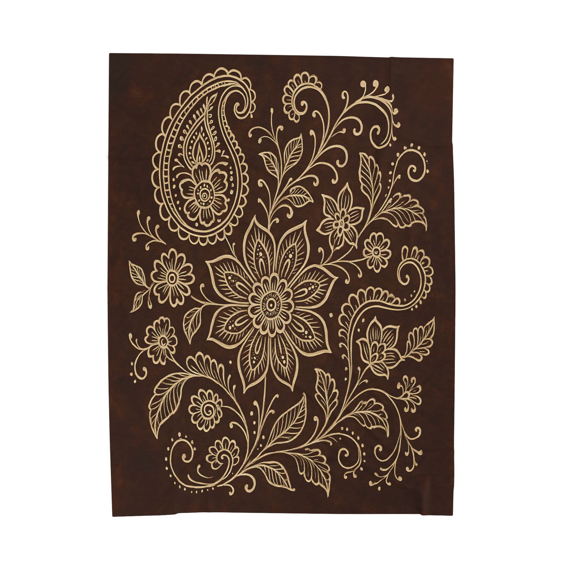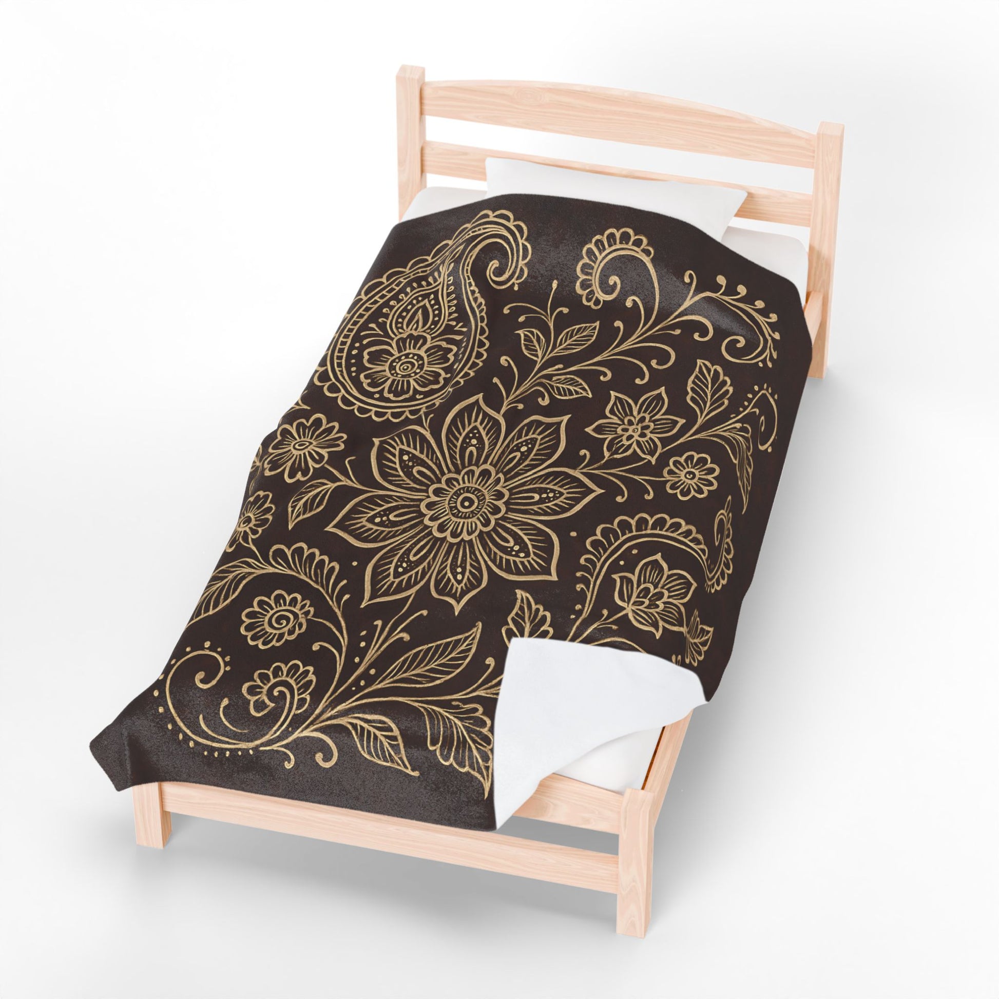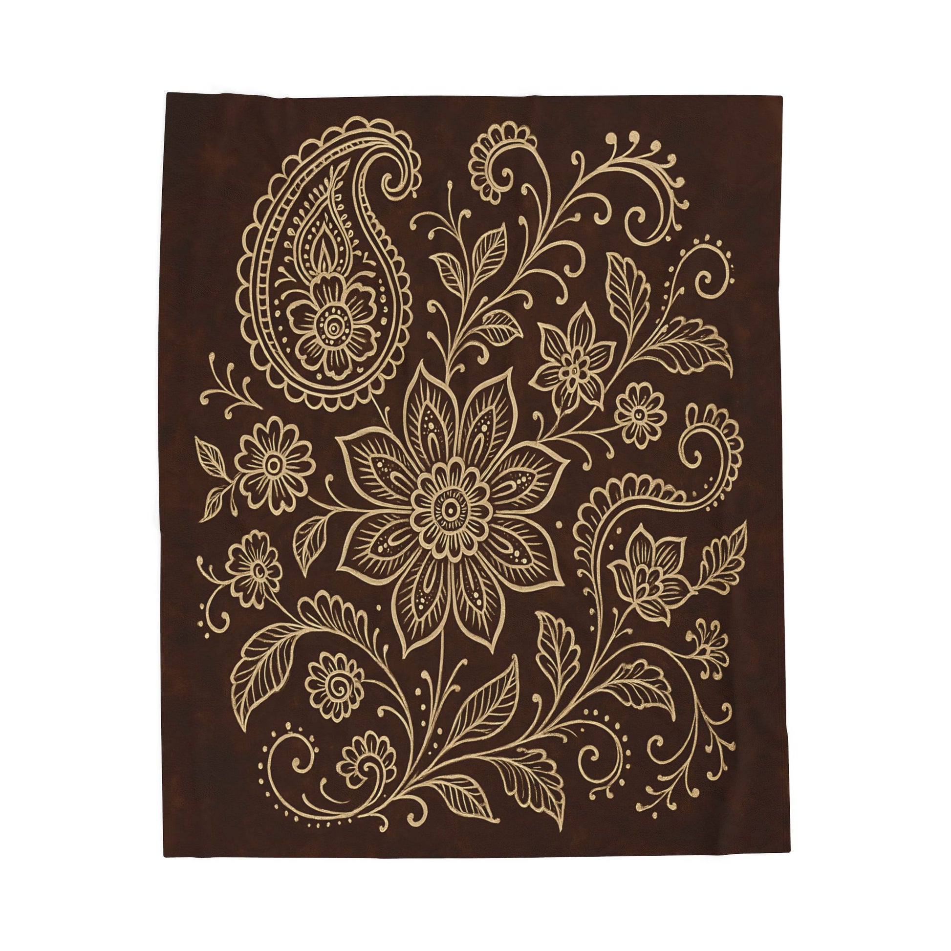 Elegant Boho Floral Paisley Velveteen Plush Blanket – Dark Brown & Cream.