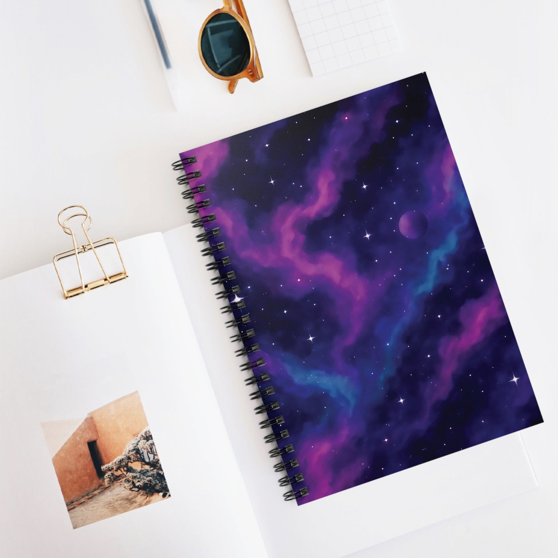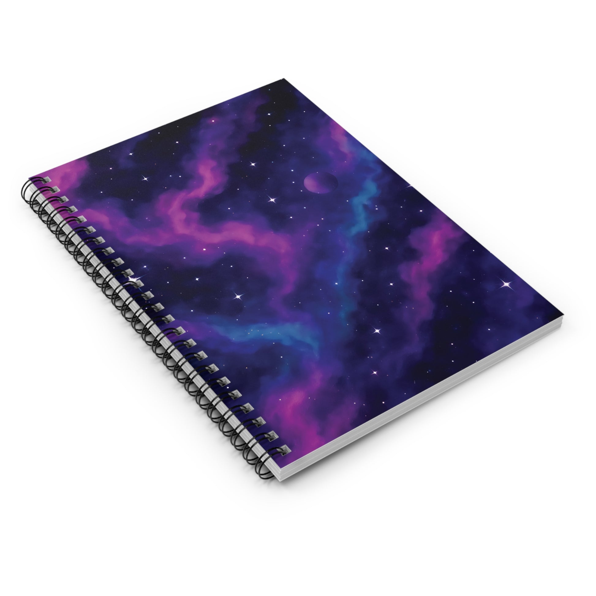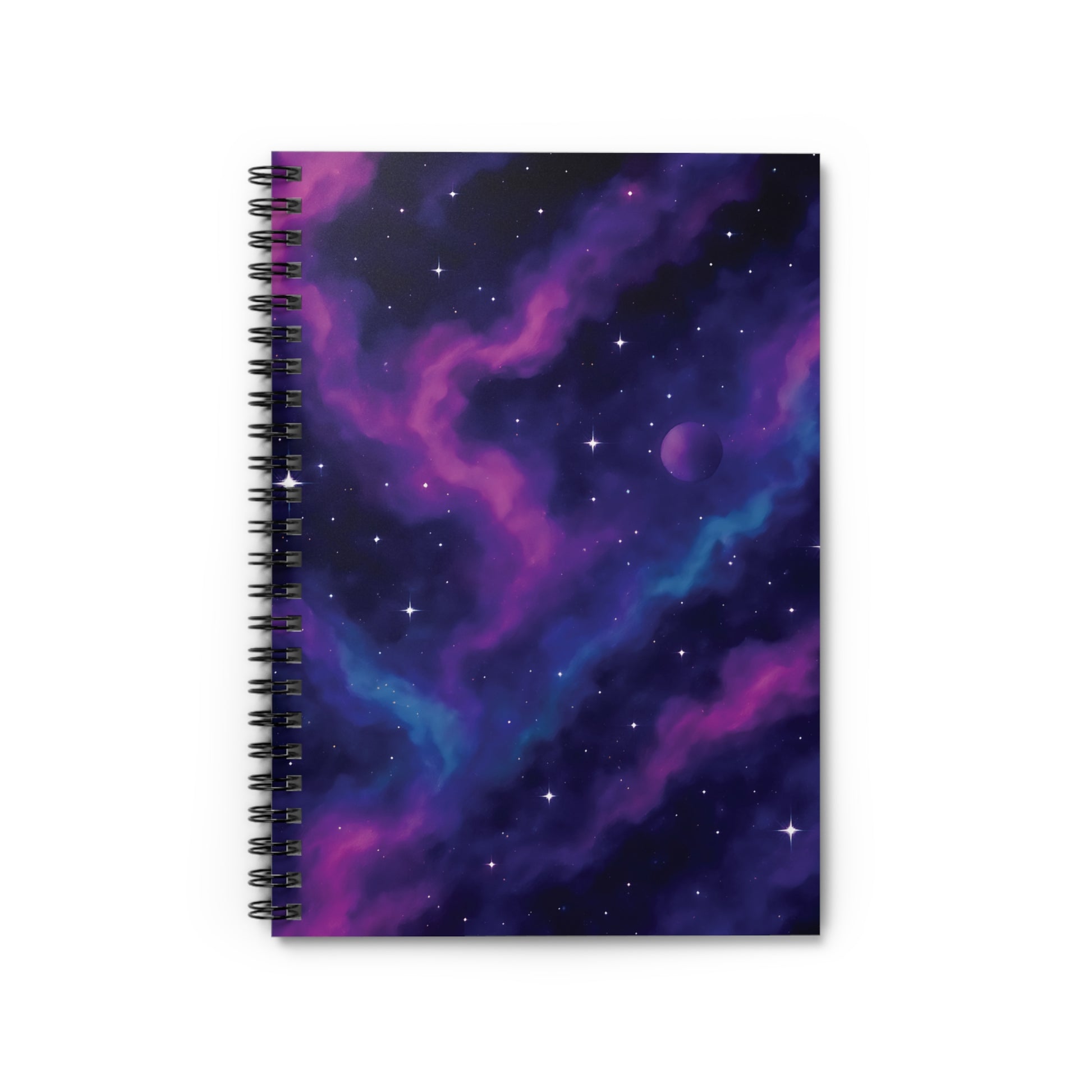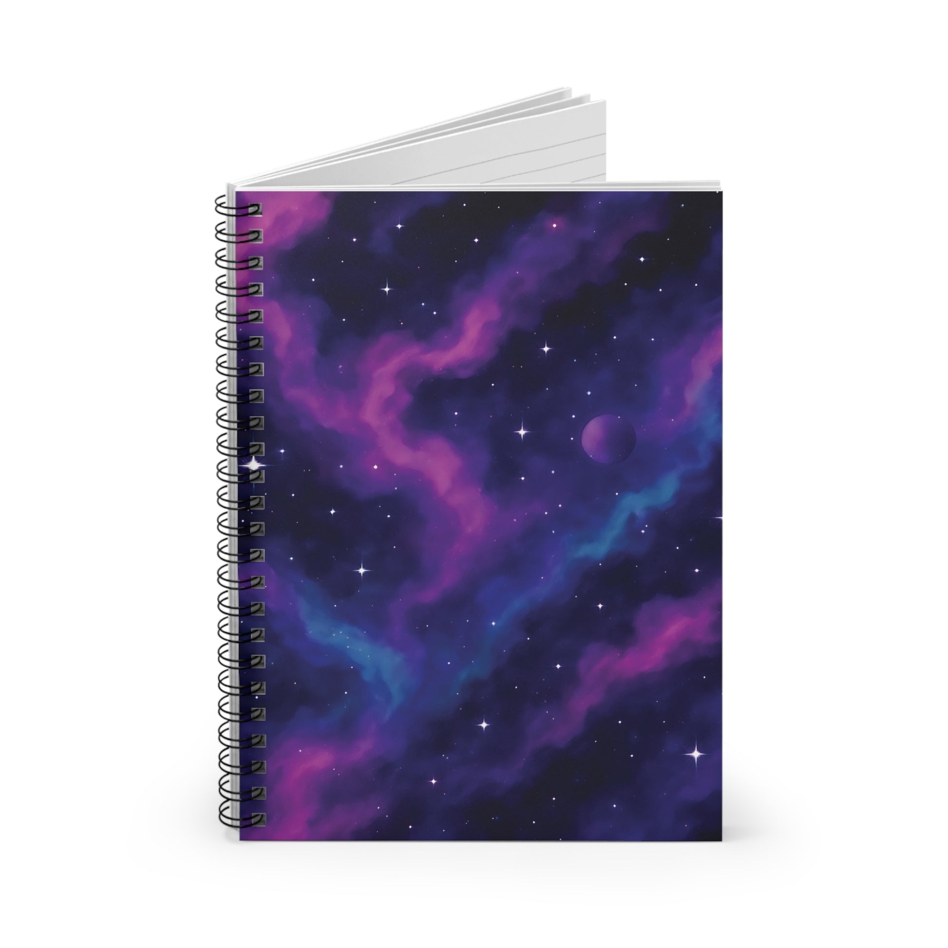 This cosmic-inspired notebook features a vibrant purple and blue nebula with twinkling stars and a distant planet, making it the perfect space-themed companion for journaling, note-taking, or creative planning.