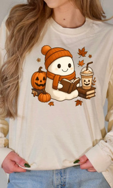 Cozy up to spooky season with the Ghost Books Long Sleeve Graphic Tee — a charming autumn essential featuring an adorable ghost reading among pumpkins, falling leaves, and a festive drink.