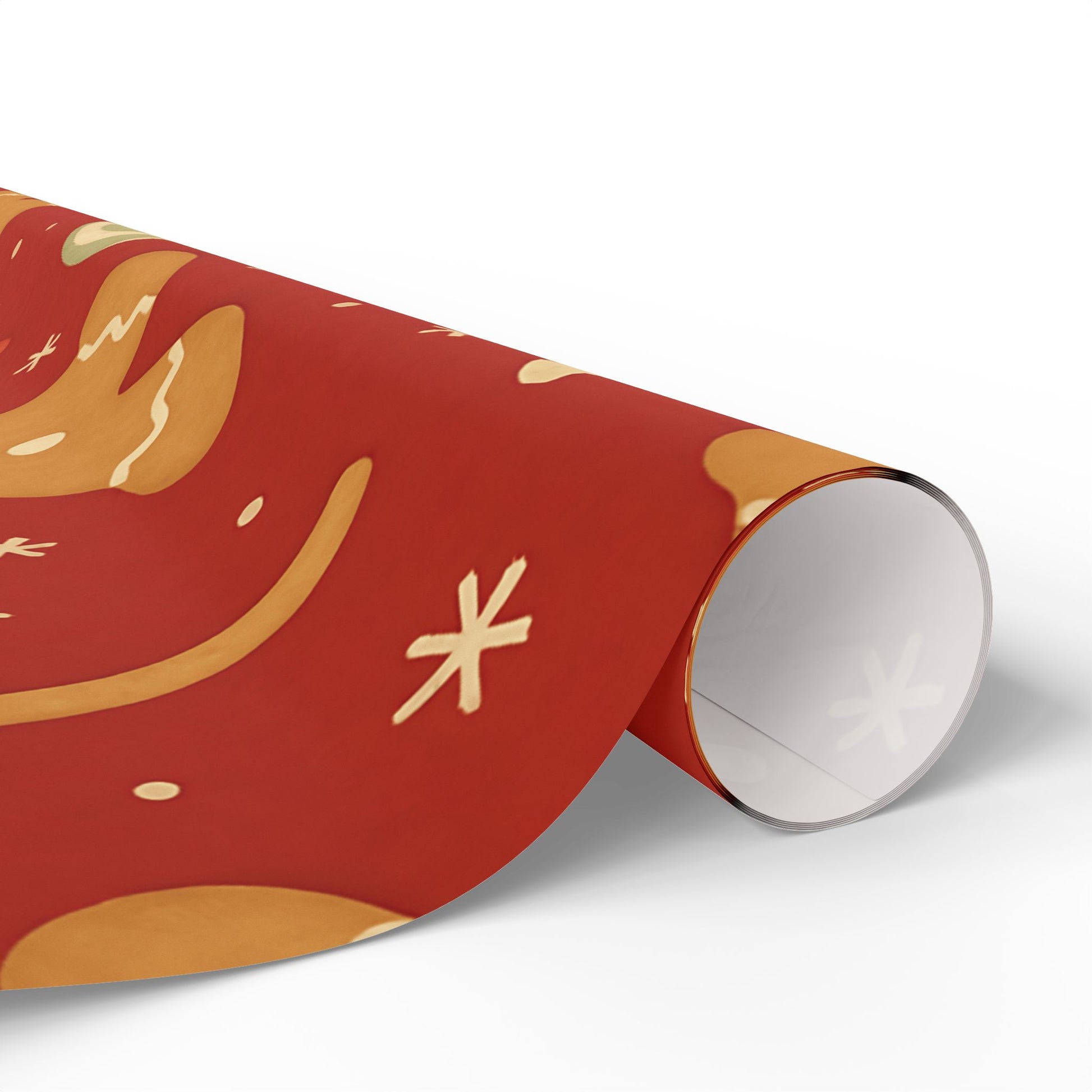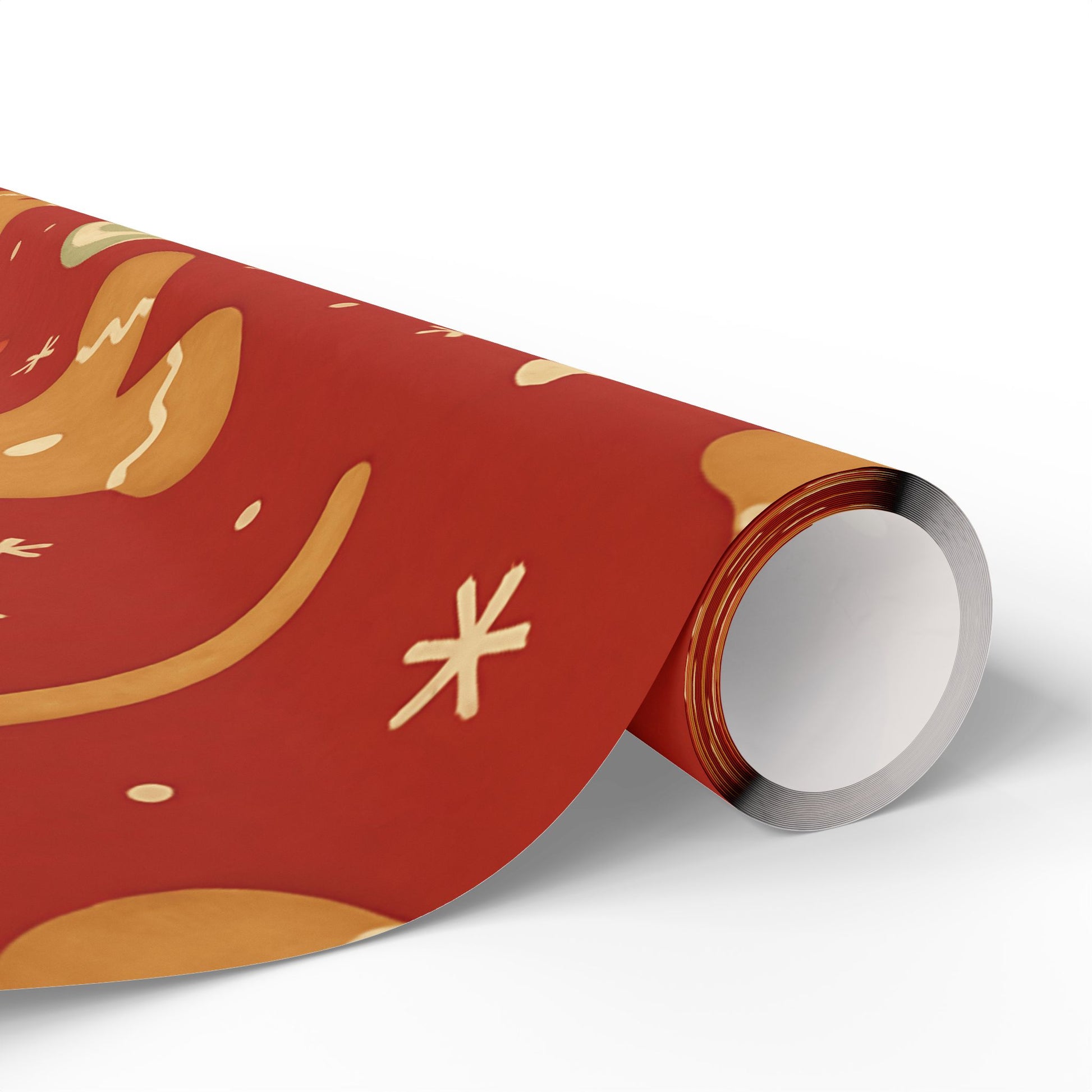 Add a sprinkle of holiday cheer to your gifts with this Gingerbread Christmas Wrapping Paper, featuring adorable gingerbread cookies, candy canes, gumdrops, whipped cream swirls, and snowflakes all set against a bold festive red background.