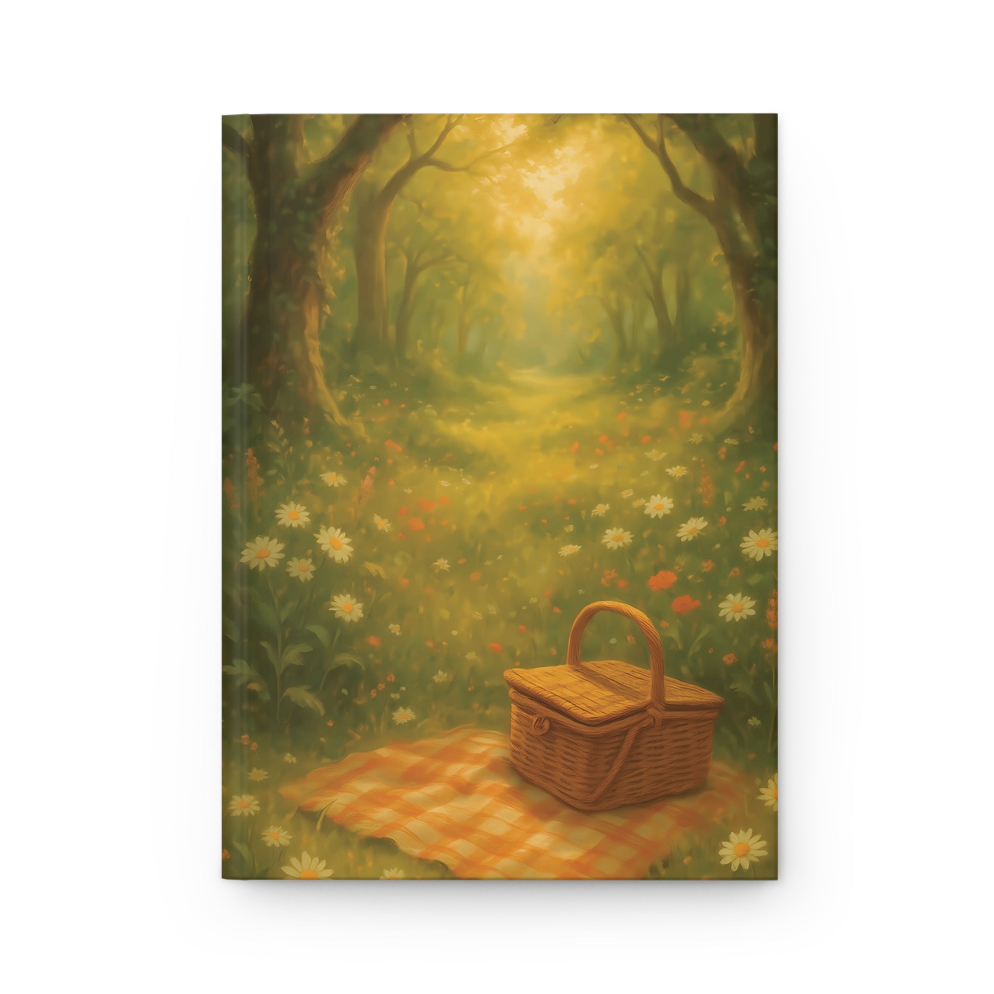 Featuring a beautifully illustrated scene of a woven picnic basket resting on a gingham blanket in a glowing wildflower meadow, this journal is a dreamy companion for note-taking, journaling, planning, or sketching.