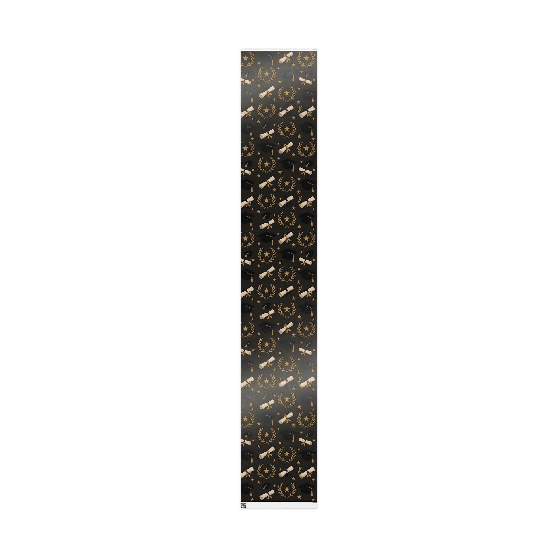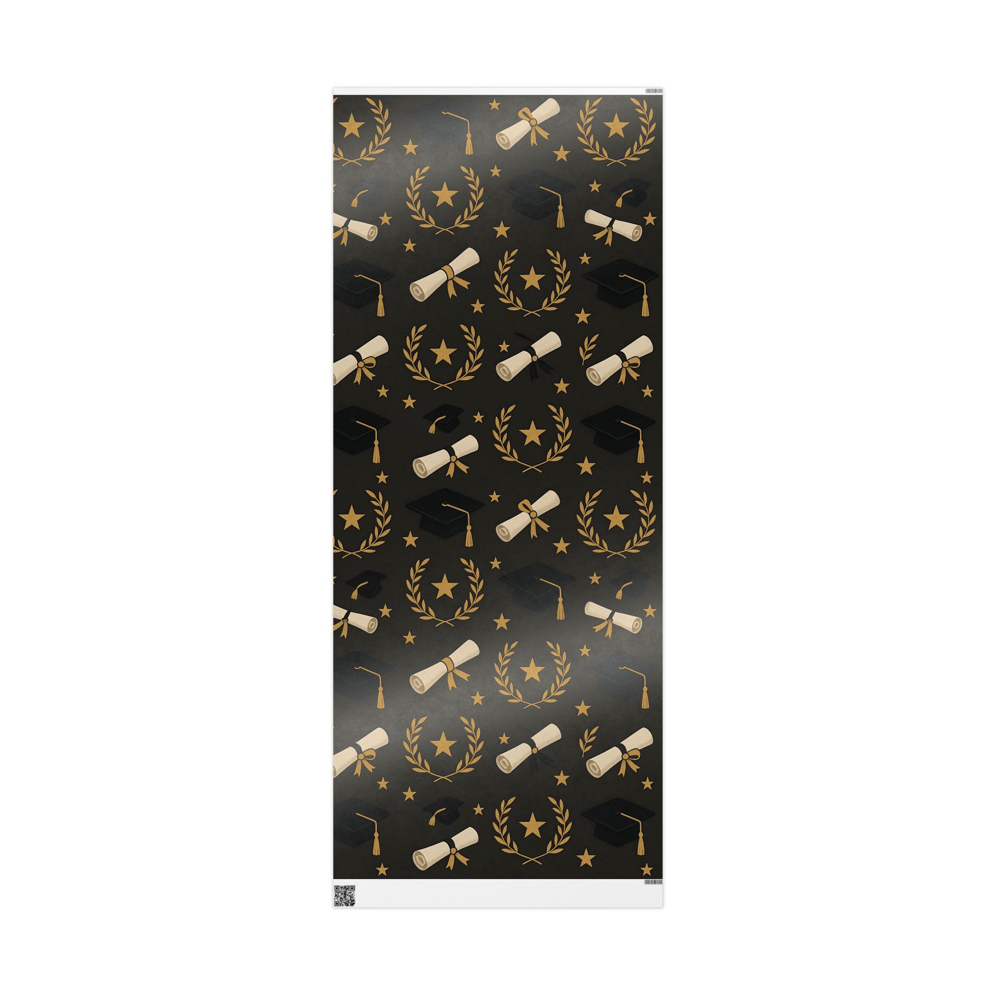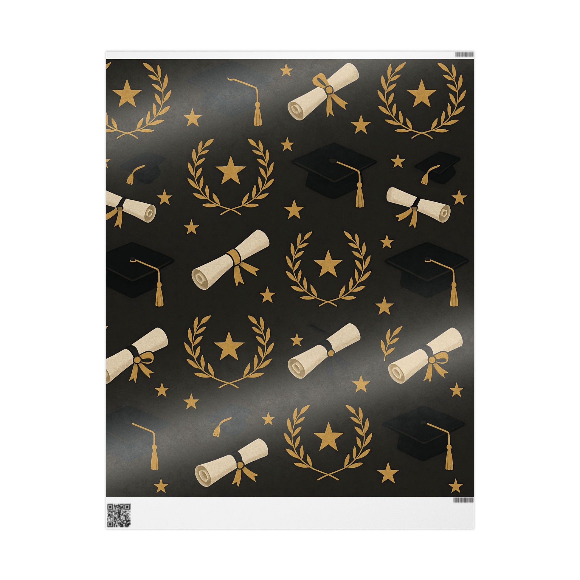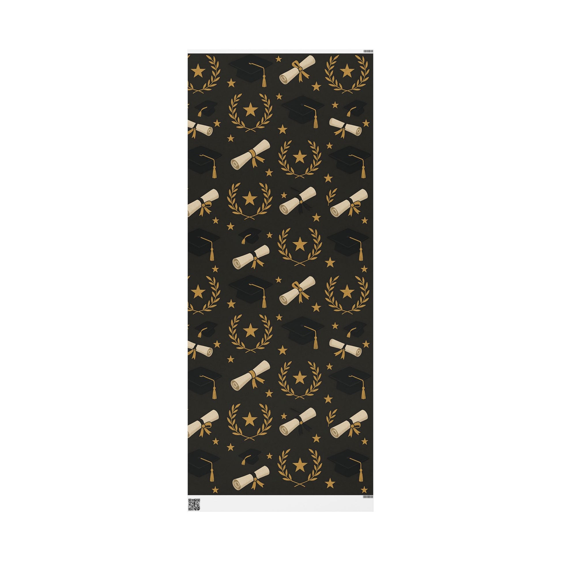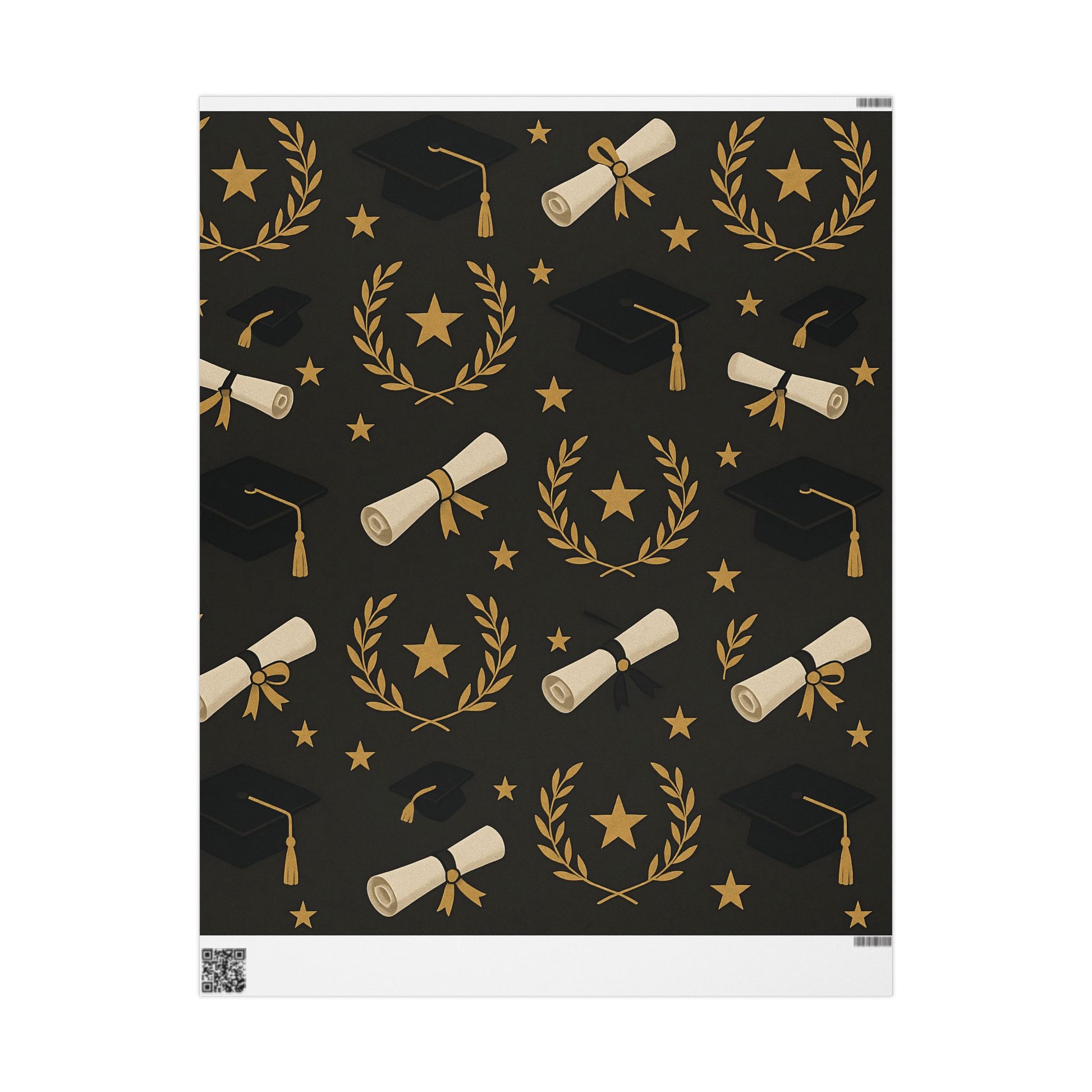 Honor your graduate’s milestone with this Graduation Celebration Wrapping Paper, featuring a sophisticated black backdrop adorned with gold laurel wreaths, diplomas, stars, and graduation caps.