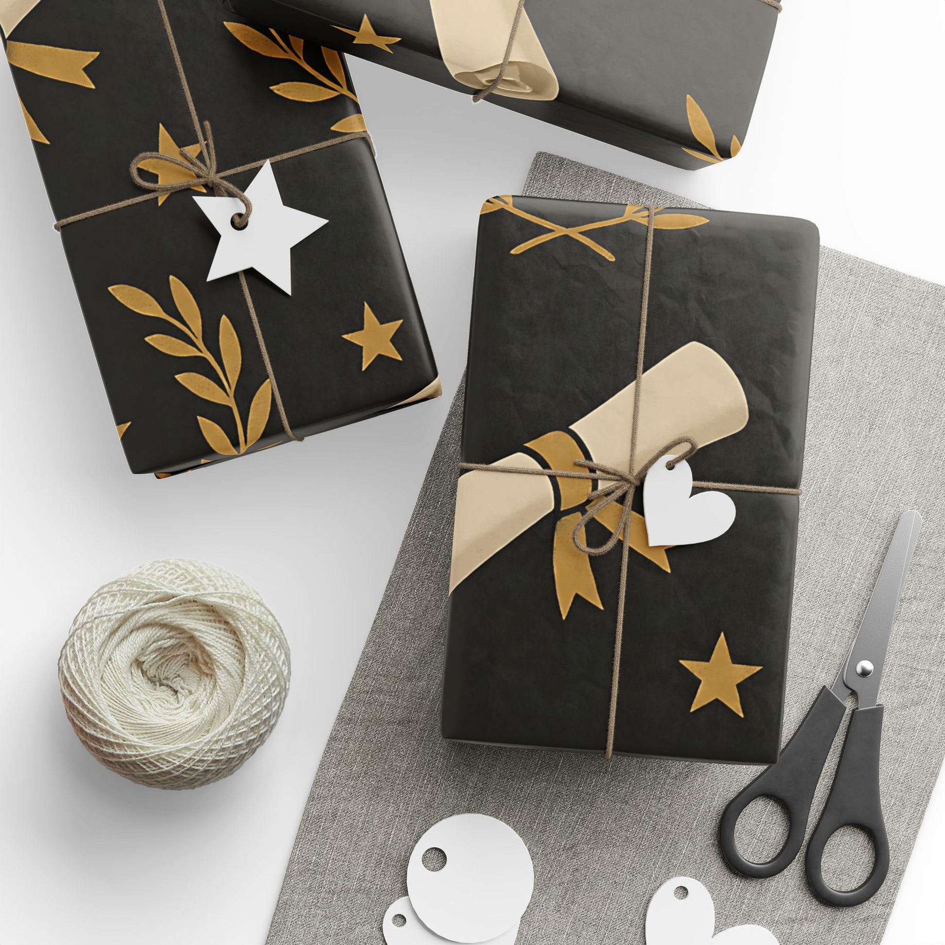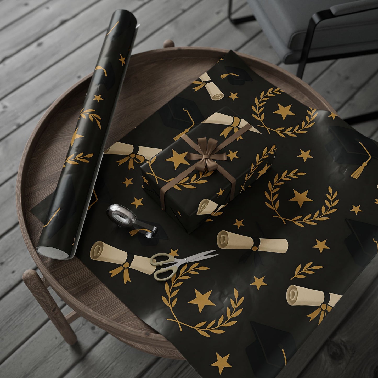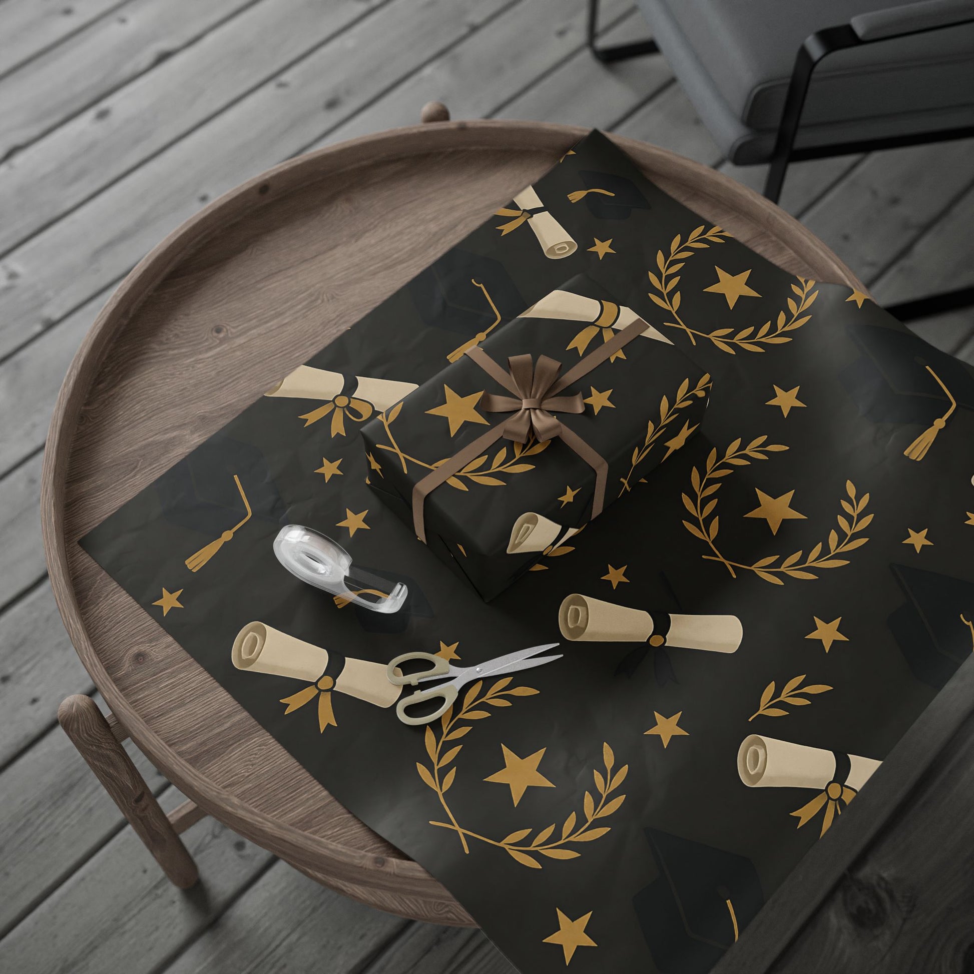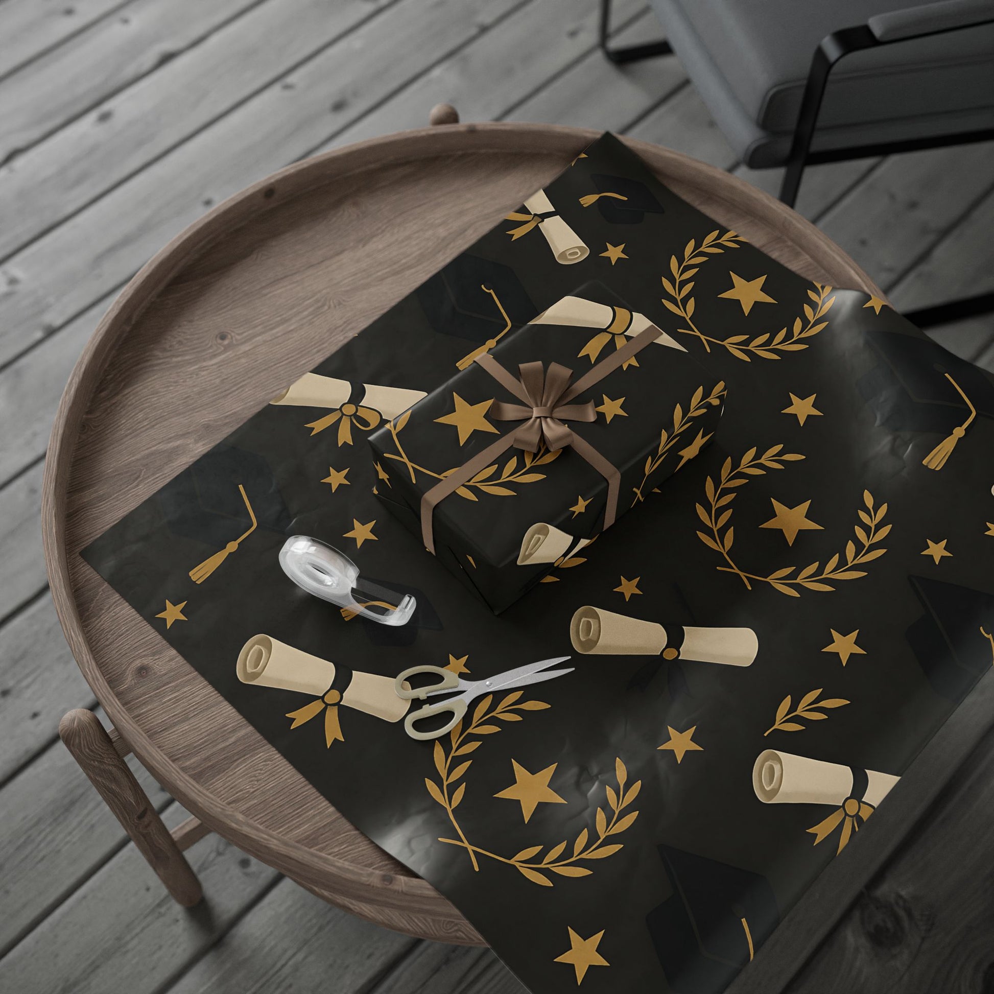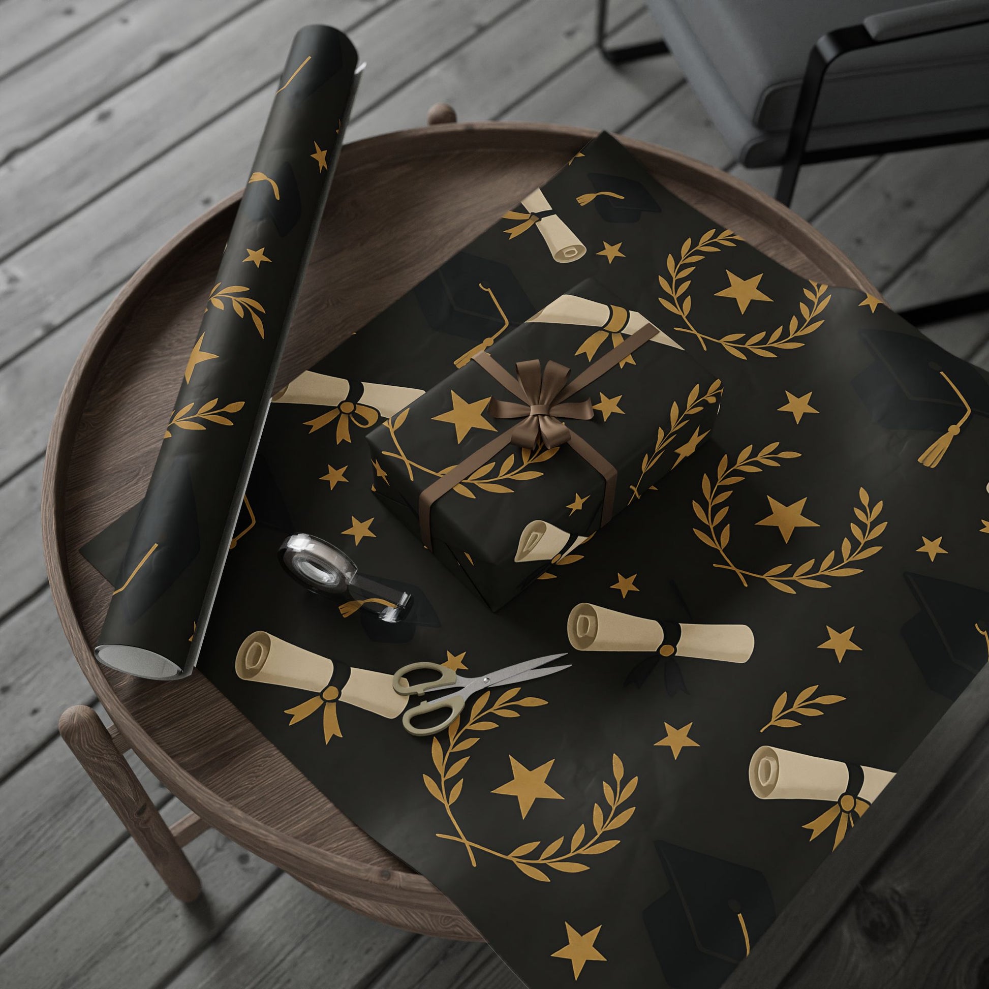 Honor your graduate’s milestone with this Graduation Celebration Wrapping Paper, featuring a sophisticated black backdrop adorned with gold laurel wreaths, diplomas, stars, and graduation caps.