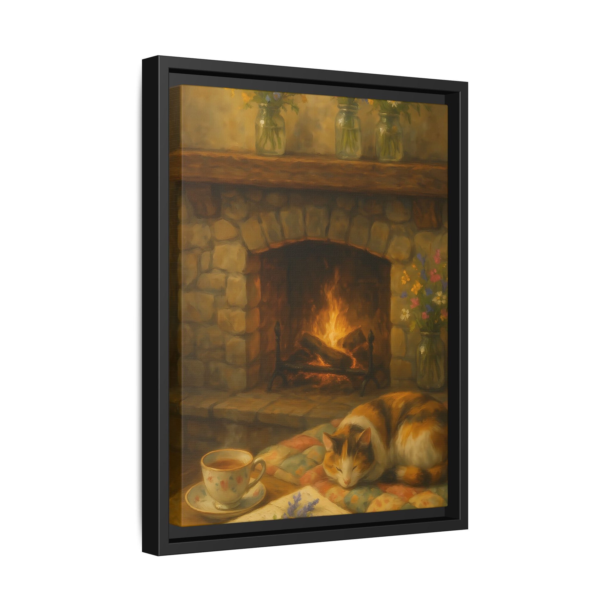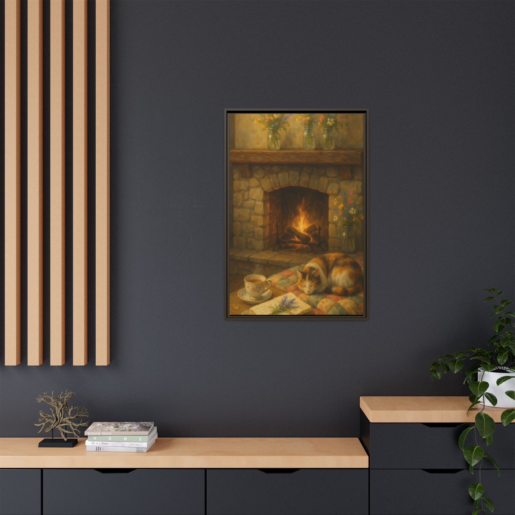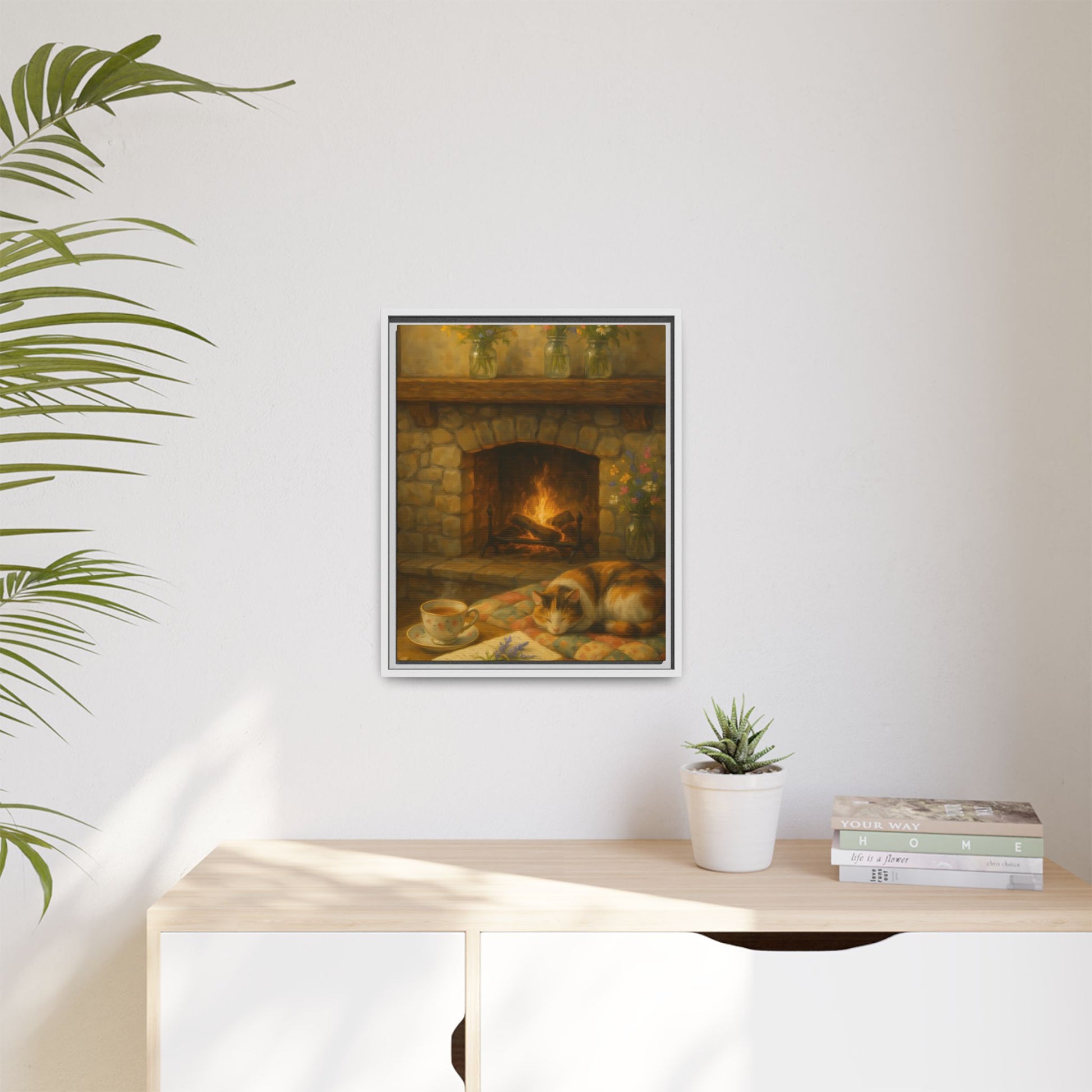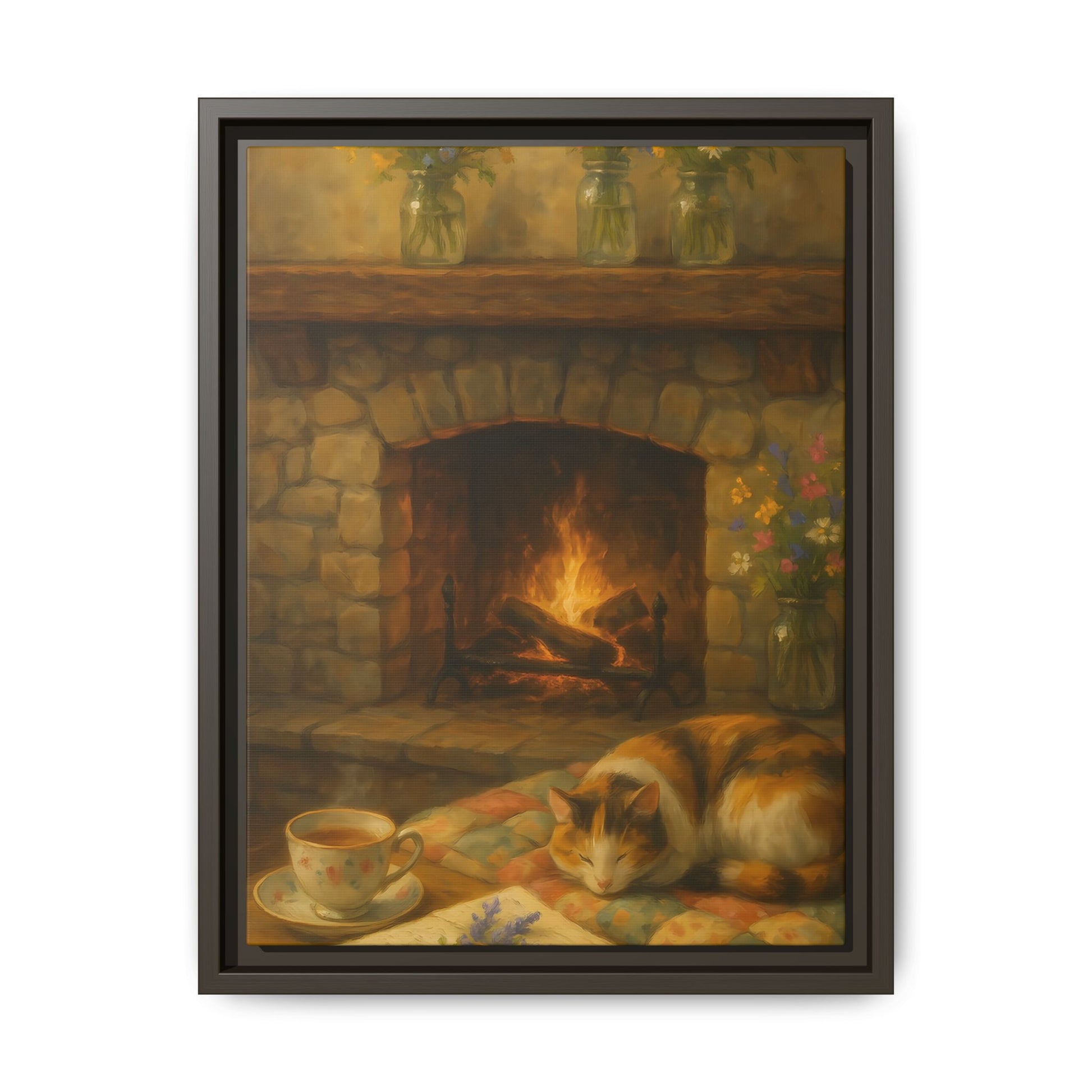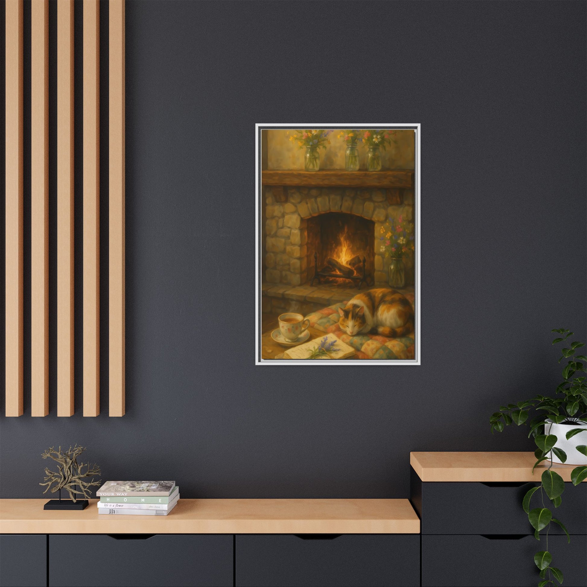 Hearthside Comfort – Framed Matte Canvas with Cat, Fireplace & Tea
