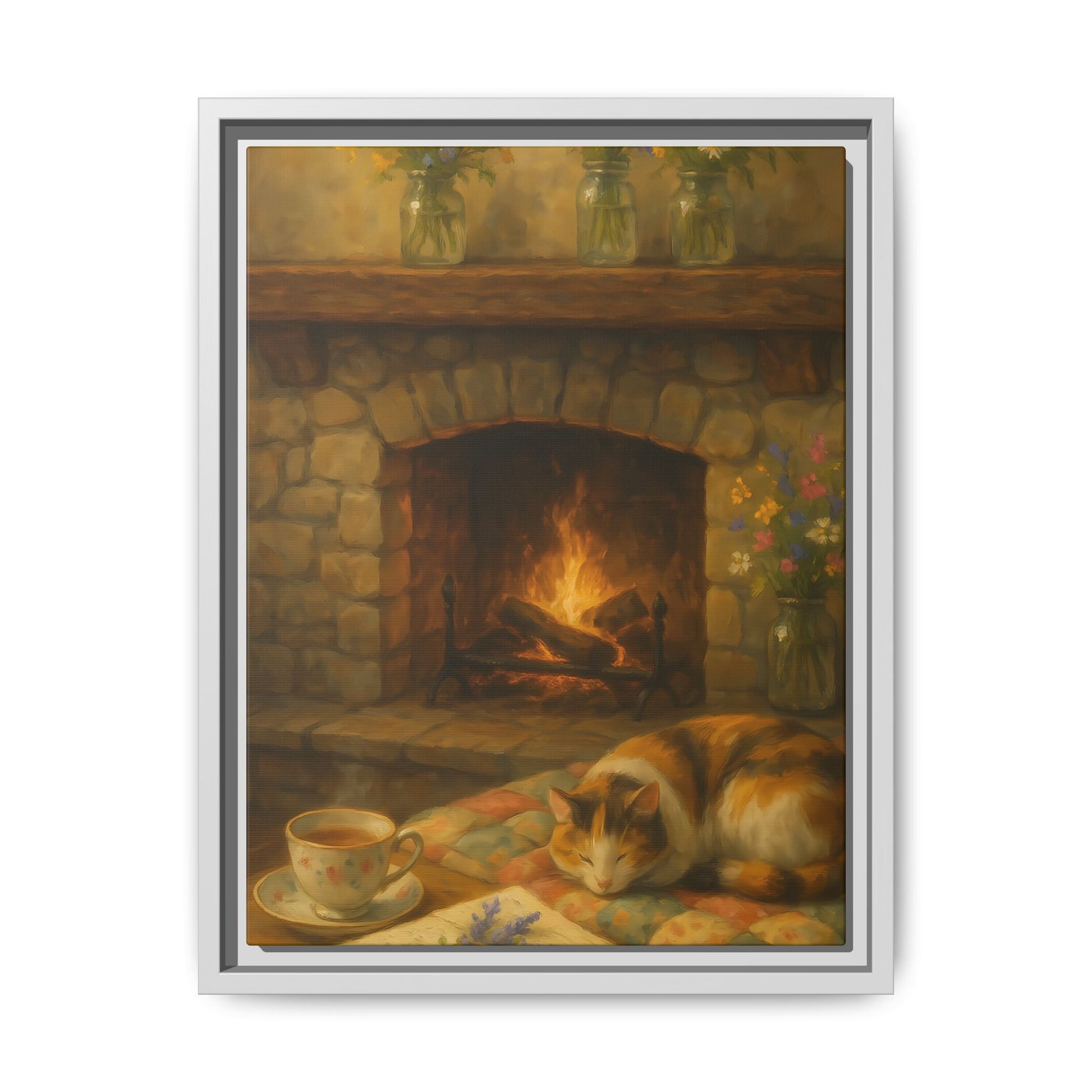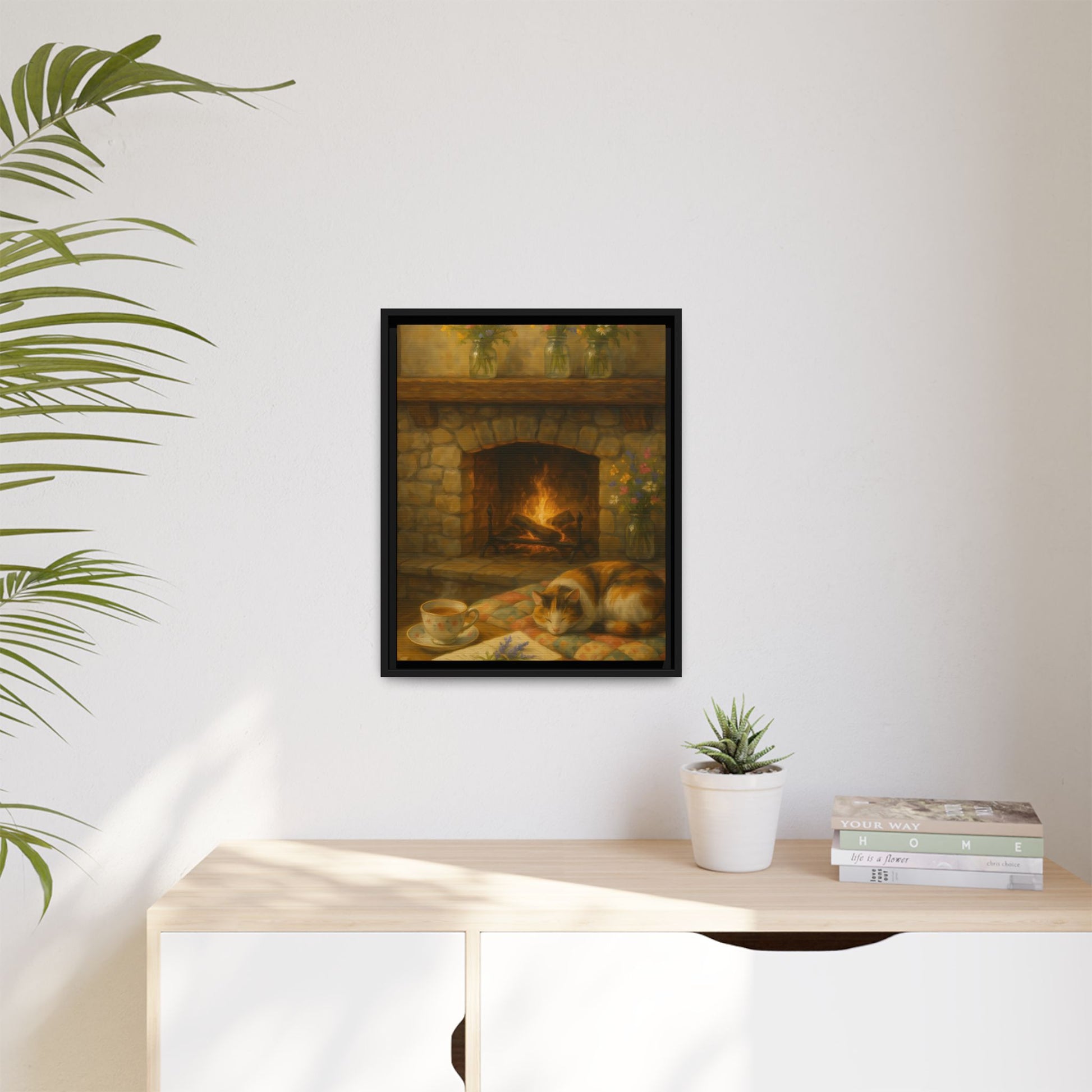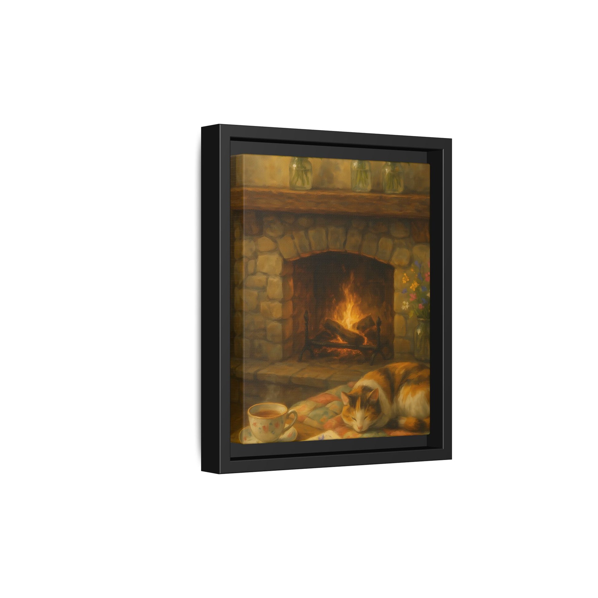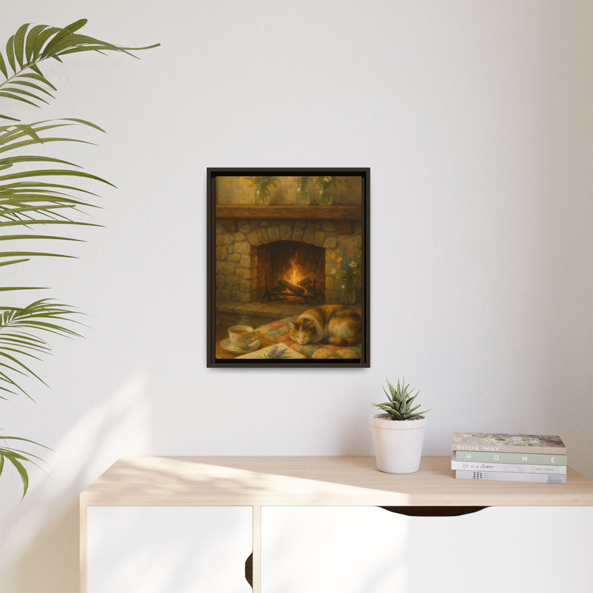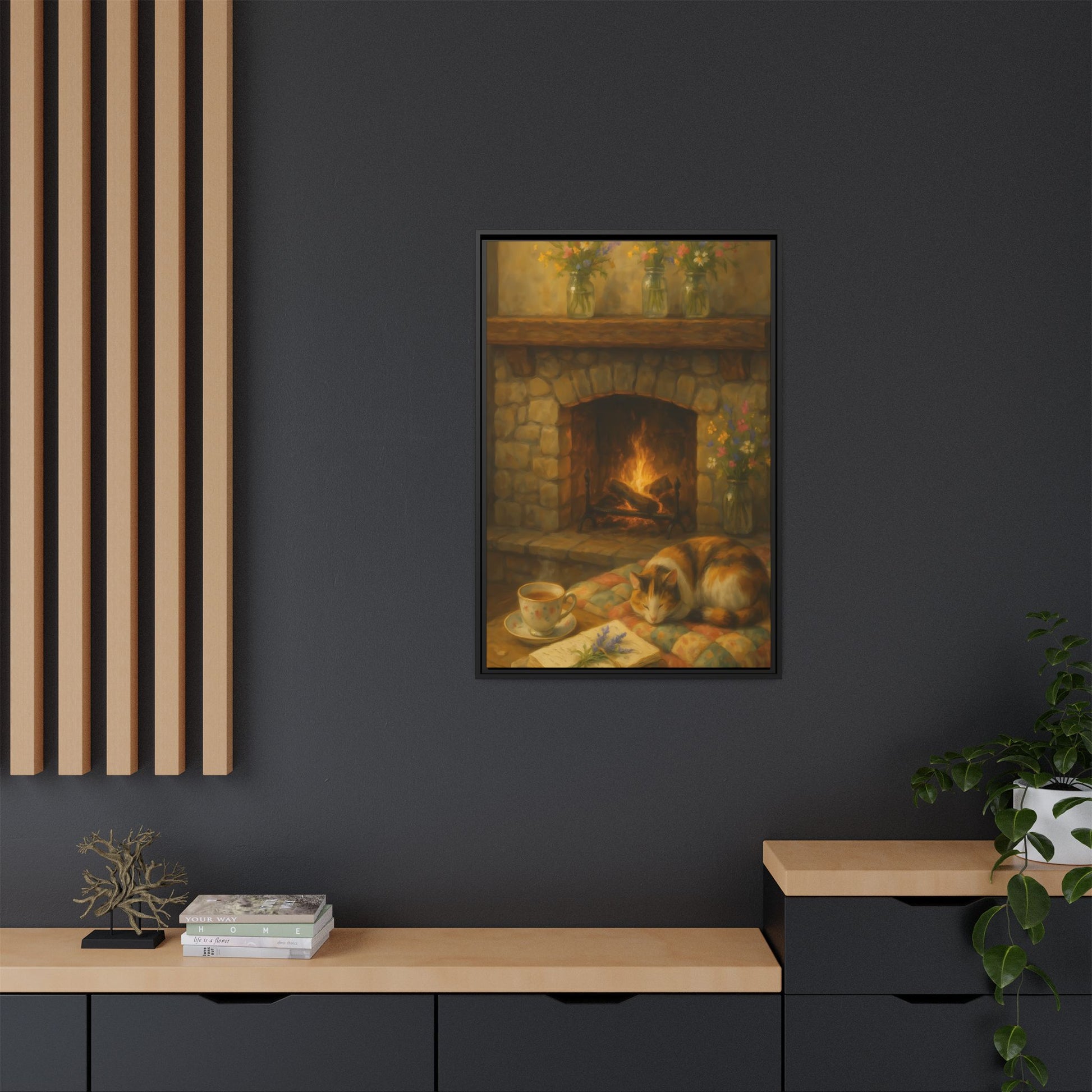 Hearthside Comfort – Framed Matte Canvas with Cat, Fireplace & Tea
