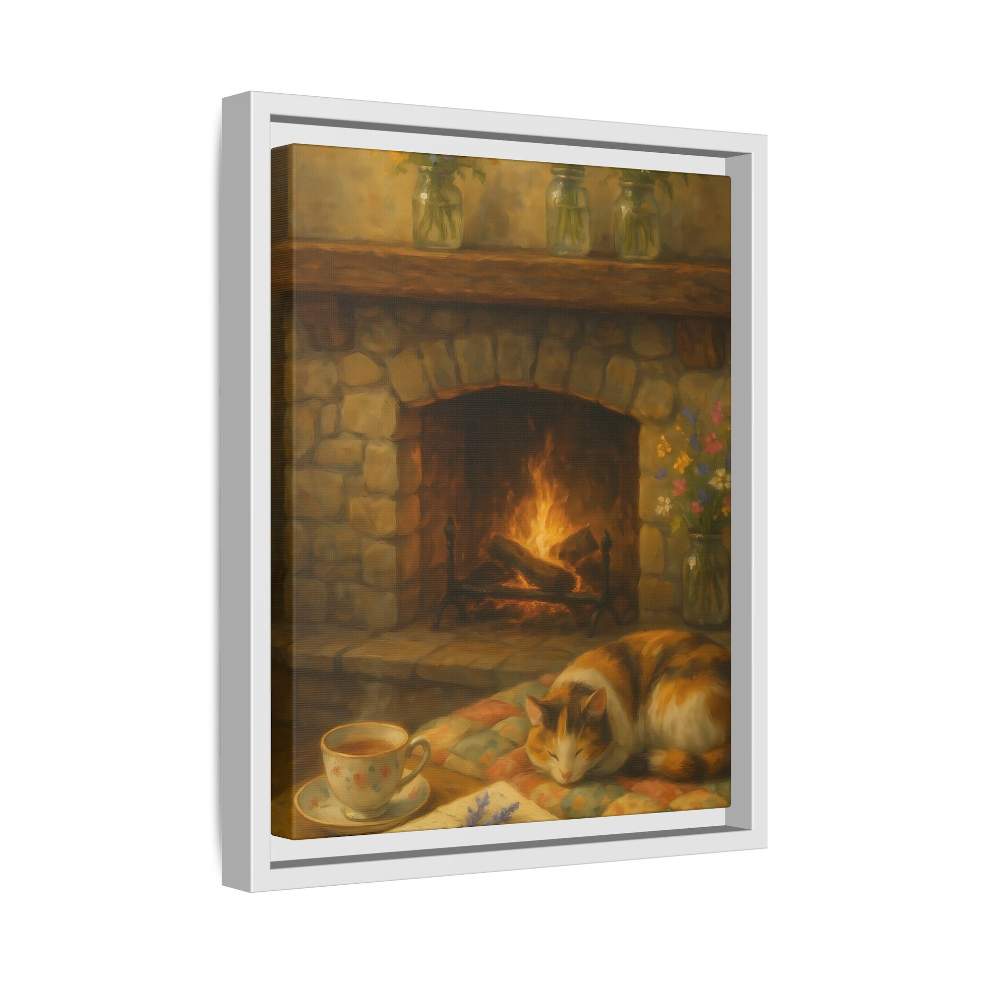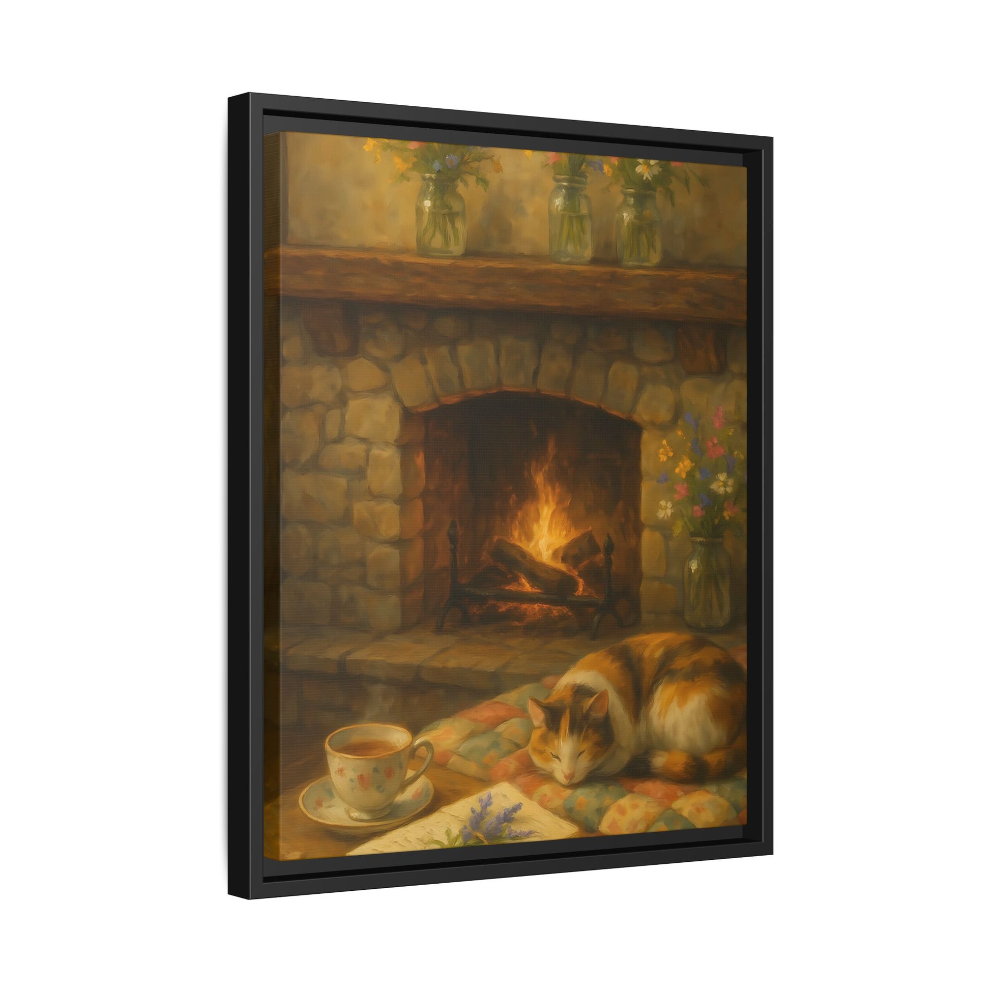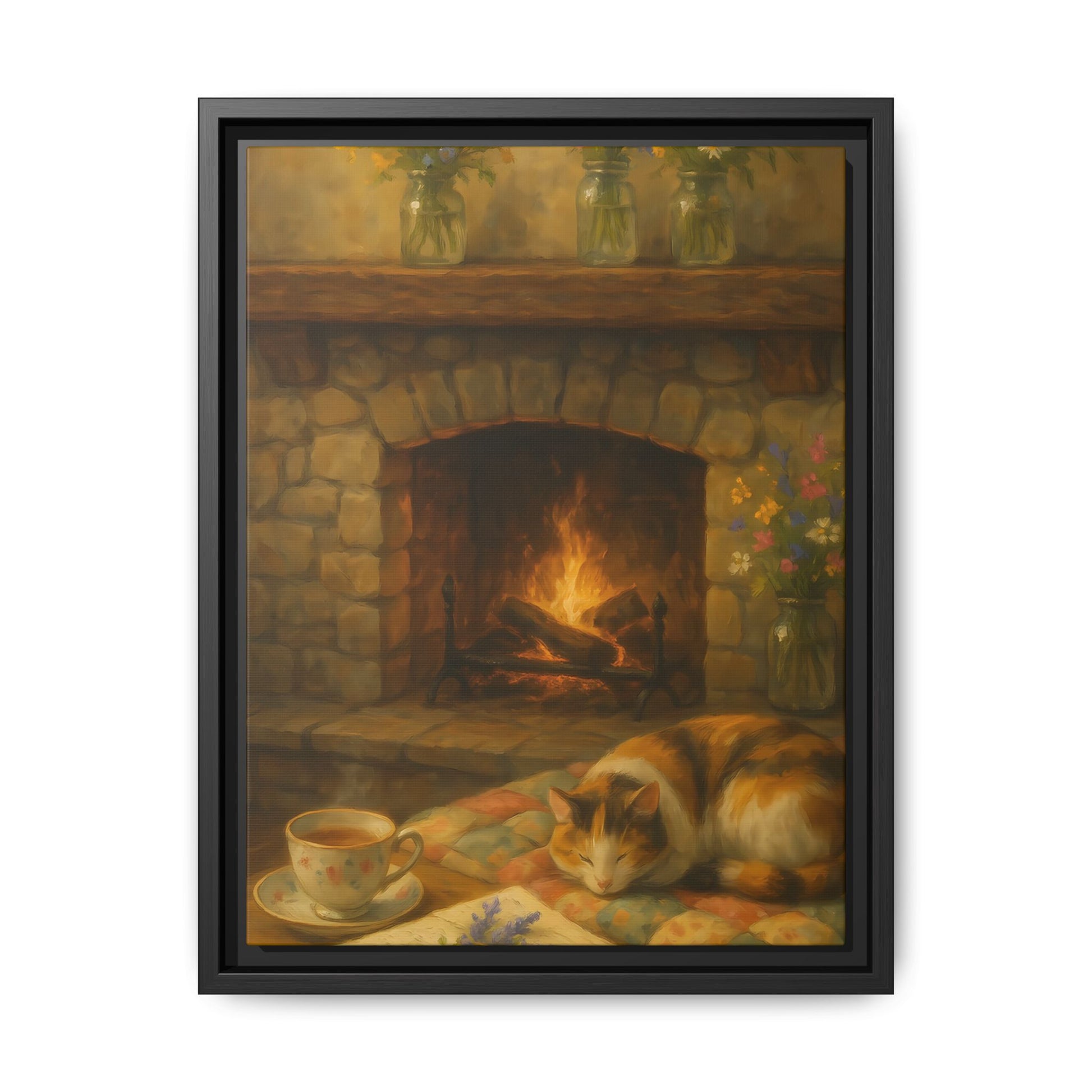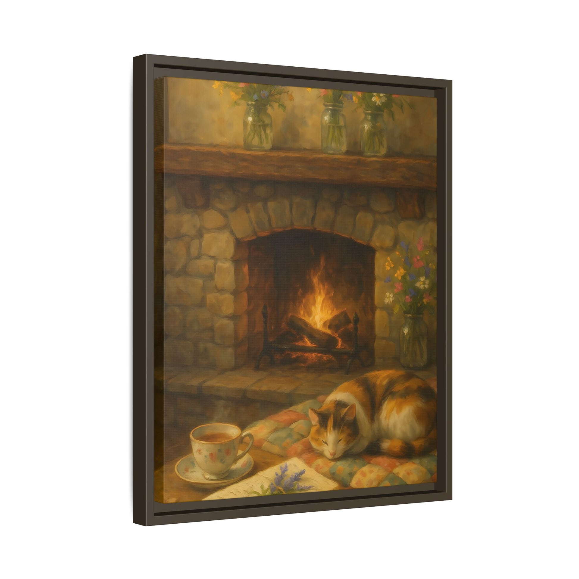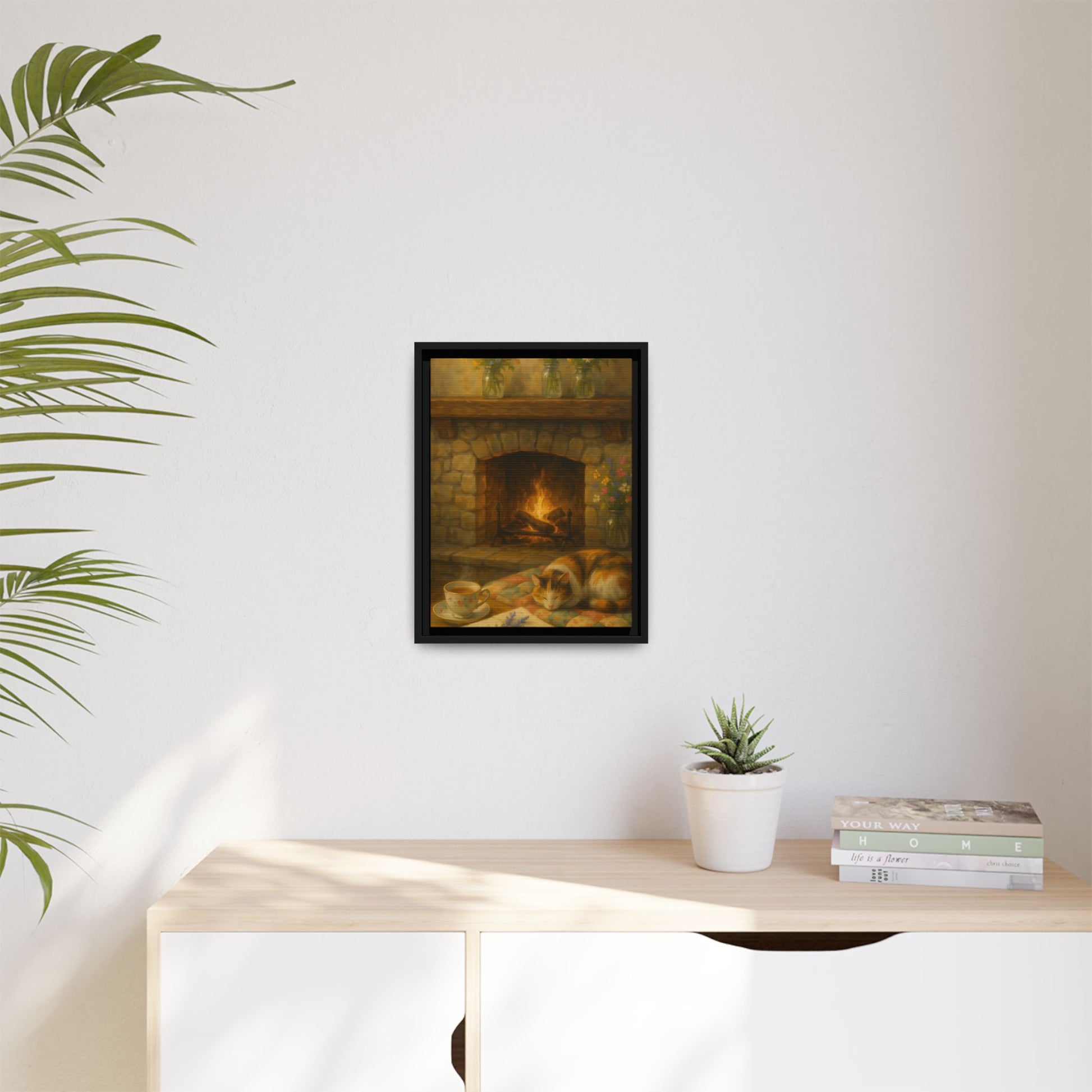 Hearthside Comfort – Framed Matte Canvas with Cat, Fireplace & Tea